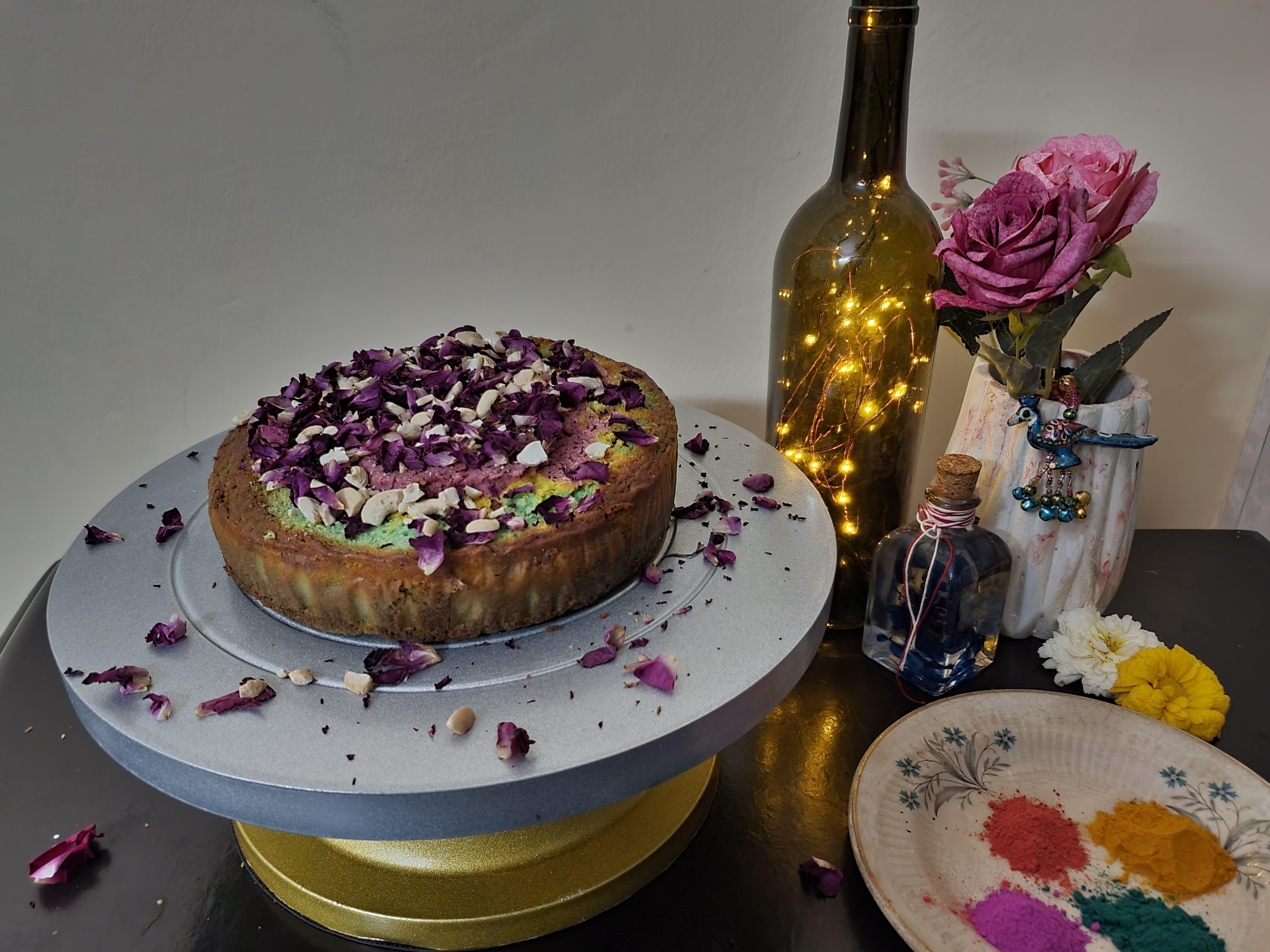 (1) Combine flour, almonds, baking powder, baking soda, use 1/4 cup grinded rose petals, salt and sugar.