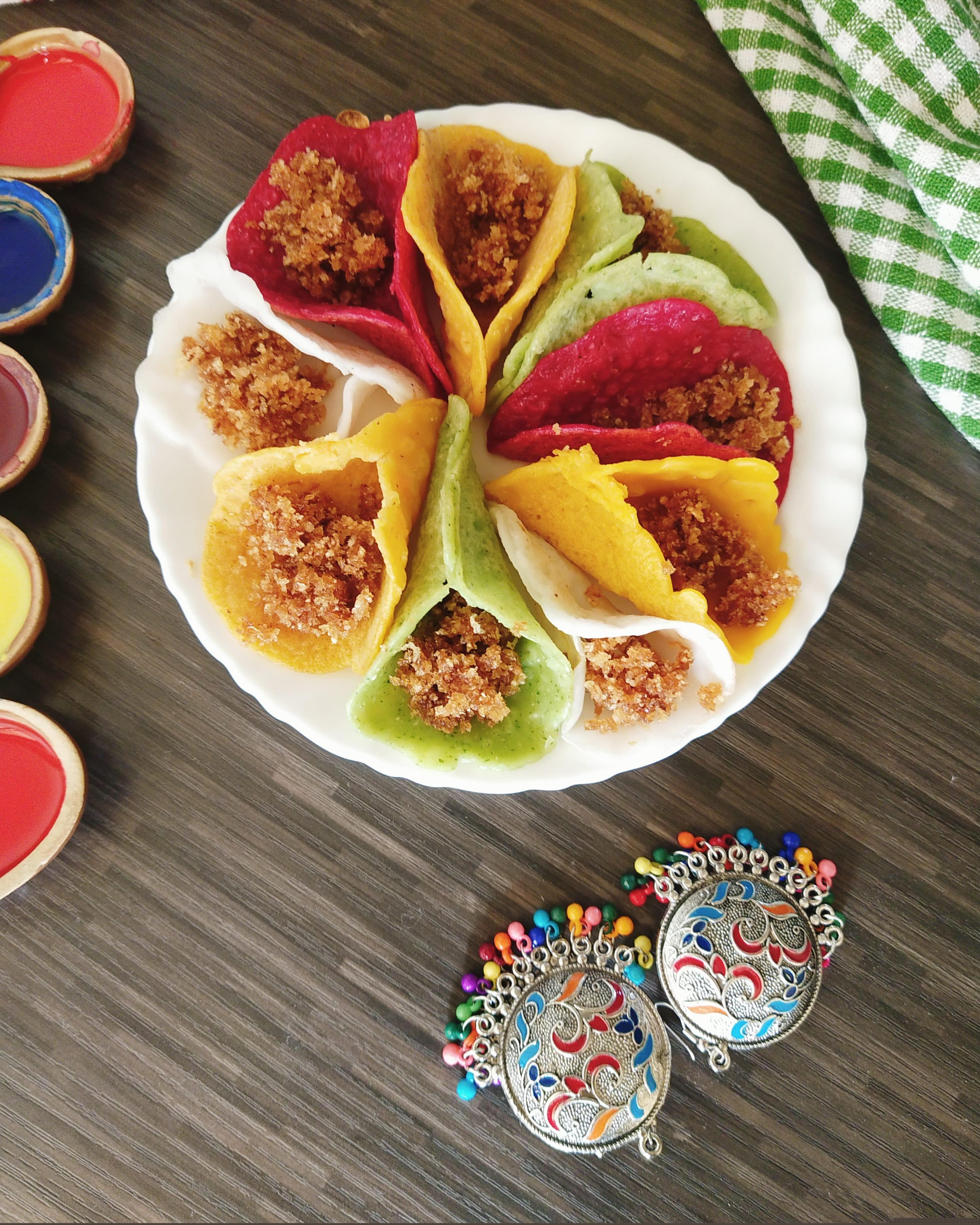 Add garam masala, chilli powder, ajwain and salt for each of these and prepare the different coloured dough by putting wheat flour in the required quantity to them.