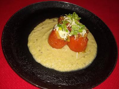 Take a bowl add white gravy and place the stuffed tomato garnish with grated cheese and coriander leaves,serve hot.