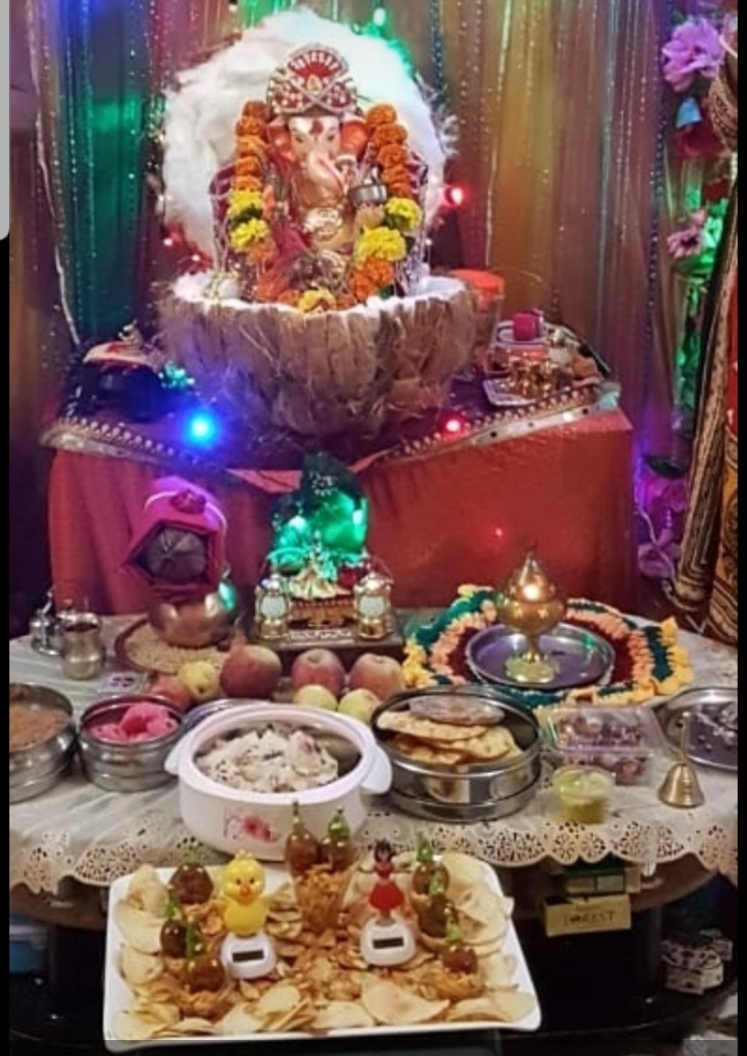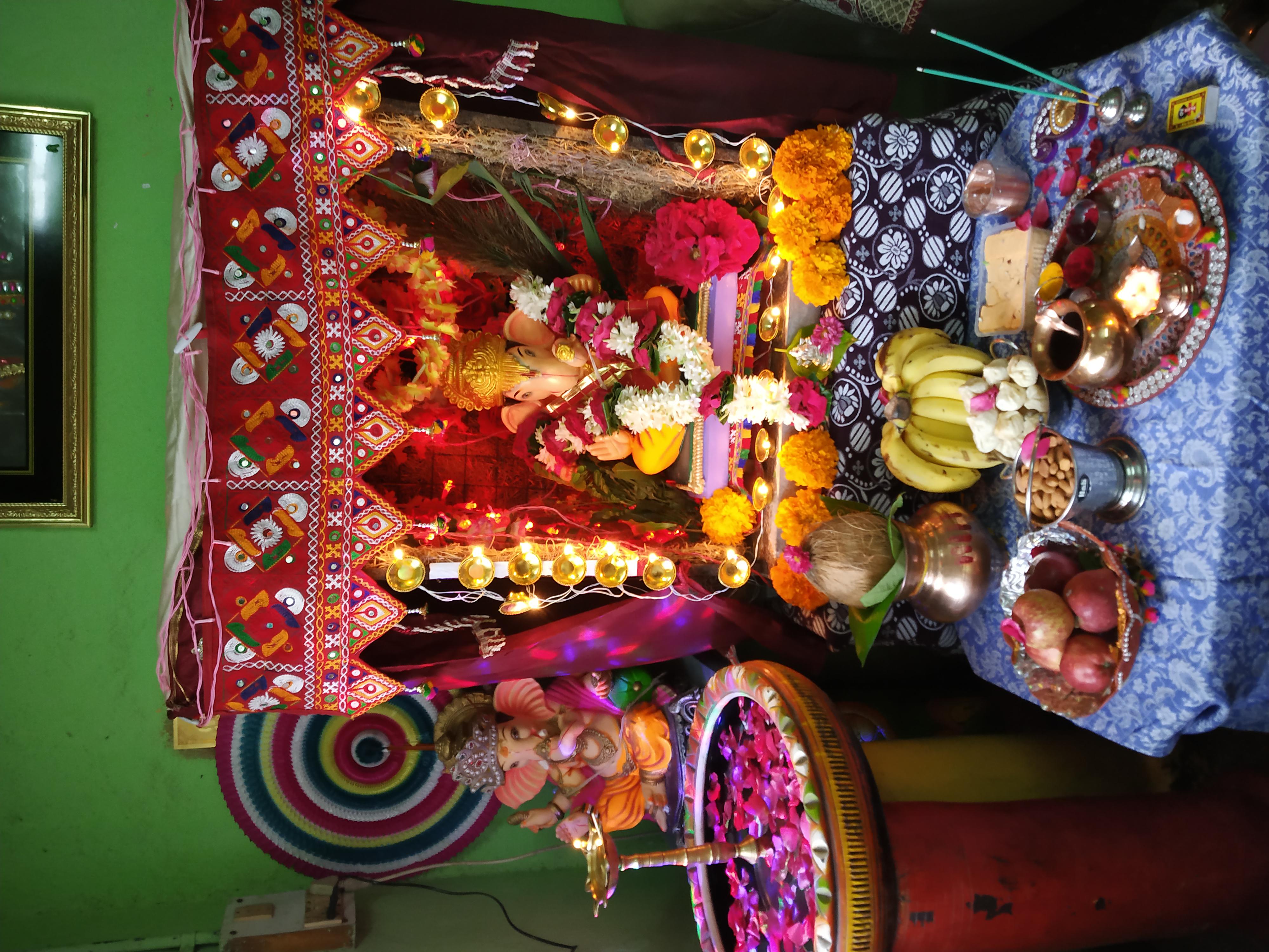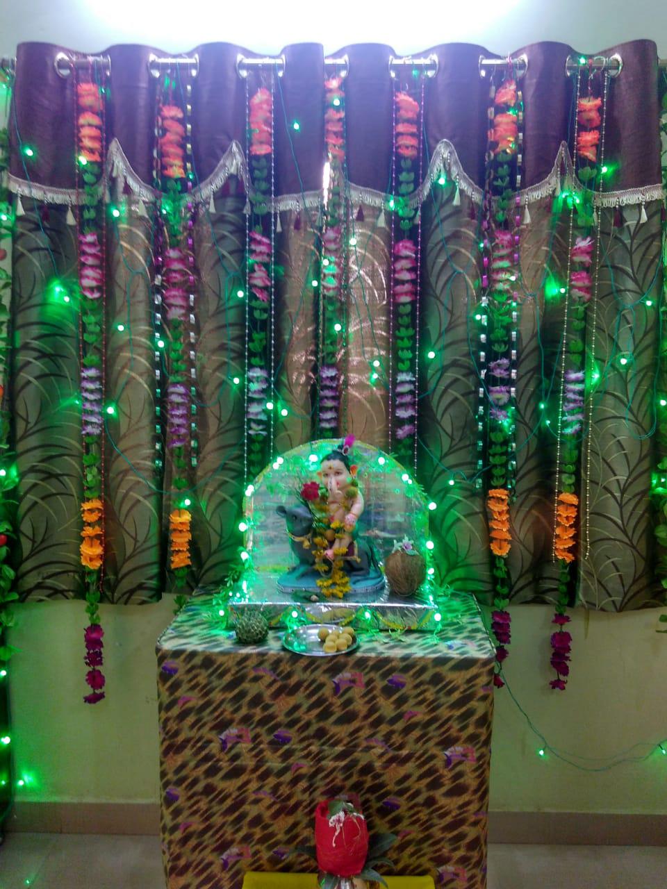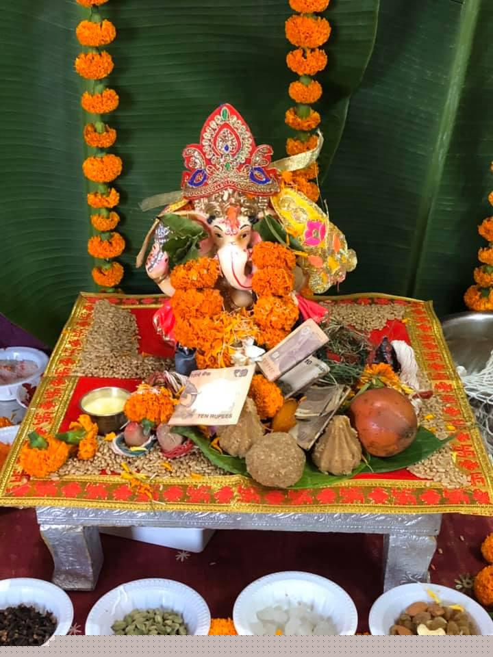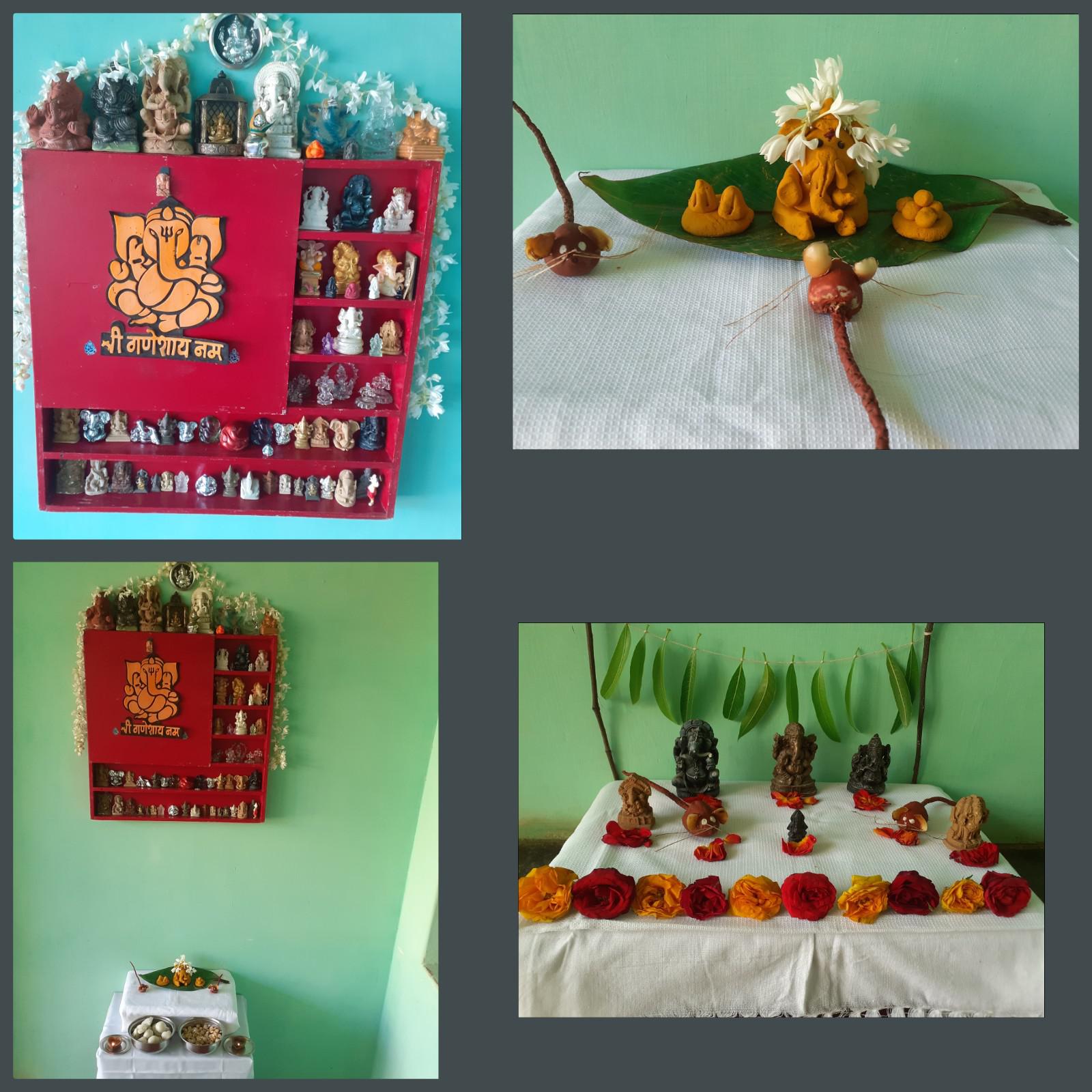 For DIY activity we started collecting small size tender coconut in the backyard of my house to make mouse. The tender coconut was painted and decorated as mouse by collecting coconut dried branches for tail and coconut shell for ears . The mouse is called Mooshak and is considered to be Lord Ganesh’s vaahan or vehicle. The pooja area is finally arranged with flowers and mango leaves which is auspicious on this occasion.The pooja area is arranged with collection of cute Lord Ganesha which is almost a decade old.