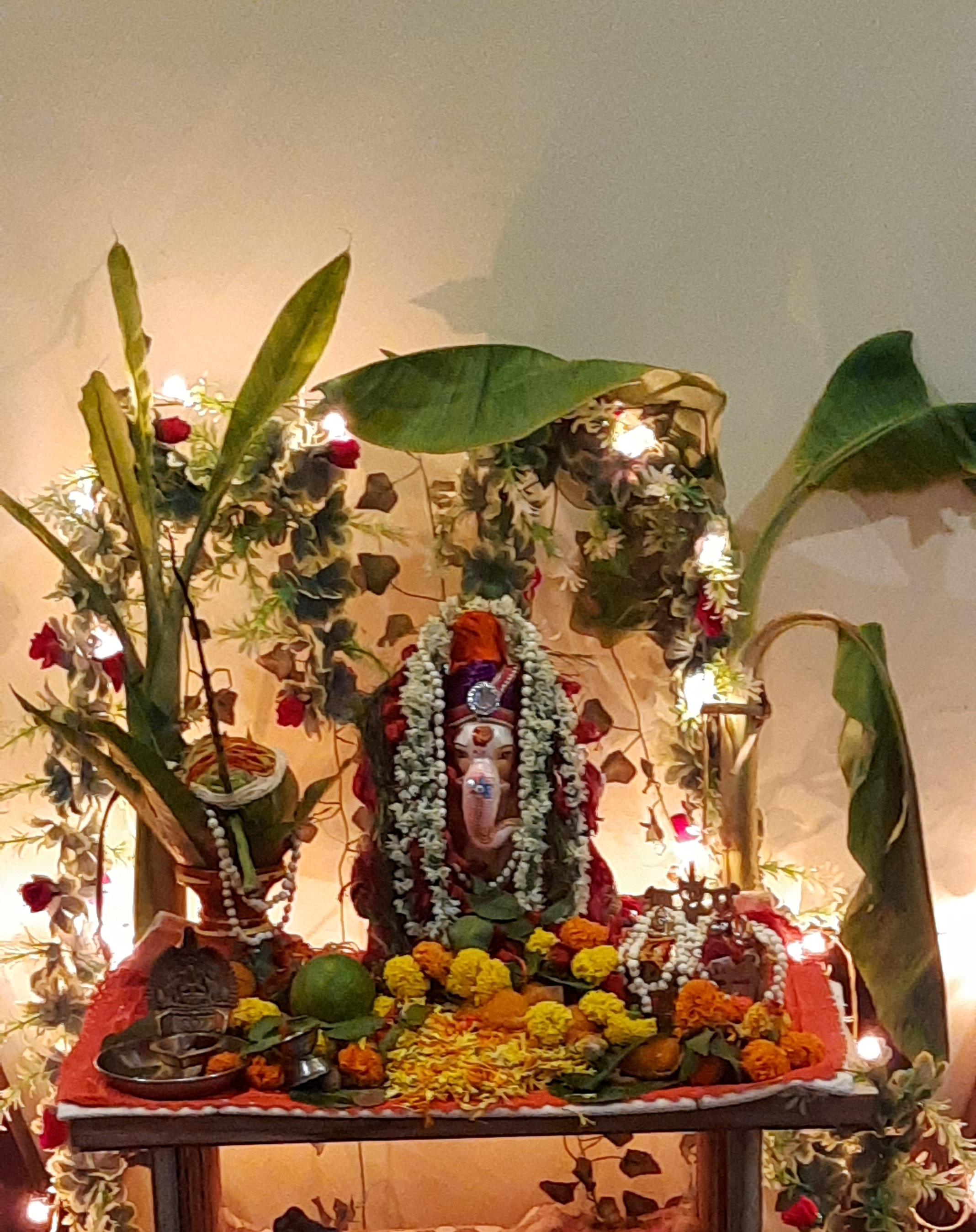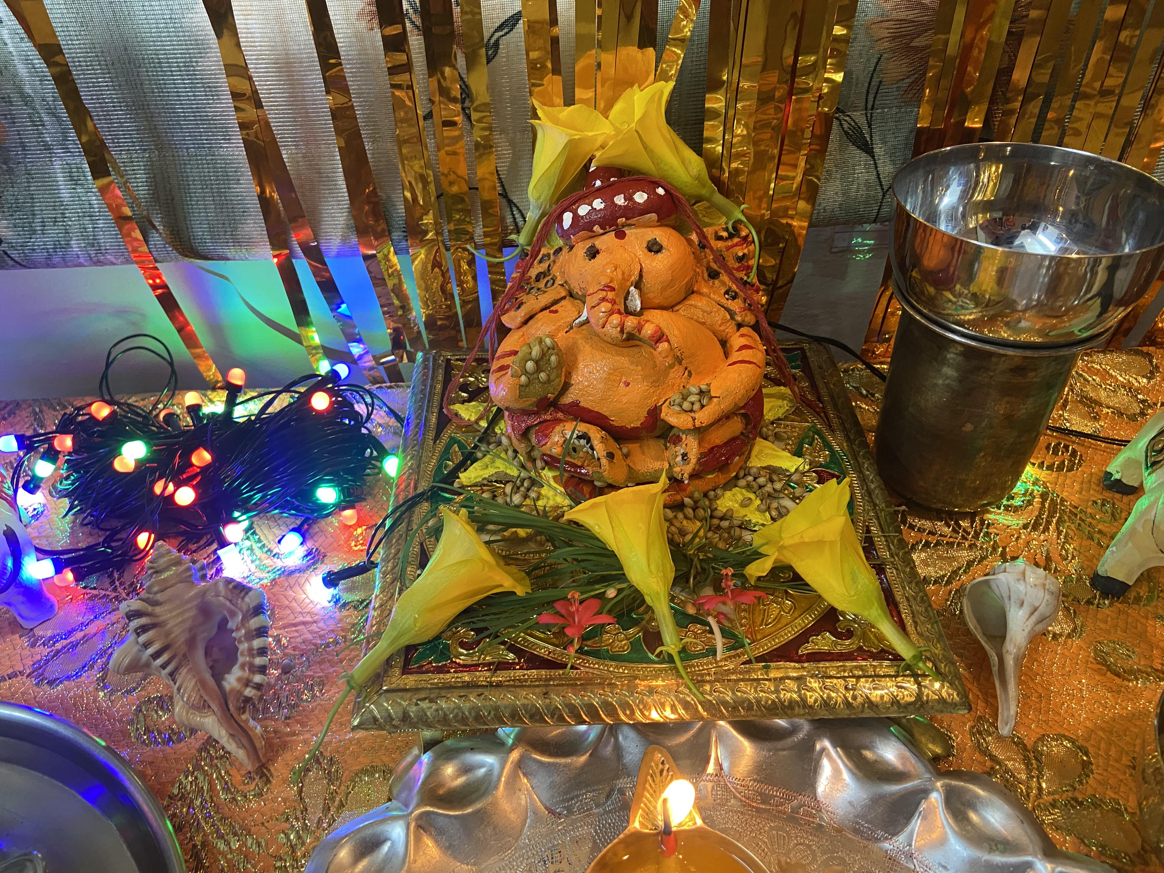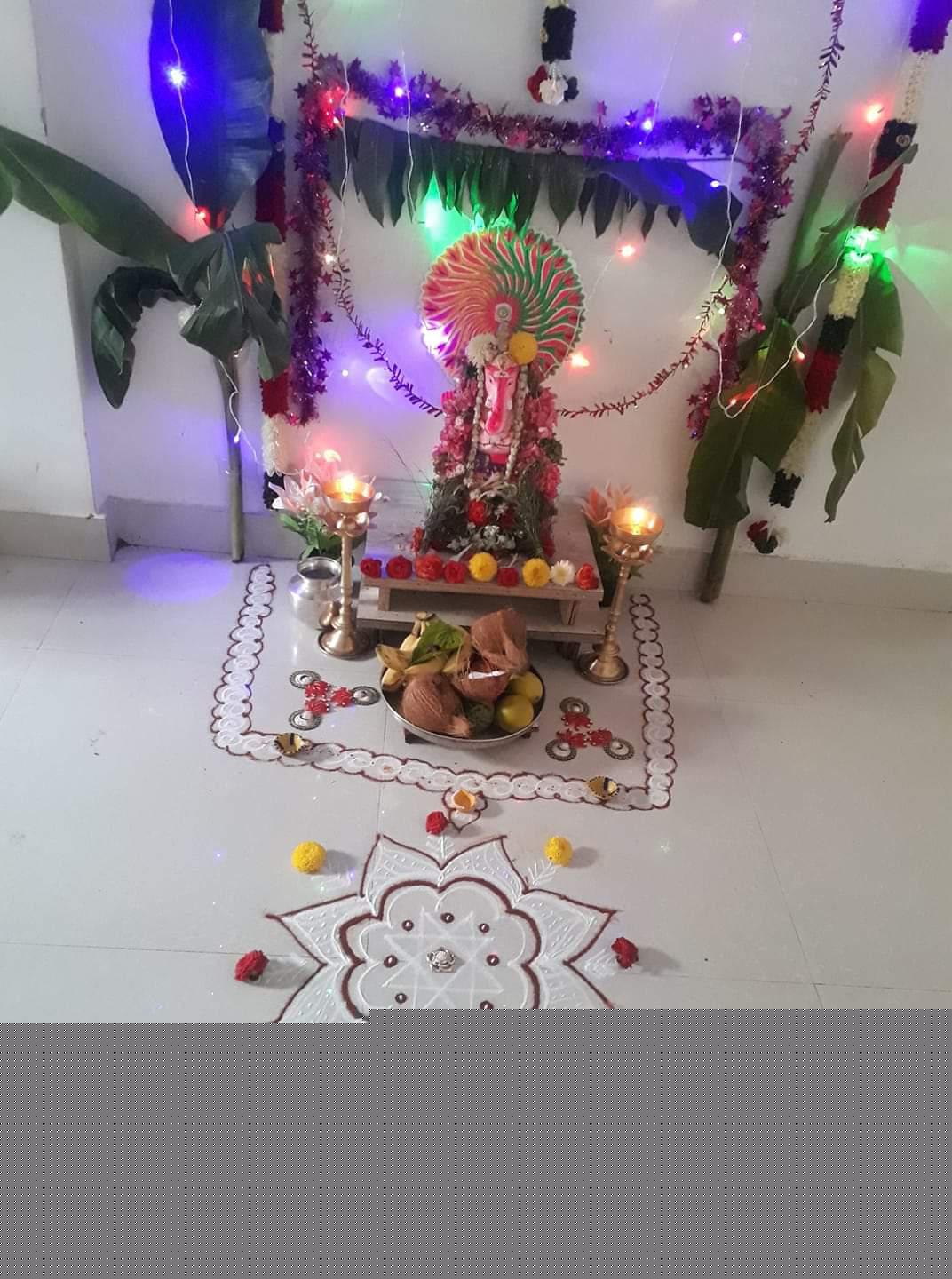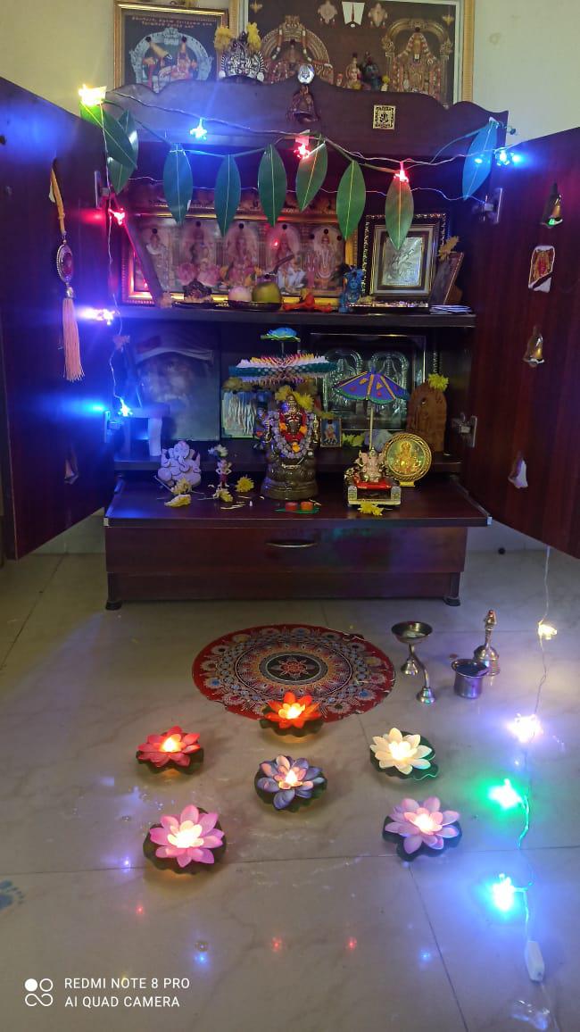For DIY activity we started collecting small size tender coconut in the backyard of my house to make mouse. The tender coconut was painted and decorated as mouse by collecting coconut dried branches for tail and coconut shell for ears . The mouse is called Mooshak and is considered to be Lord Ganesh’s vaahan or vehicle. The pooja area is finally arranged with flowers and mango leaves which is auspicious on this occasion.The pooja area is arranged with collection of cute Lord Ganesha which is almost a decade old.