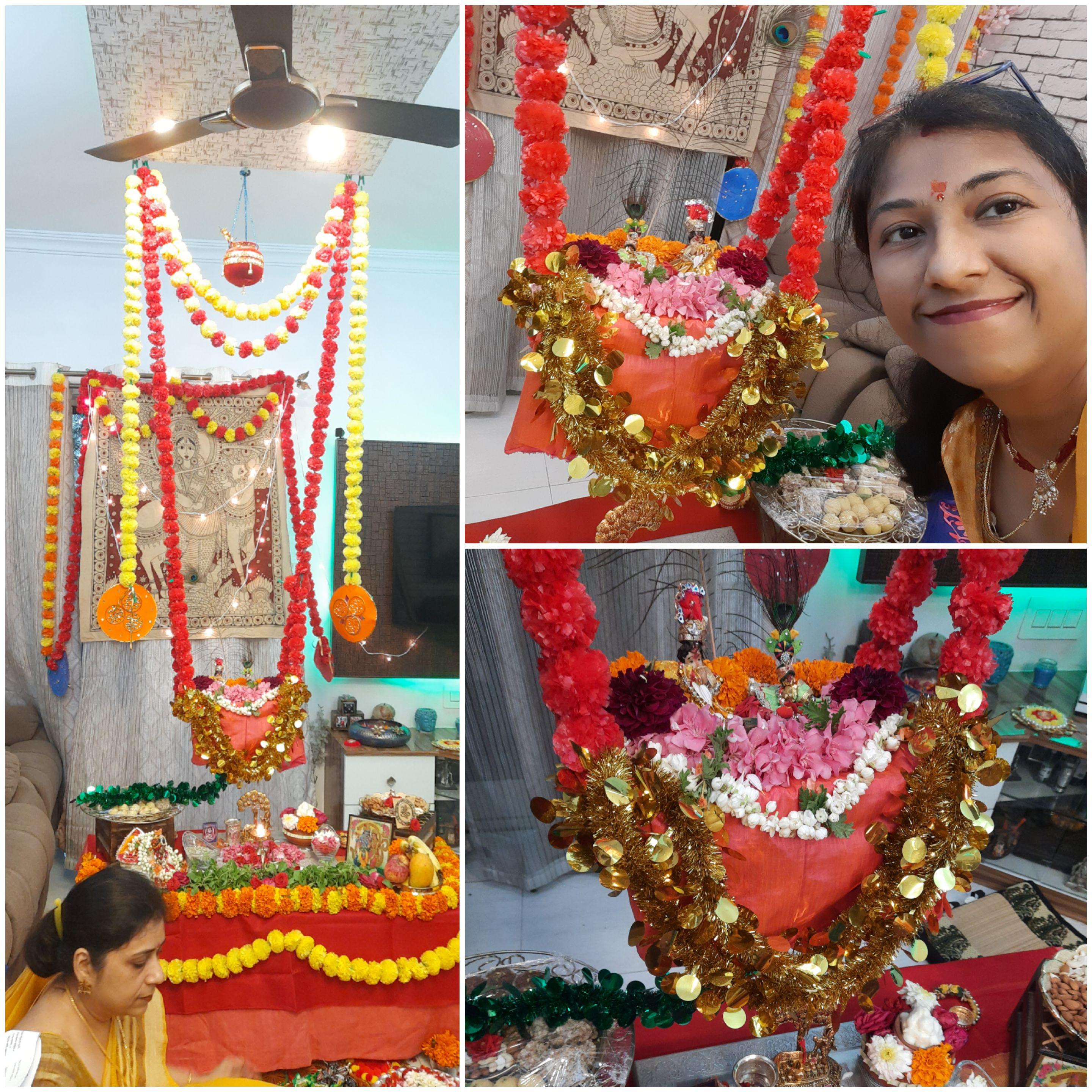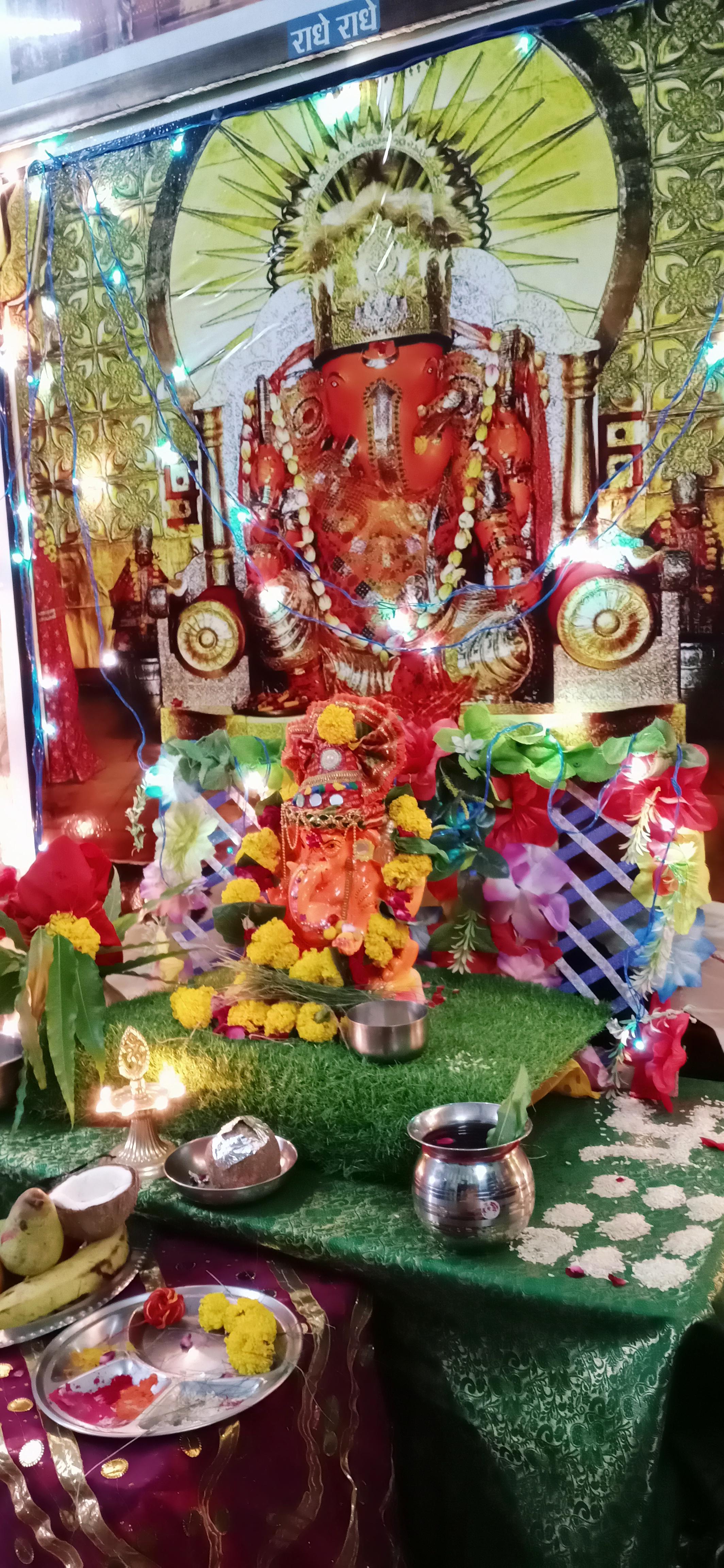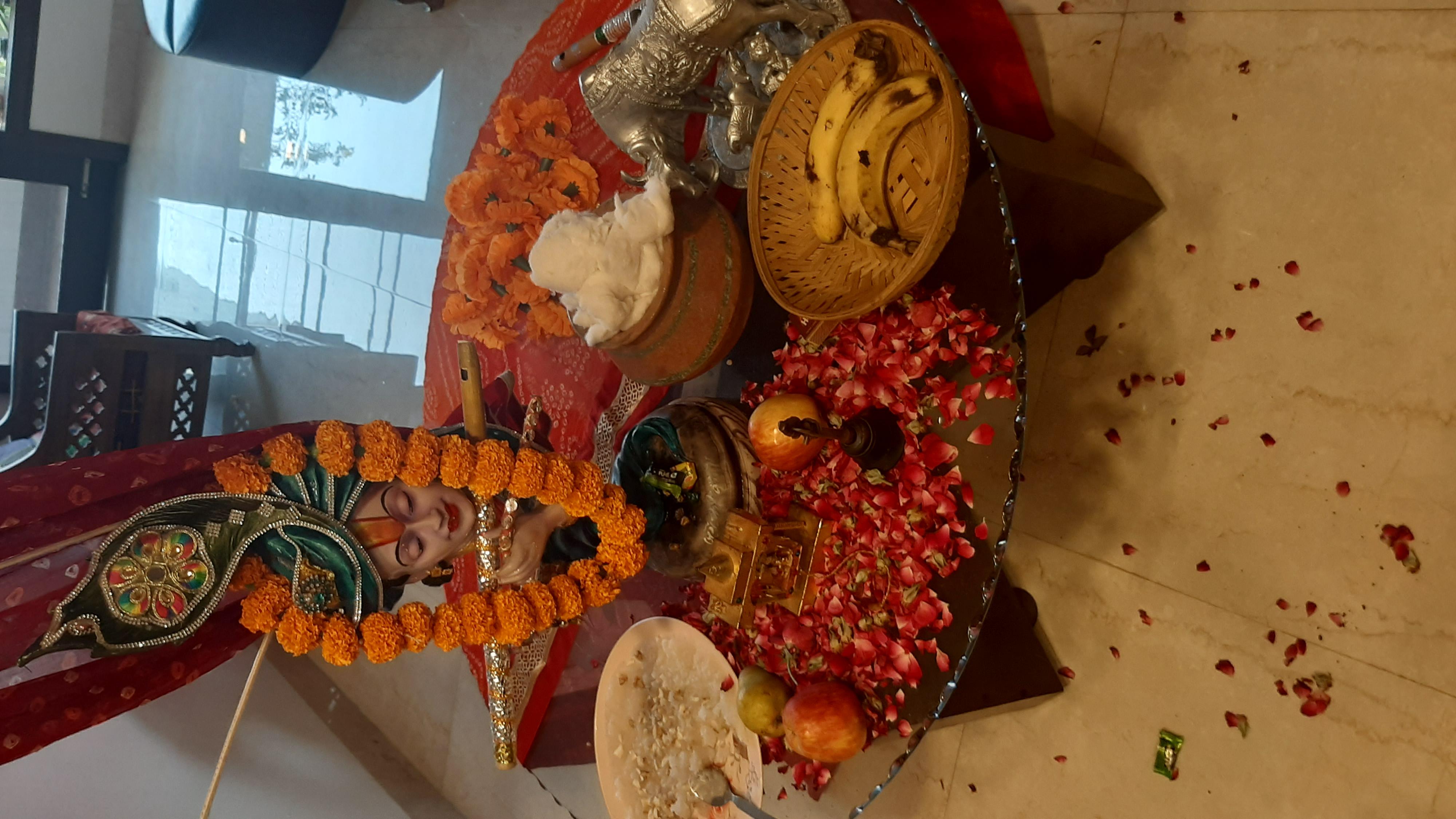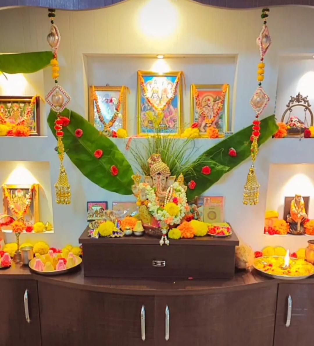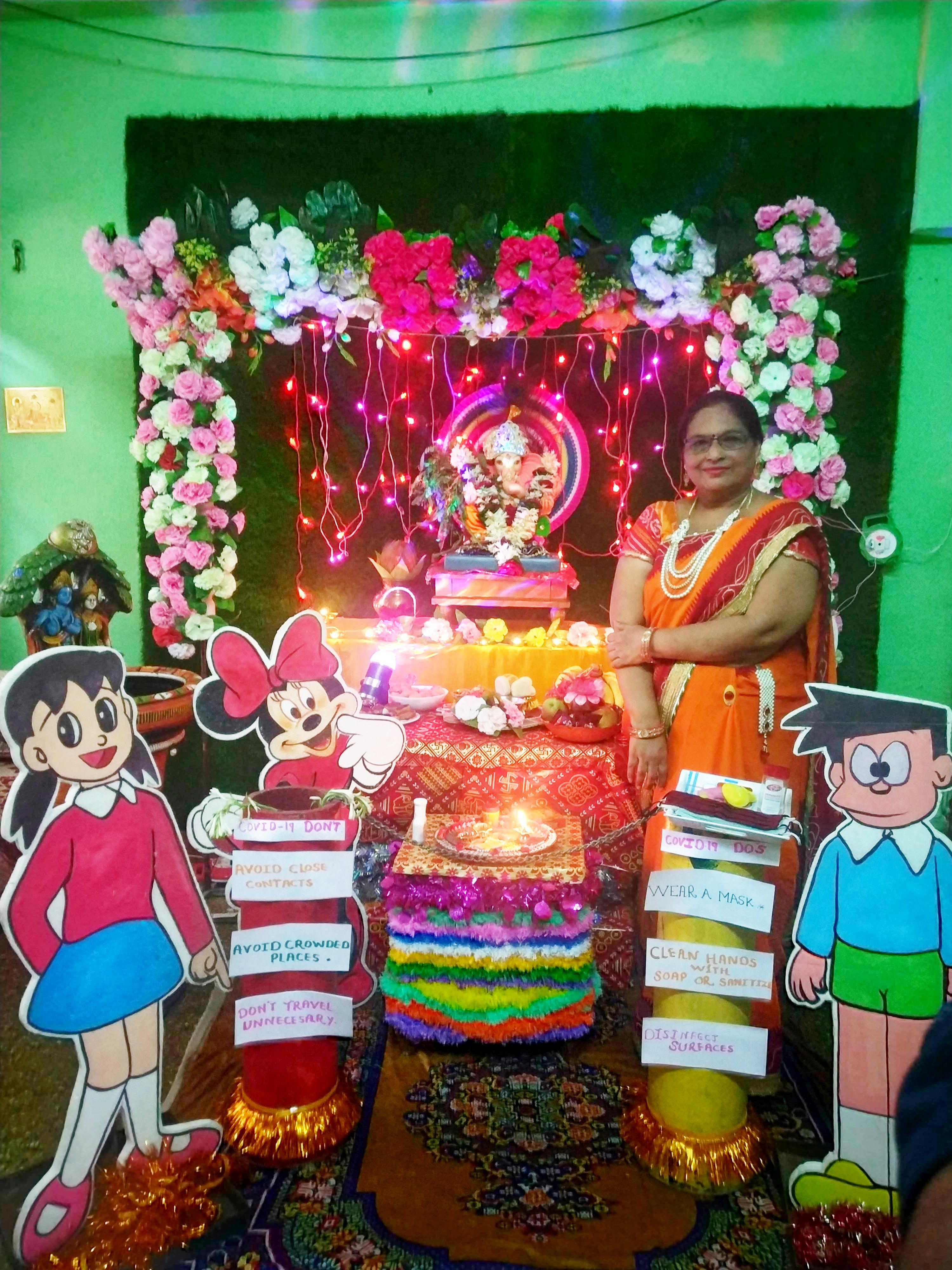 For DIY activity we started collecting small size tender coconut in the backyard of my house to make mouse. The tender coconut was painted and decorated as mouse by collecting coconut dried branches for tail and coconut shell for ears . The mouse is called Mooshak and is considered to be Lord Ganesh’s vaahan or vehicle. The pooja area is finally arranged with flowers and mango leaves which is auspicious on this occasion.The pooja area is arranged with collection of cute Lord Ganesha which is almost a decade old.
