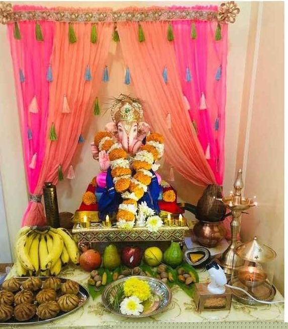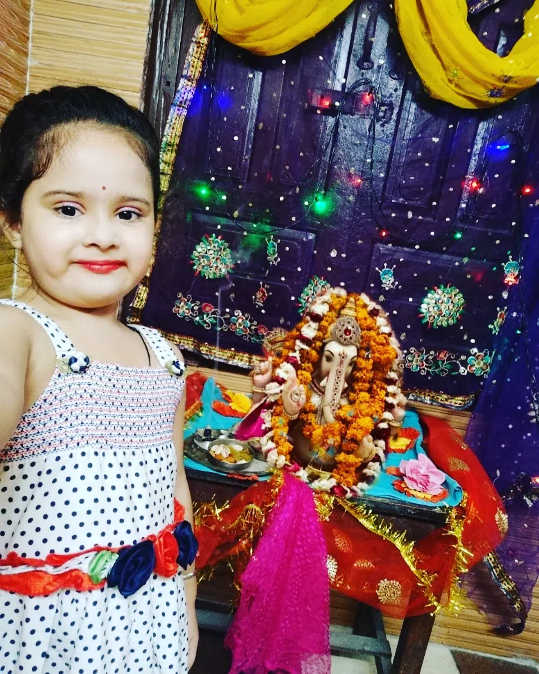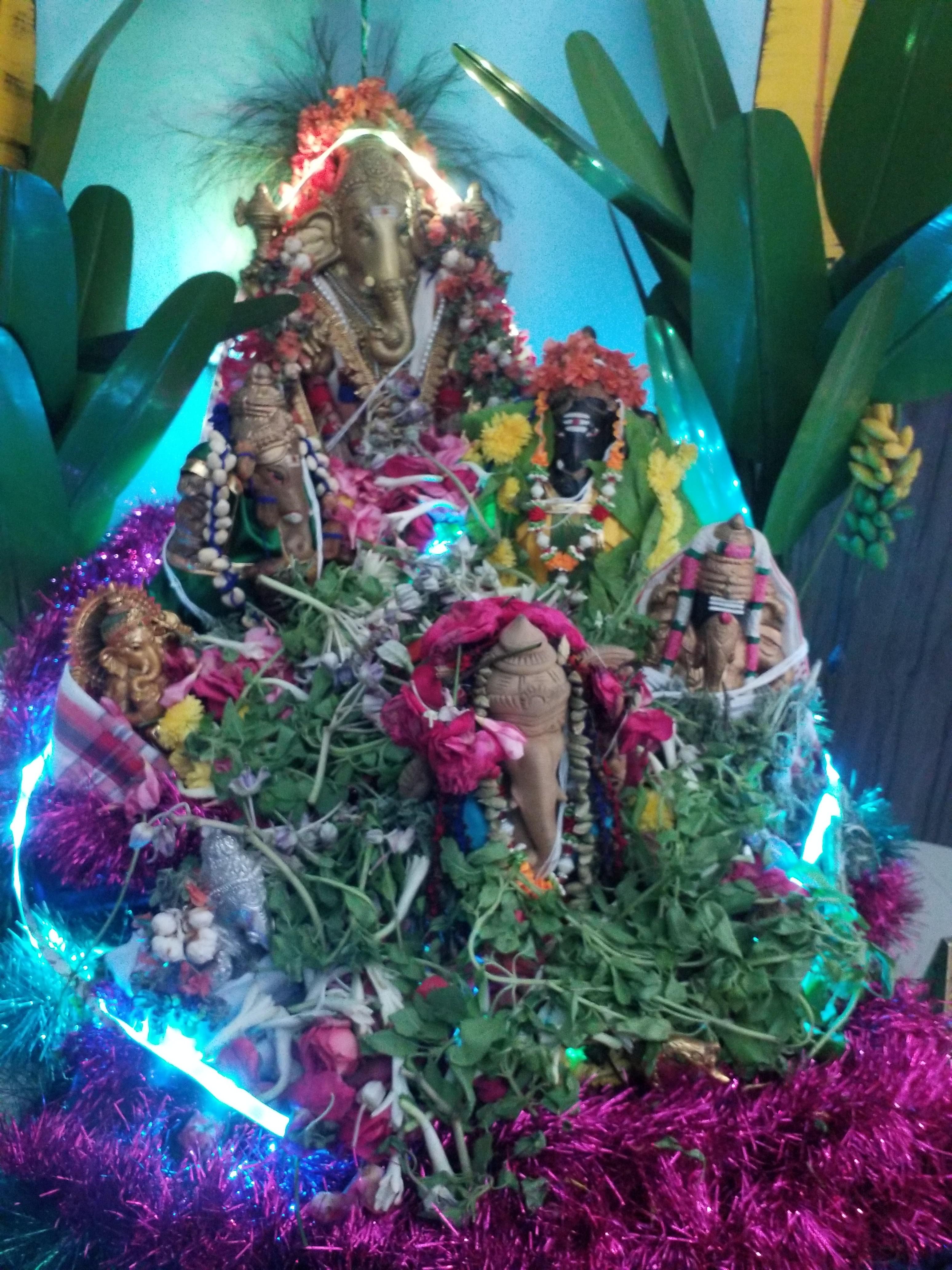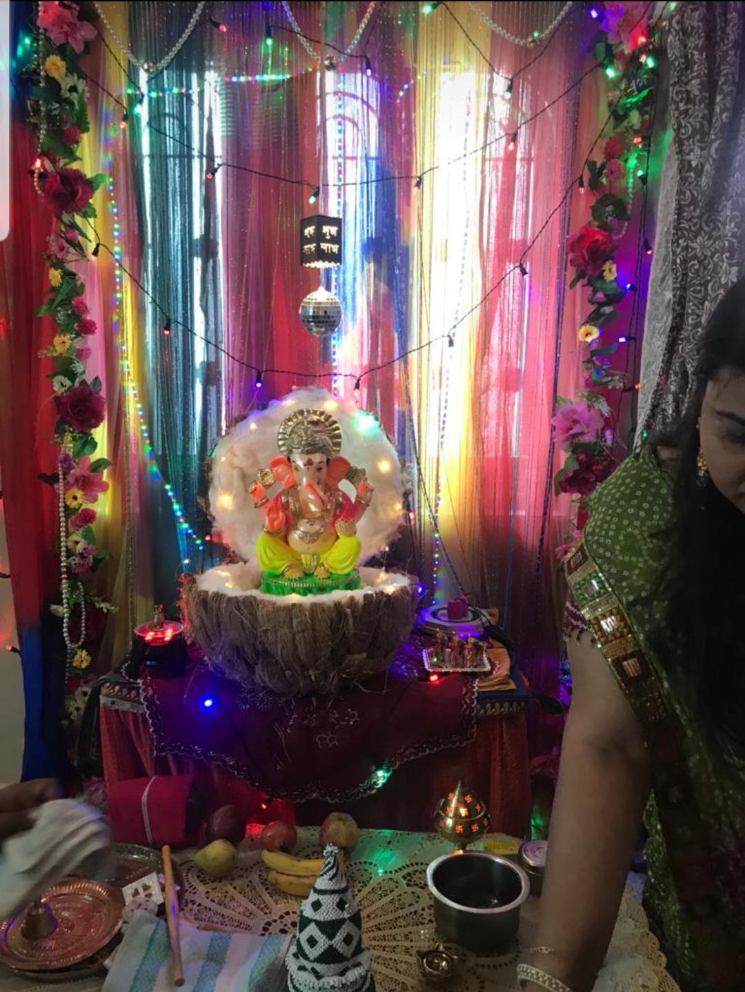 For DIY activity we started collecting small size tender coconut in the backyard of my house to make mouse. The tender coconut was painted and decorated as mouse by collecting coconut dried branches for tail and coconut shell for ears . The mouse is called Mooshak and is considered to be Lord Ganesh’s vaahan or vehicle. The pooja area is finally arranged with flowers and mango leaves which is auspicious on this occasion.The pooja area is arranged with collection of cute Lord Ganesha which is almost a decade old.