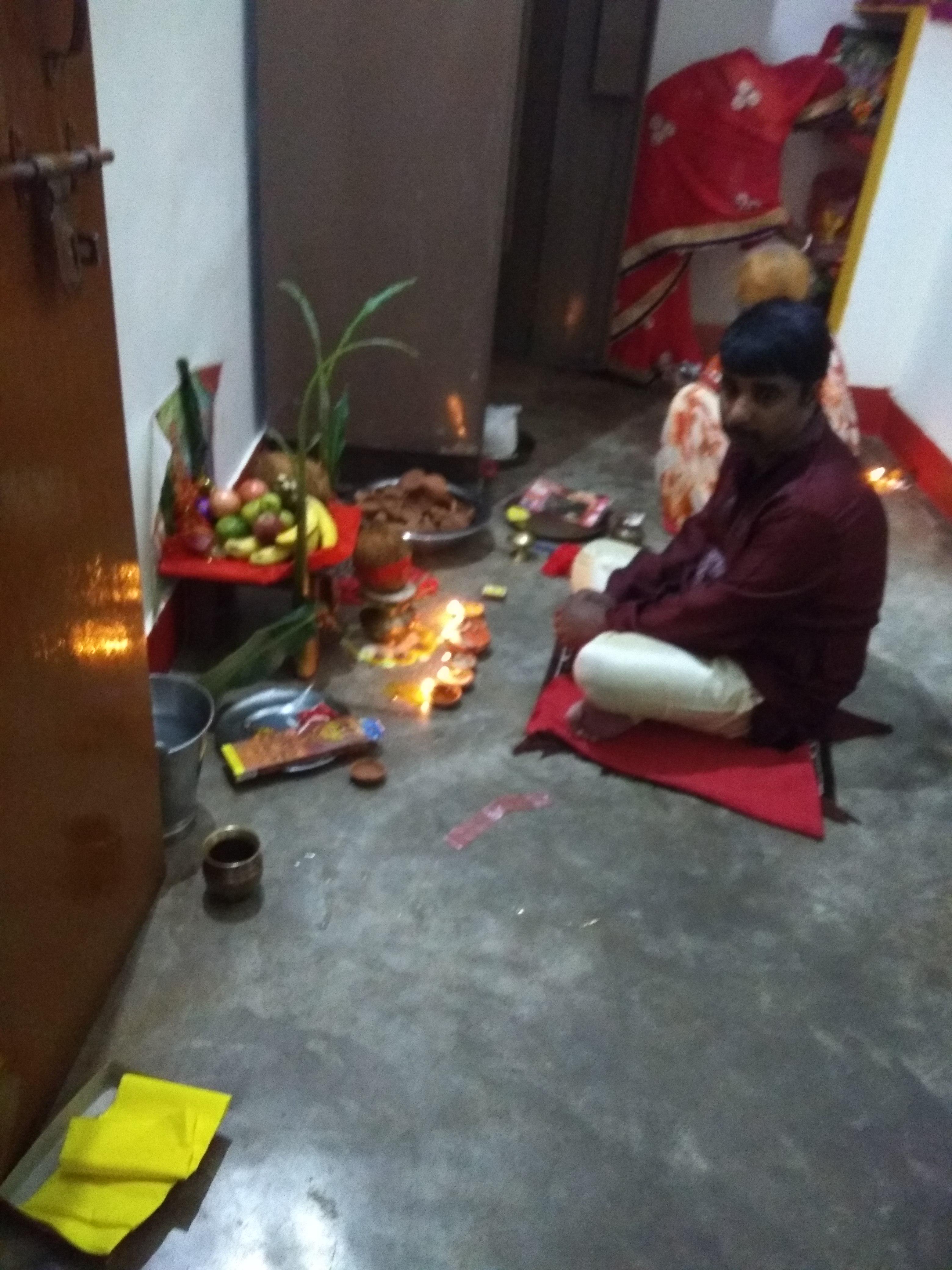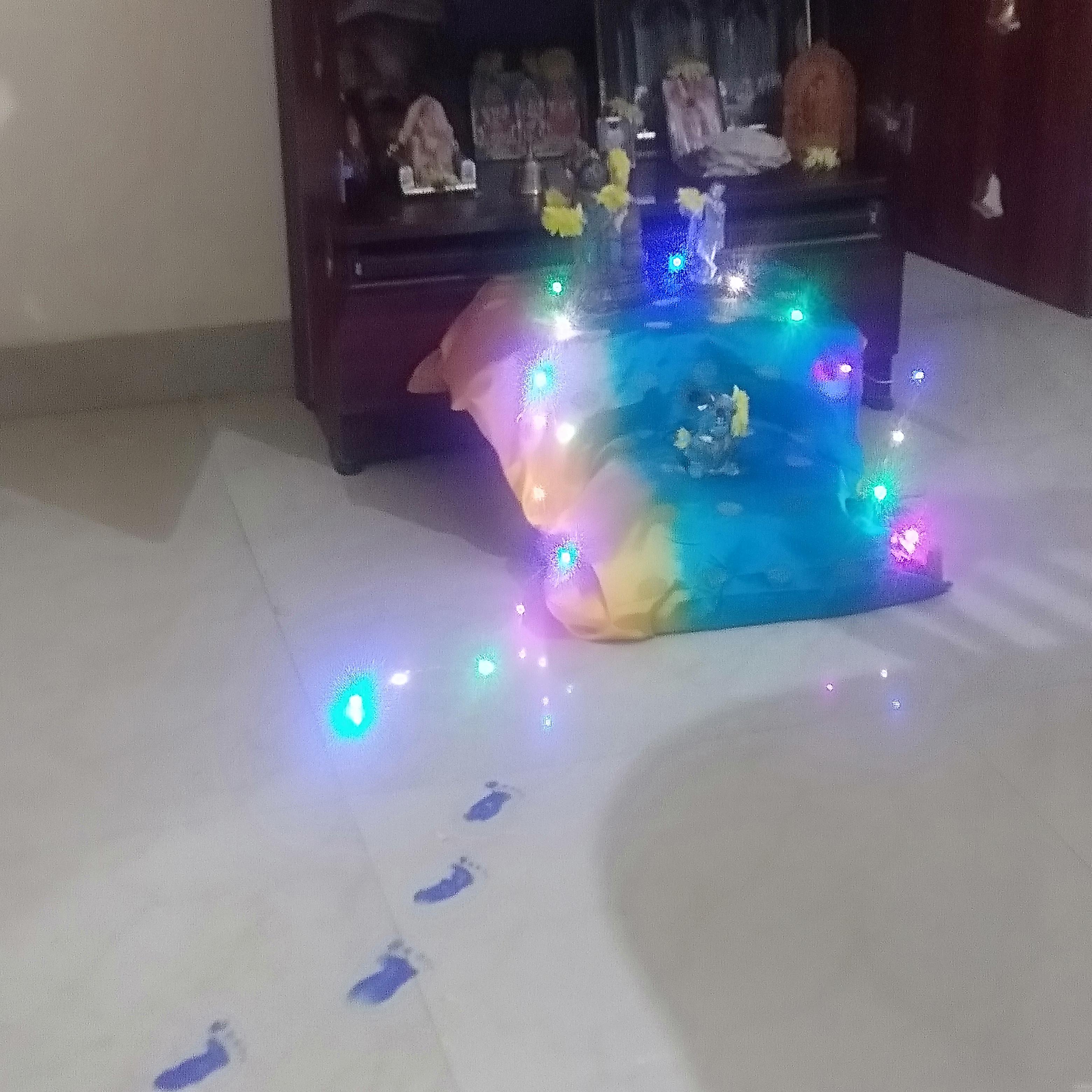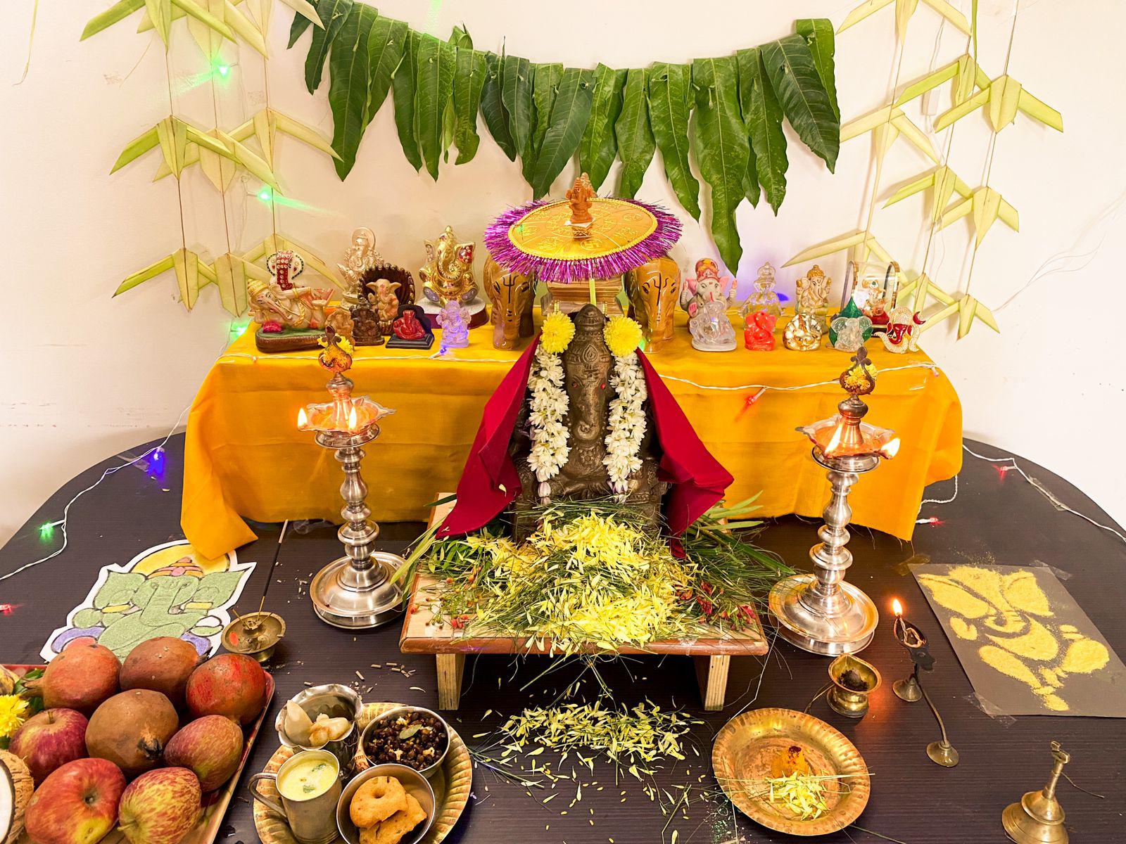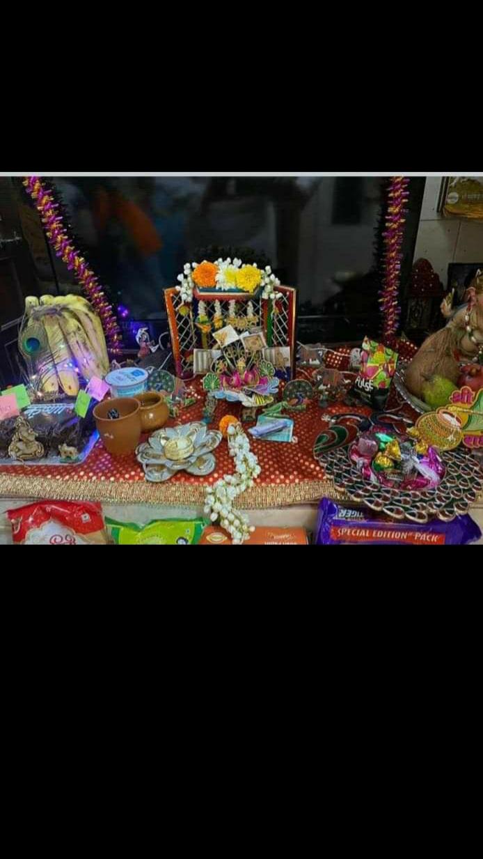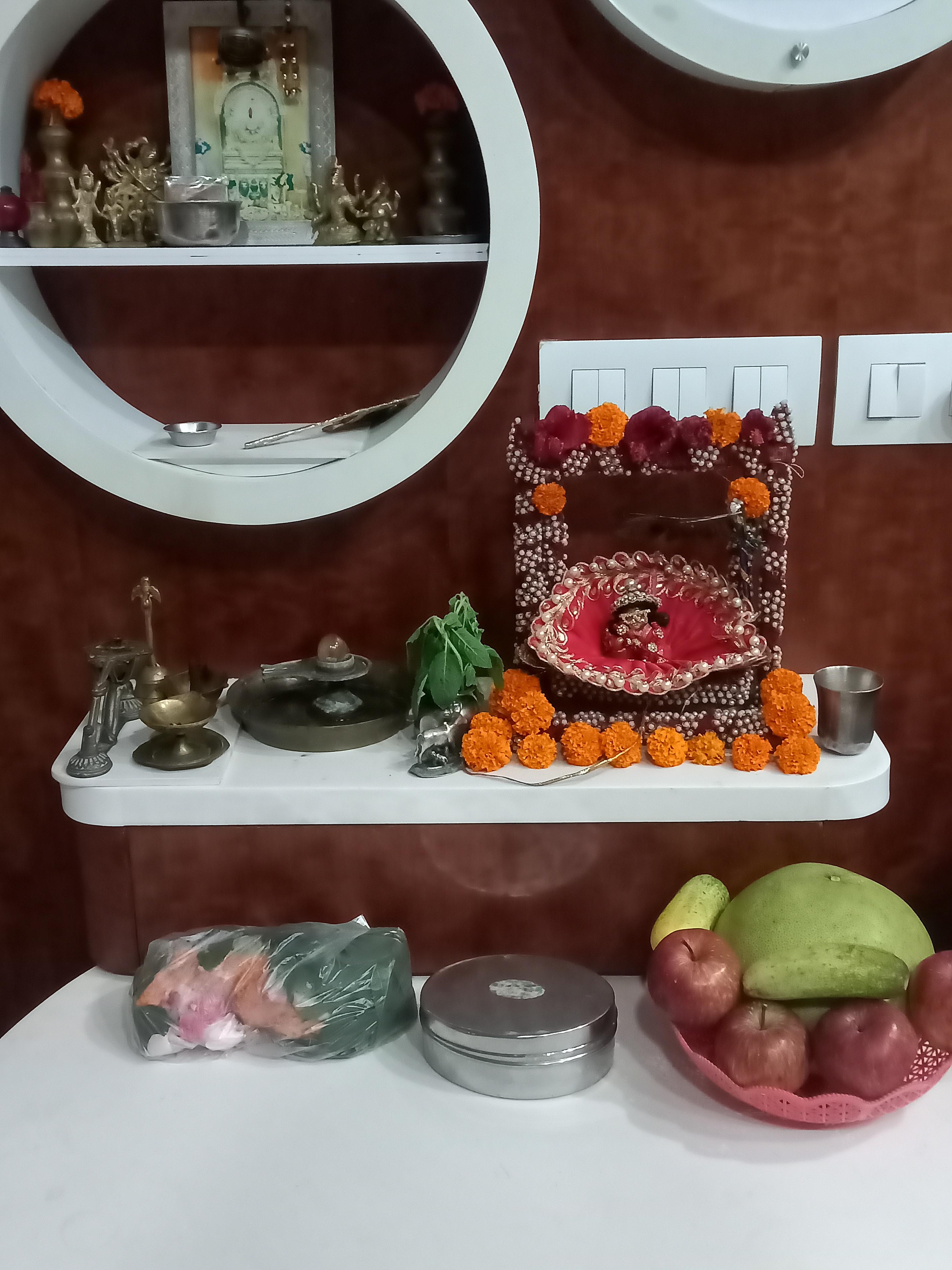 For DIY activity we started collecting small size tender coconut in the backyard of my house to make mouse. The tender coconut was painted and decorated as mouse by collecting coconut dried branches for tail and coconut shell for ears . The mouse is called Mooshak and is considered to be Lord Ganesh’s vaahan or vehicle. The pooja area is finally arranged with flowers and mango leaves which is auspicious on this occasion.The pooja area is arranged with collection of cute Lord Ganesha which is almost a decade old.