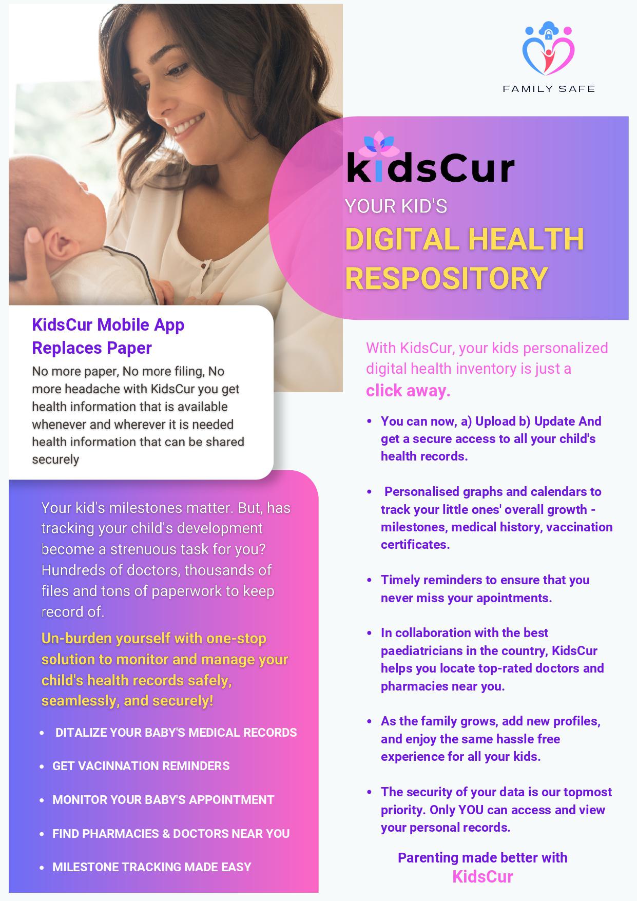 KidsCur was born when, as a mother of twins, I struggled to keep my kids’ medical records safe. I realized that parents needed a digital, one-tap solution to maintain all documents, and KidsCur was the solution. KidsCur is a digital health repository, an app that helps parents monitor their child’s vaccination records and other health-related information. Get instant access to all your child’s health records in one place — anytime, anywhere, and with just a few taps on your phone. It’s time to switch from paper to digital and get rid of unnecessary paperwork!