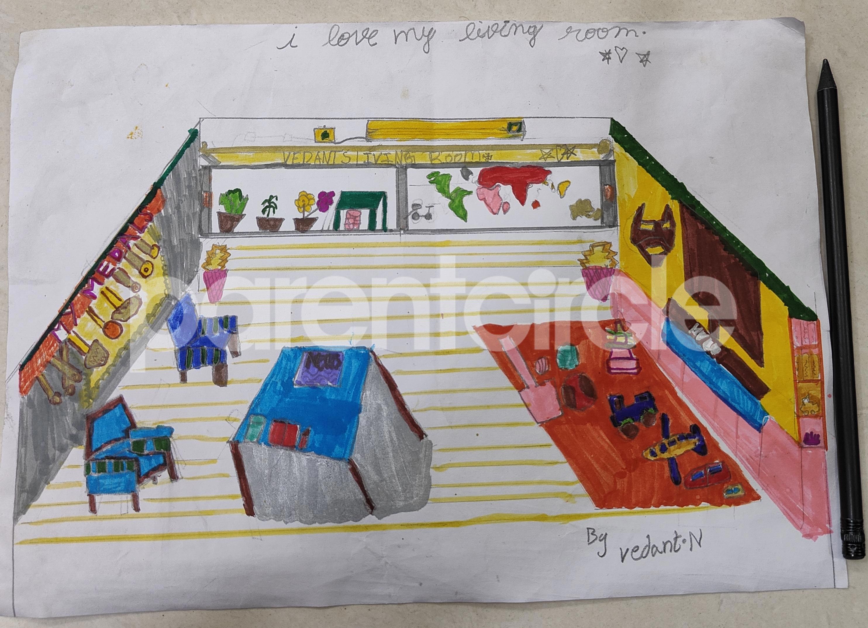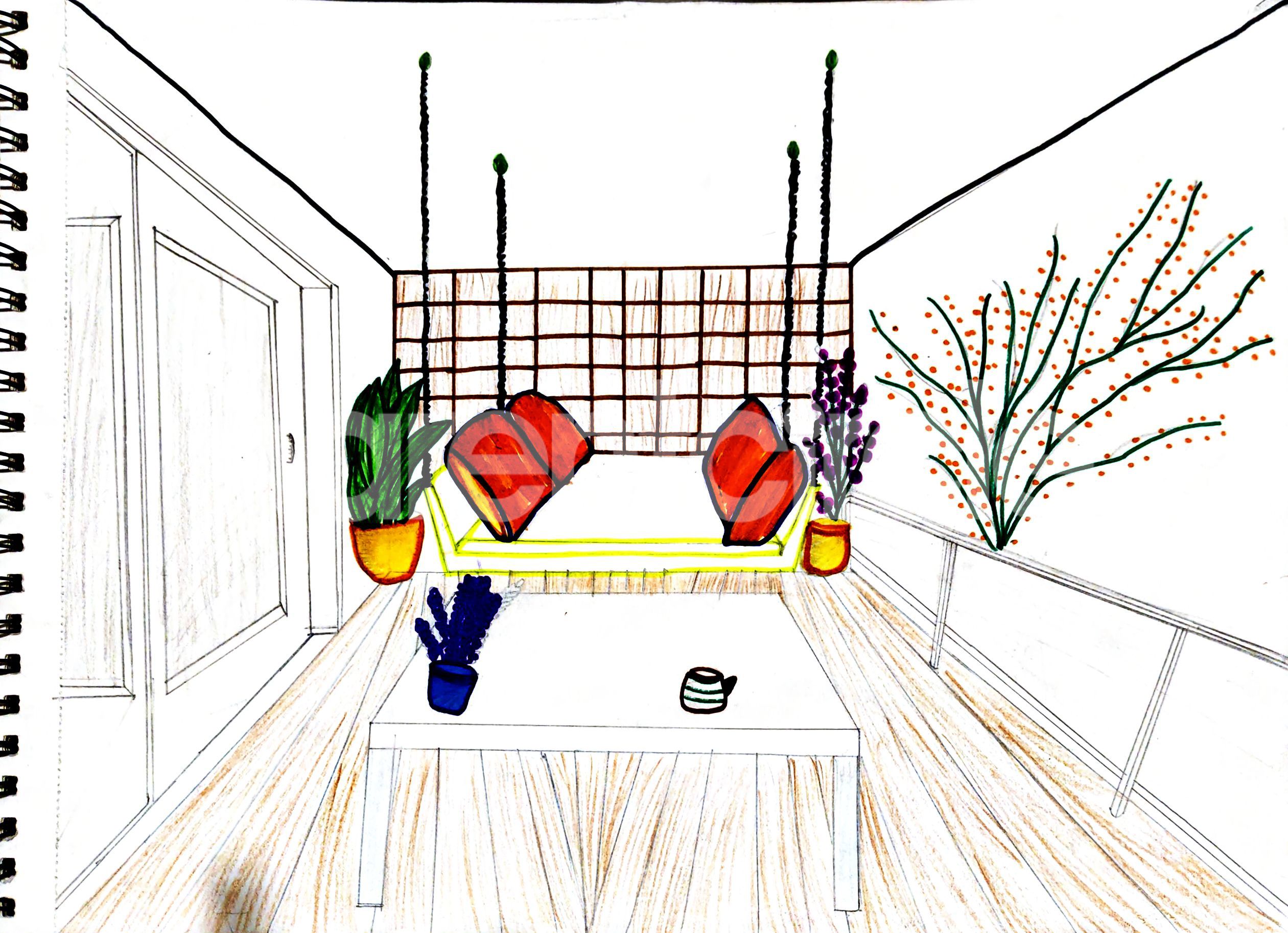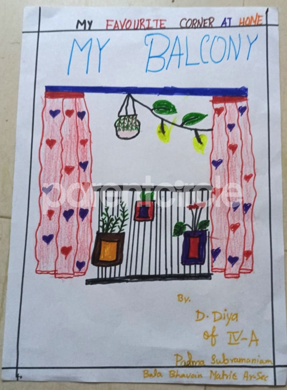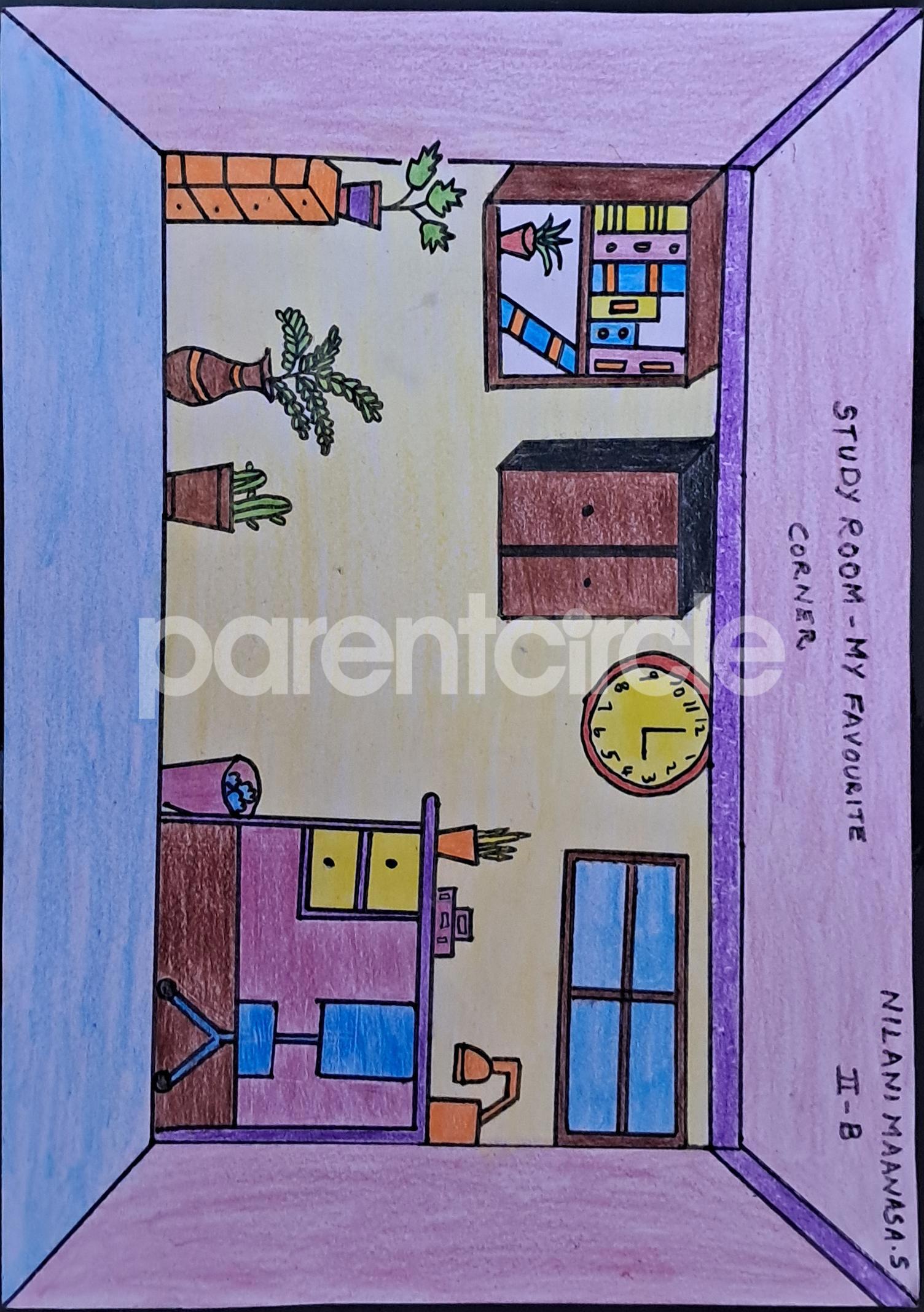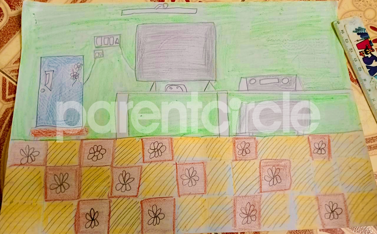 Diya has more than one favourite corner at home. The above drawing shows Study table along with her ART and CRAFT hanging, watching TV by sating on the Couch and finally her small garden in the balcony