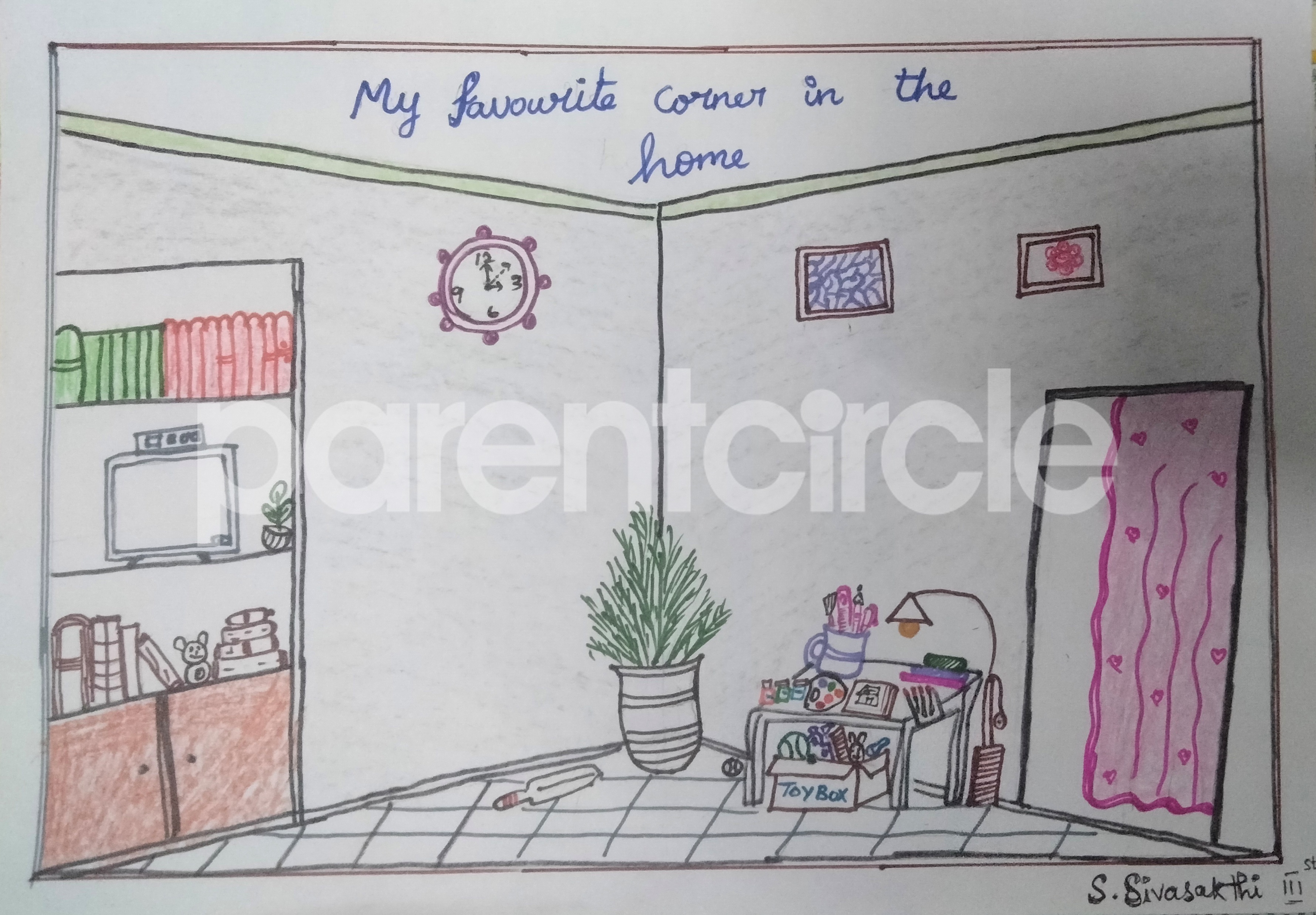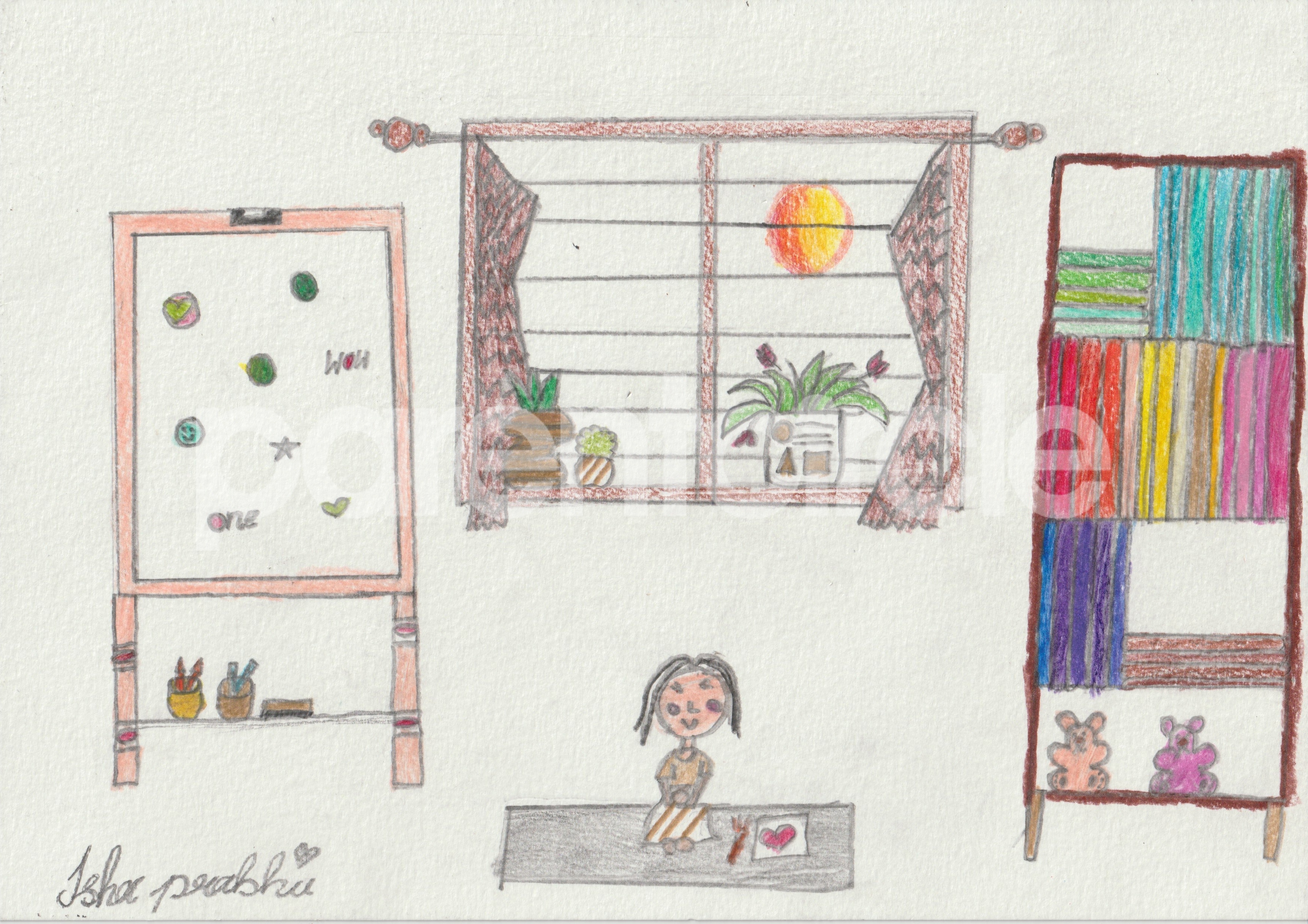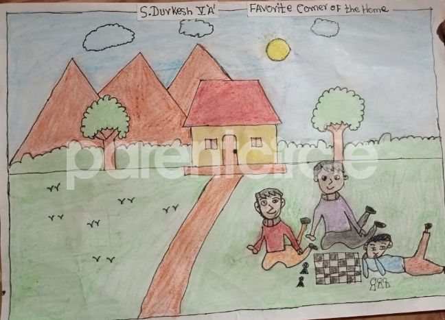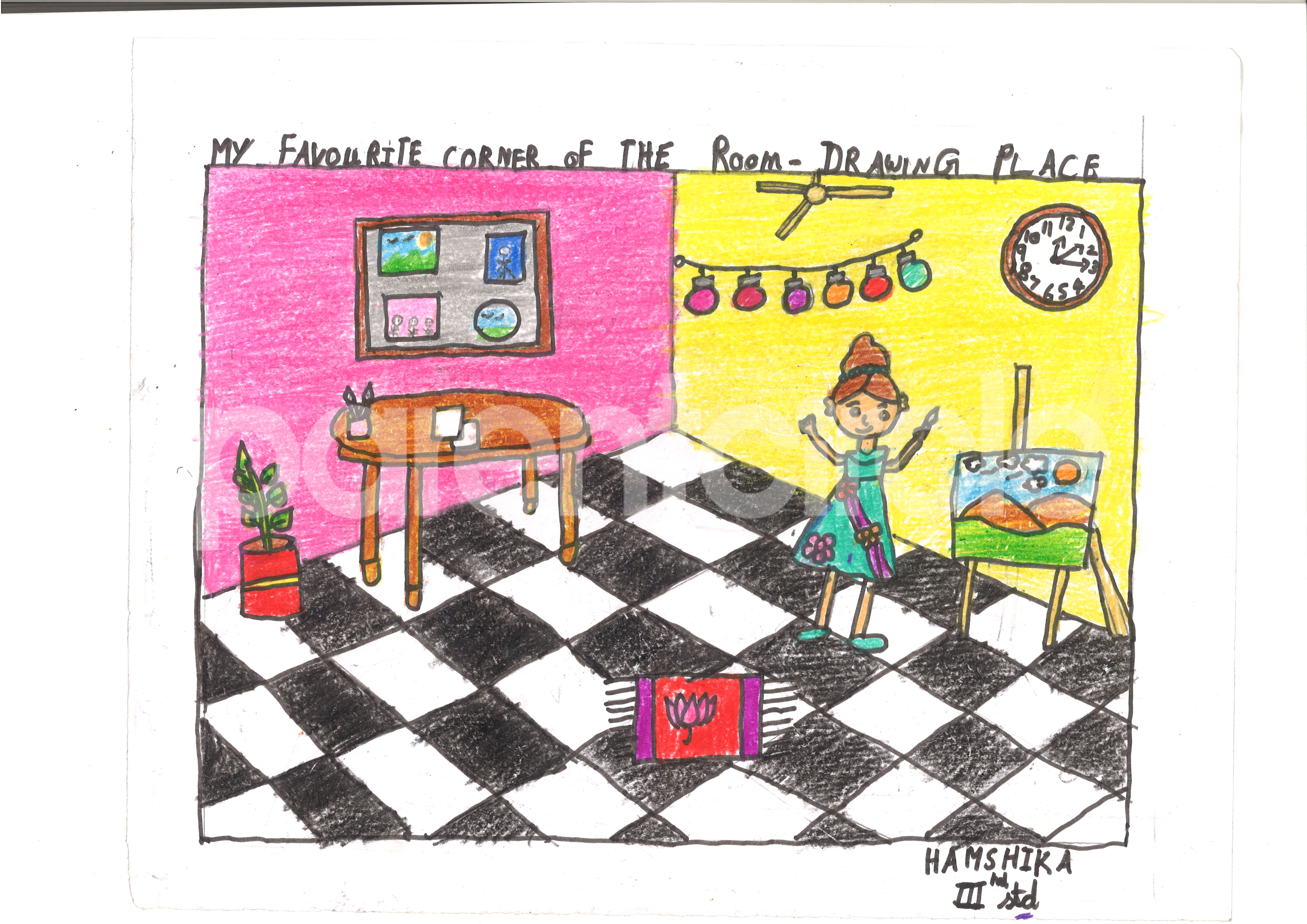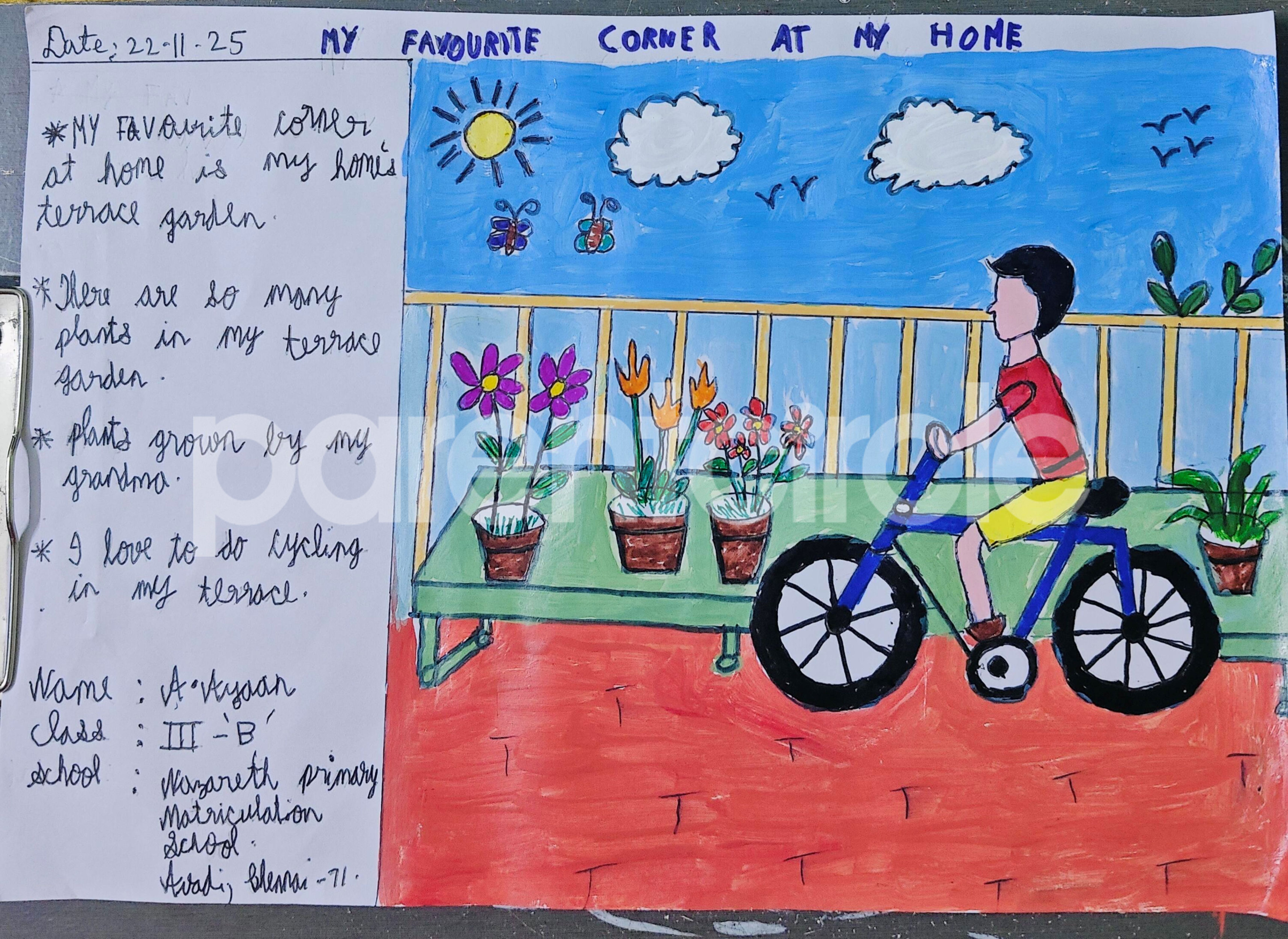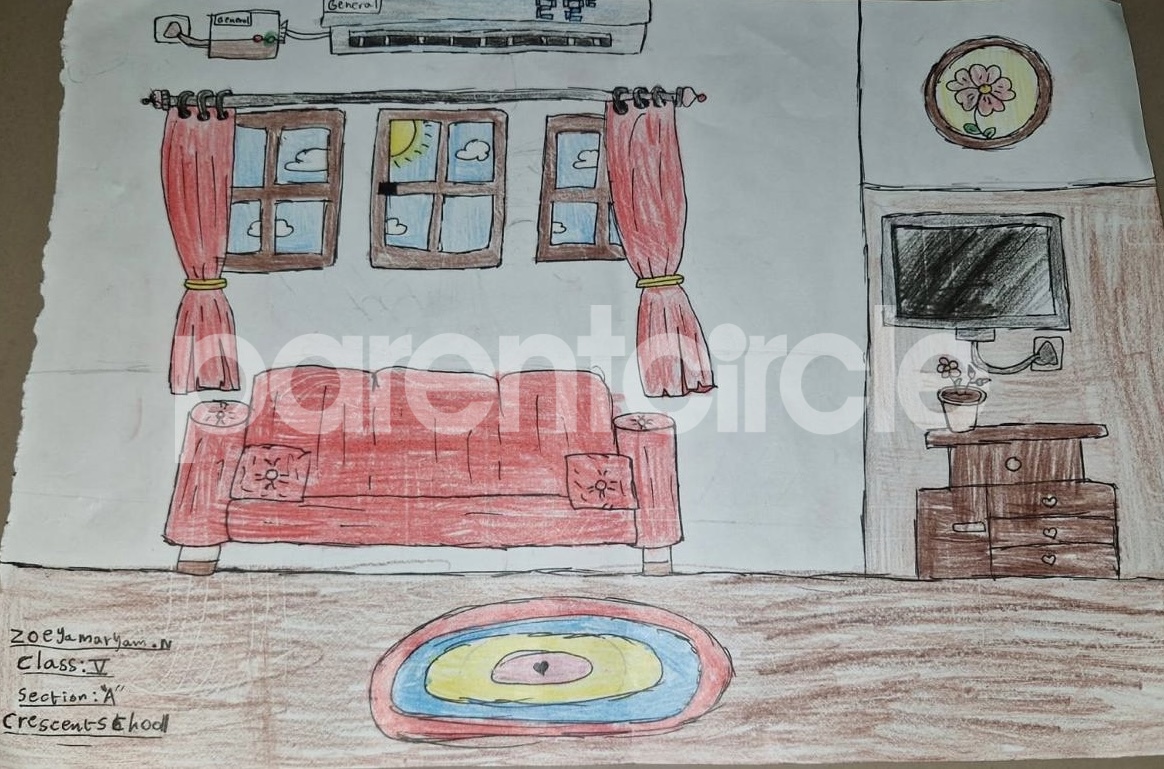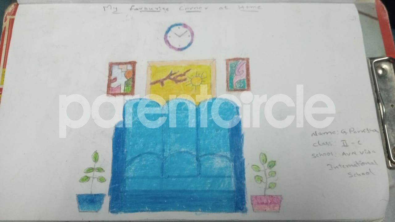 Diya has more than one favourite corner at home. The above drawing shows Study table along with her ART and CRAFT hanging, watching TV by sating on the Couch and finally her small garden in the balcony
