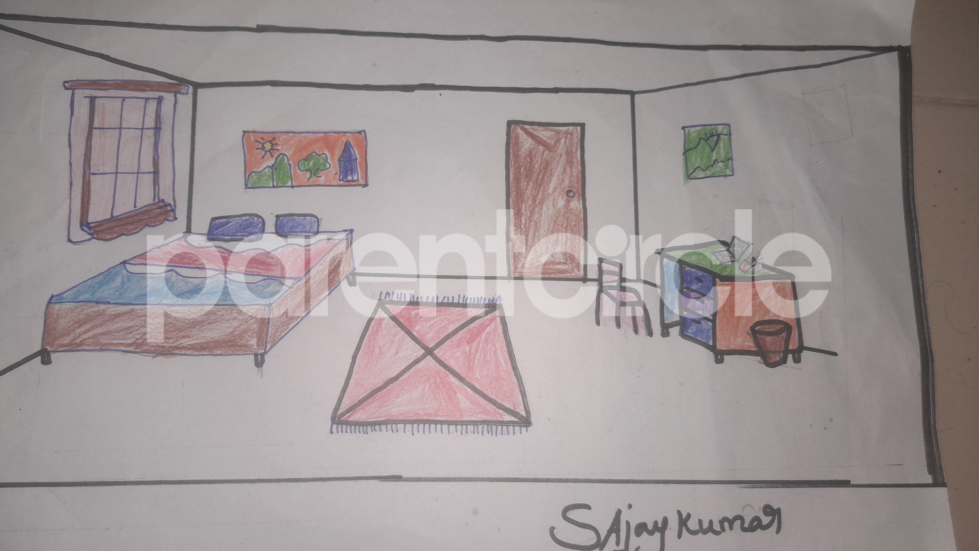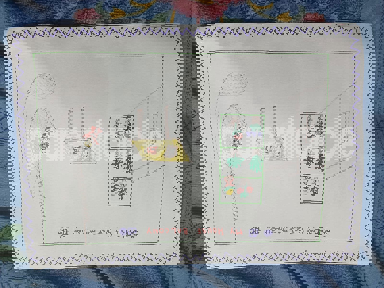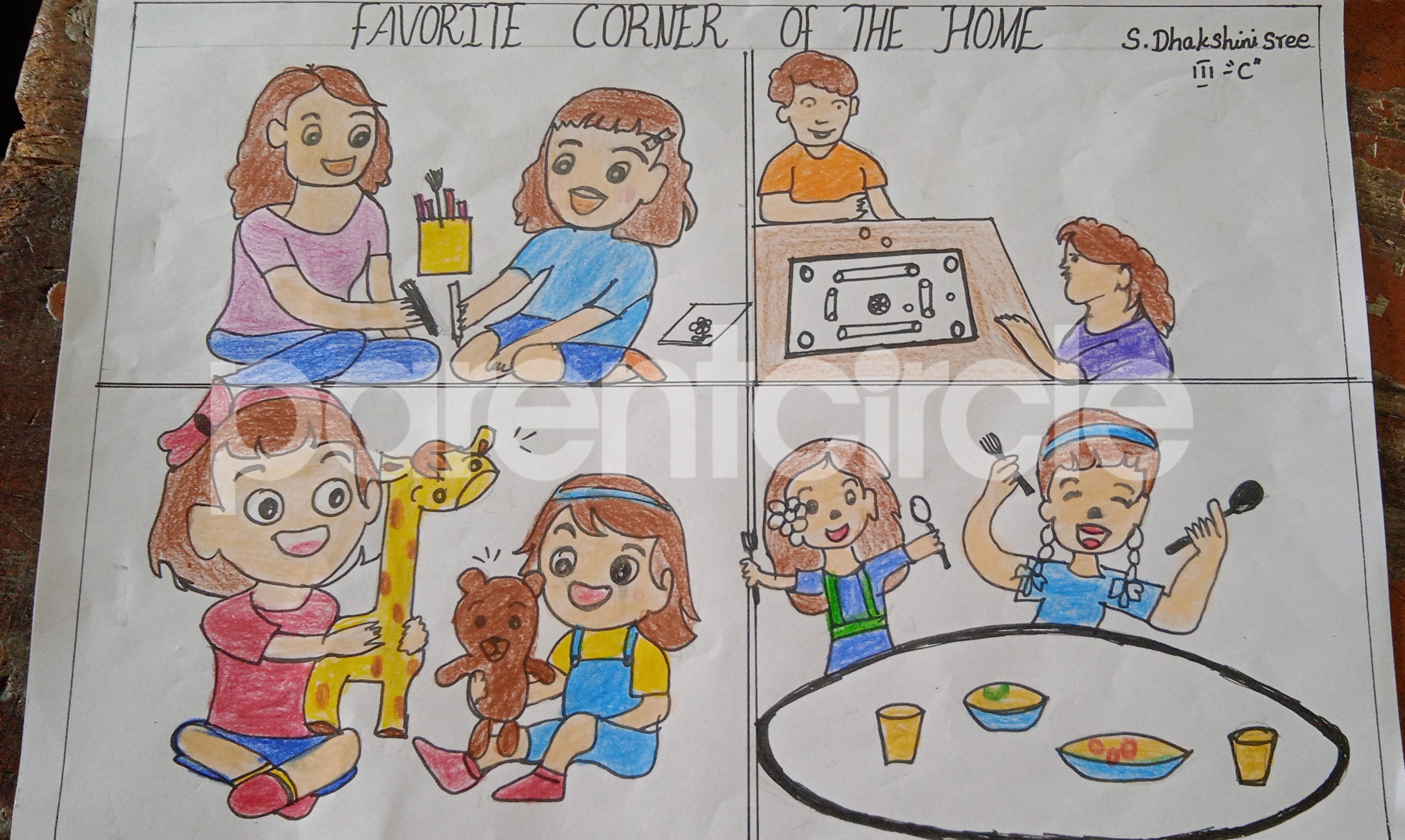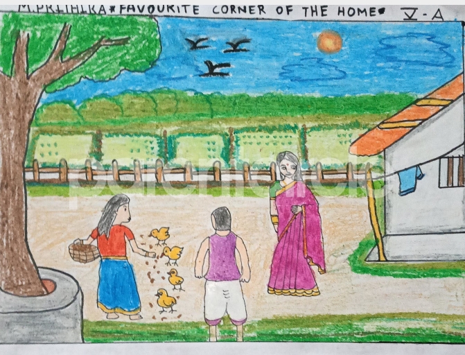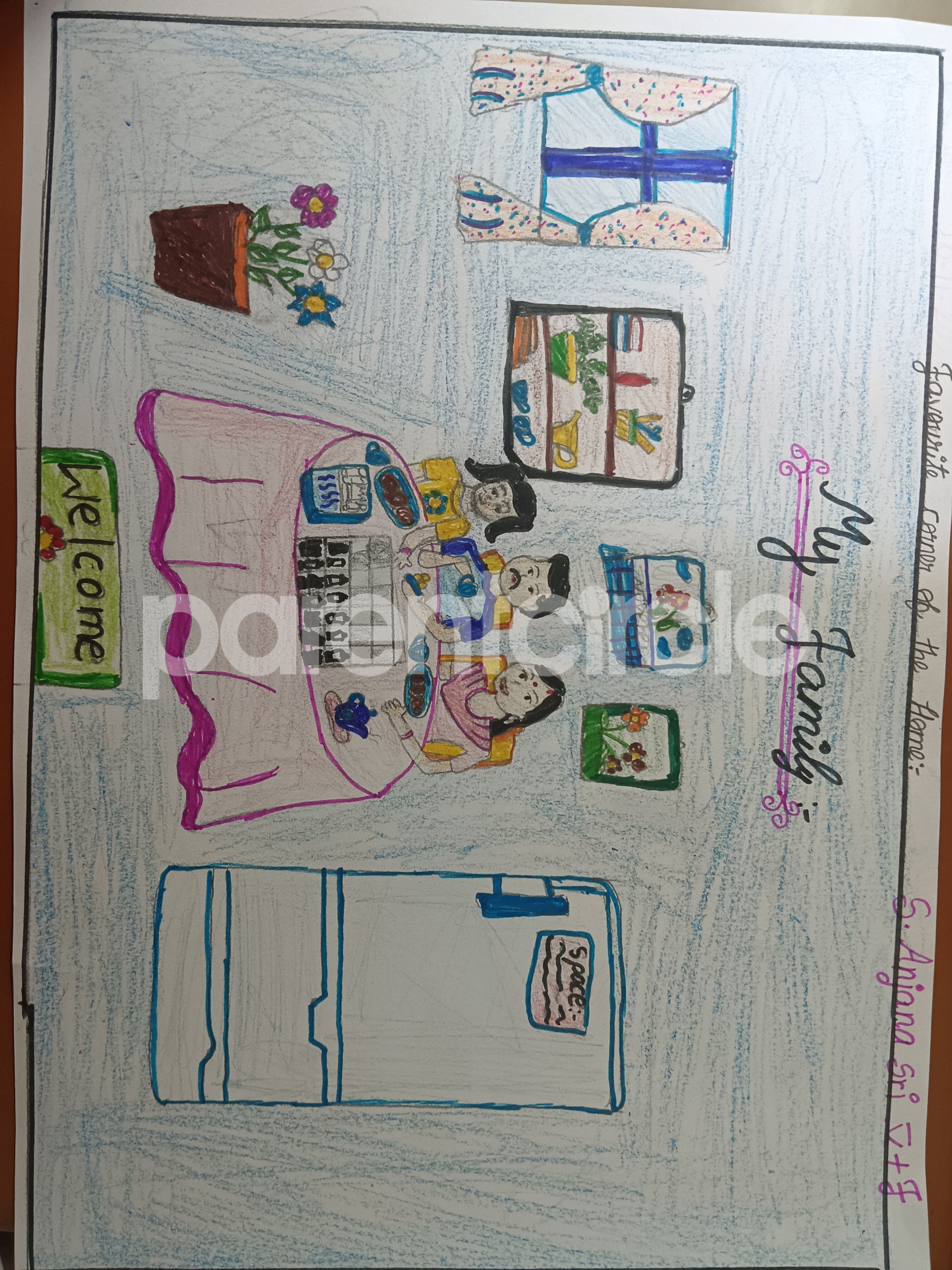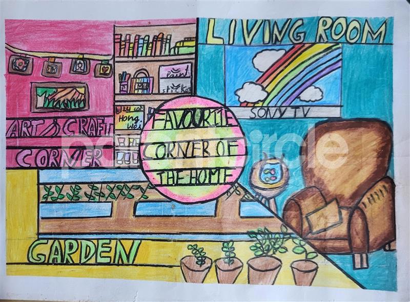 Diya has more than one favourite corner at home. The above drawing shows Study table along with her ART and CRAFT hanging, watching TV by sating on the Couch and finally her small garden in the balcony