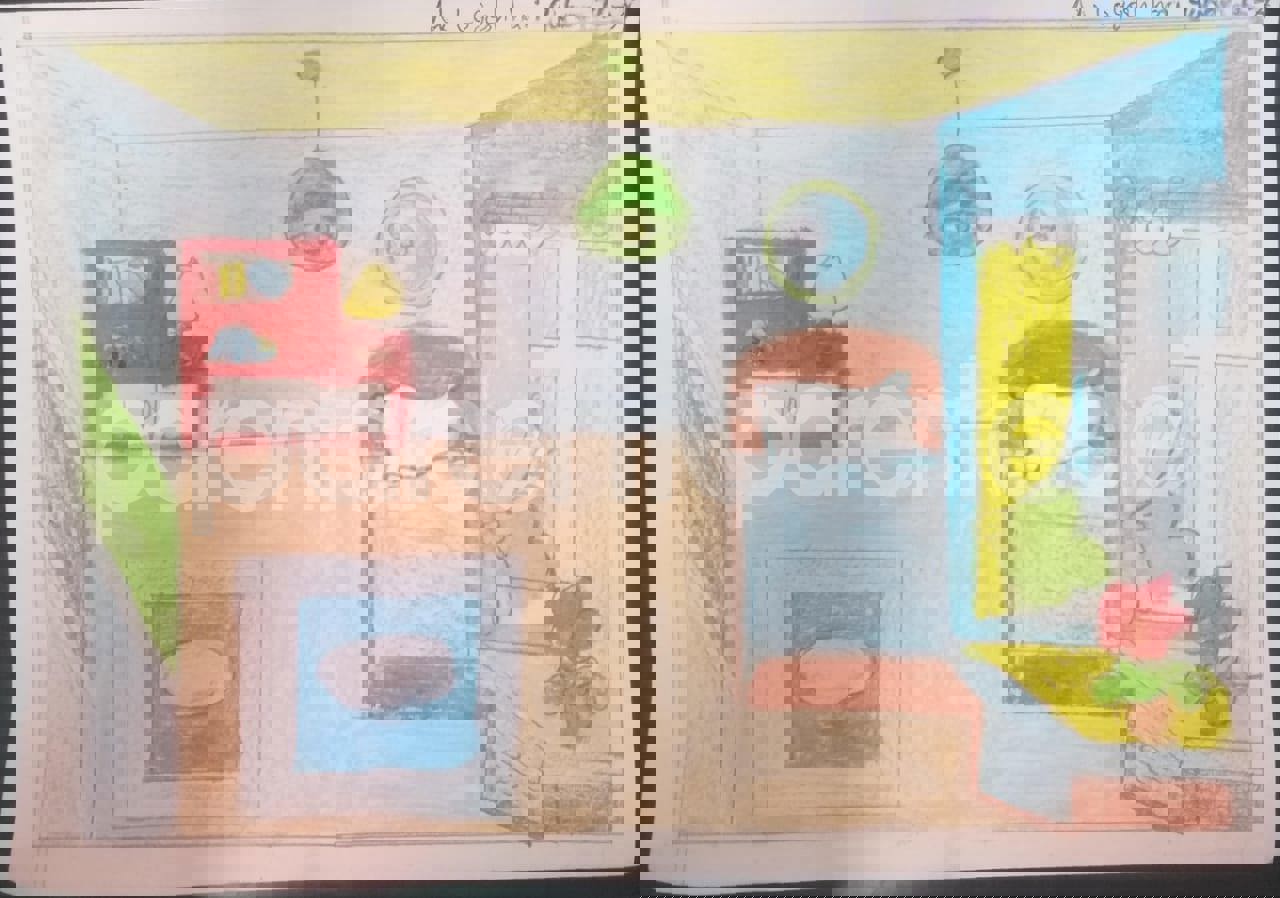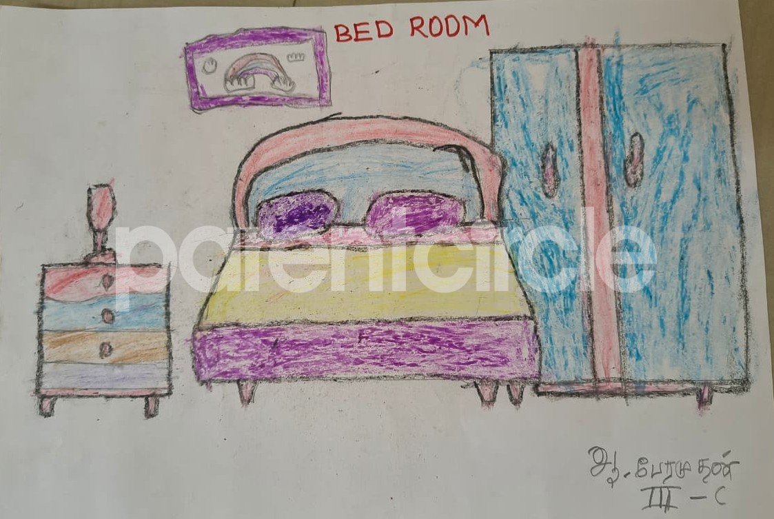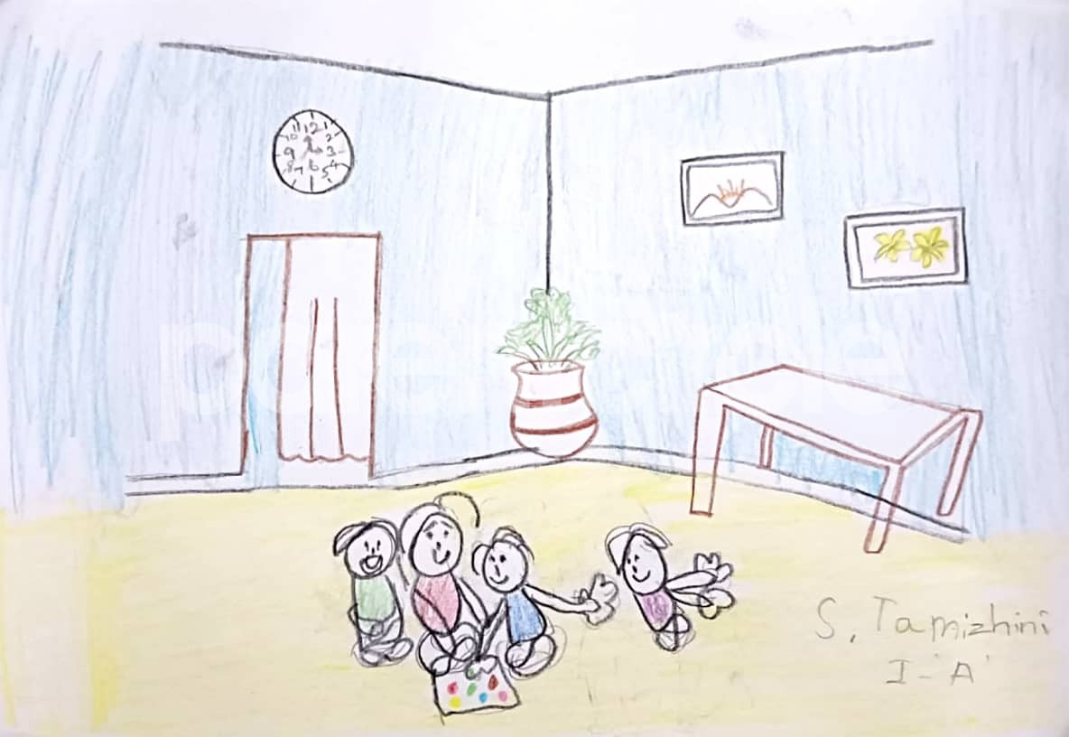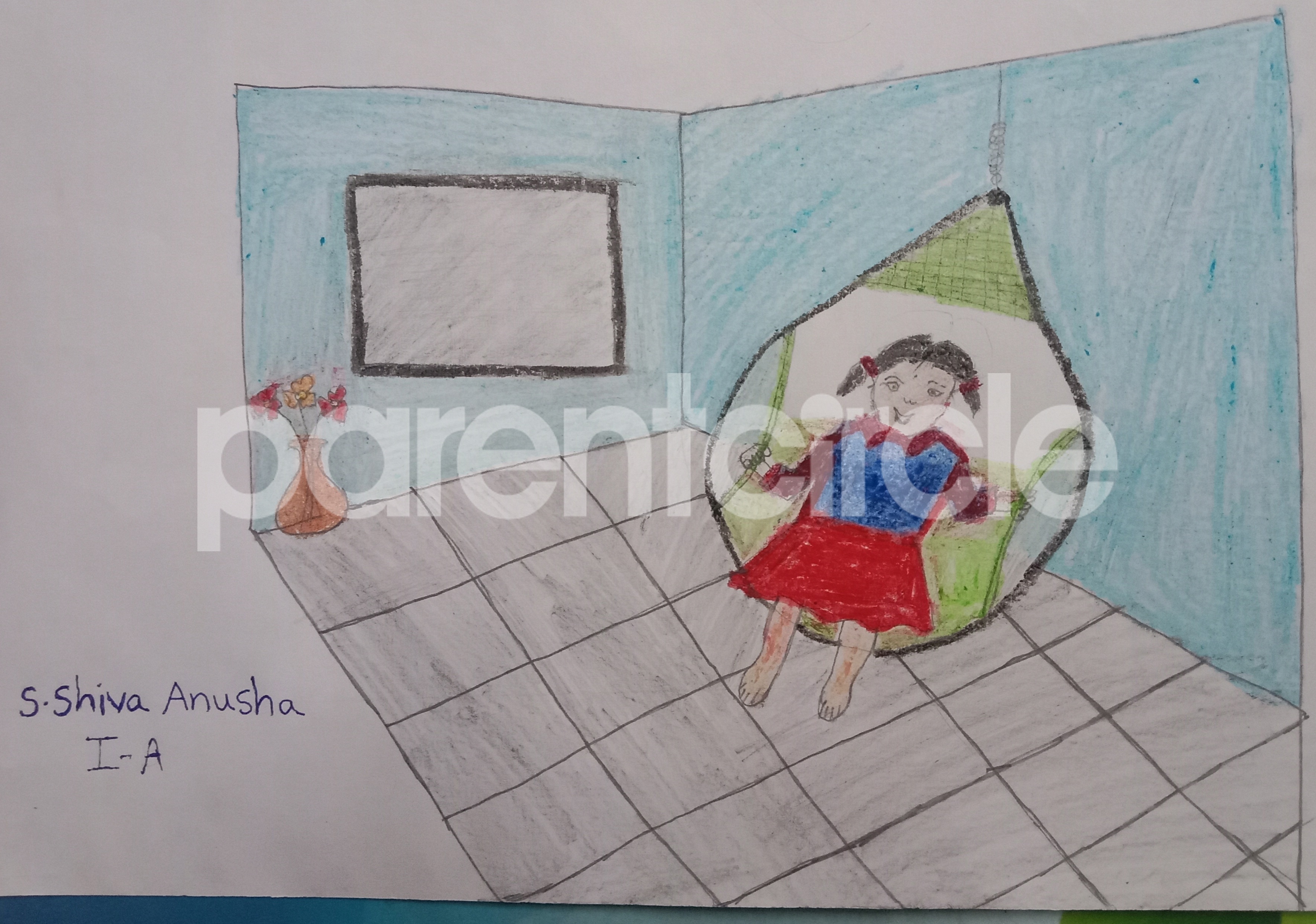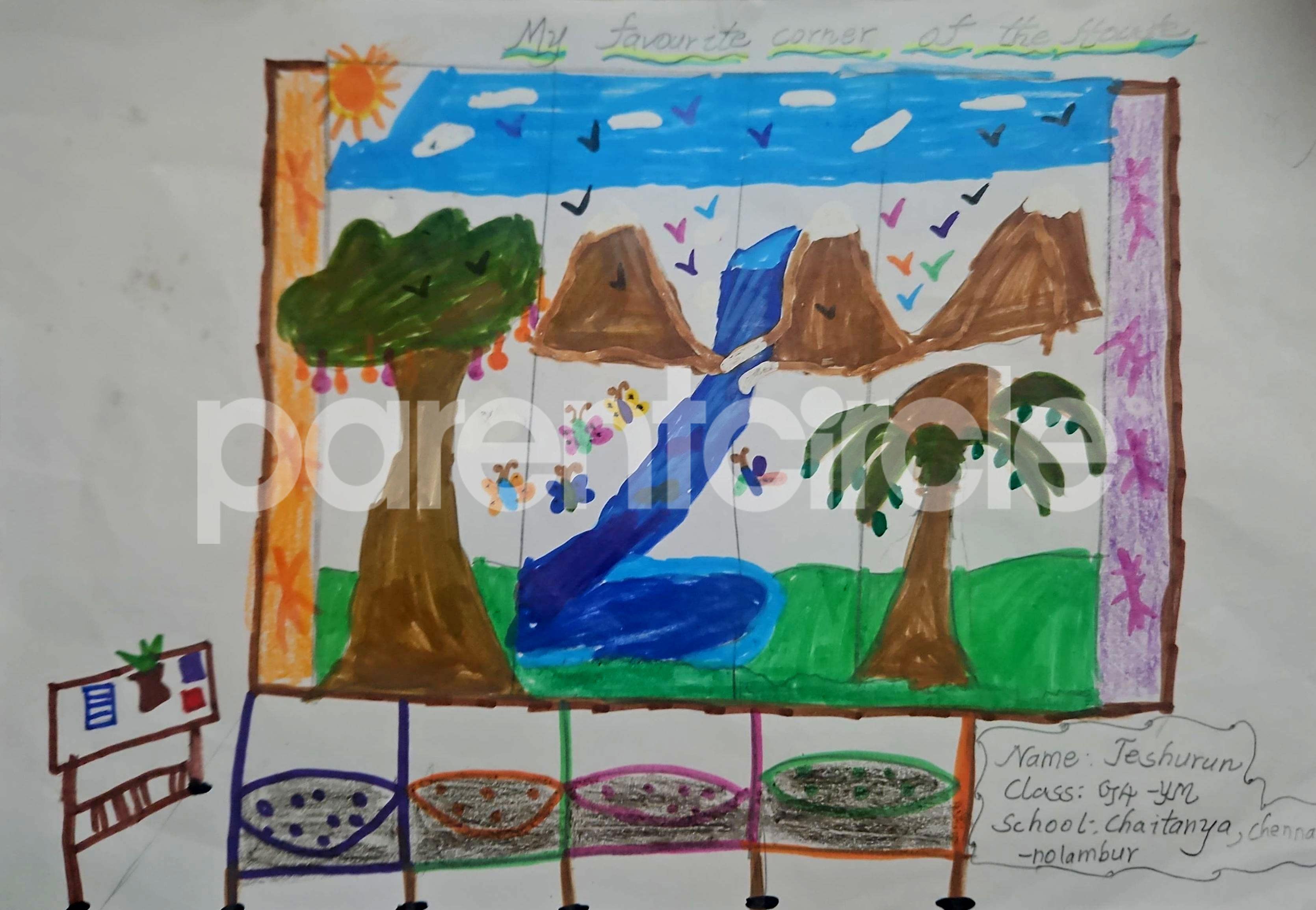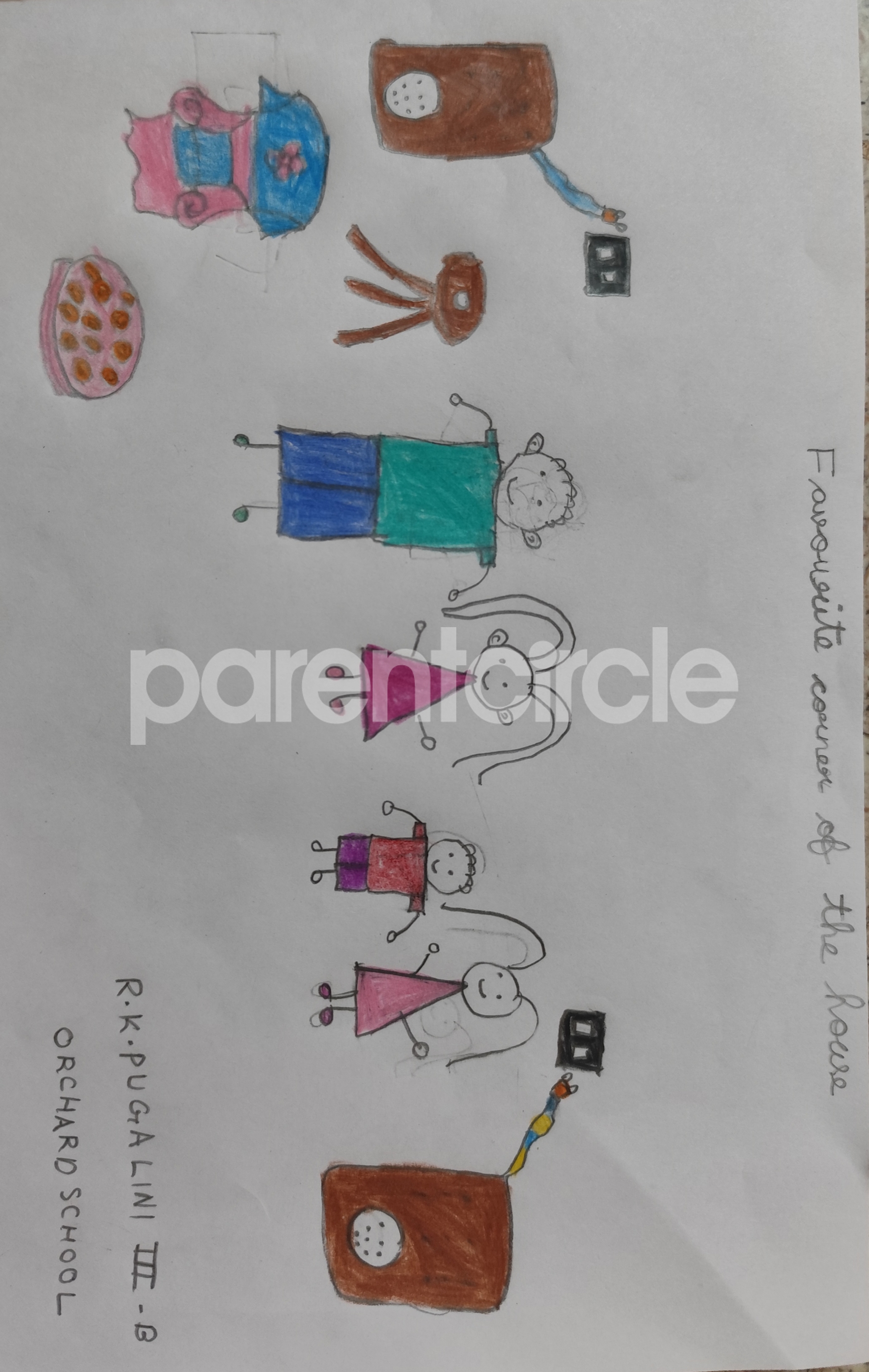 Diya has more than one favourite corner at home. The above drawing shows Study table along with her ART and CRAFT hanging, watching TV by sating on the Couch and finally her small garden in the balcony