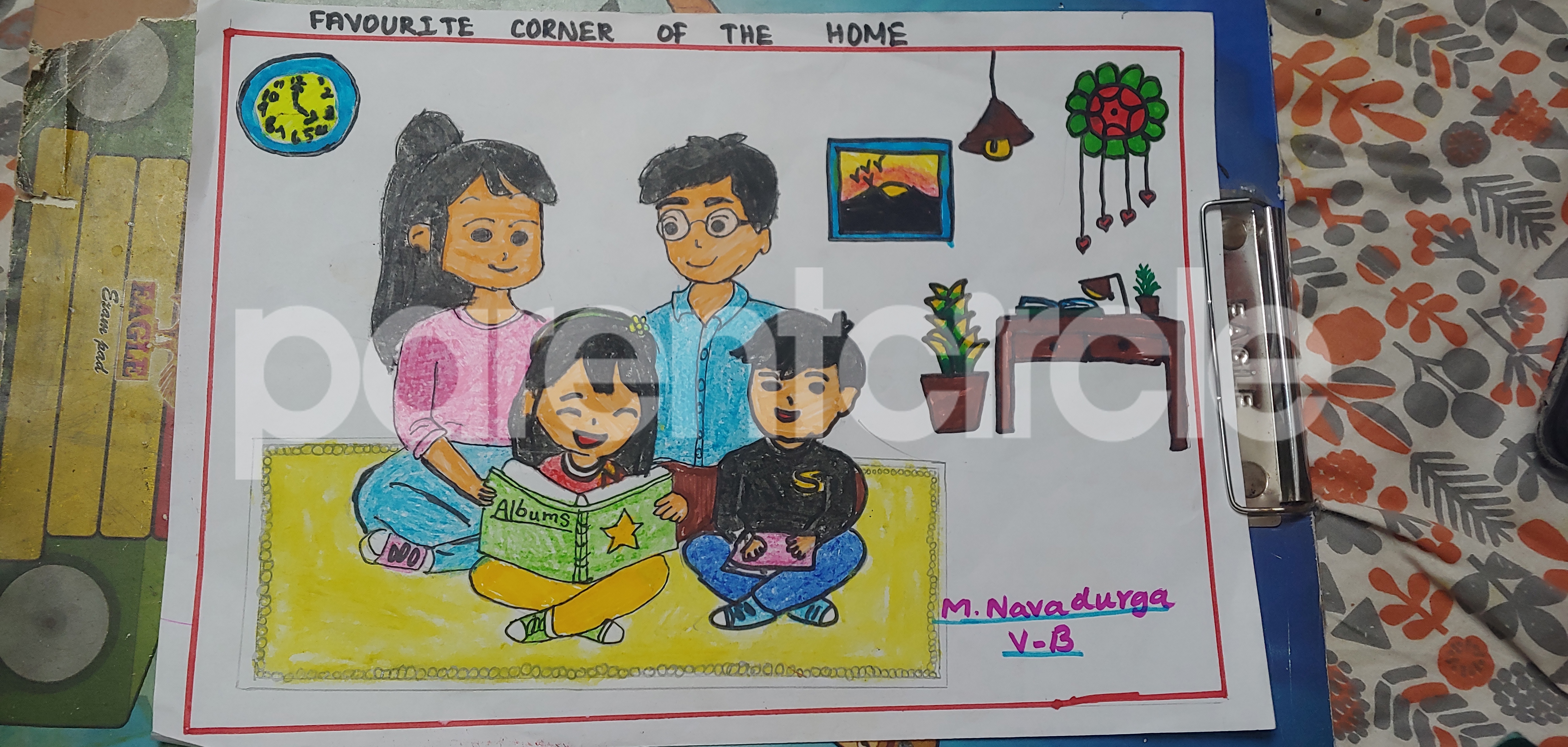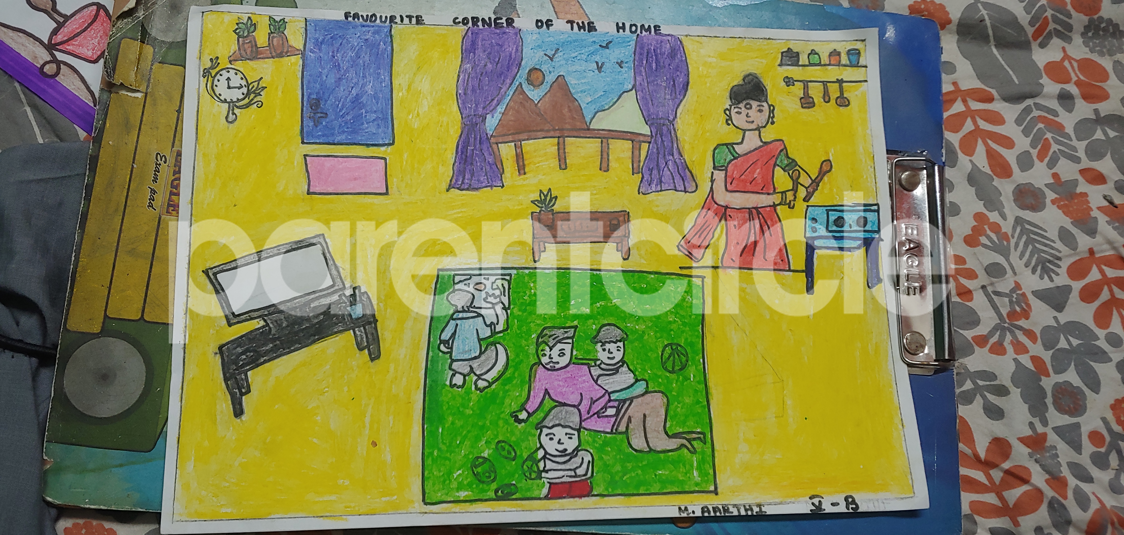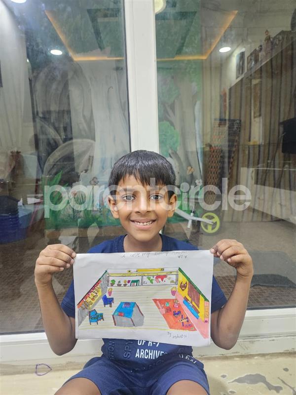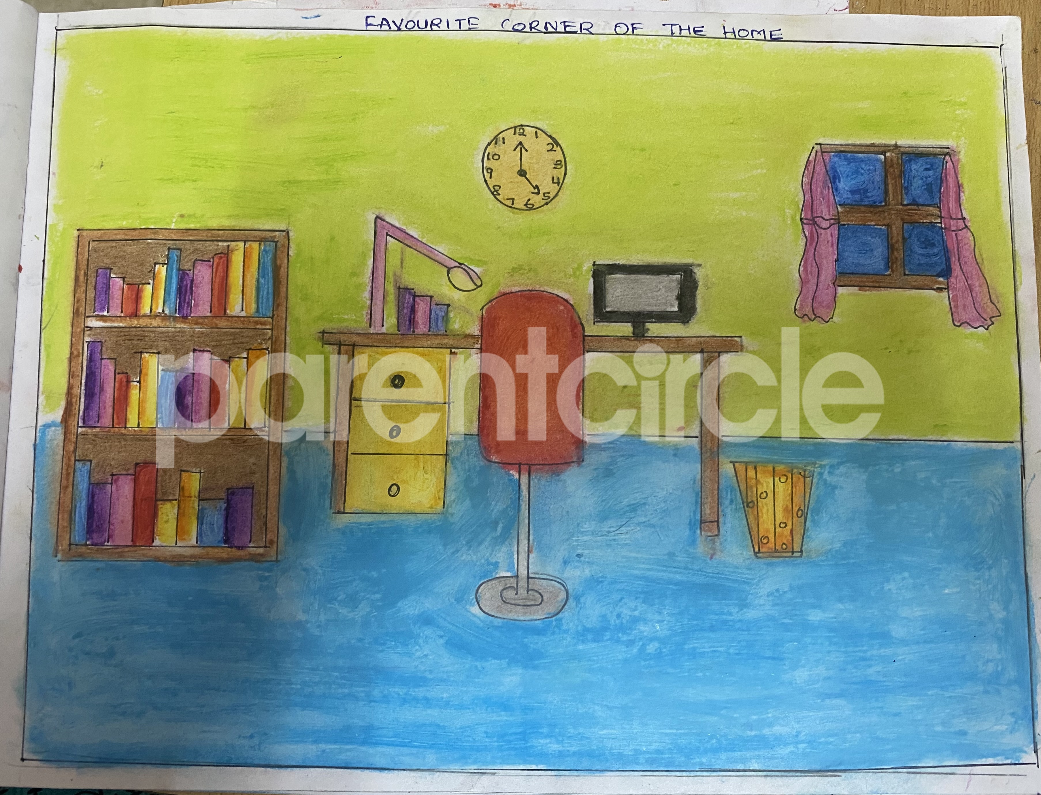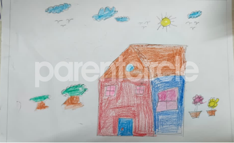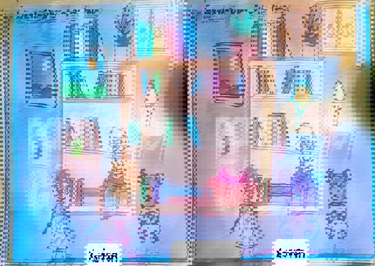 Diya has more than one favourite corner at home. The above drawing shows Study table along with her ART and CRAFT hanging, watching TV by sating on the Couch and finally her small garden in the balcony