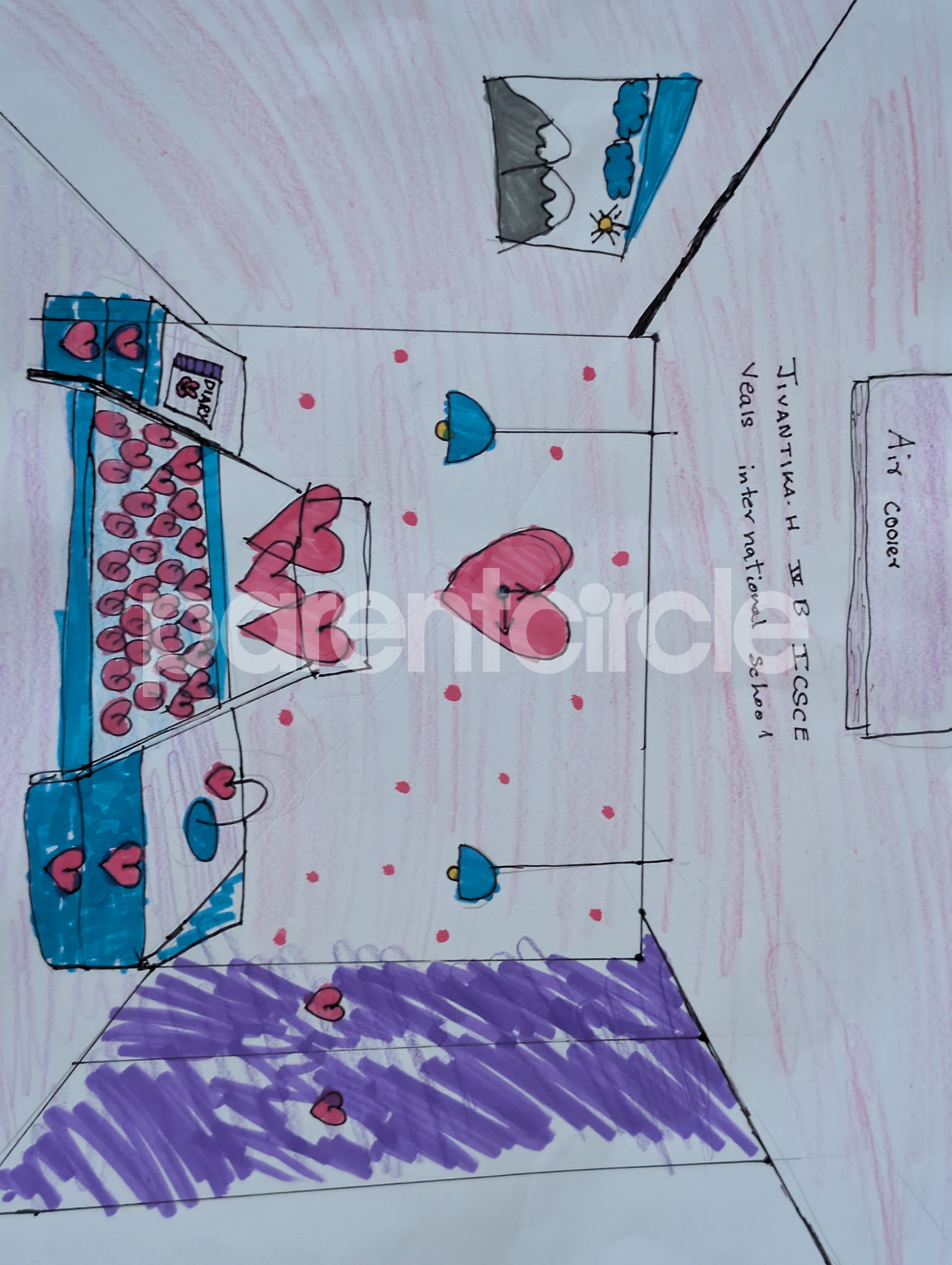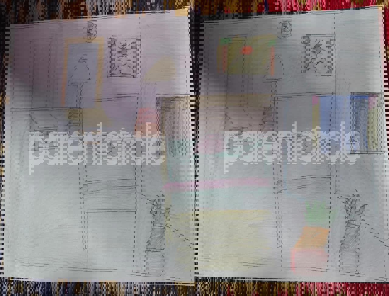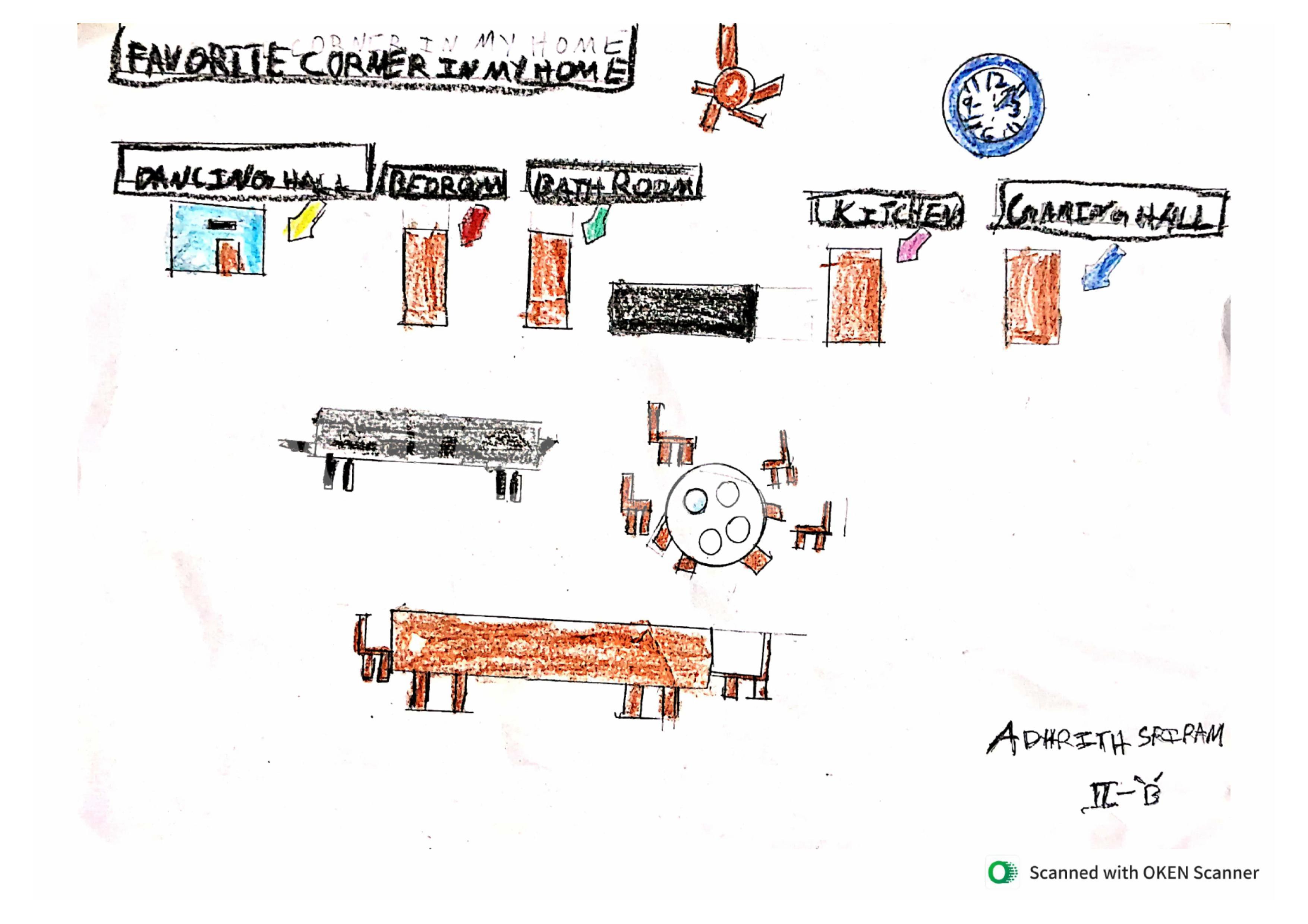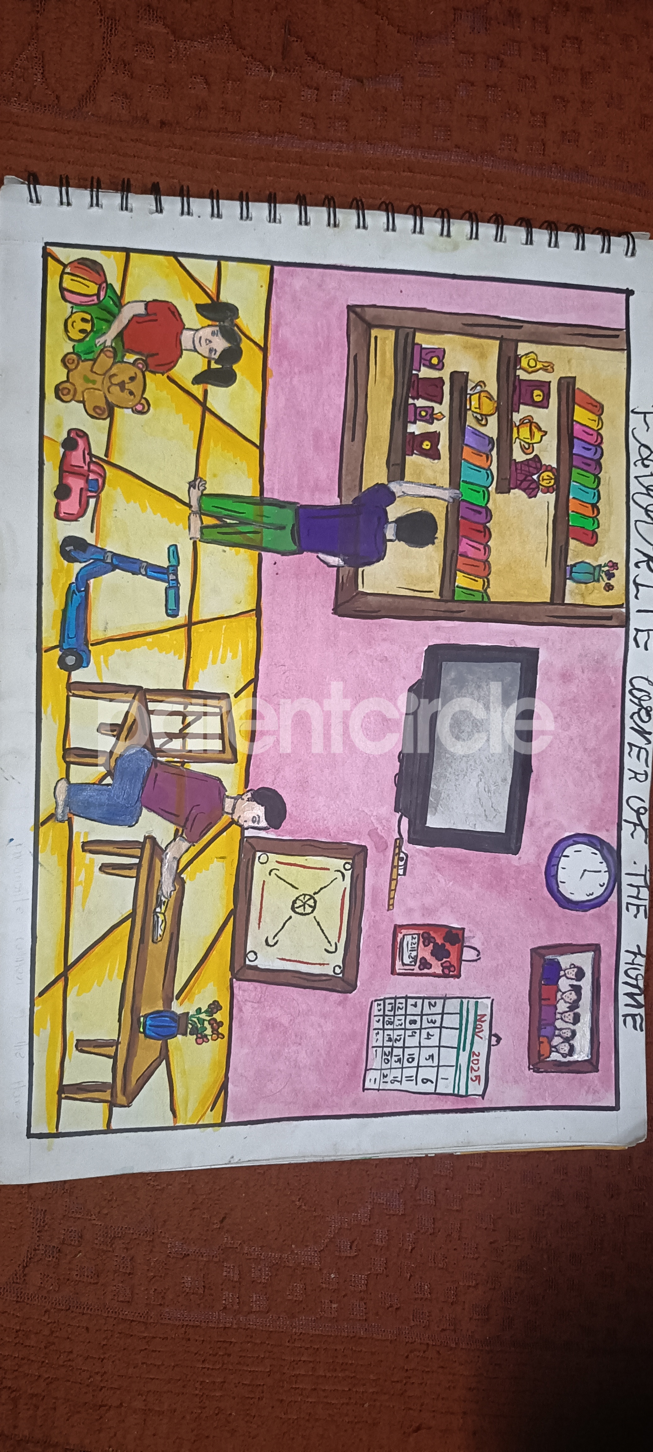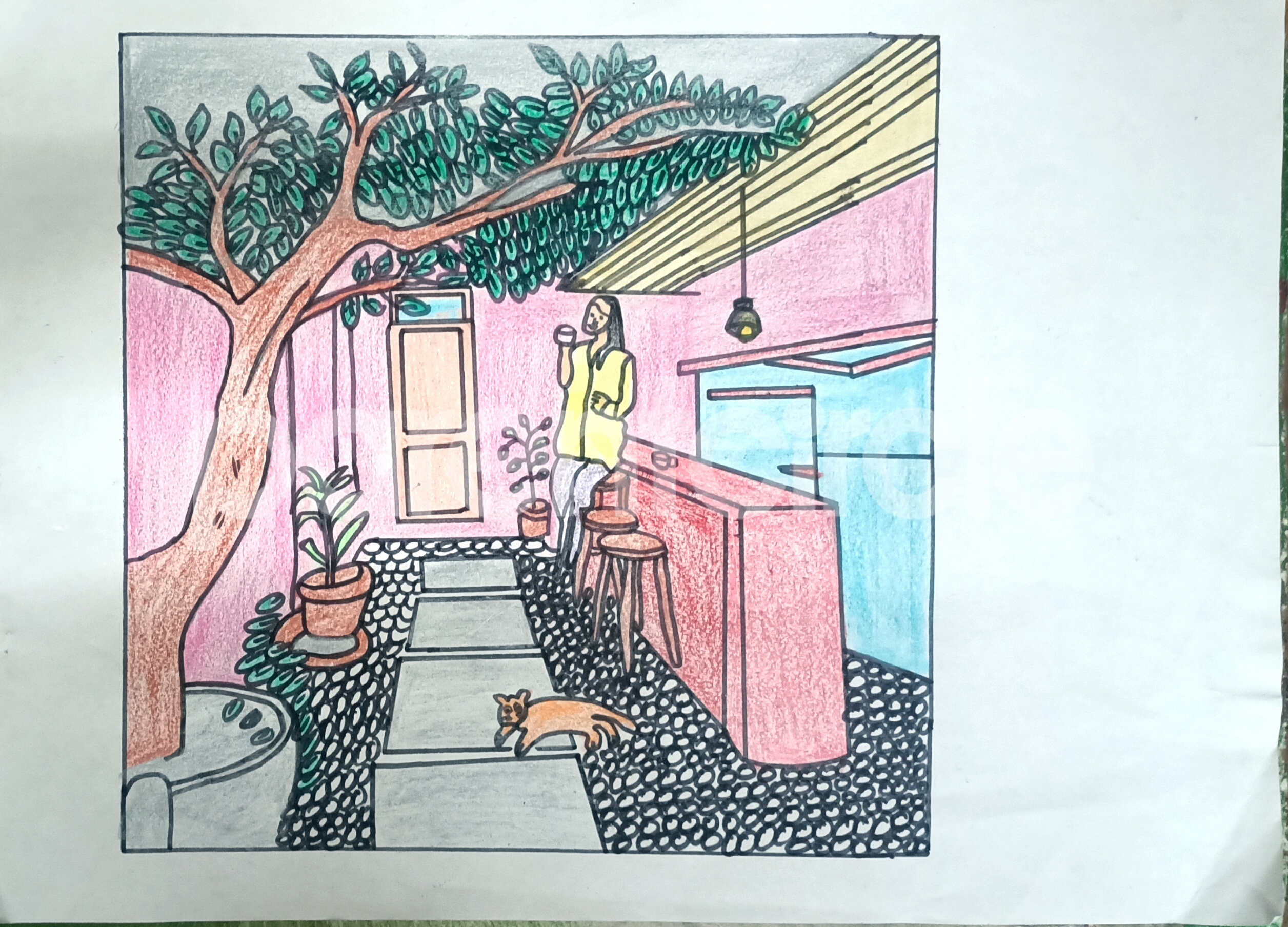 Diya has more than one favourite corner at home. The above drawing shows Study table along with her ART and CRAFT hanging, watching TV by sating on the Couch and finally her small garden in the balcony