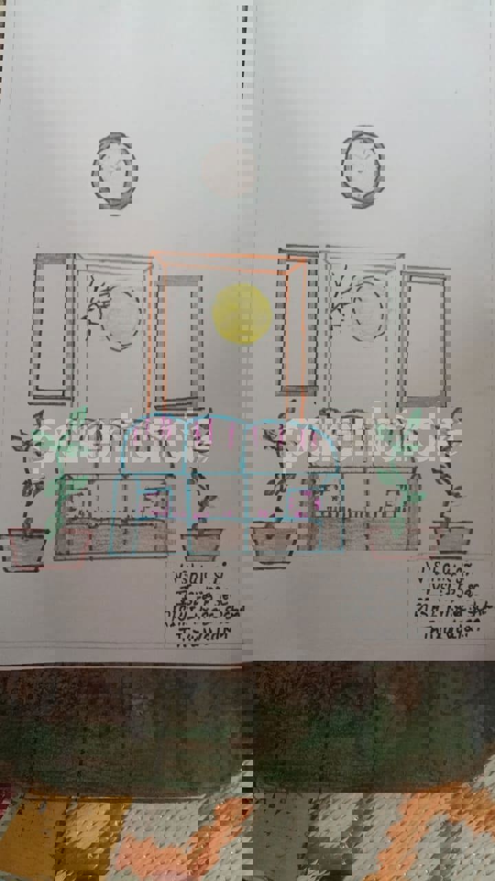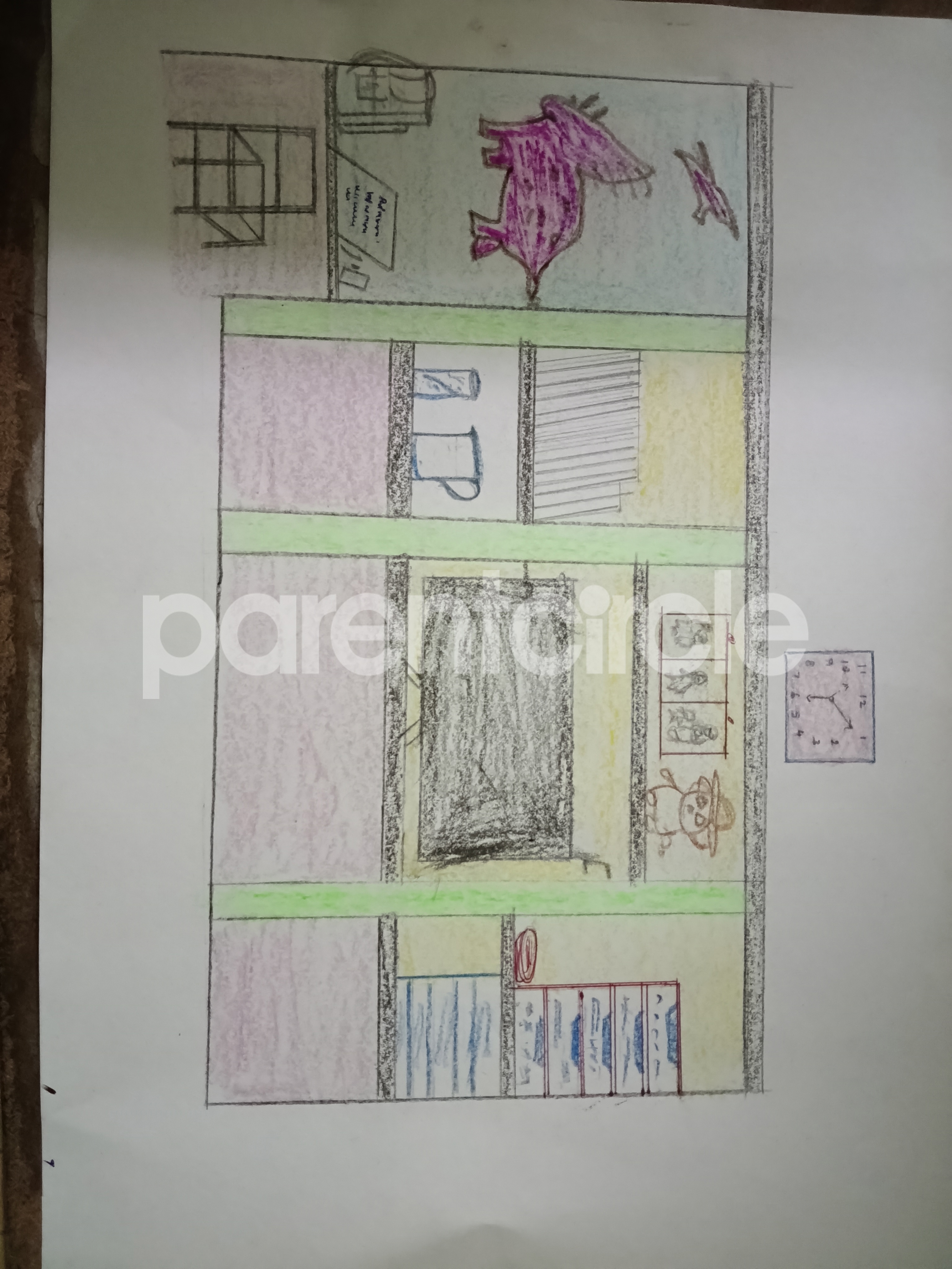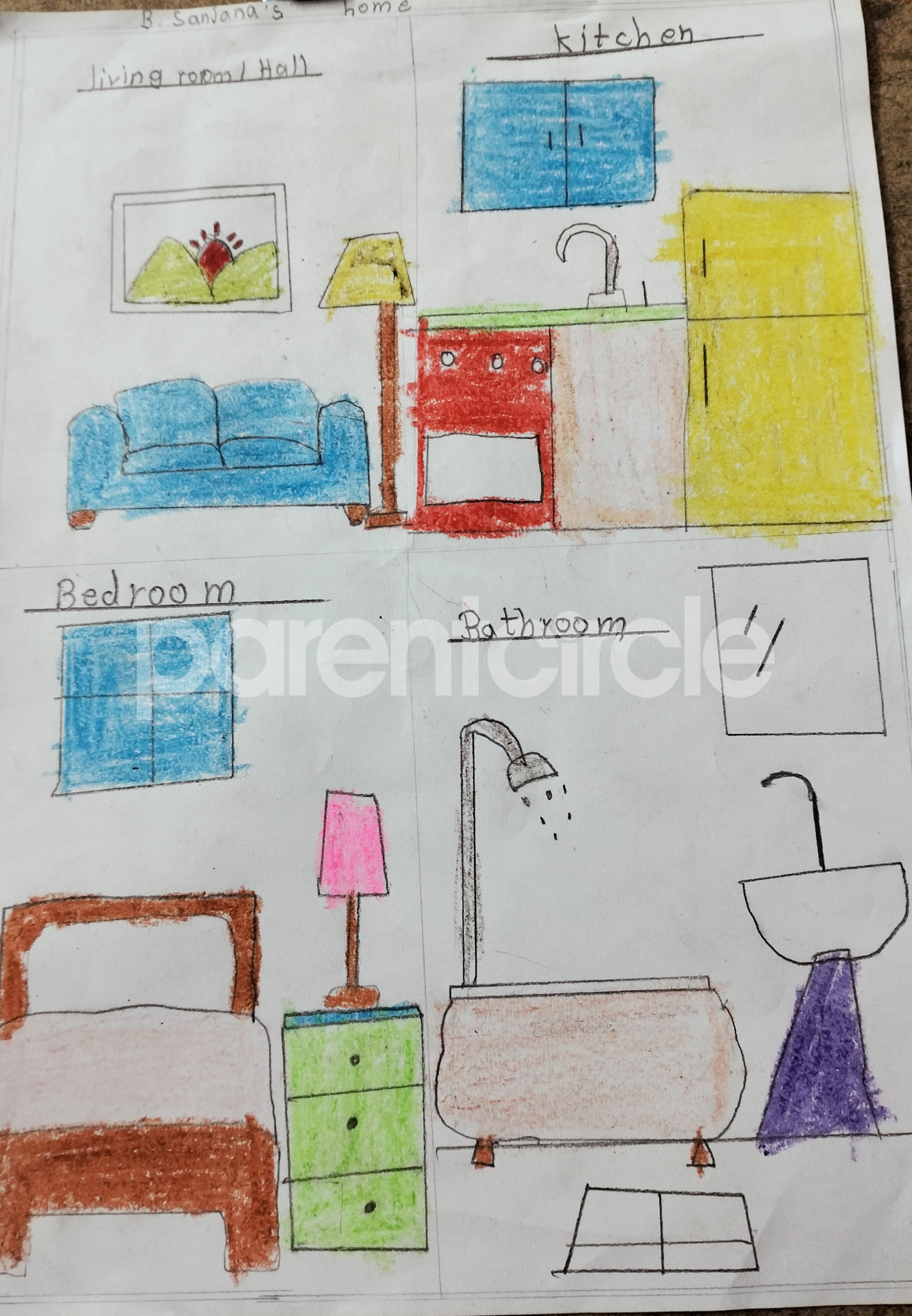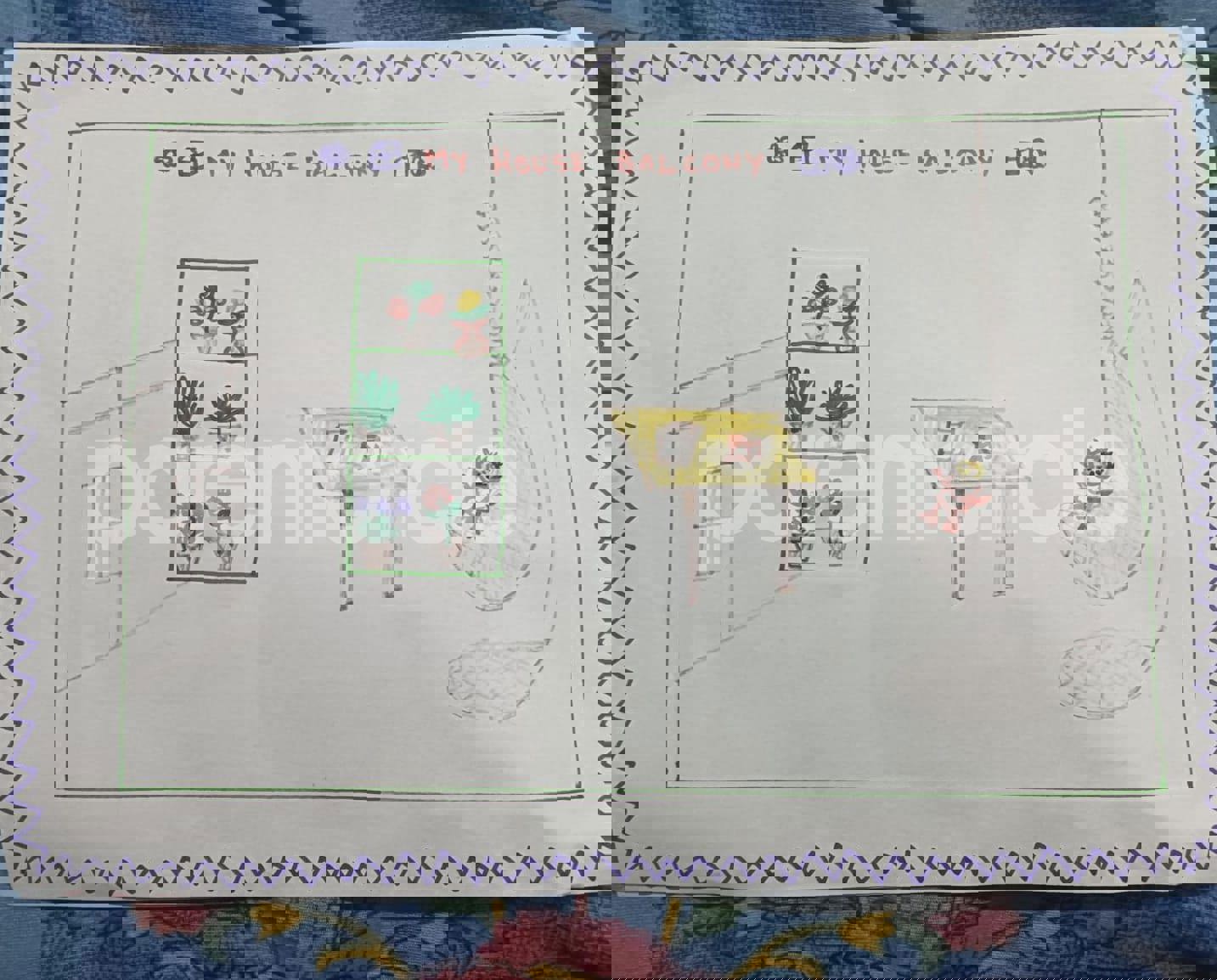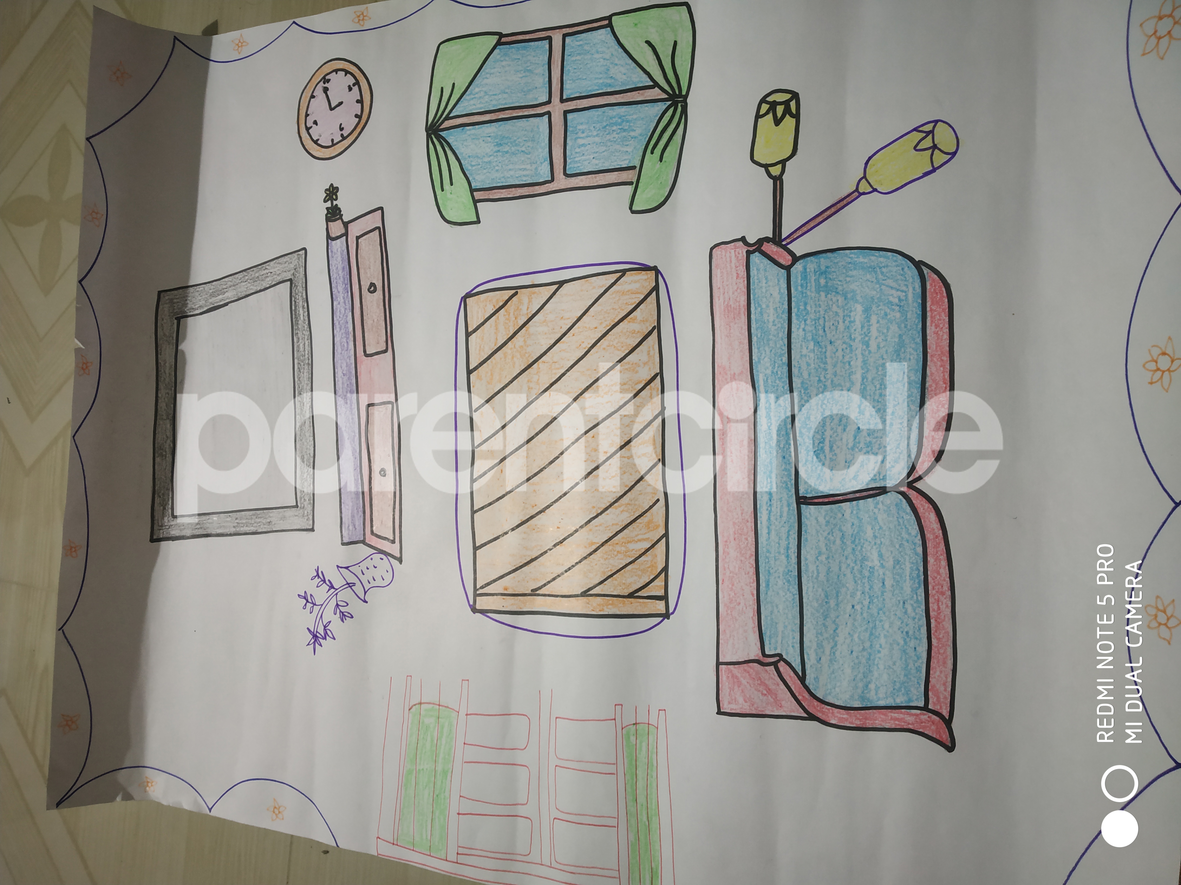 Diya has more than one favourite corner at home. The above drawing shows Study table along with her ART and CRAFT hanging, watching TV by sating on the Couch and finally her small garden in the balcony