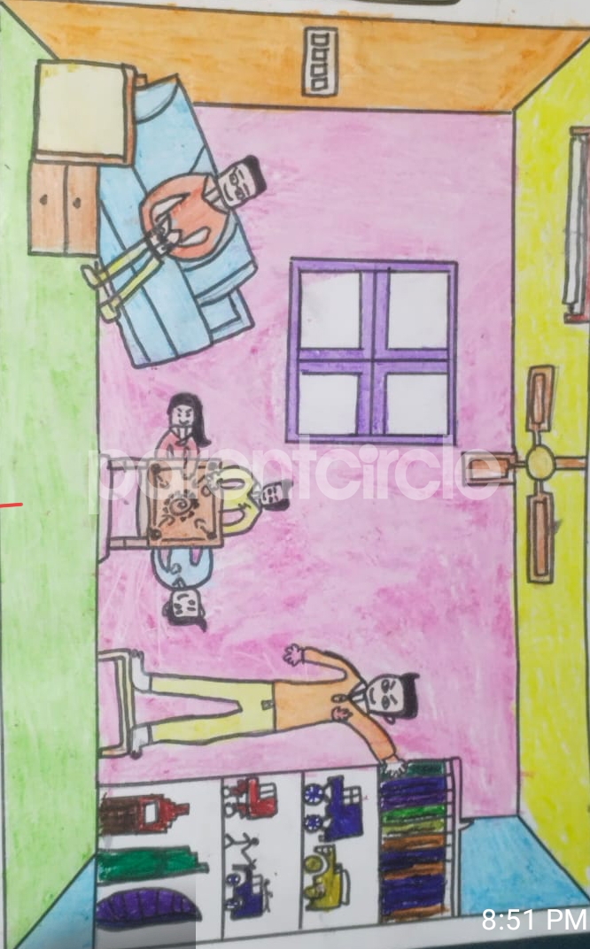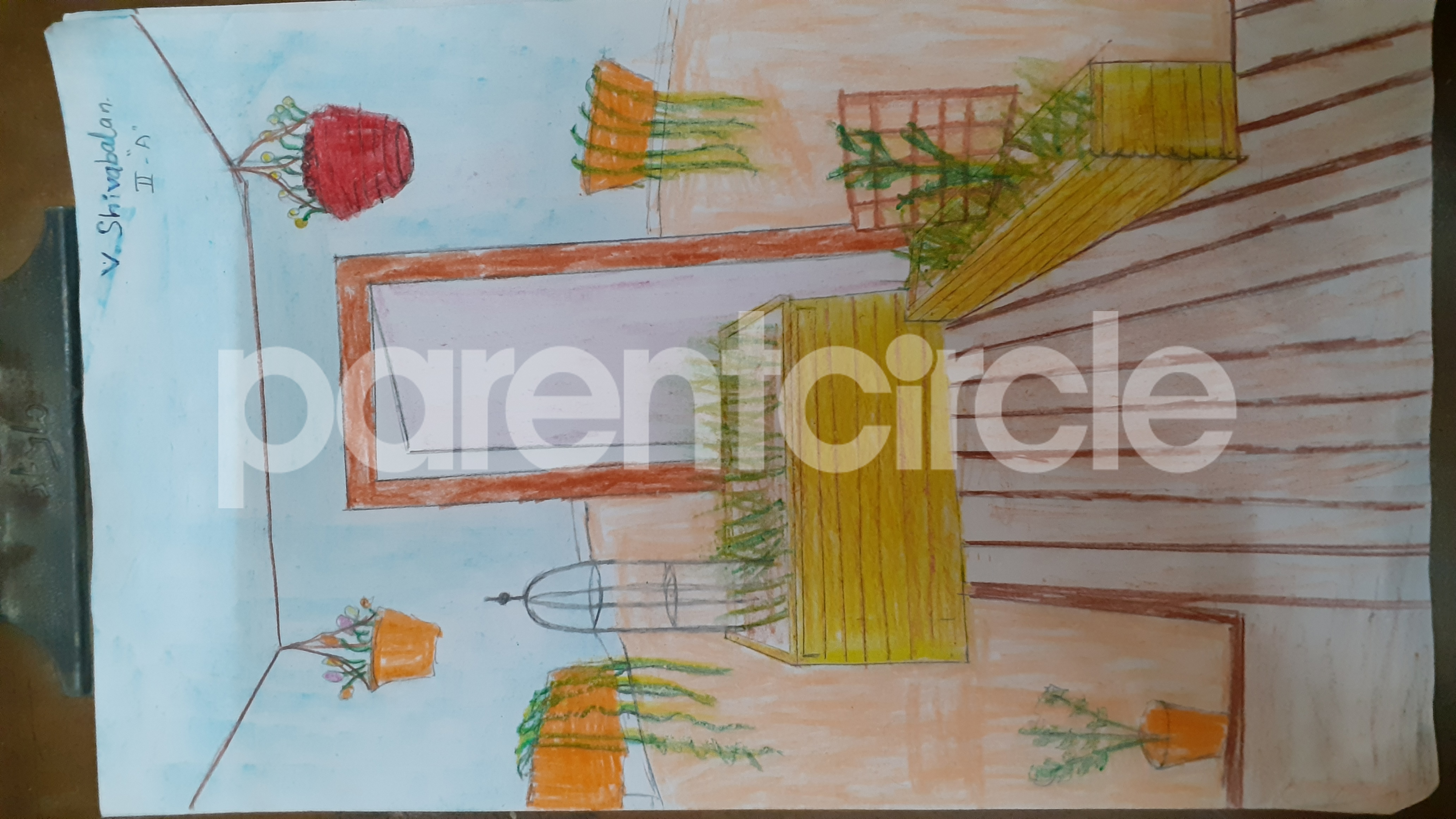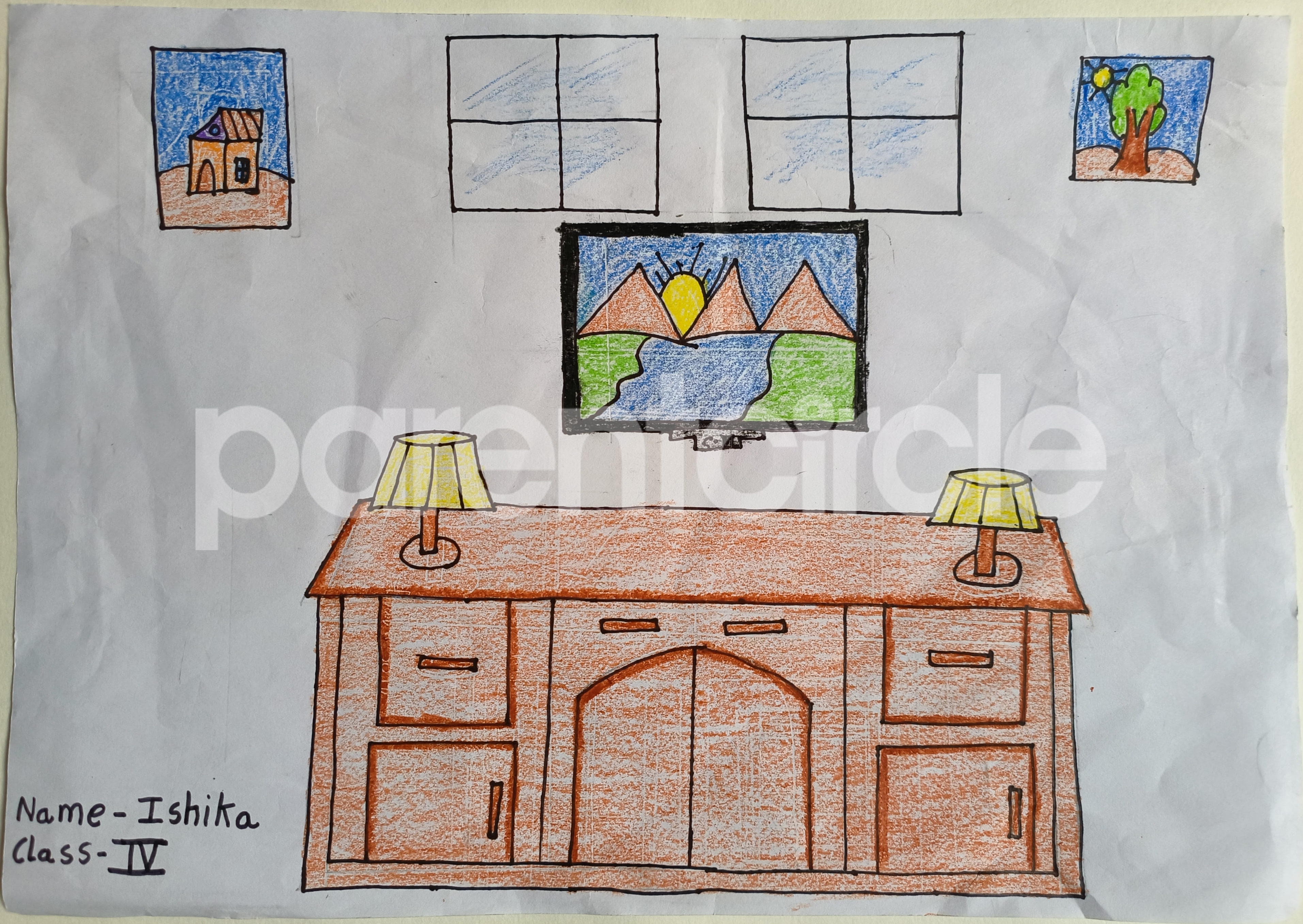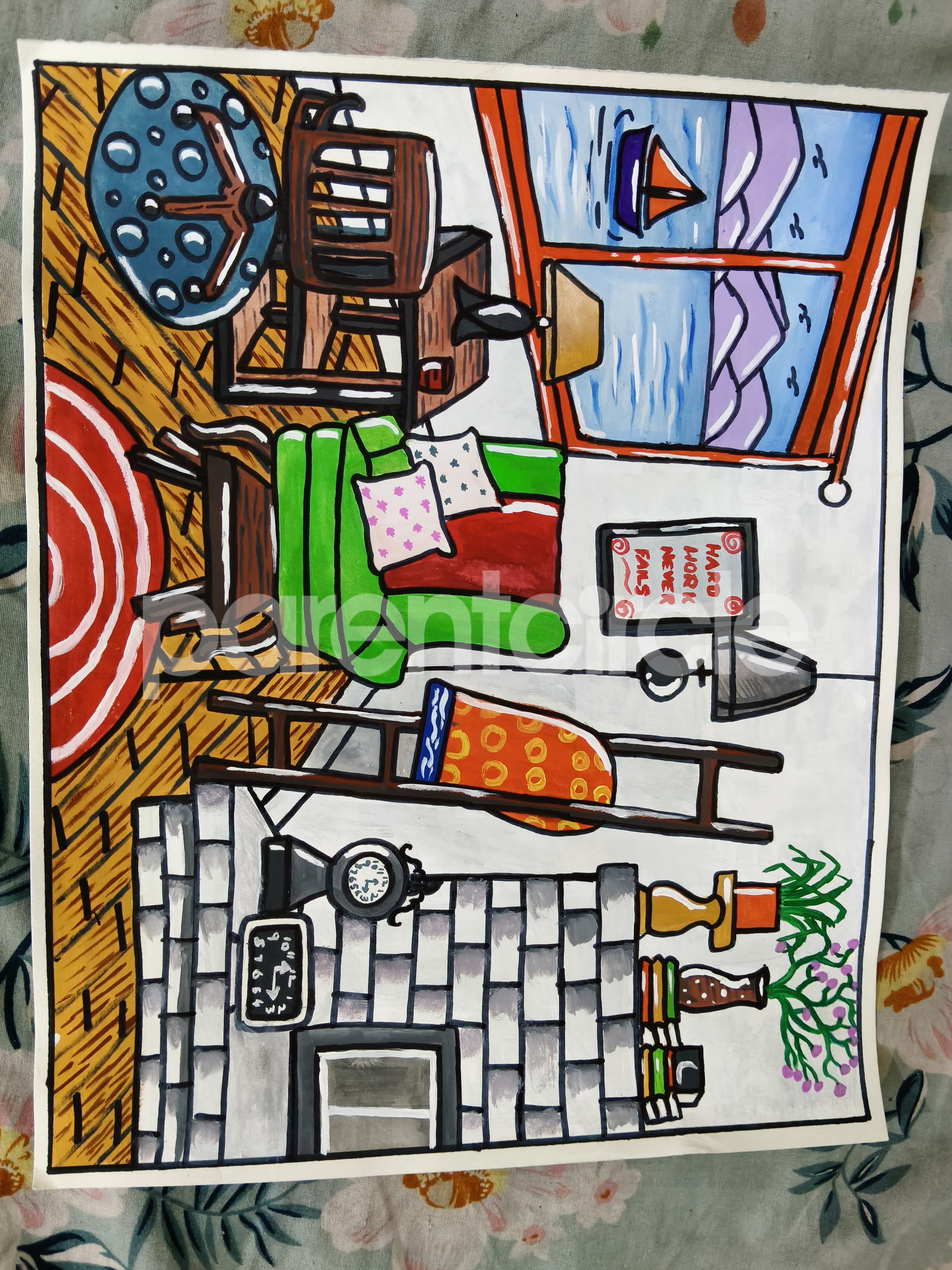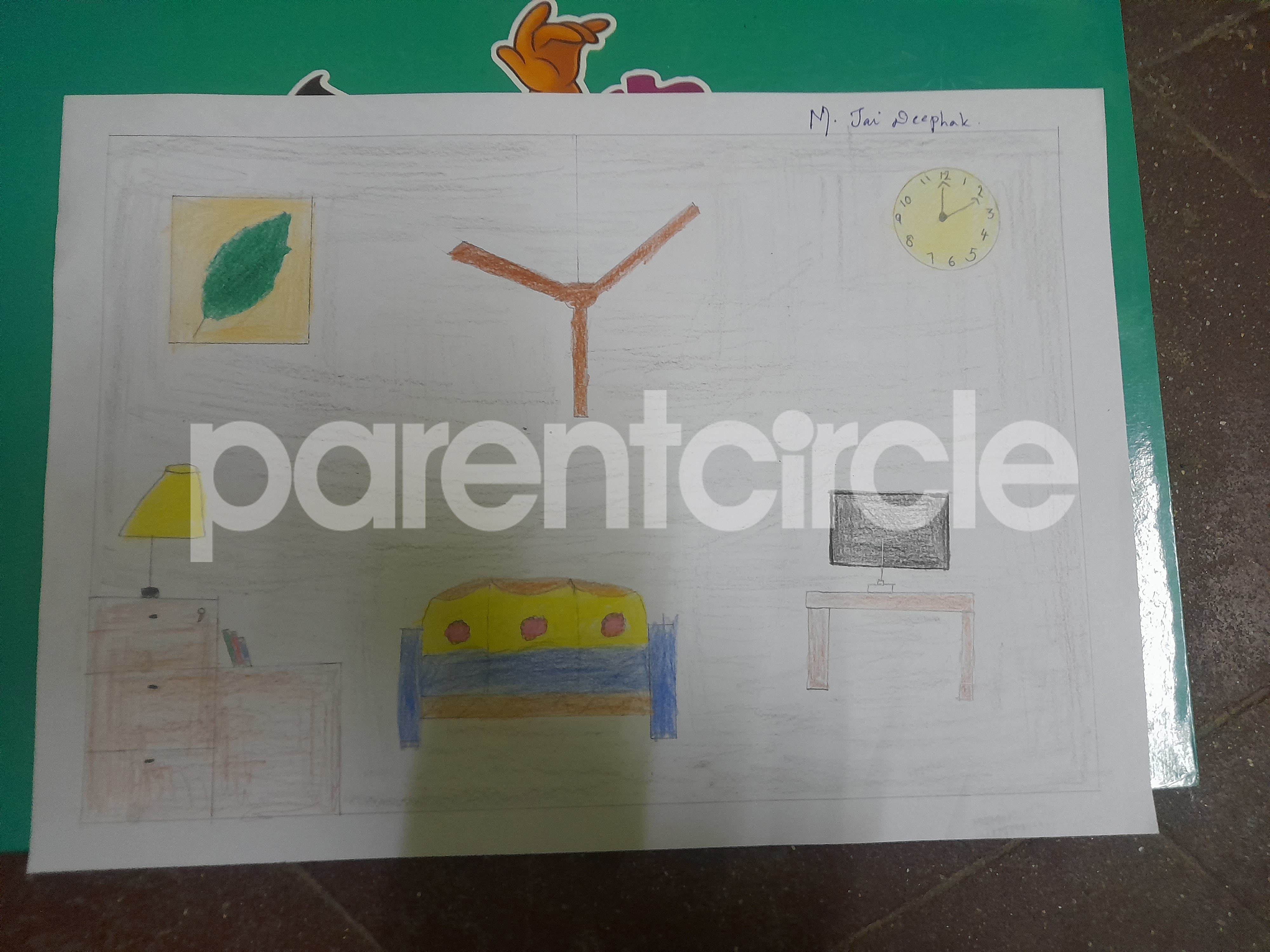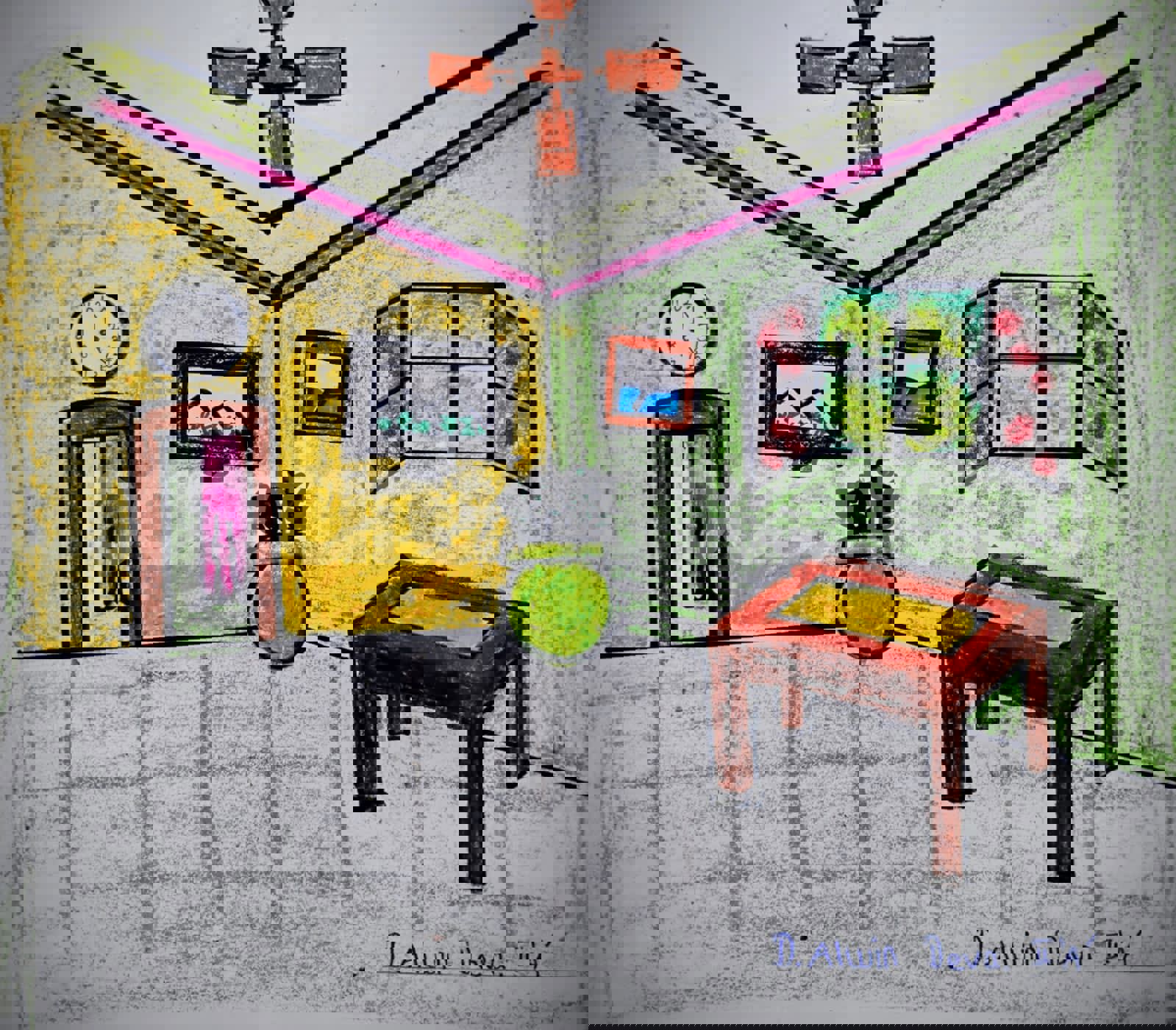 Diya has more than one favourite corner at home. The above drawing shows Study table along with her ART and CRAFT hanging, watching TV by sating on the Couch and finally her small garden in the balcony