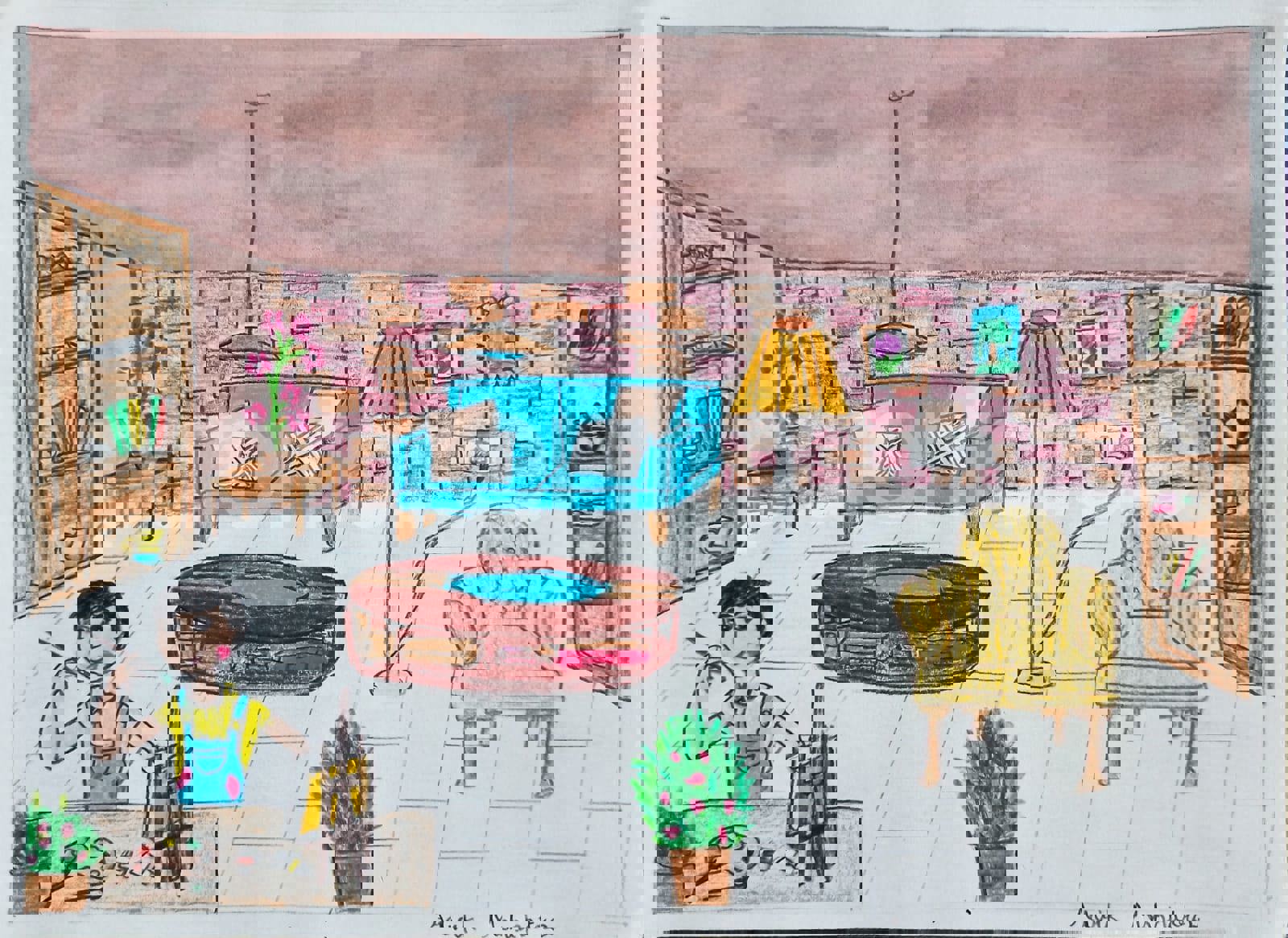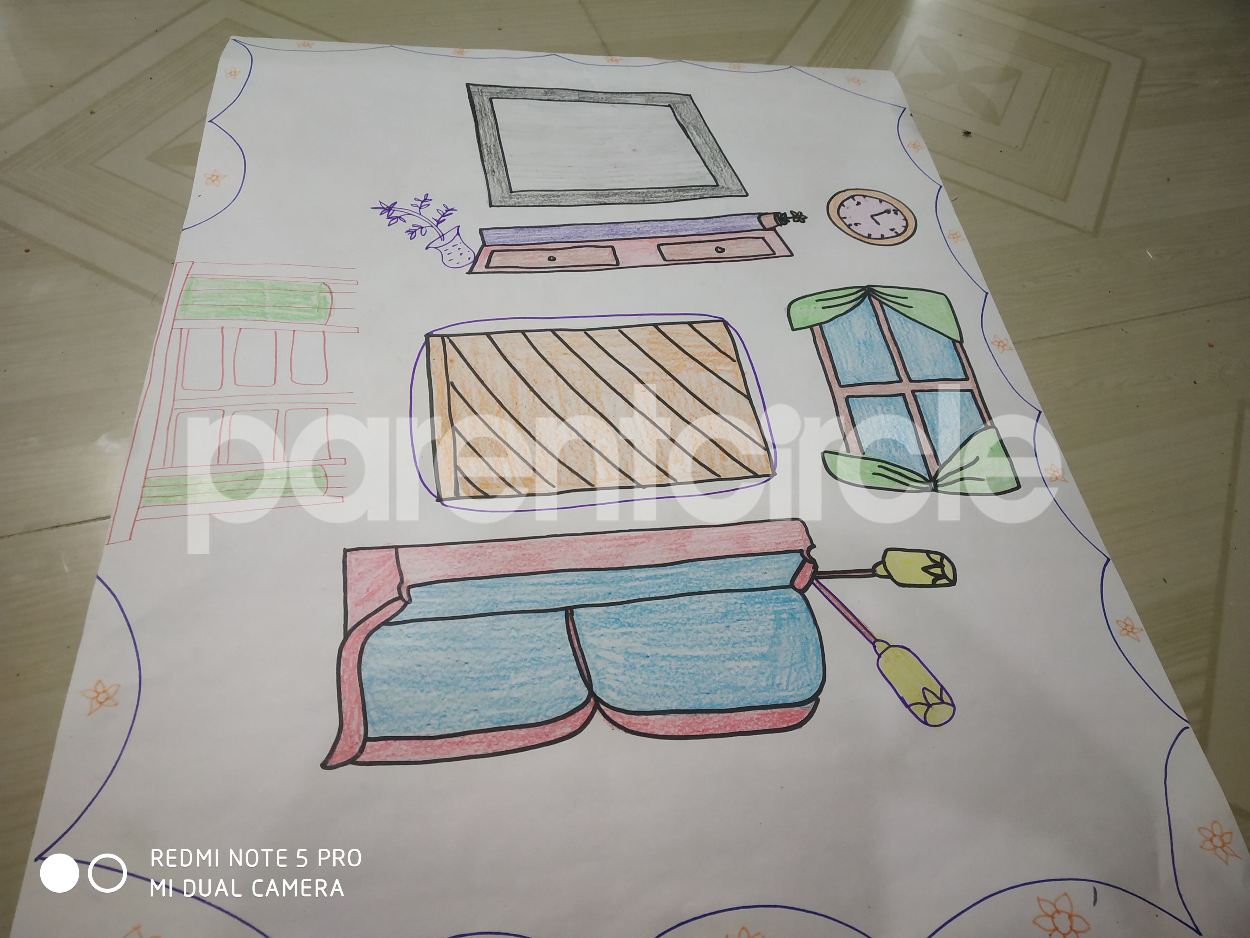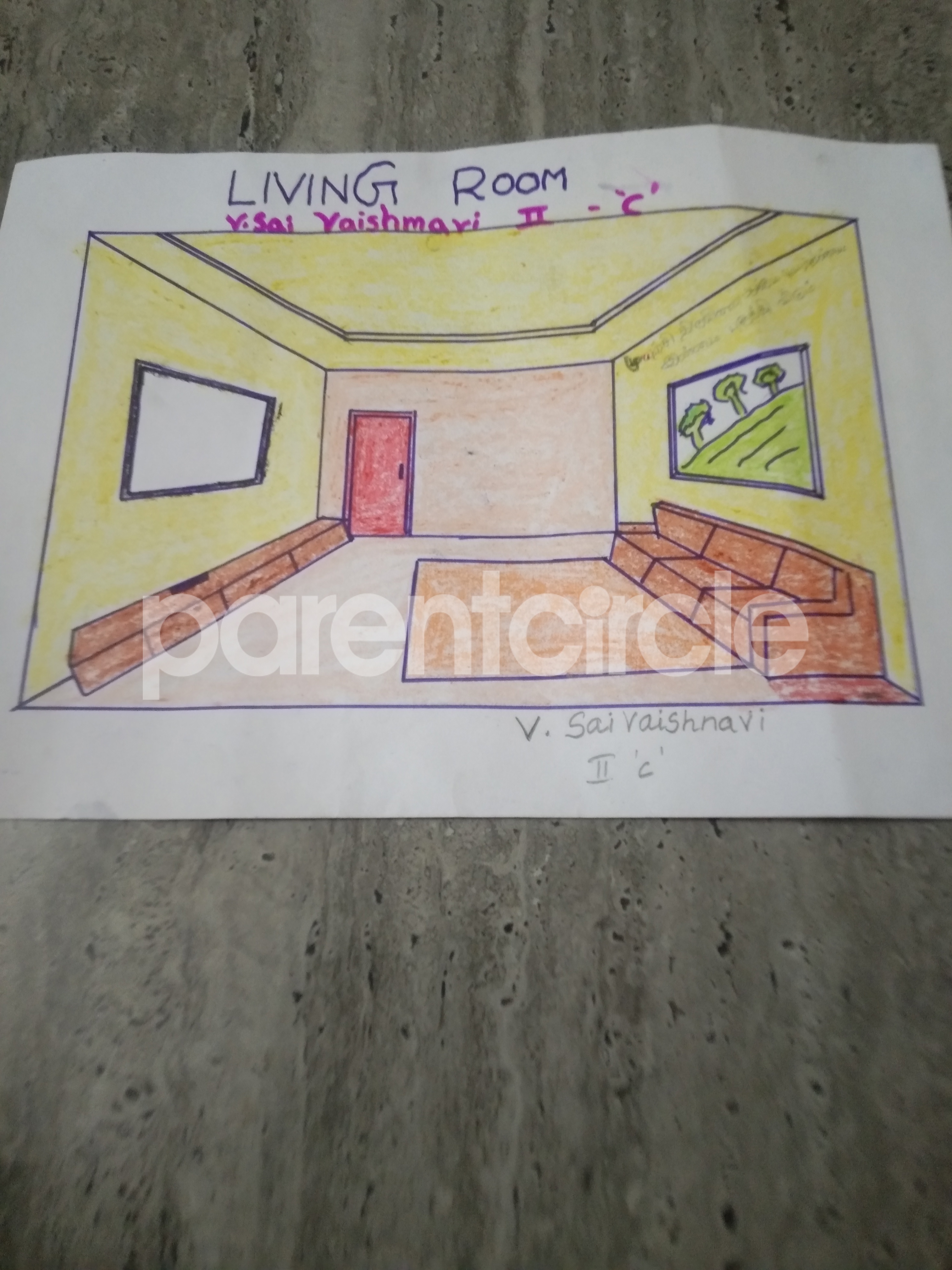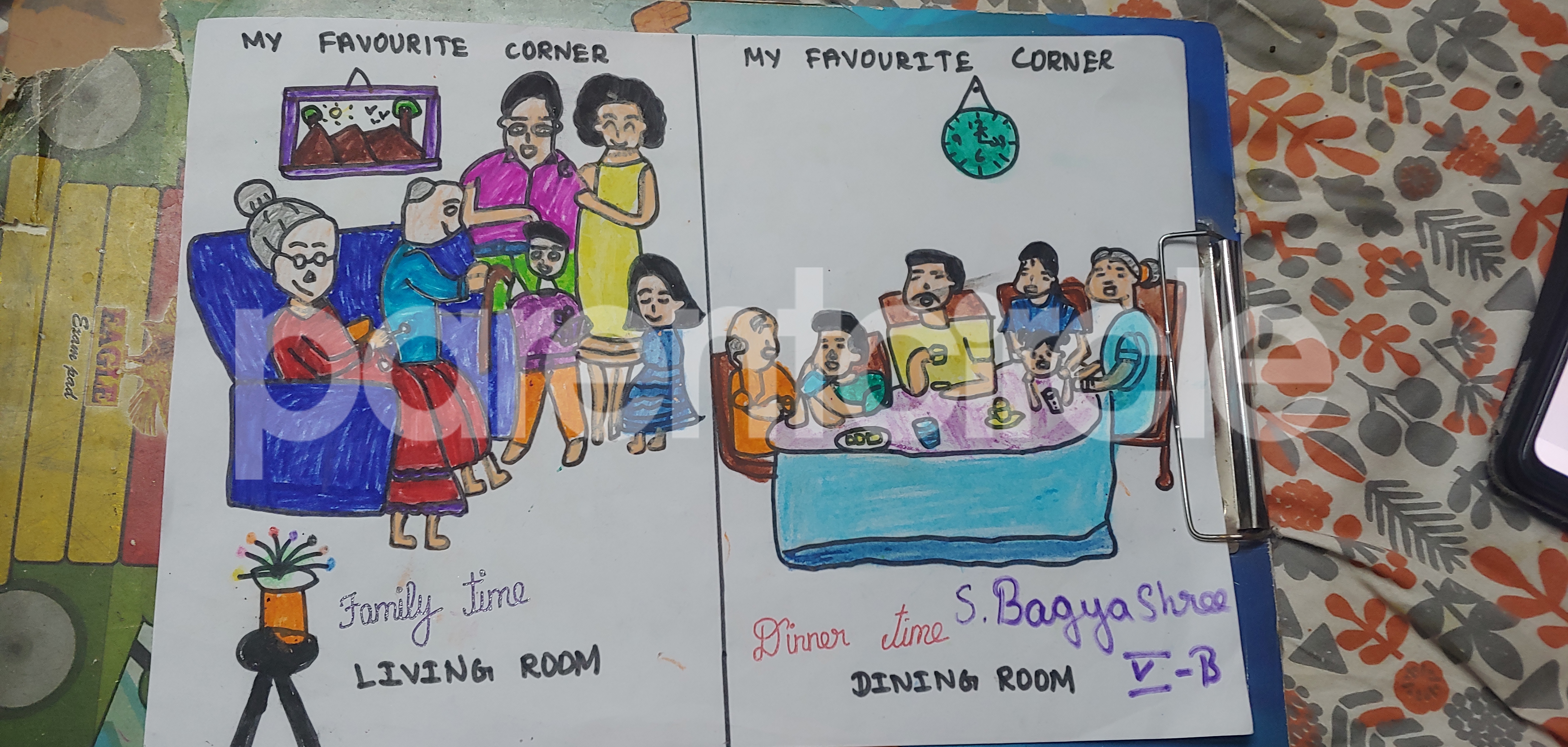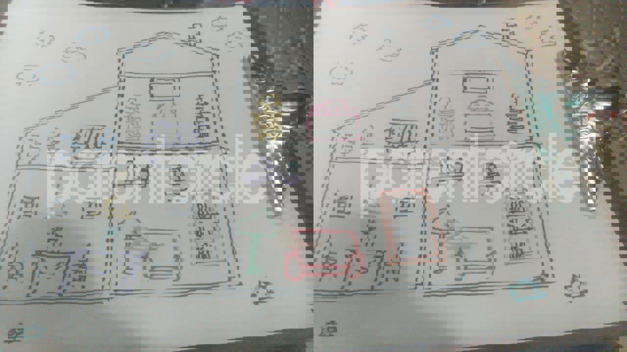 Diya has more than one favourite corner at home. The above drawing shows Study table along with her ART and CRAFT hanging, watching TV by sating on the Couch and finally her small garden in the balcony