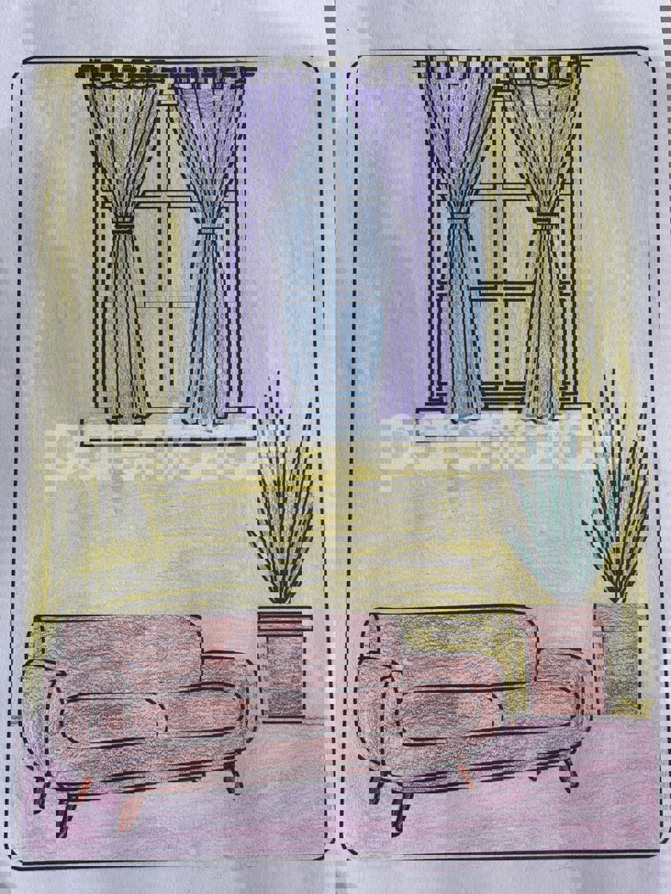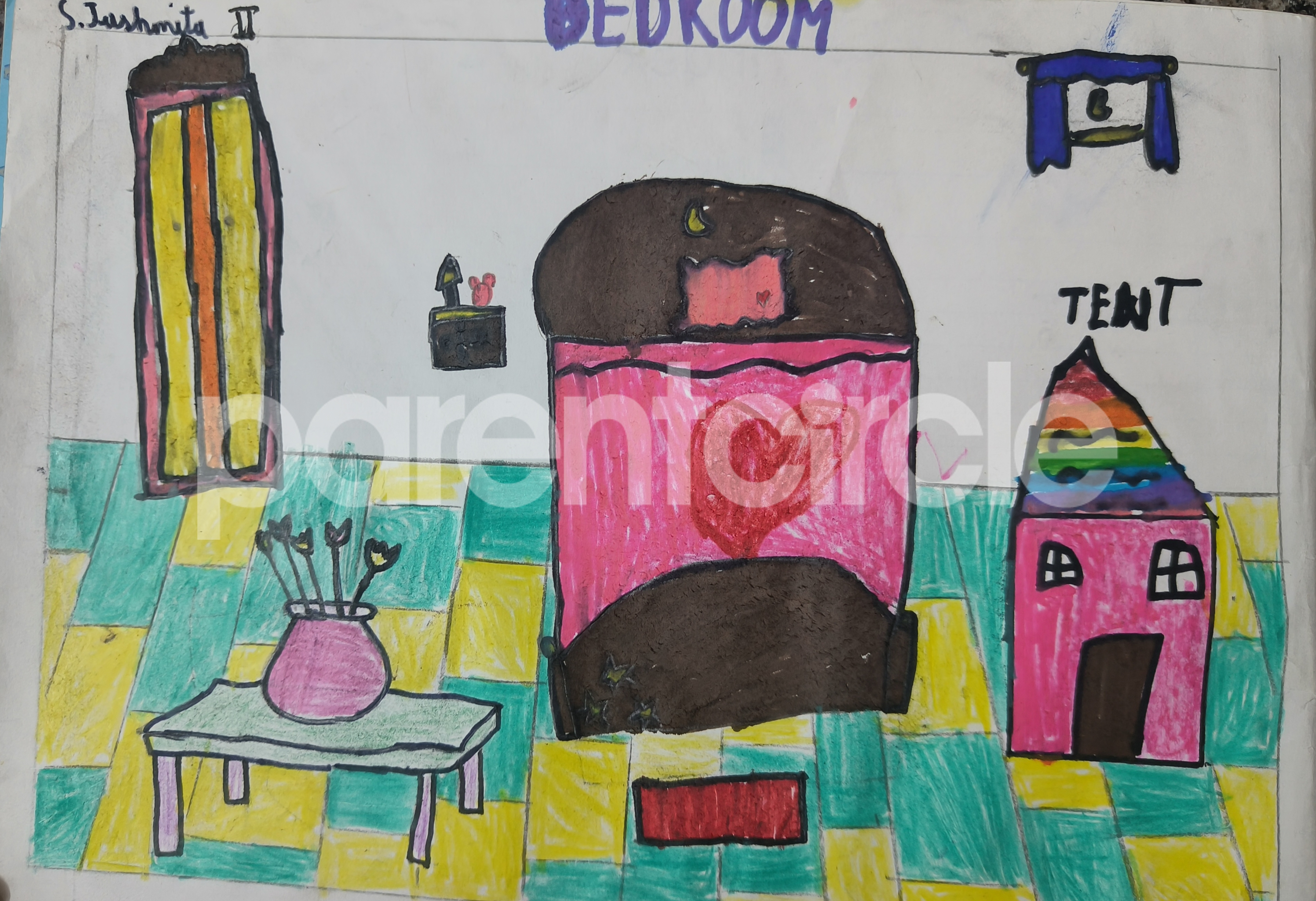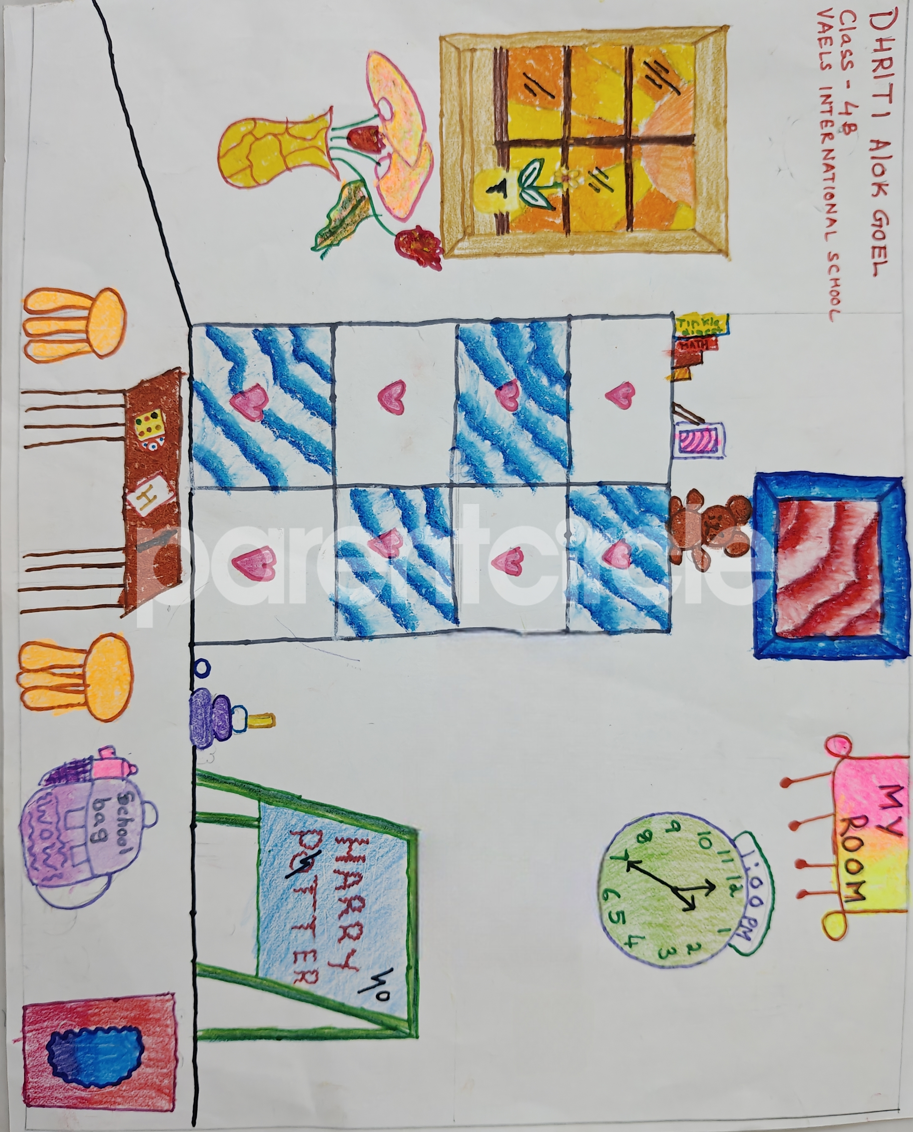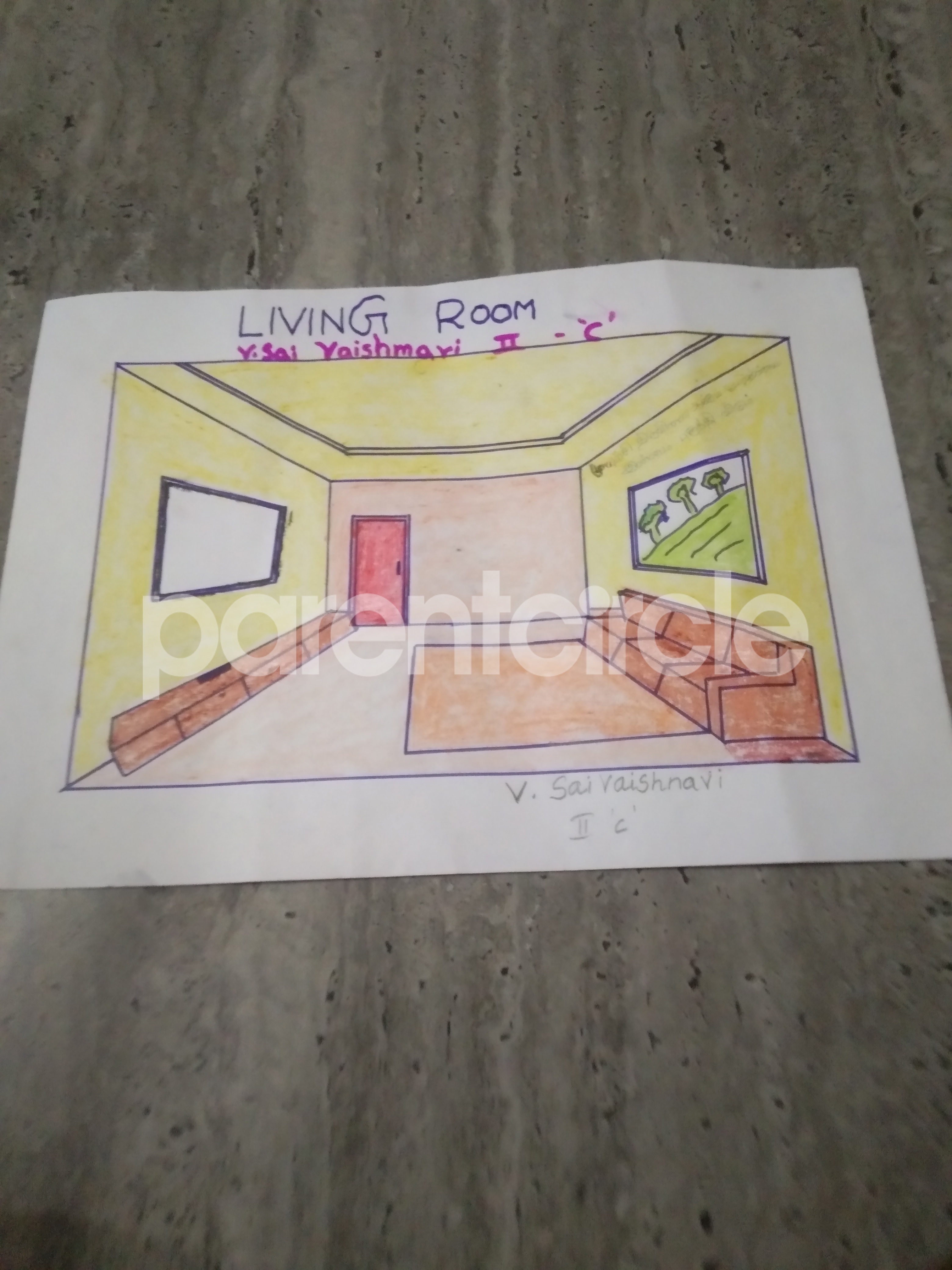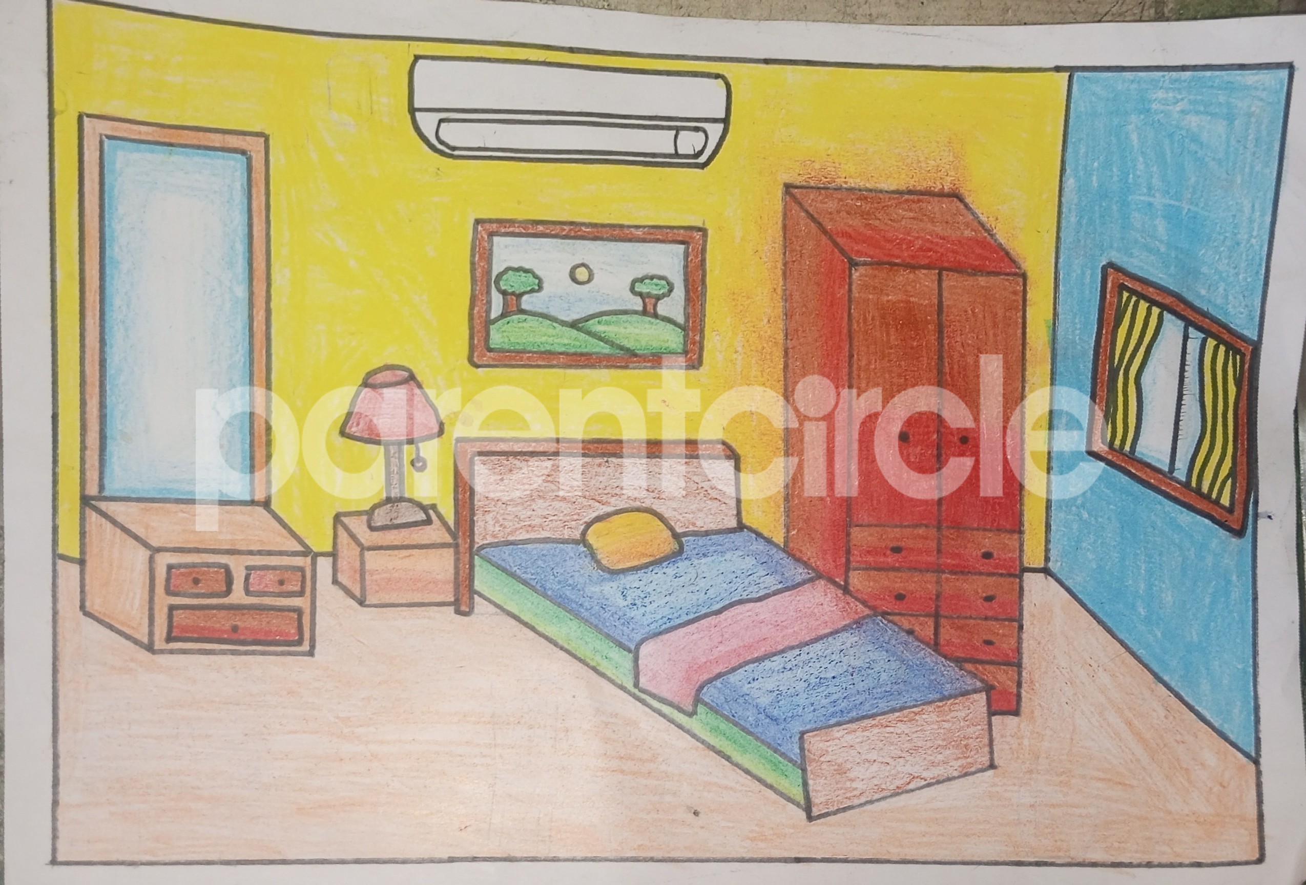 Diya has more than one favourite corner at home. The above drawing shows Study table along with her ART and CRAFT hanging, watching TV by sating on the Couch and finally her small garden in the balcony