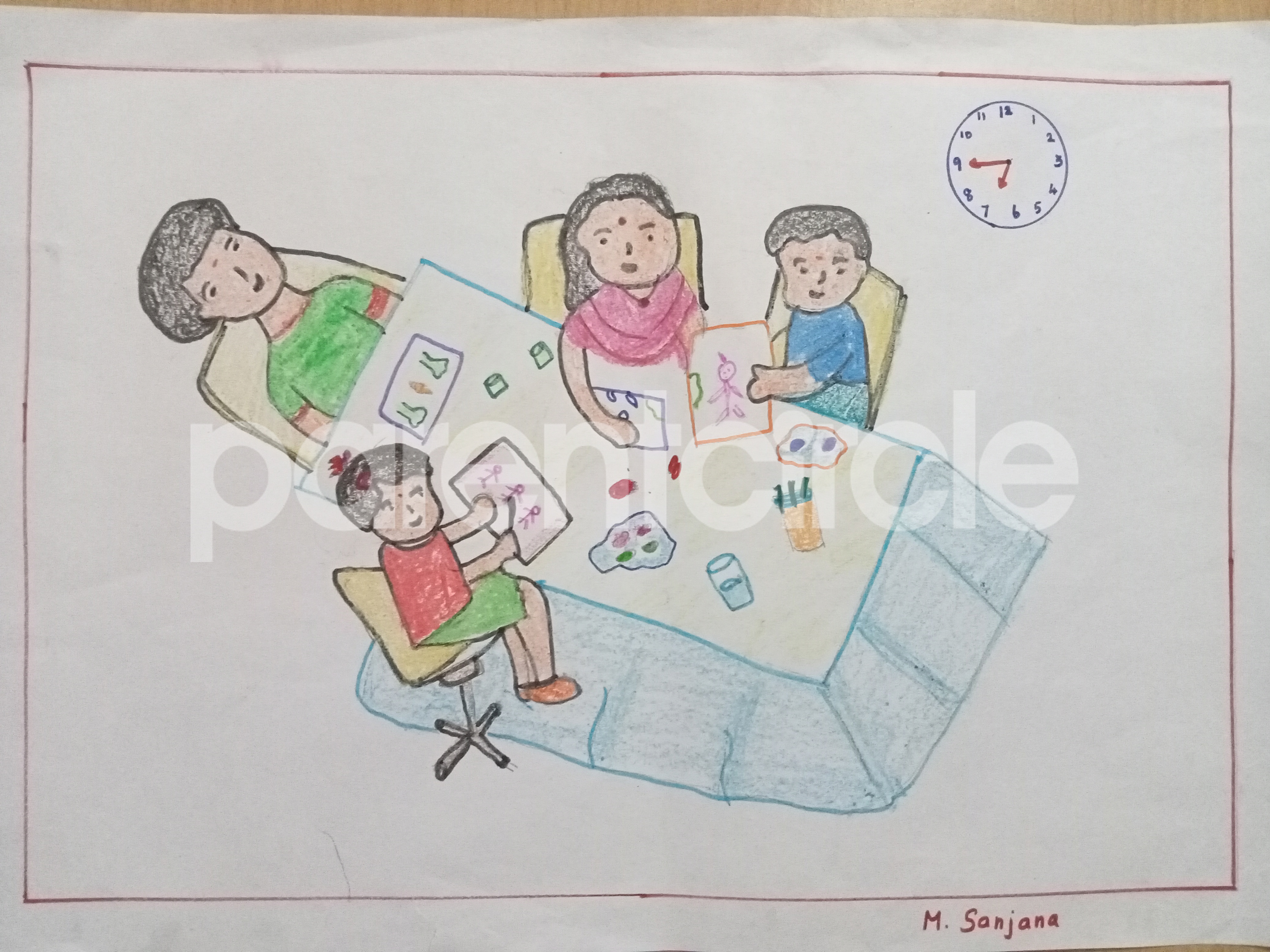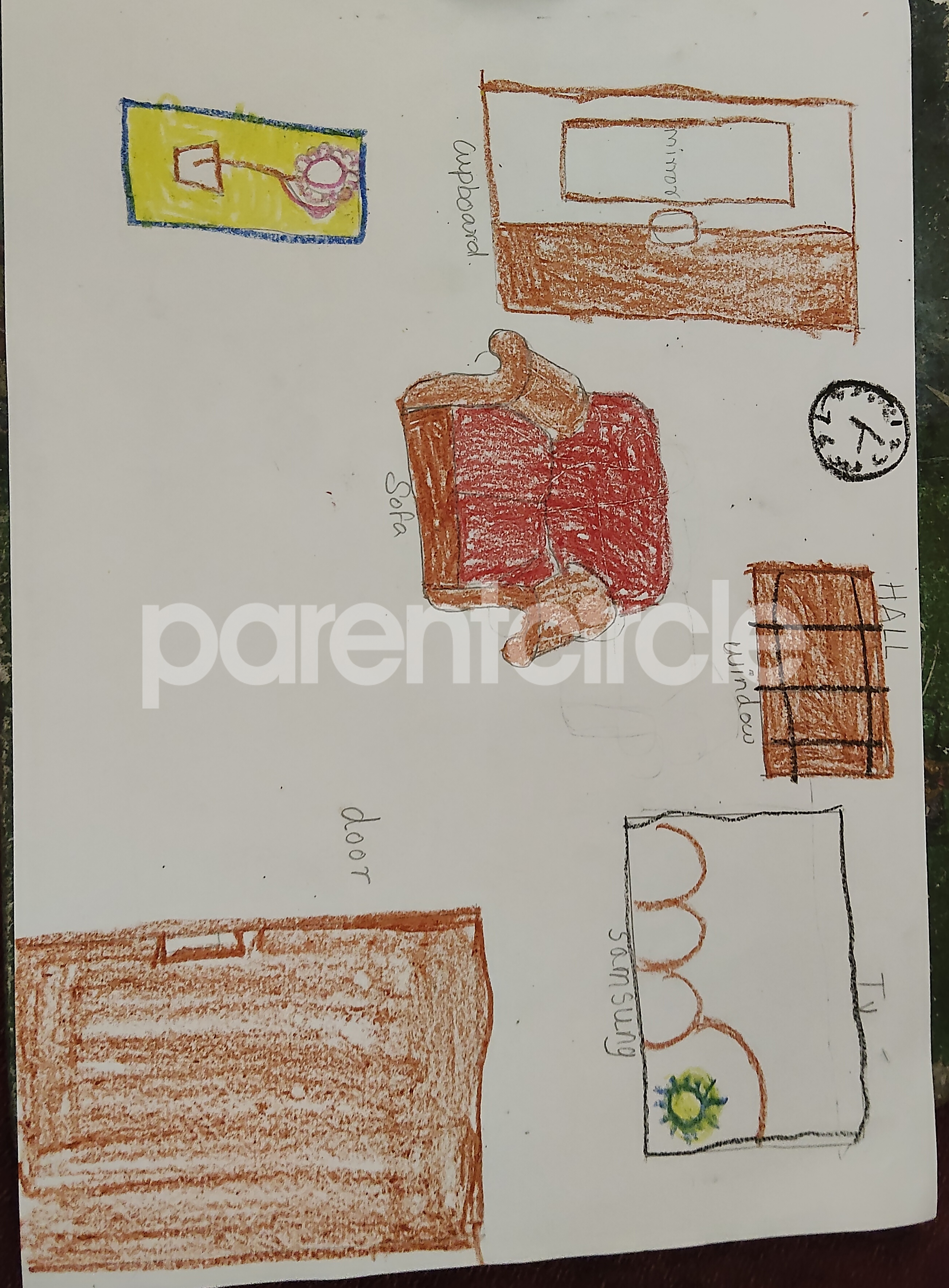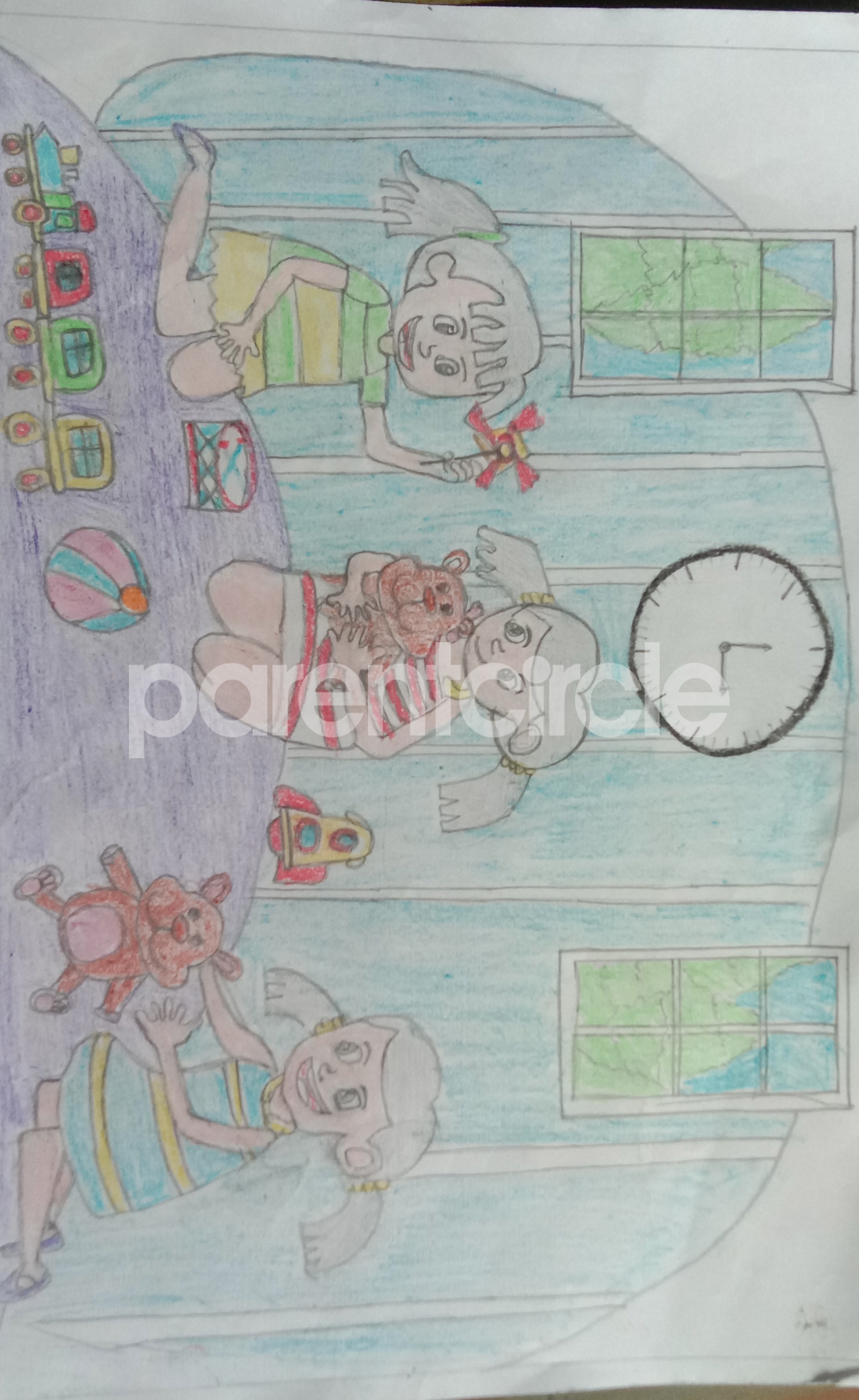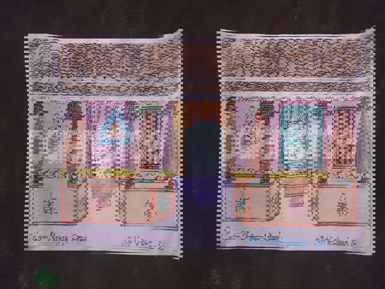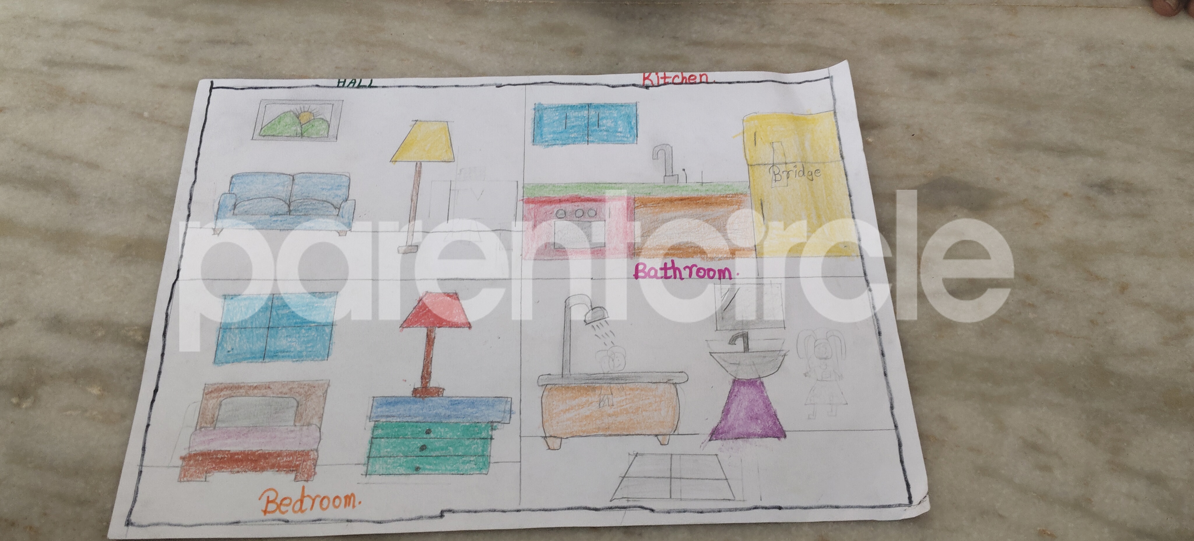 Diya has more than one favourite corner at home. The above drawing shows Study table along with her ART and CRAFT hanging, watching TV by sating on the Couch and finally her small garden in the balcony
