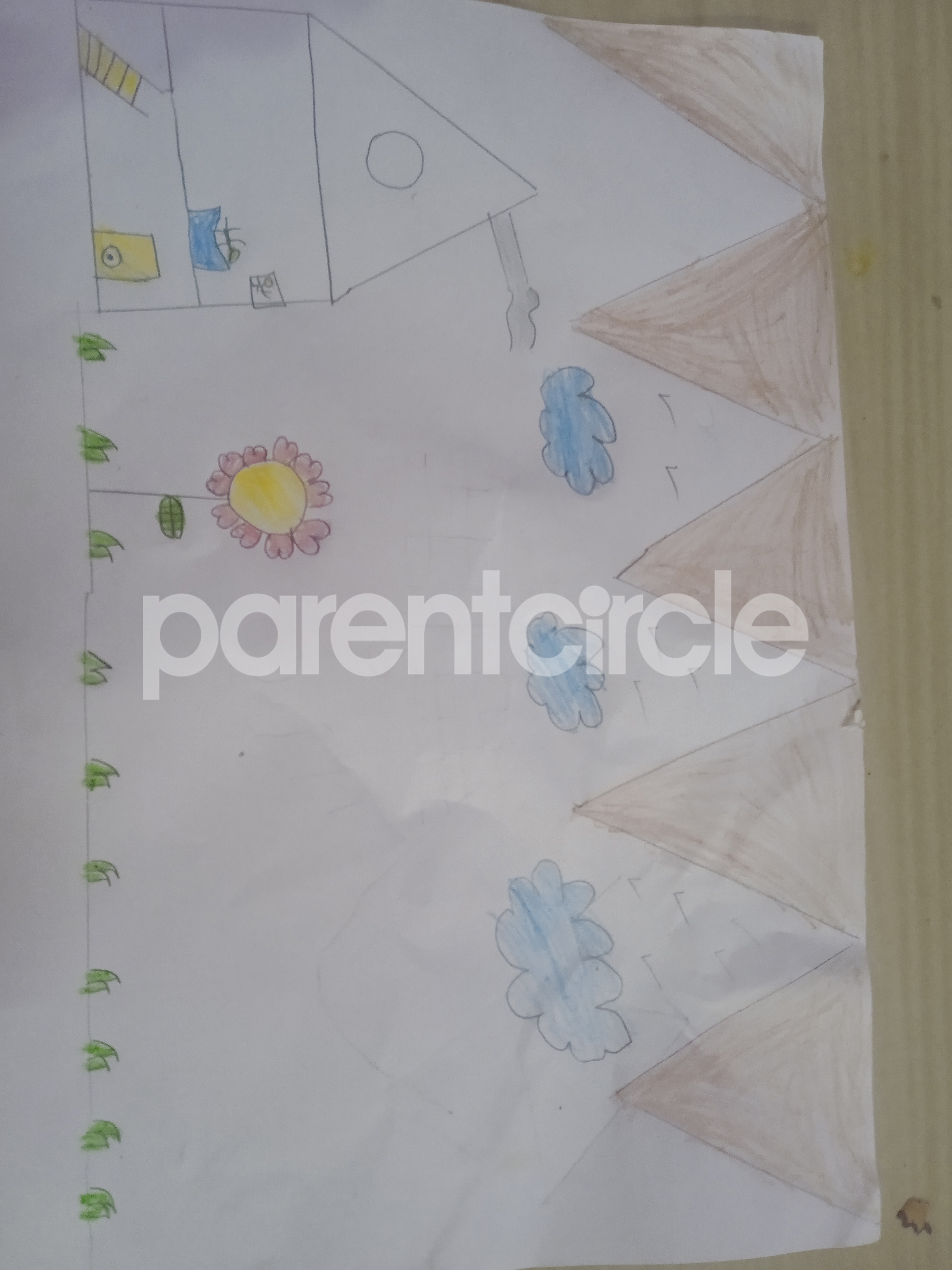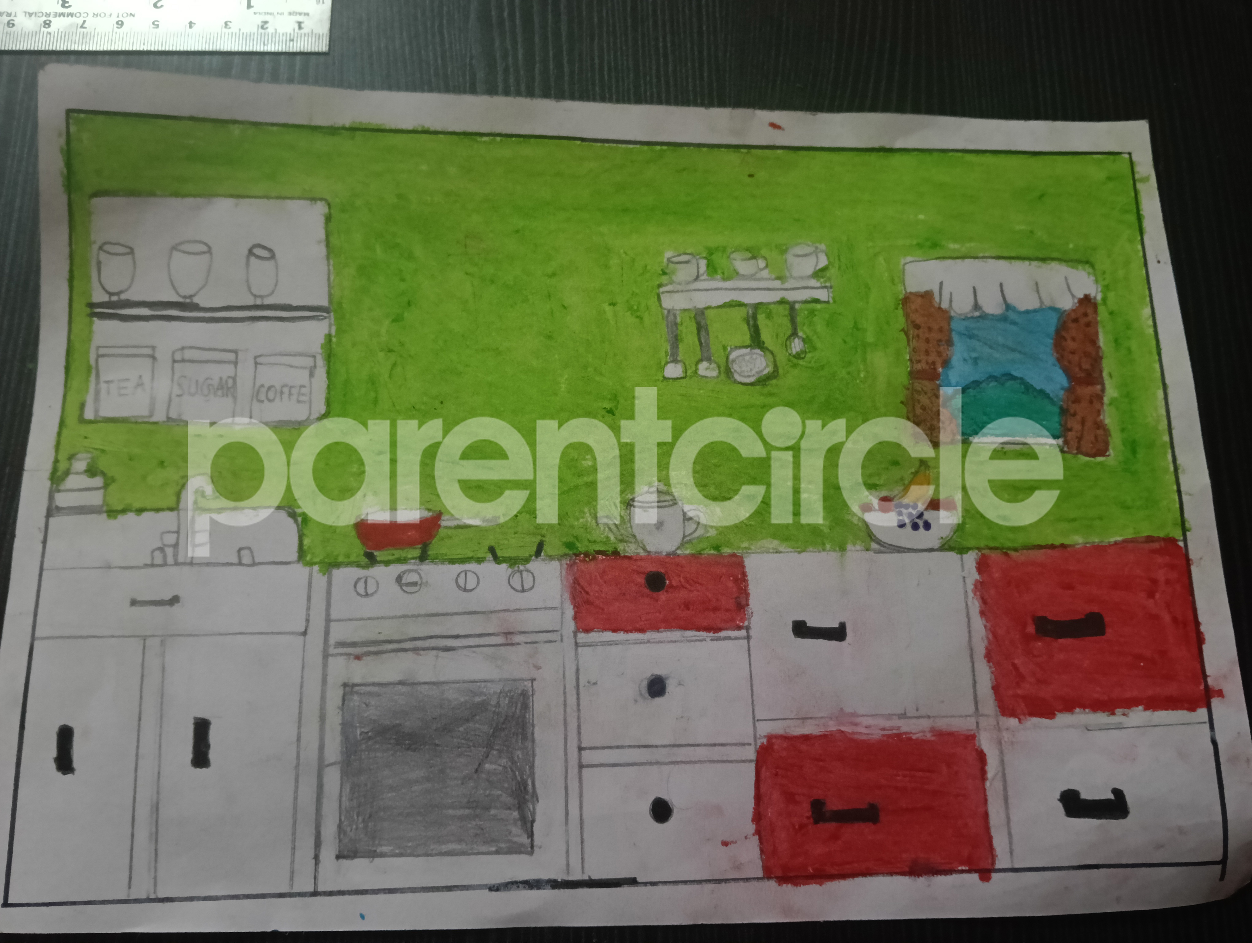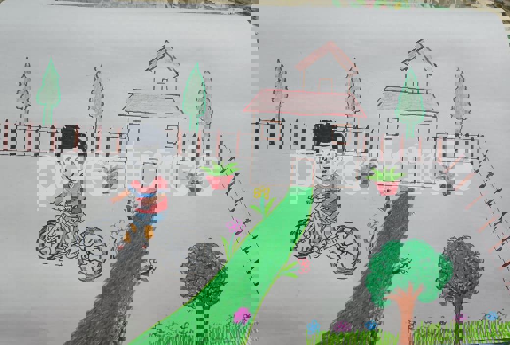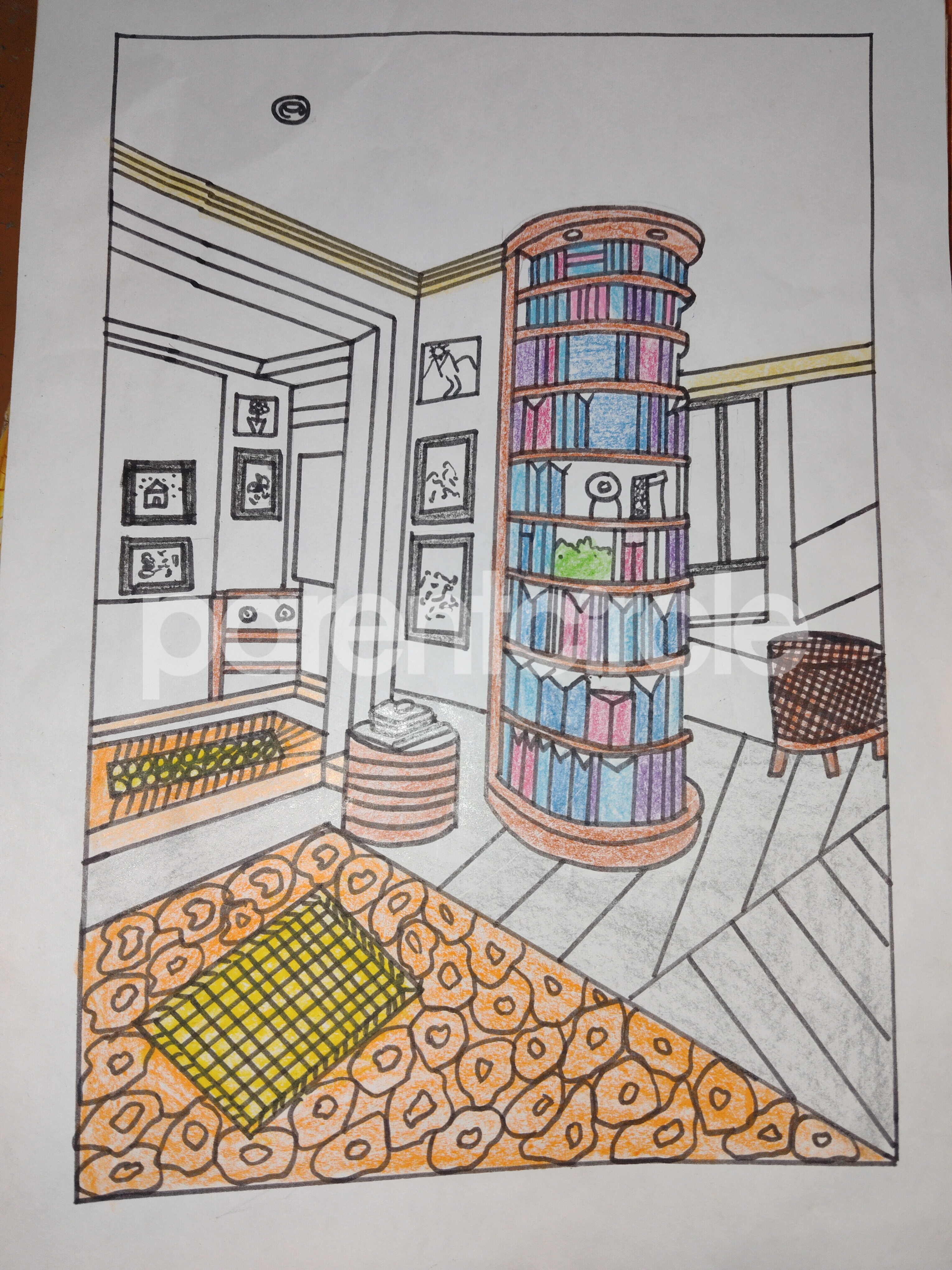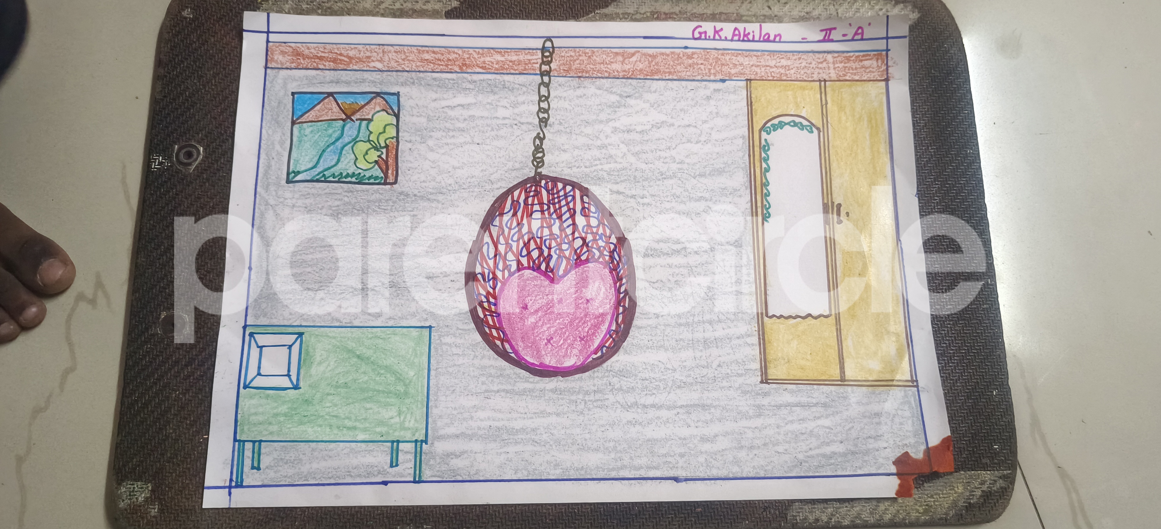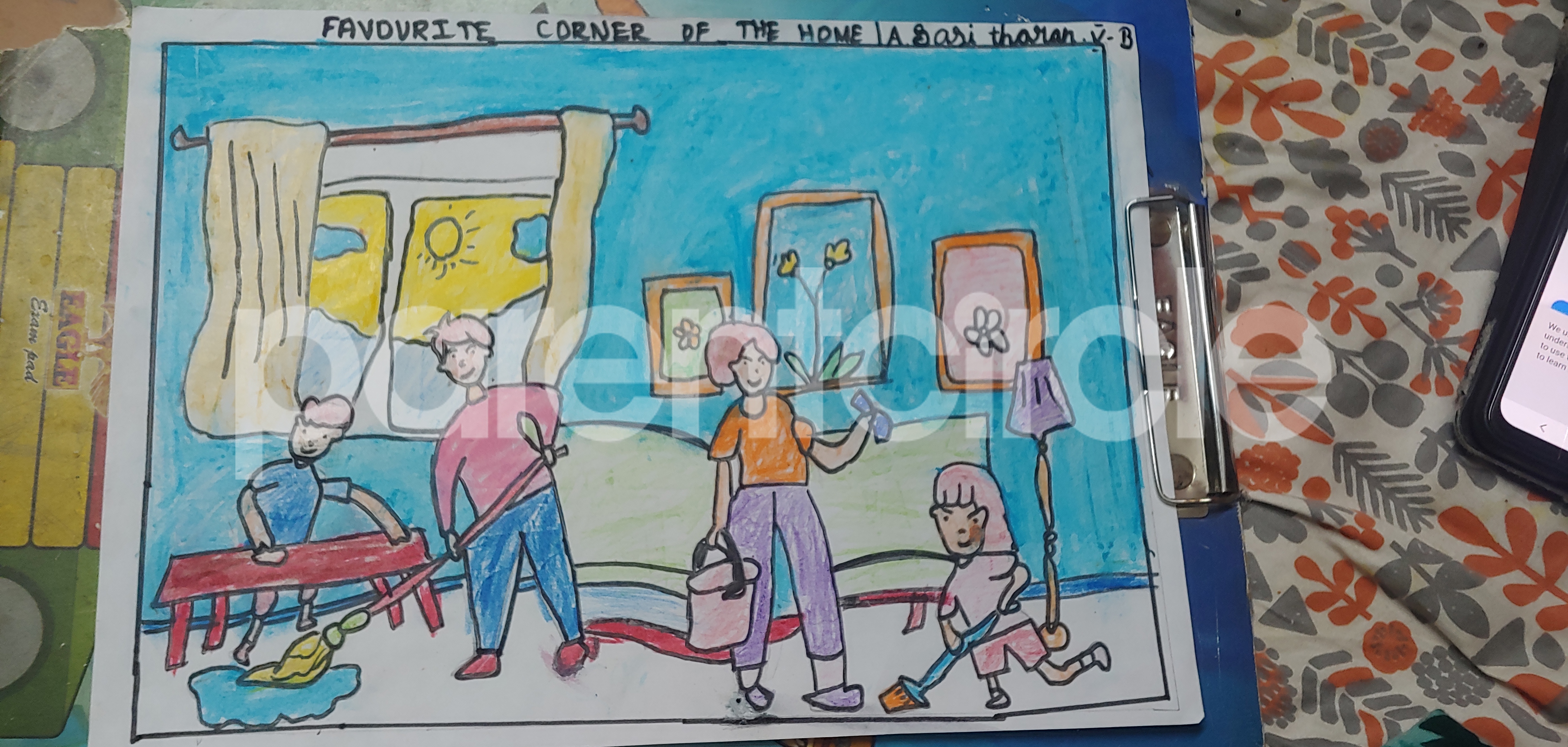 Diya has more than one favourite corner at home. The above drawing shows Study table along with her ART and CRAFT hanging, watching TV by sating on the Couch and finally her small garden in the balcony
