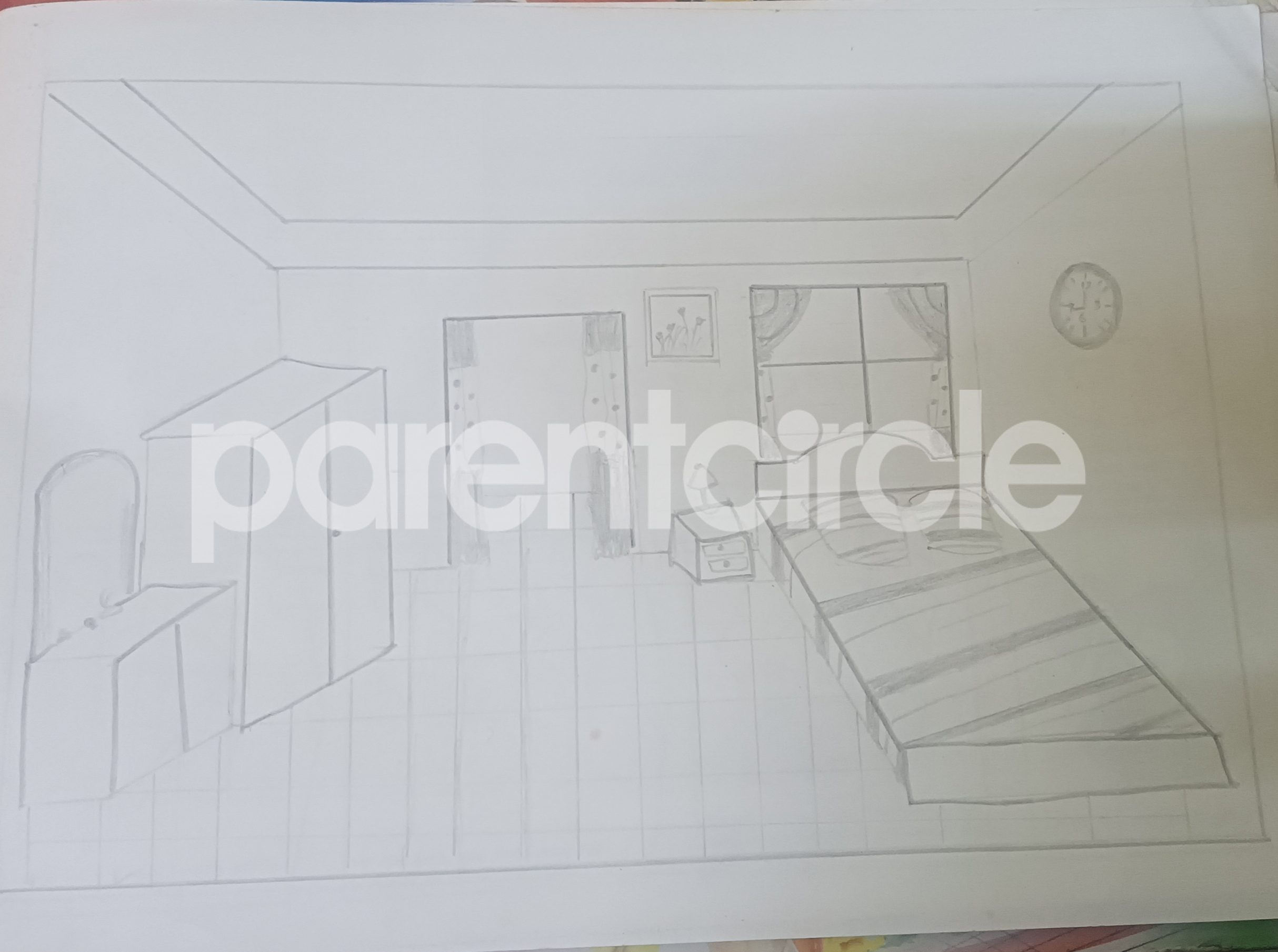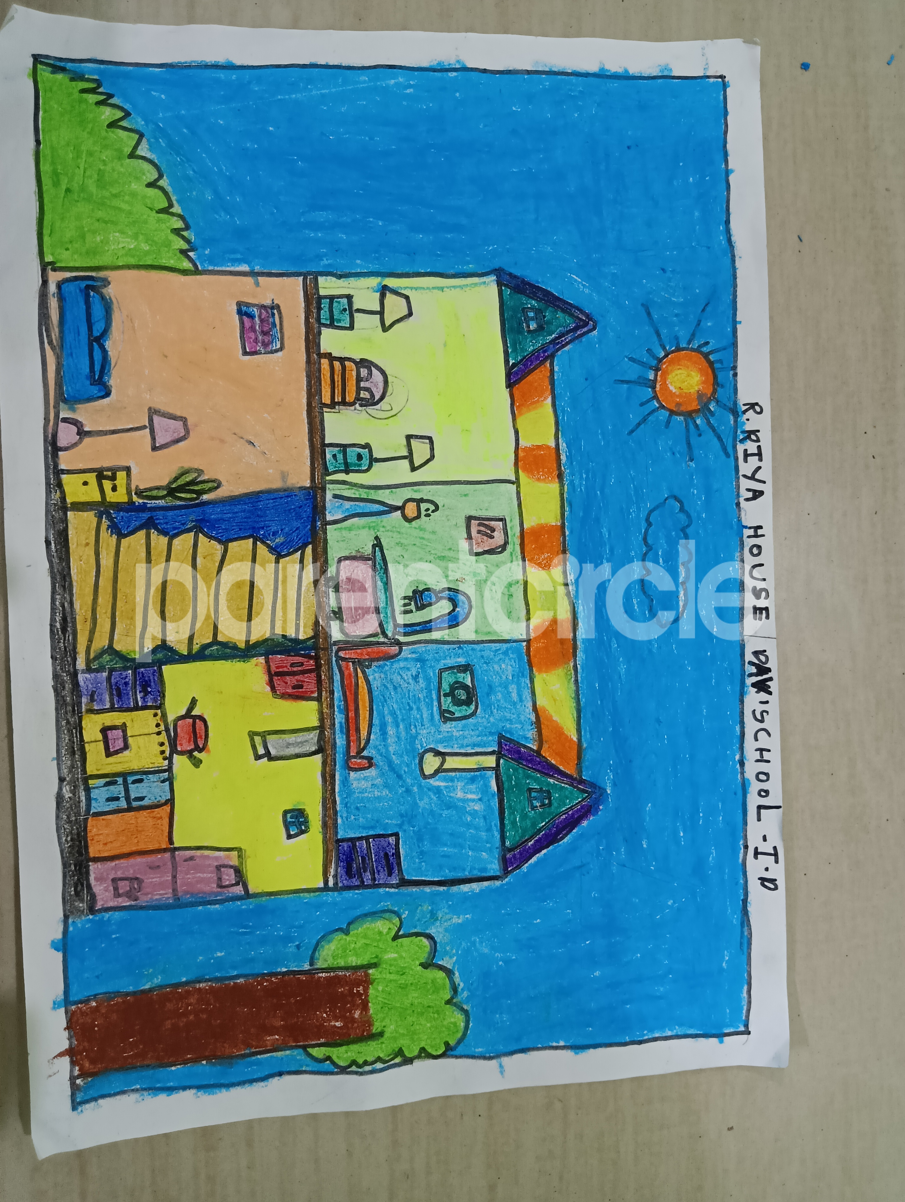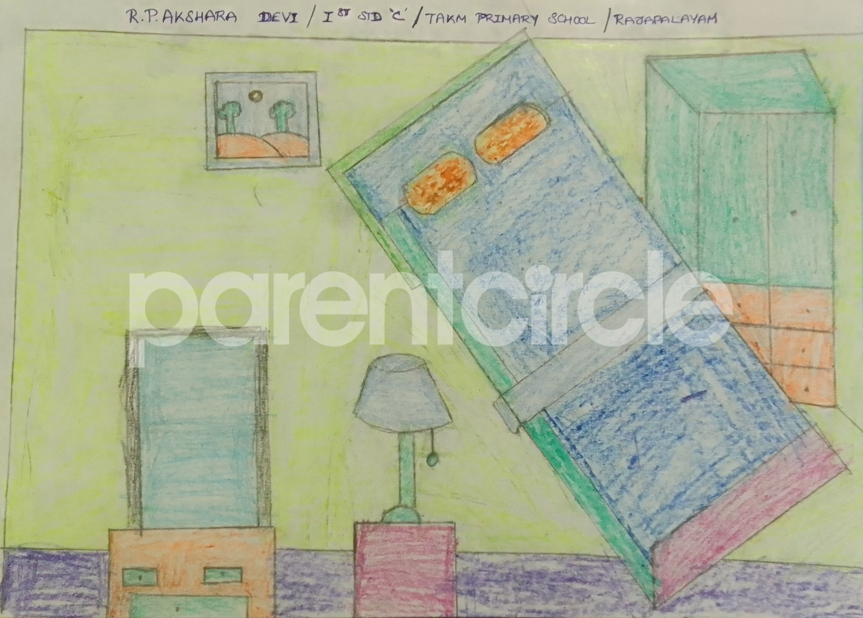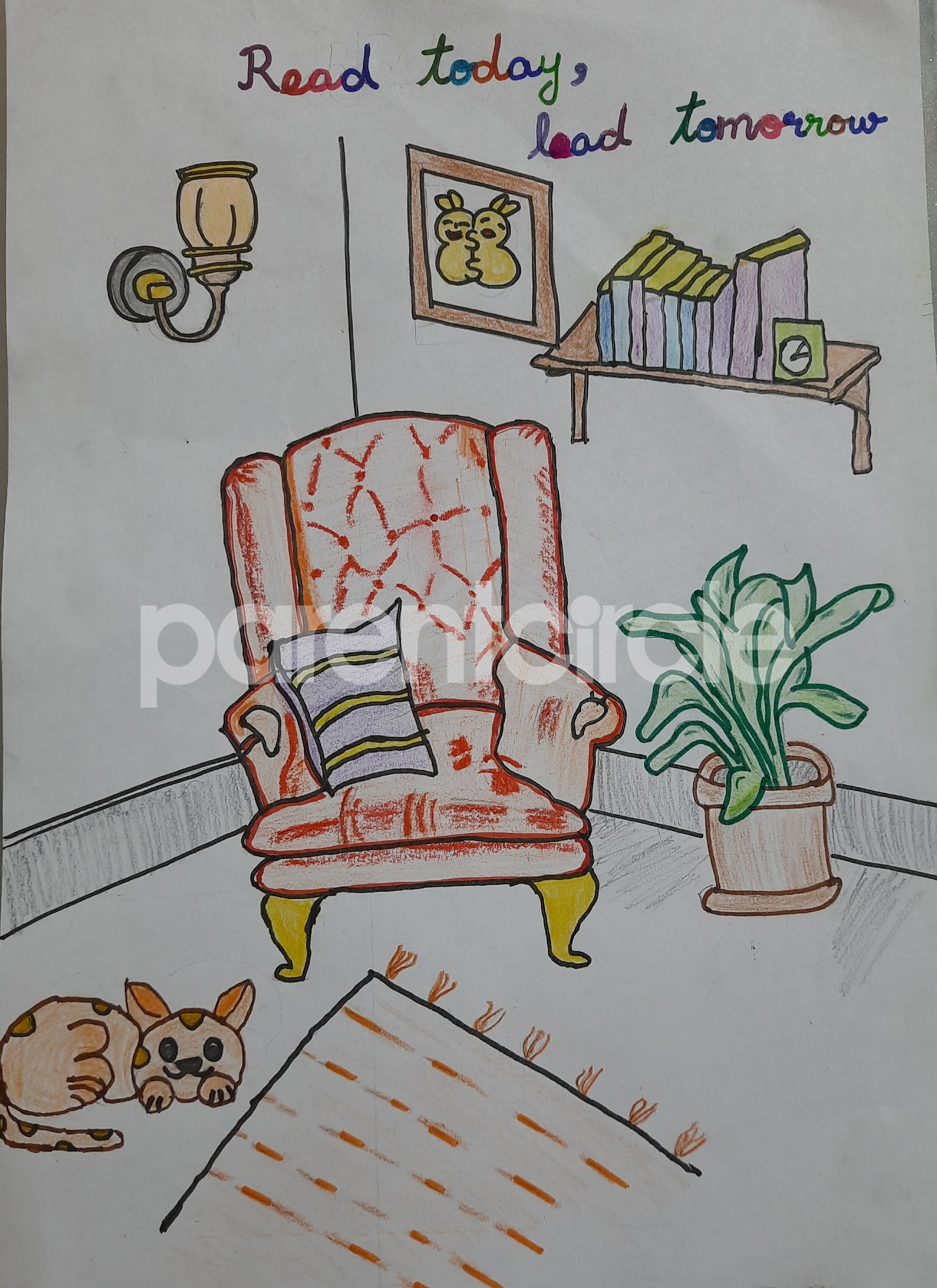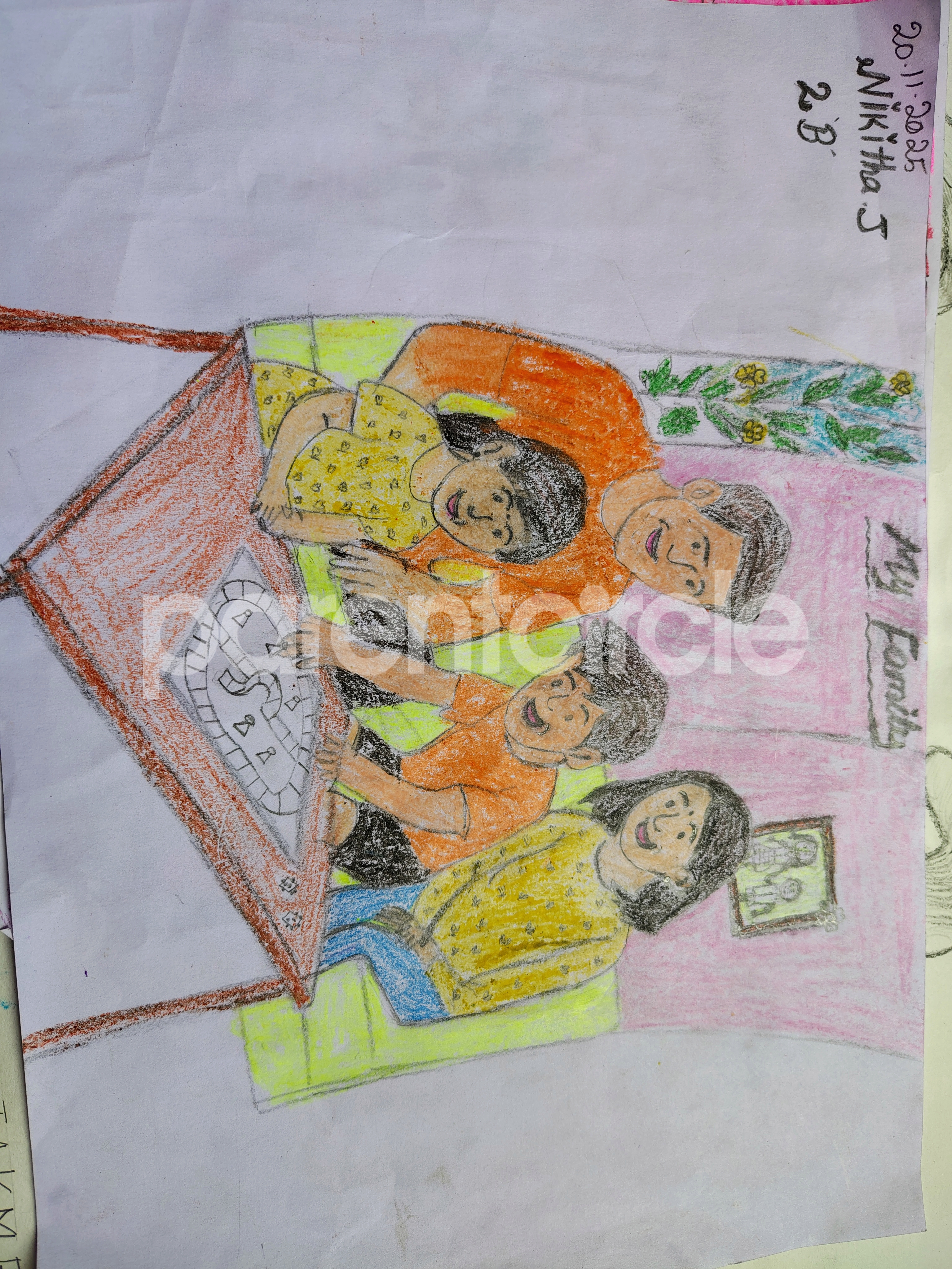 Diya has more than one favourite corner at home. The above drawing shows Study table along with her ART and CRAFT hanging, watching TV by sating on the Couch and finally her small garden in the balcony