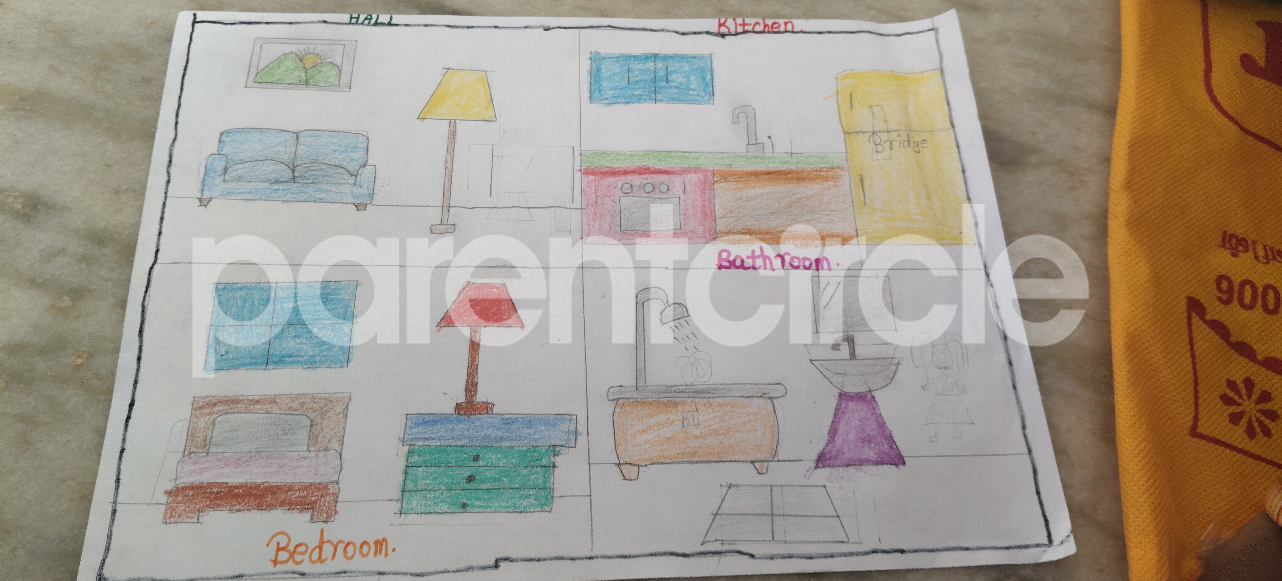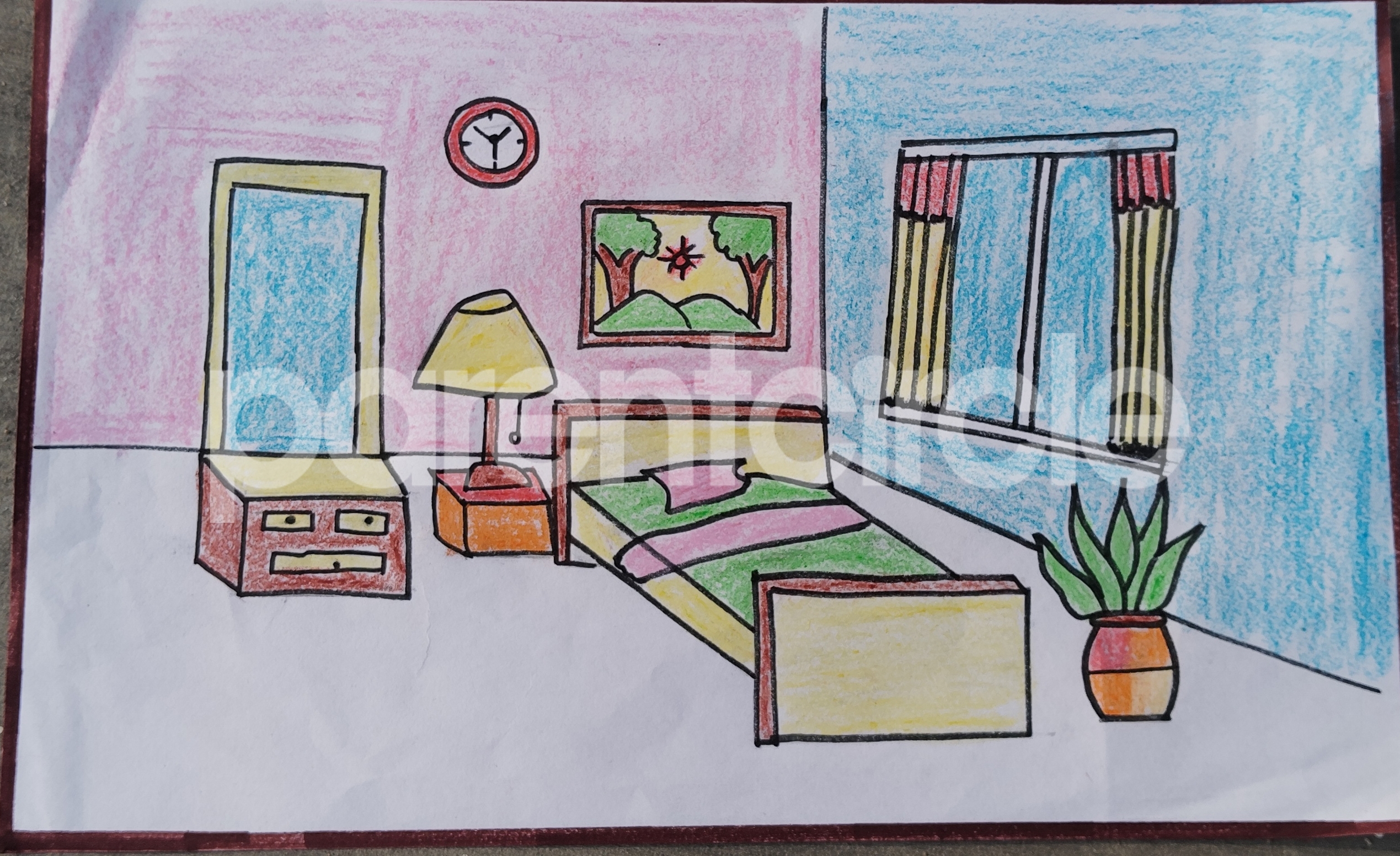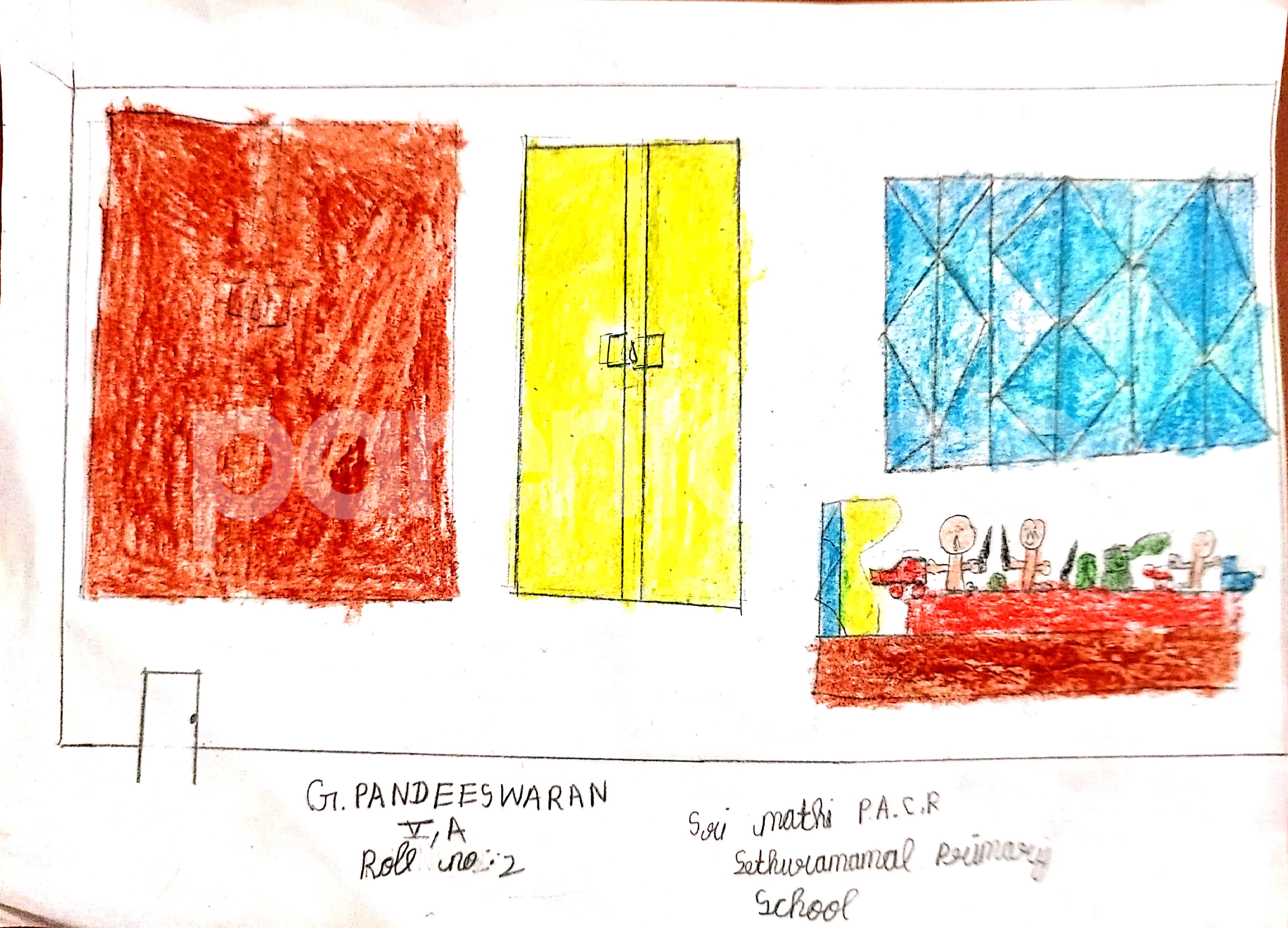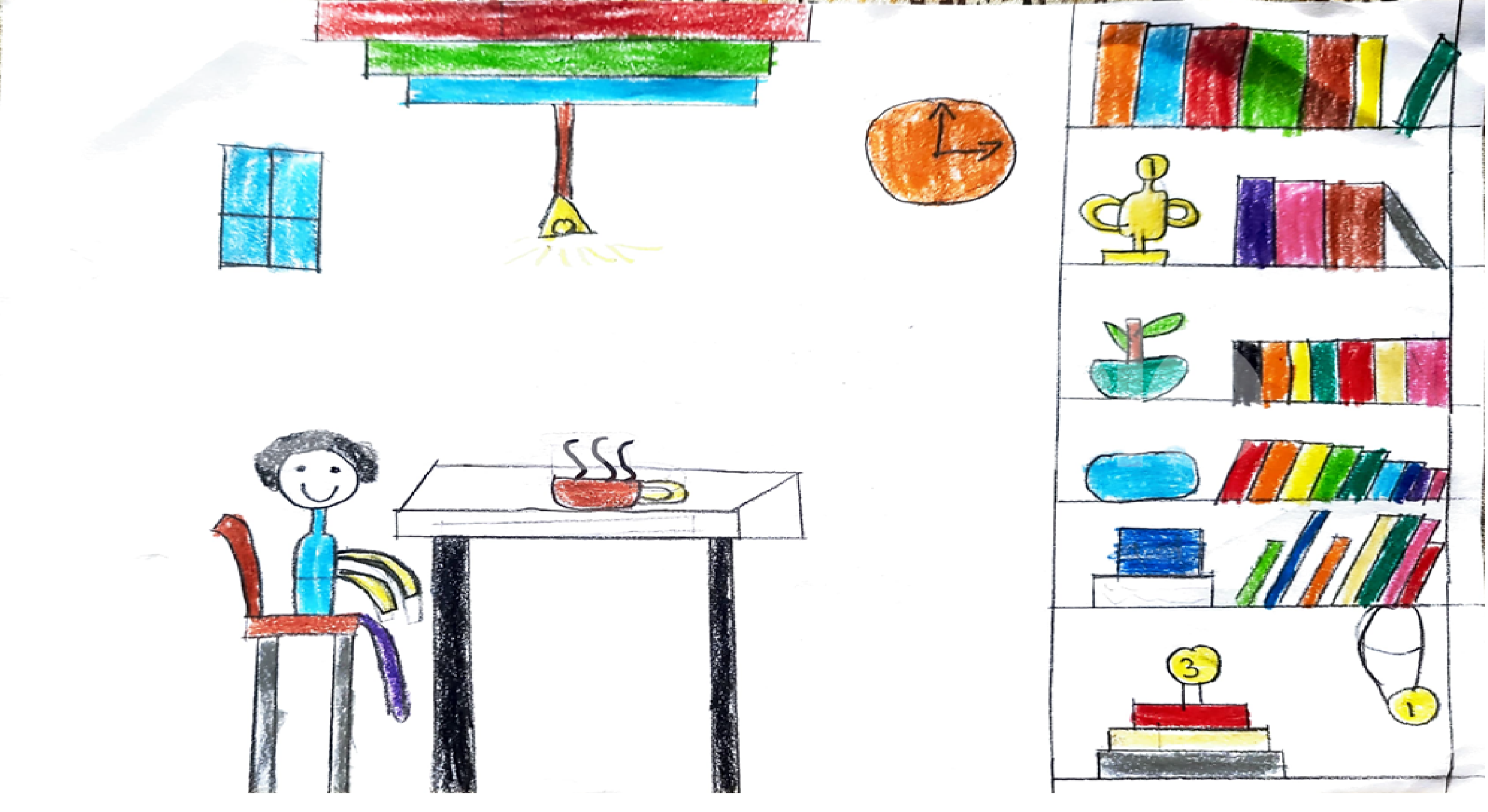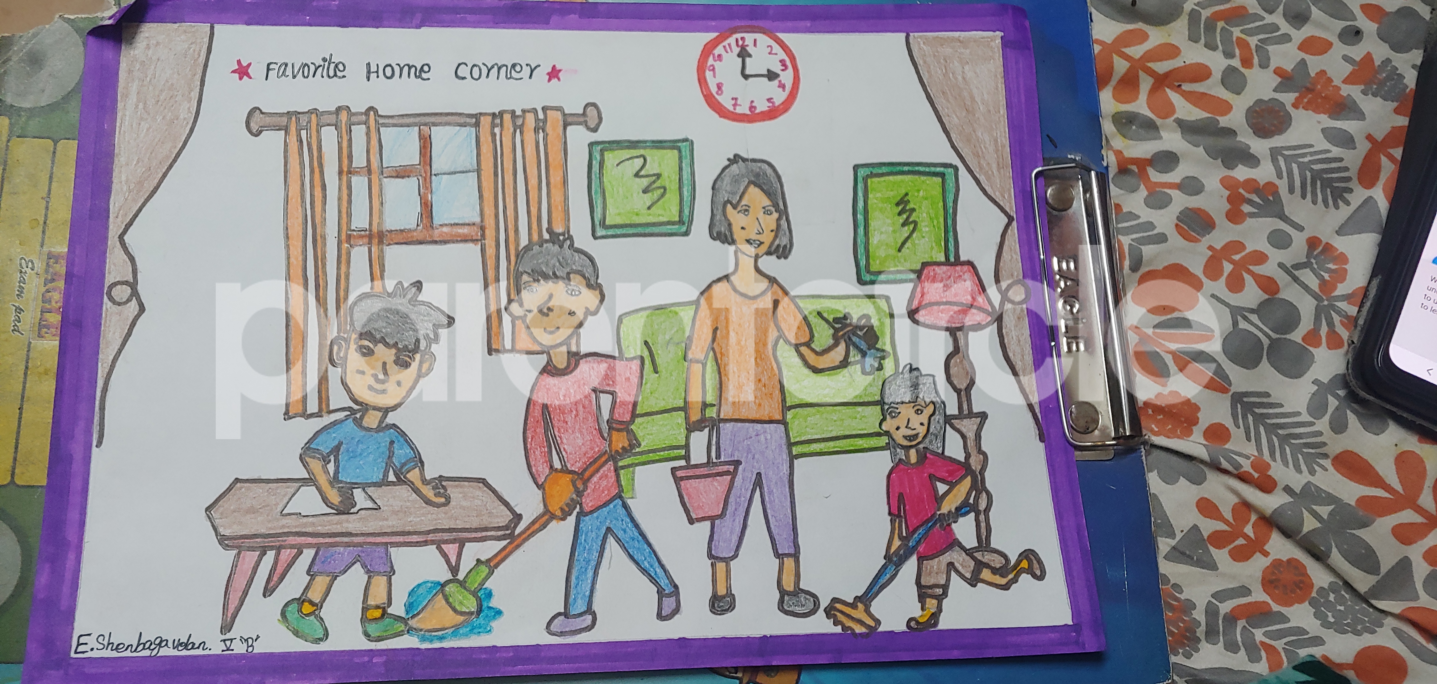 Diya has more than one favourite corner at home. The above drawing shows Study table along with her ART and CRAFT hanging, watching TV by sating on the Couch and finally her small garden in the balcony