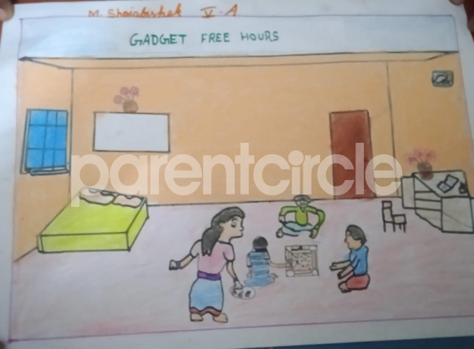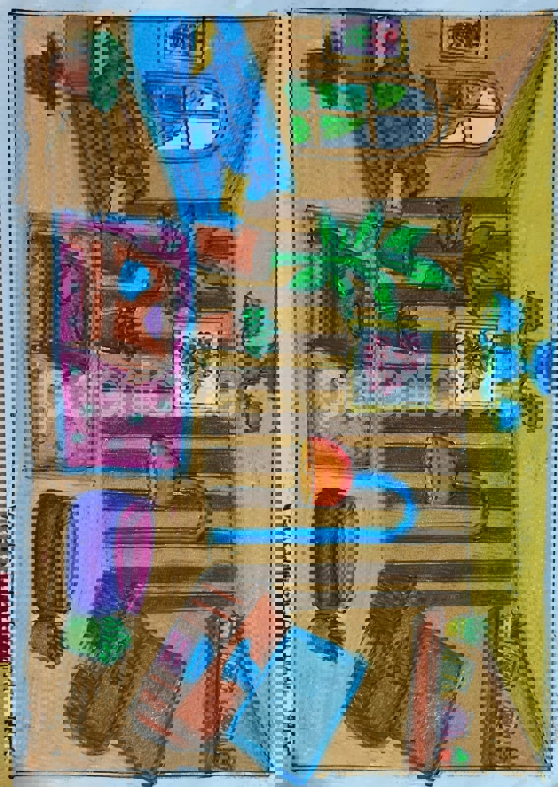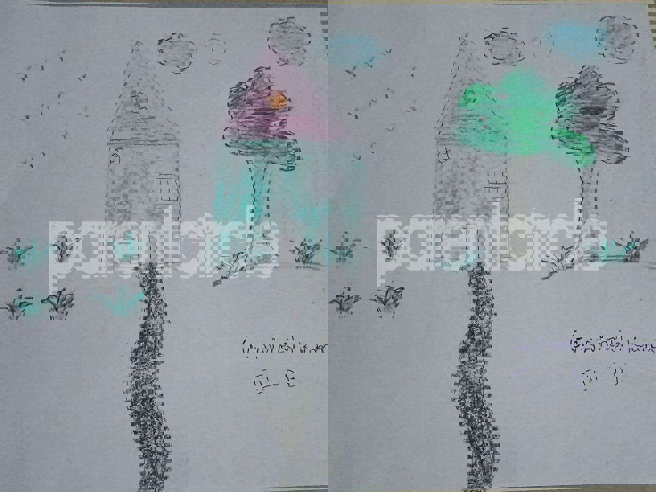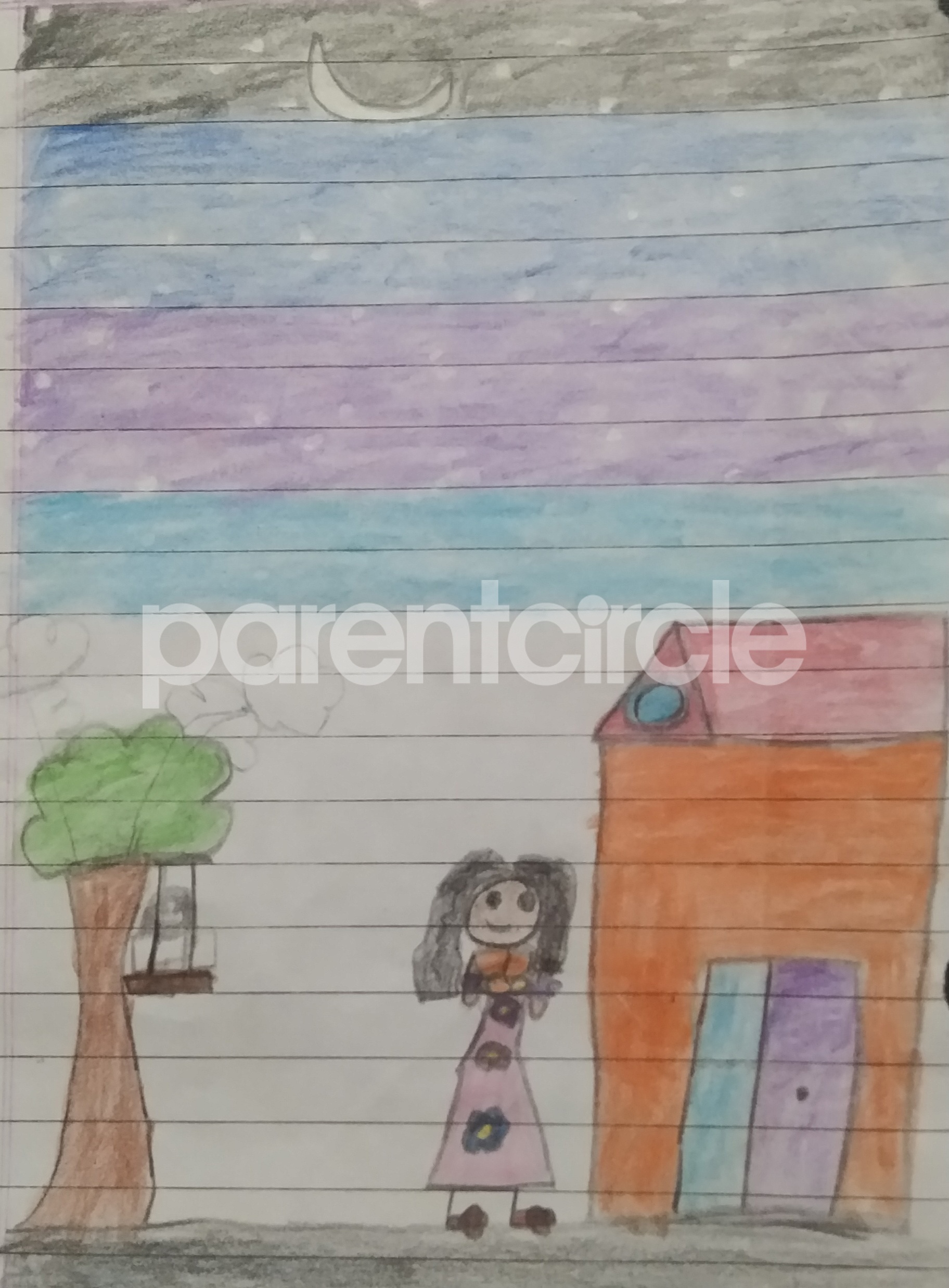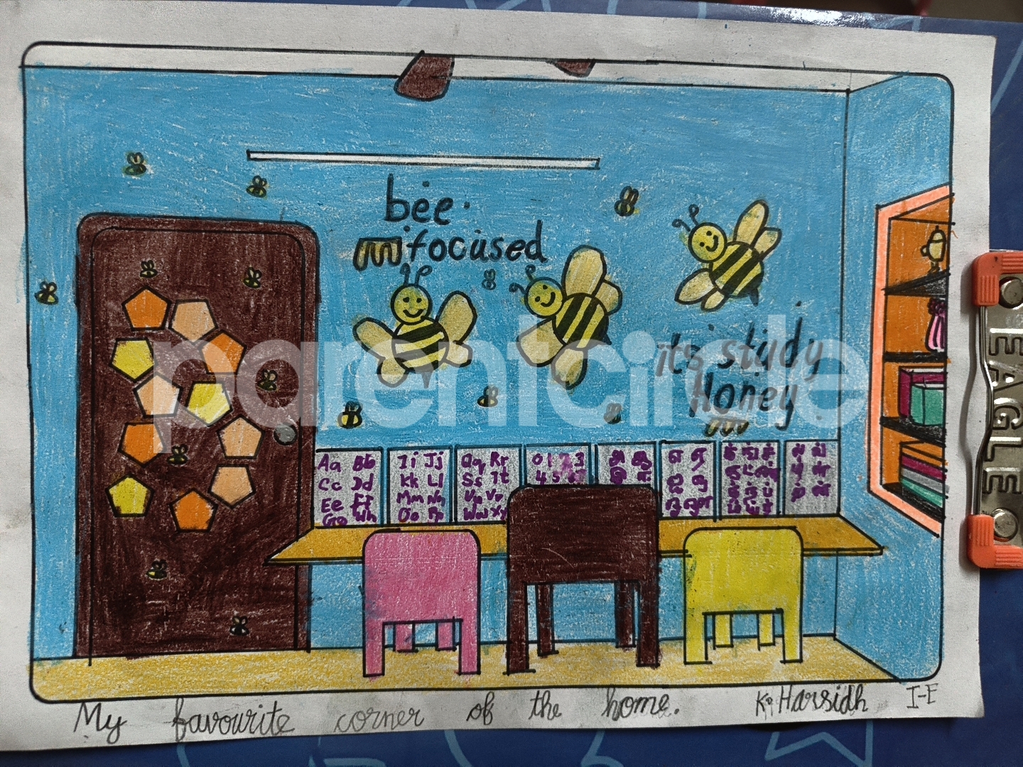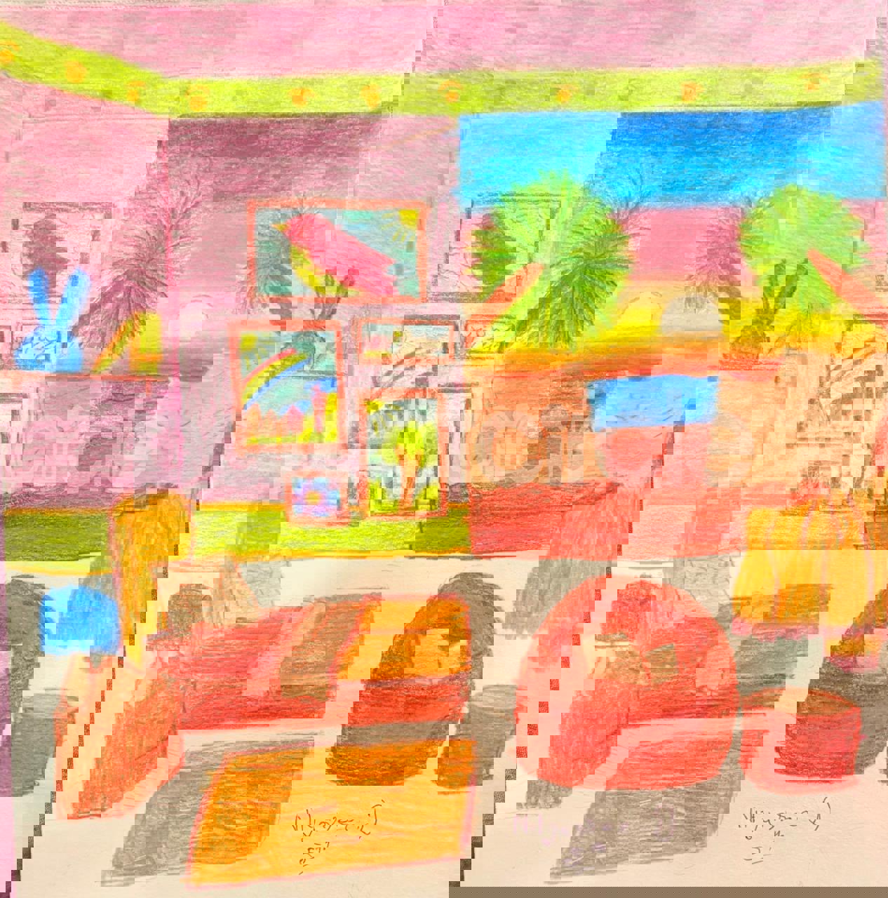 Diya has more than one favourite corner at home. The above drawing shows Study table along with her ART and CRAFT hanging, watching TV by sating on the Couch and finally her small garden in the balcony