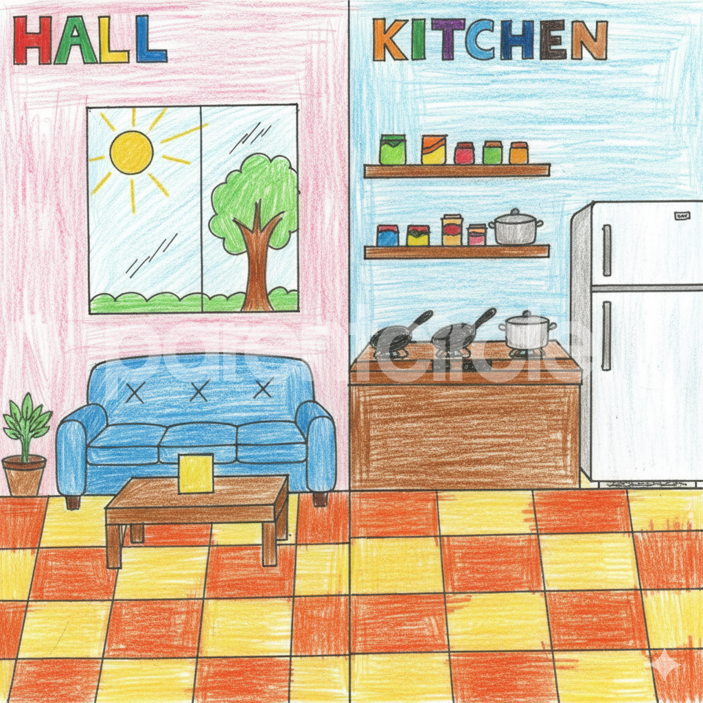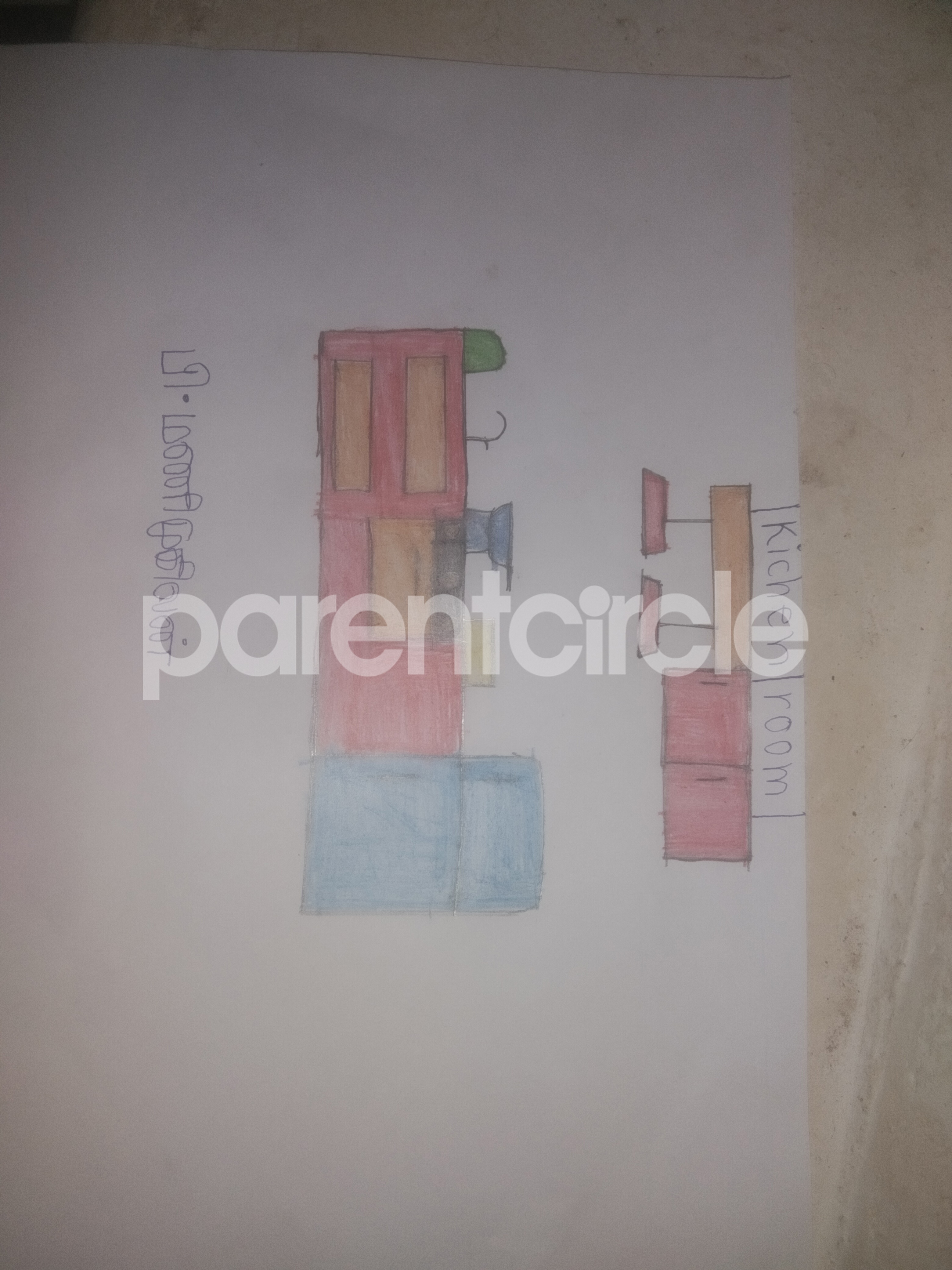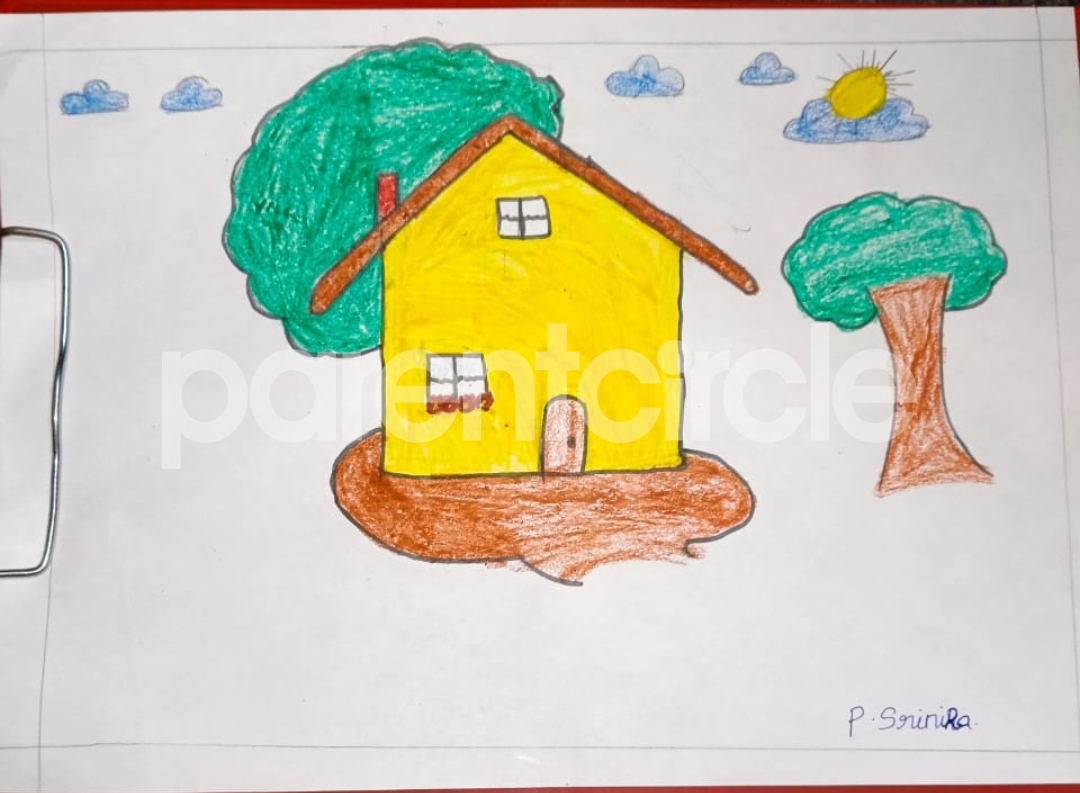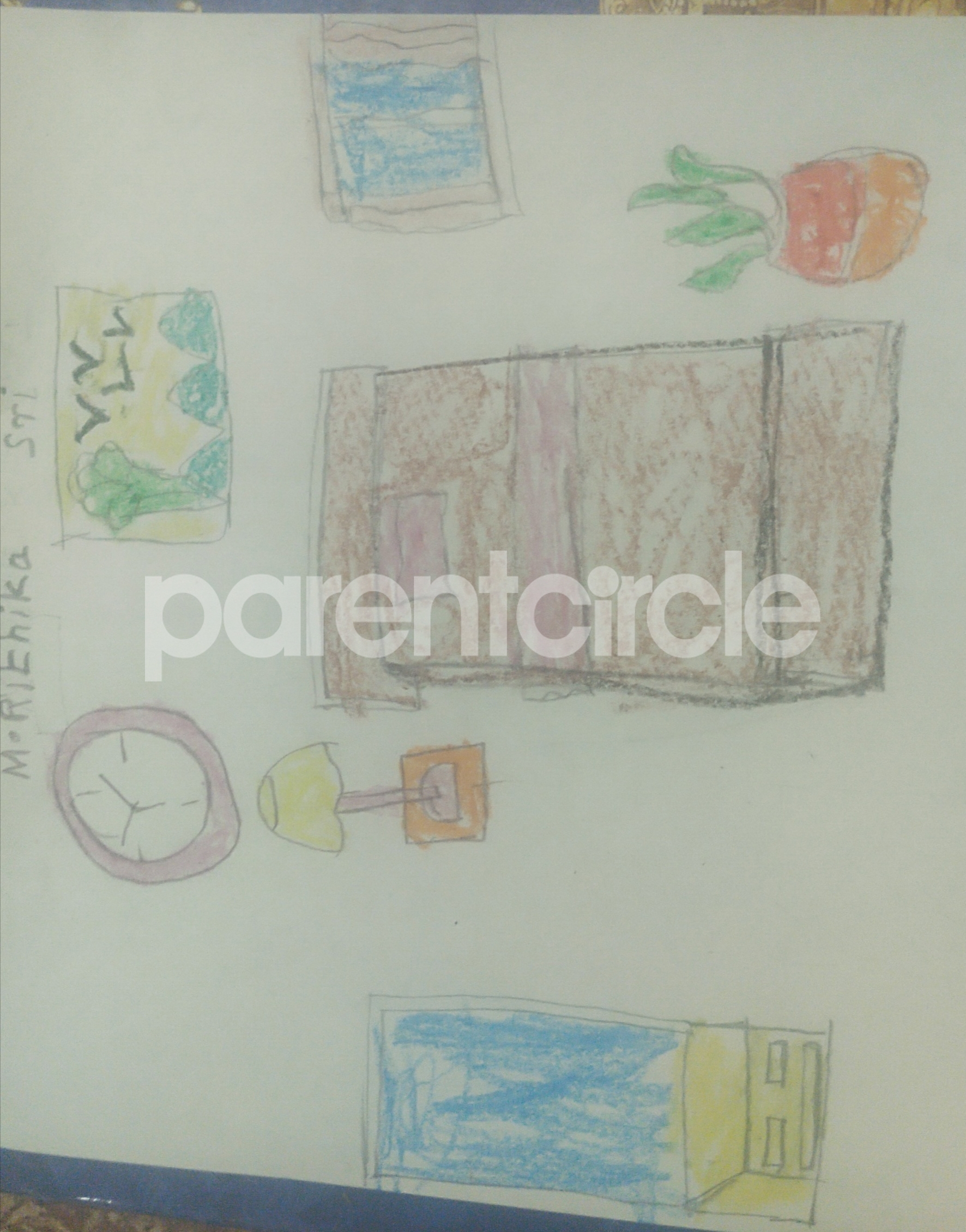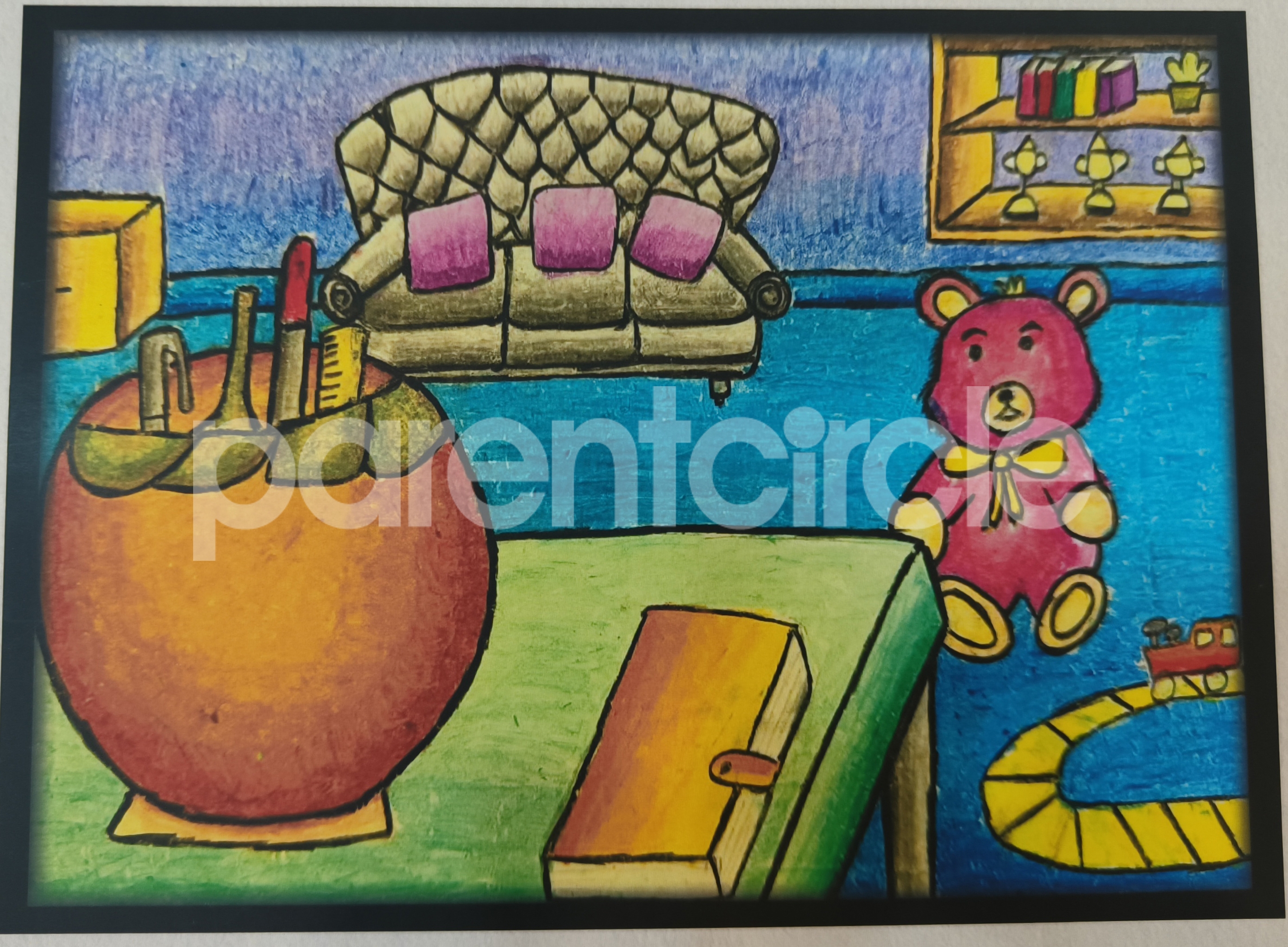 Diya has more than one favourite corner at home. The above drawing shows Study table along with her ART and CRAFT hanging, watching TV by sating on the Couch and finally her small garden in the balcony