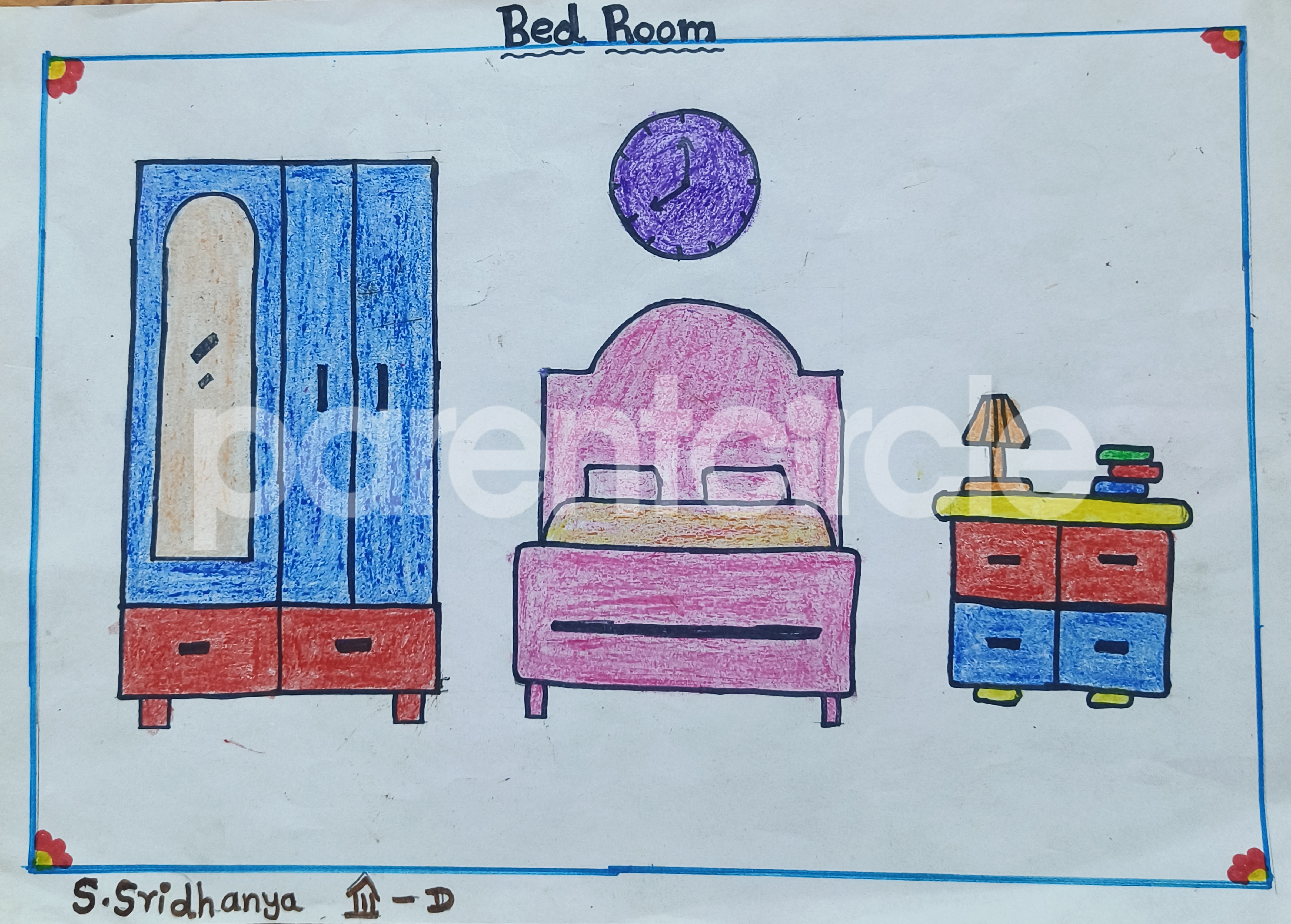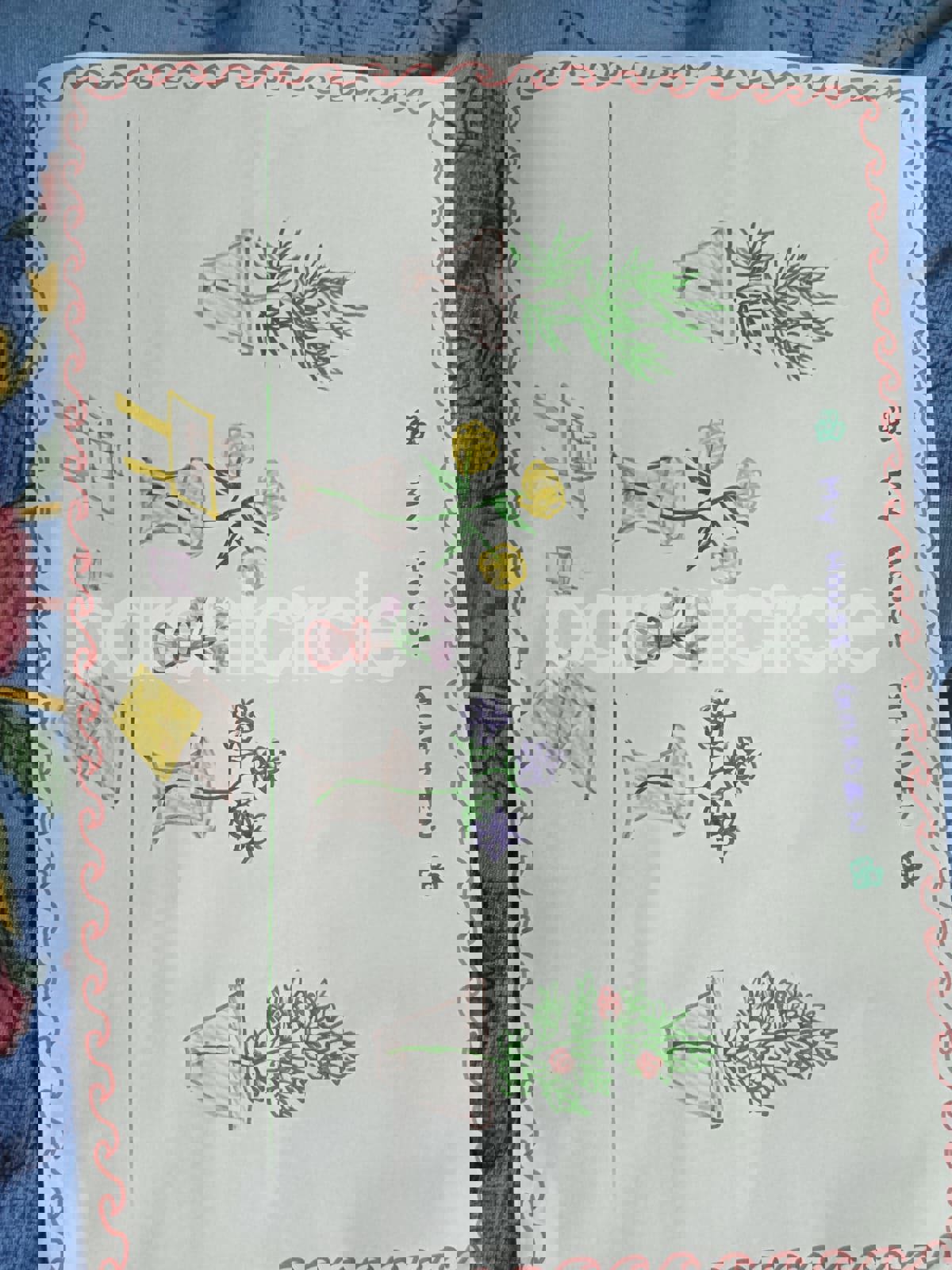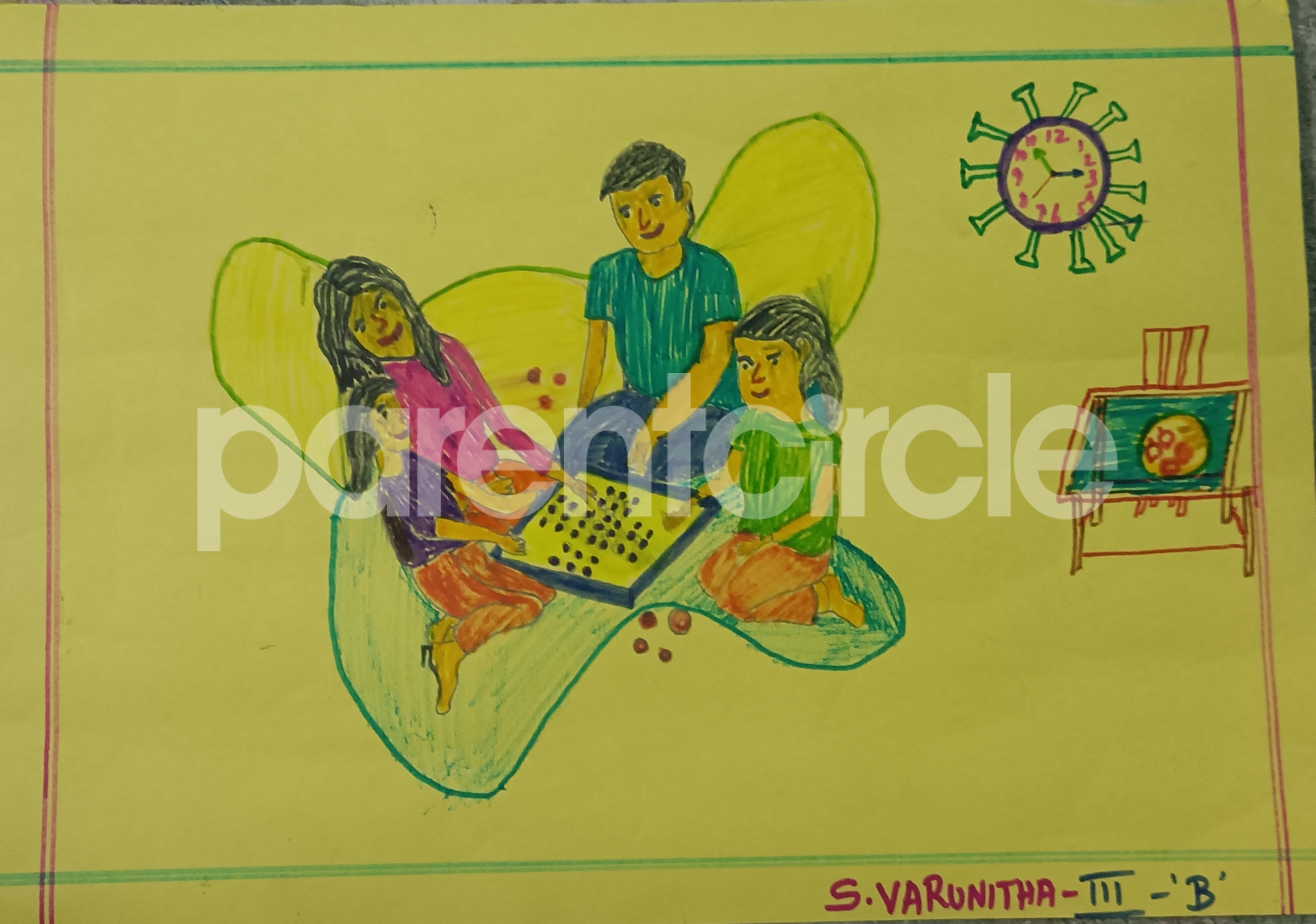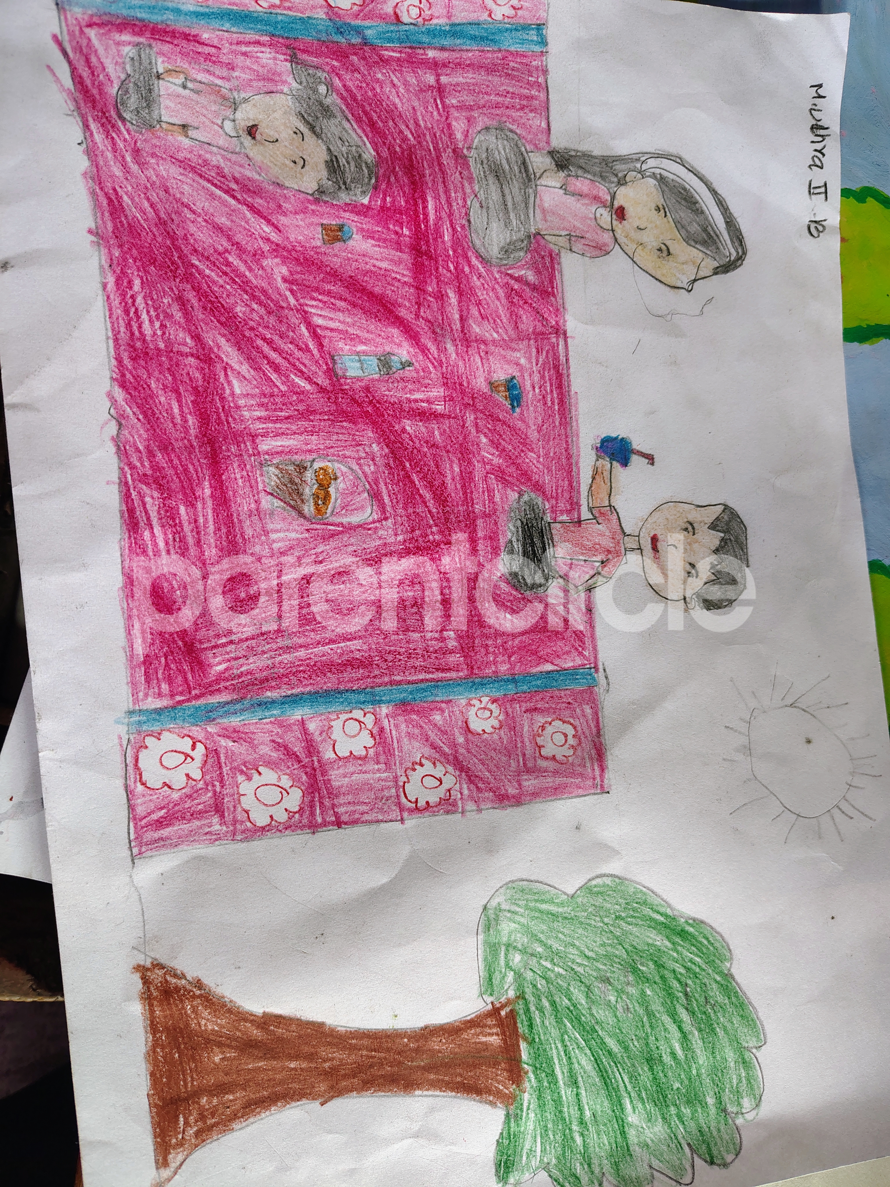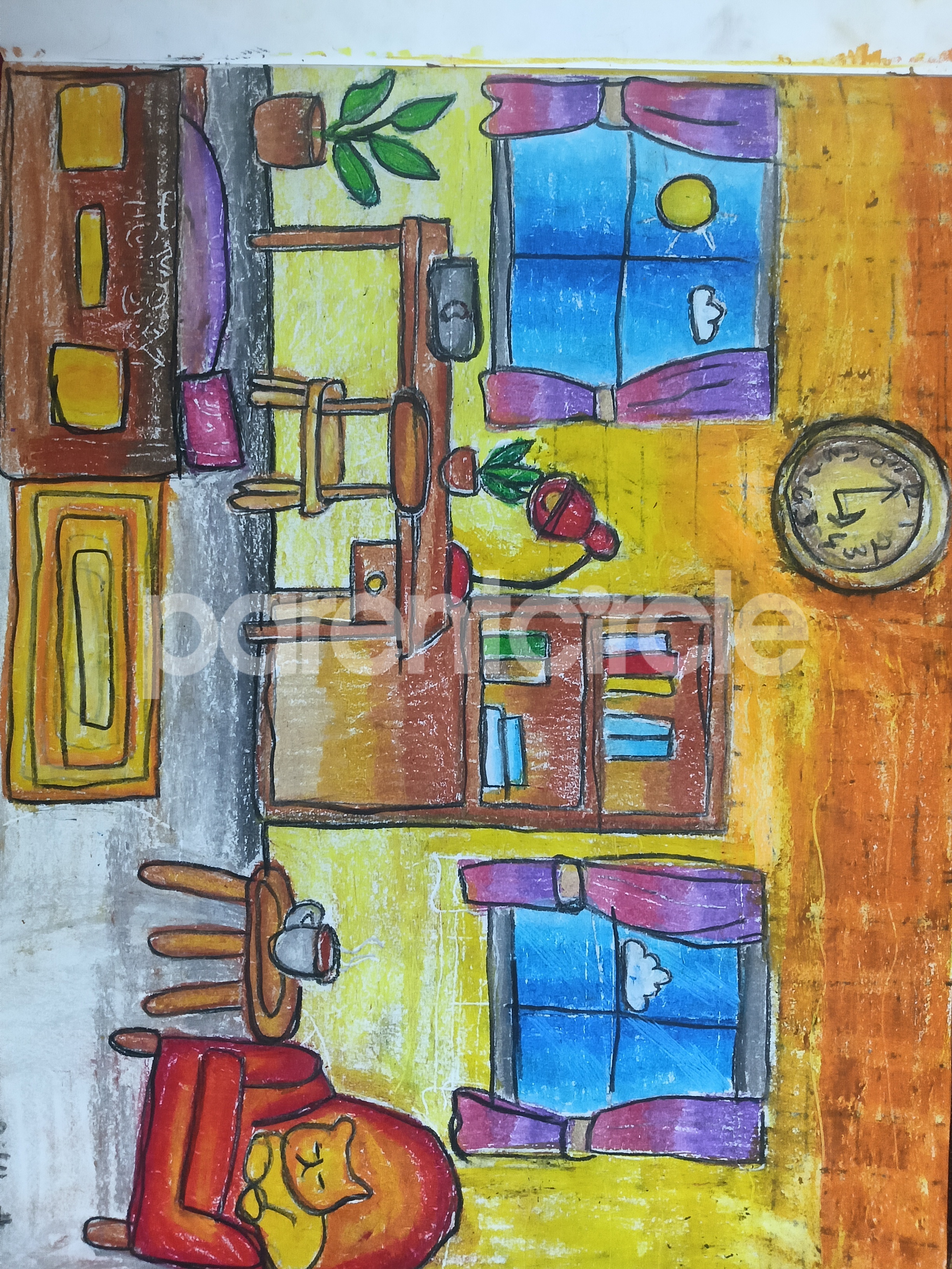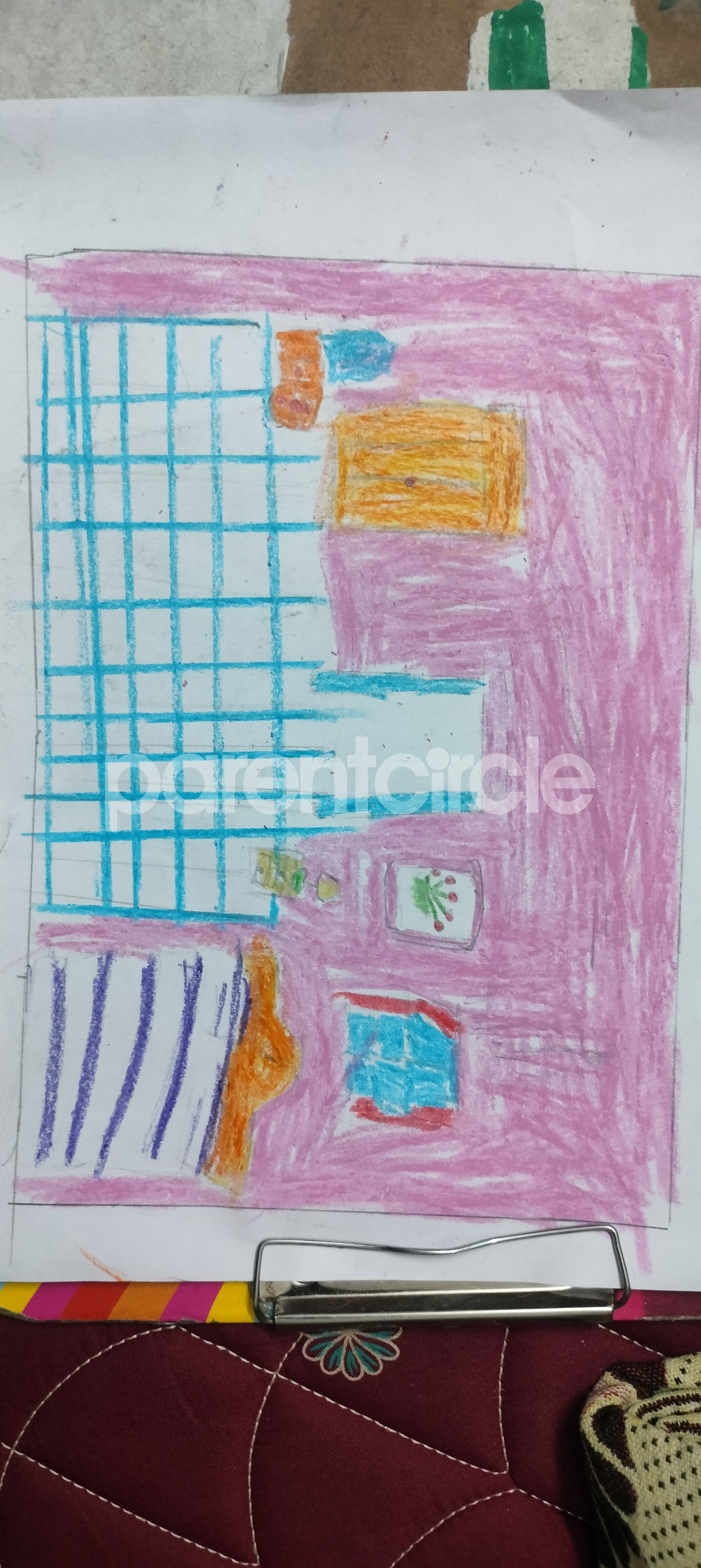 Diya has more than one favourite corner at home. The above drawing shows Study table along with her ART and CRAFT hanging, watching TV by sating on the Couch and finally her small garden in the balcony