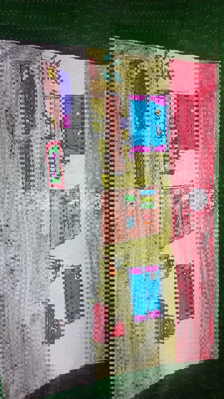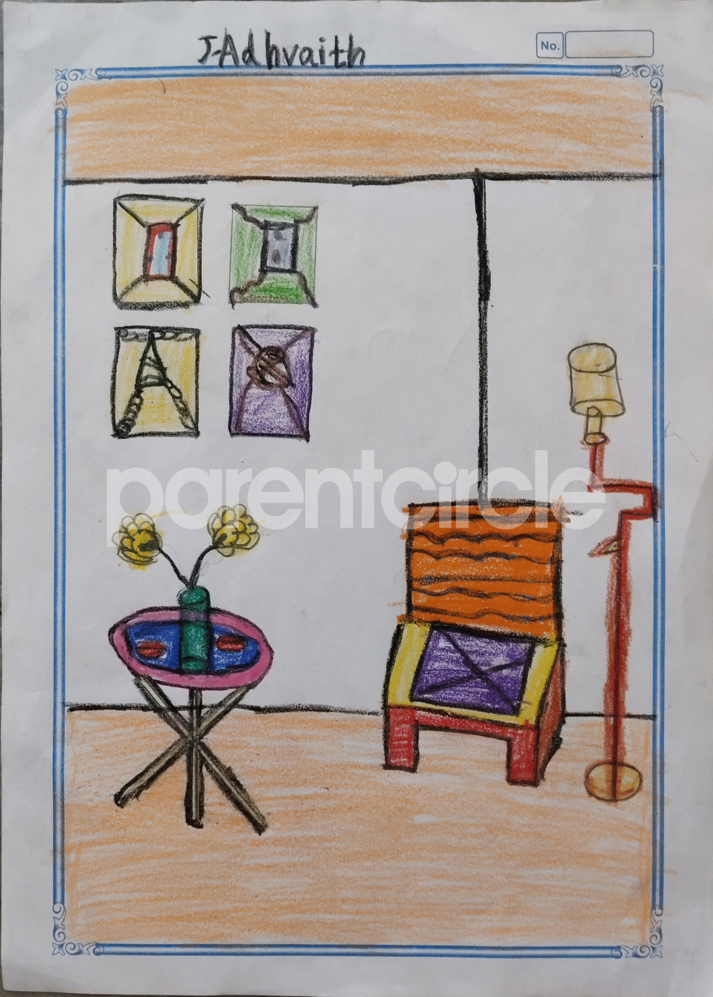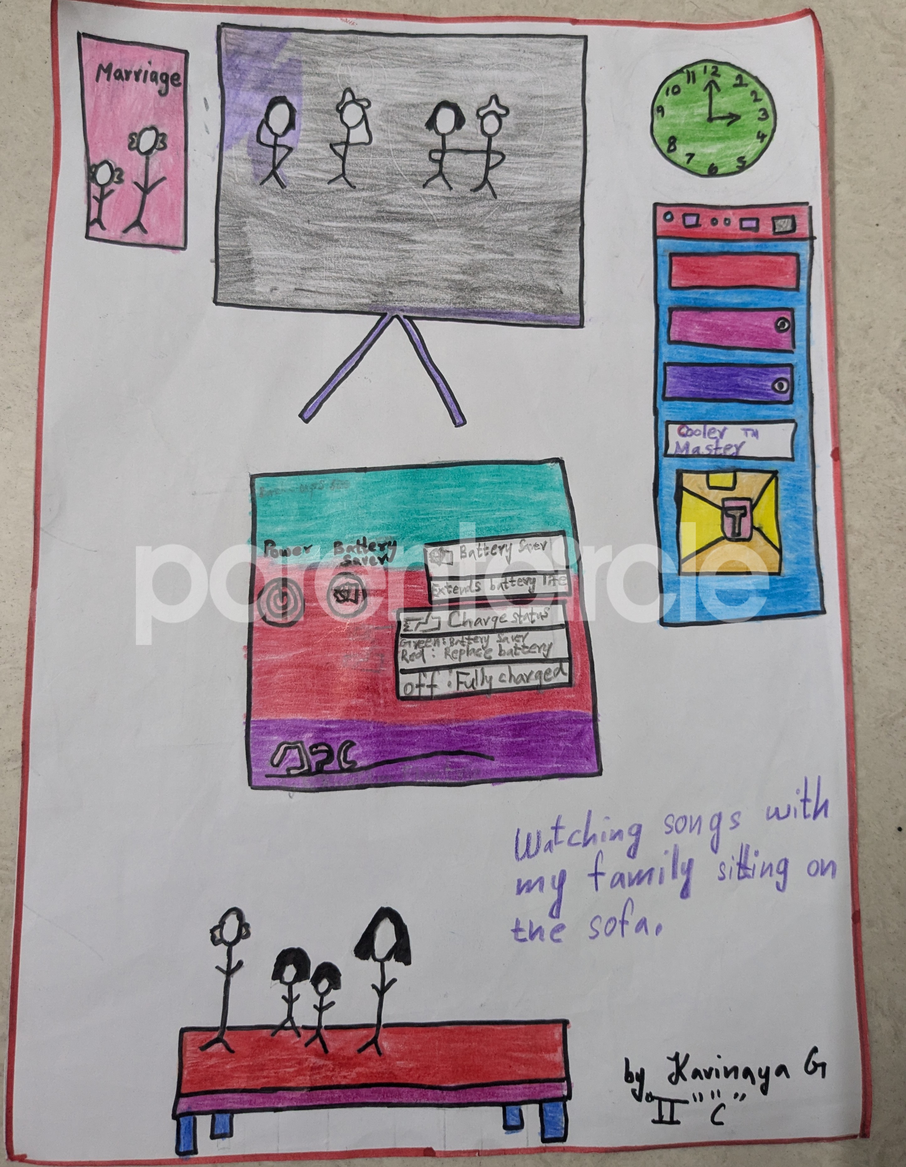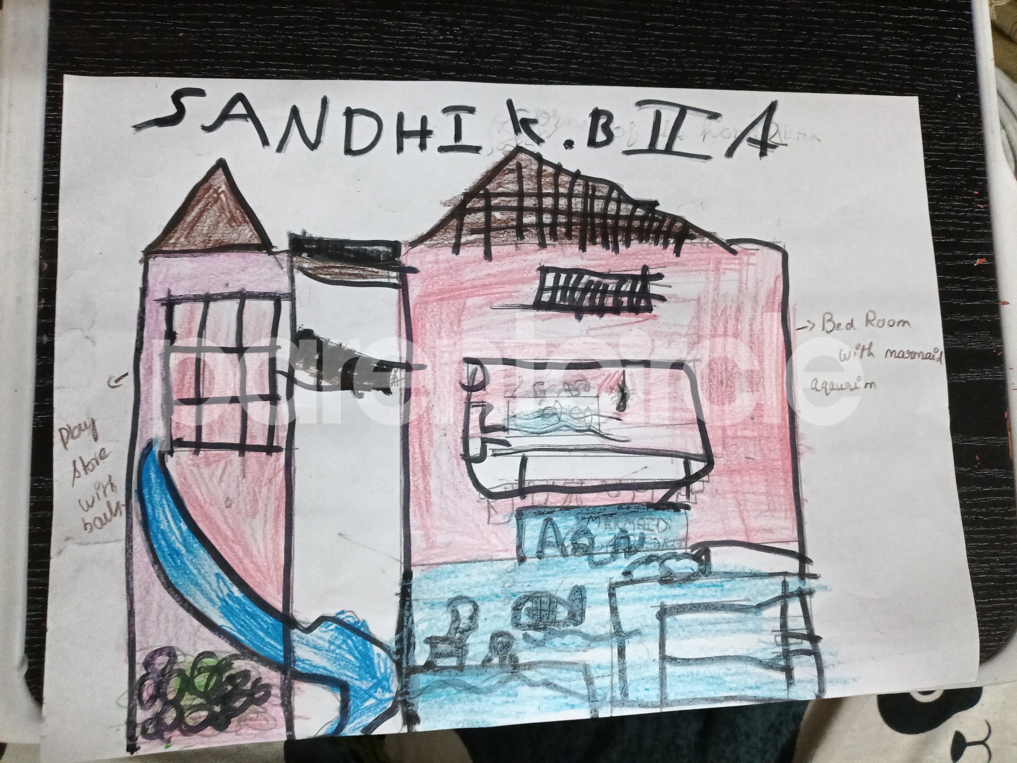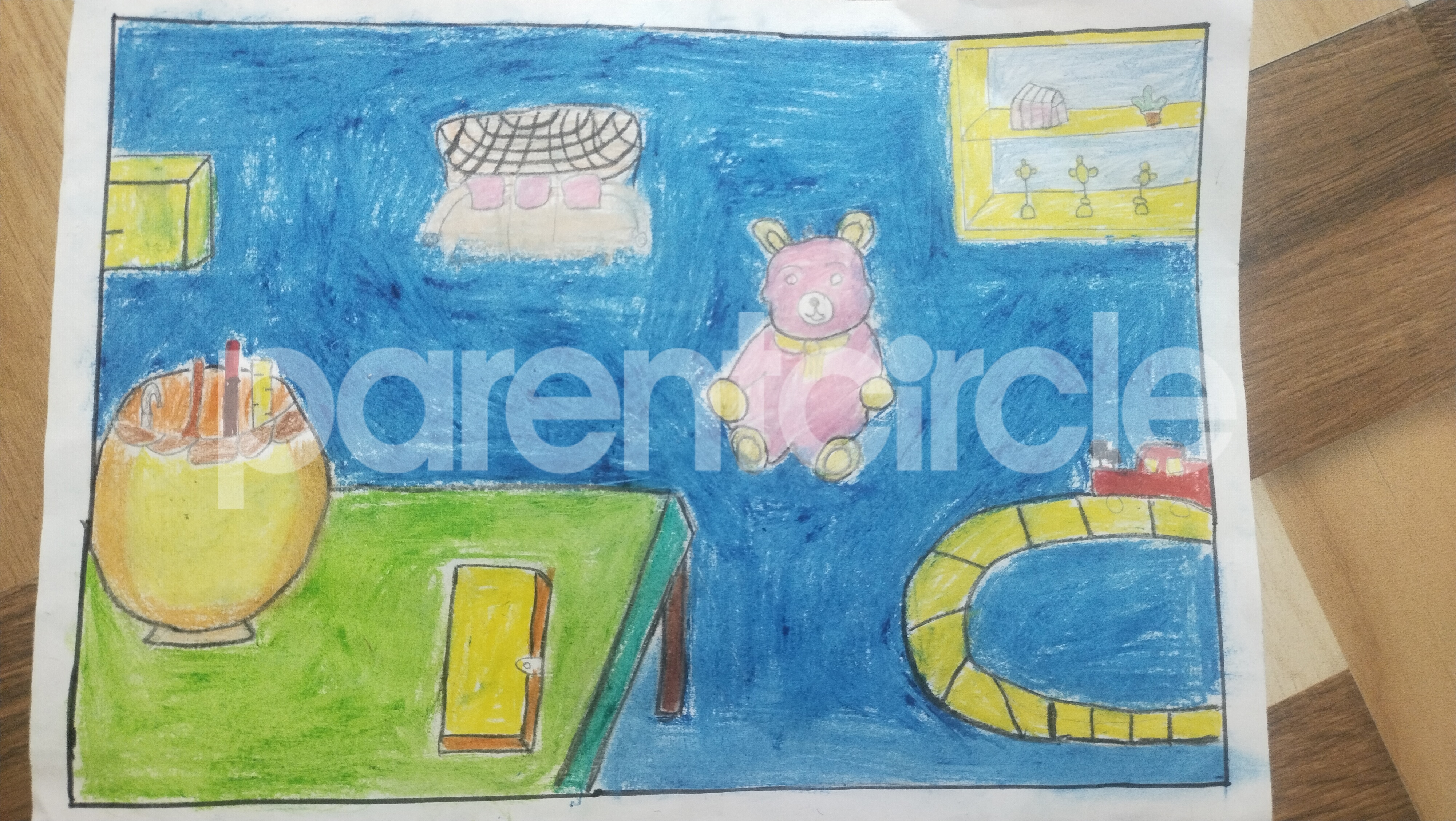 Diya has more than one favourite corner at home. The above drawing shows Study table along with her ART and CRAFT hanging, watching TV by sating on the Couch and finally her small garden in the balcony