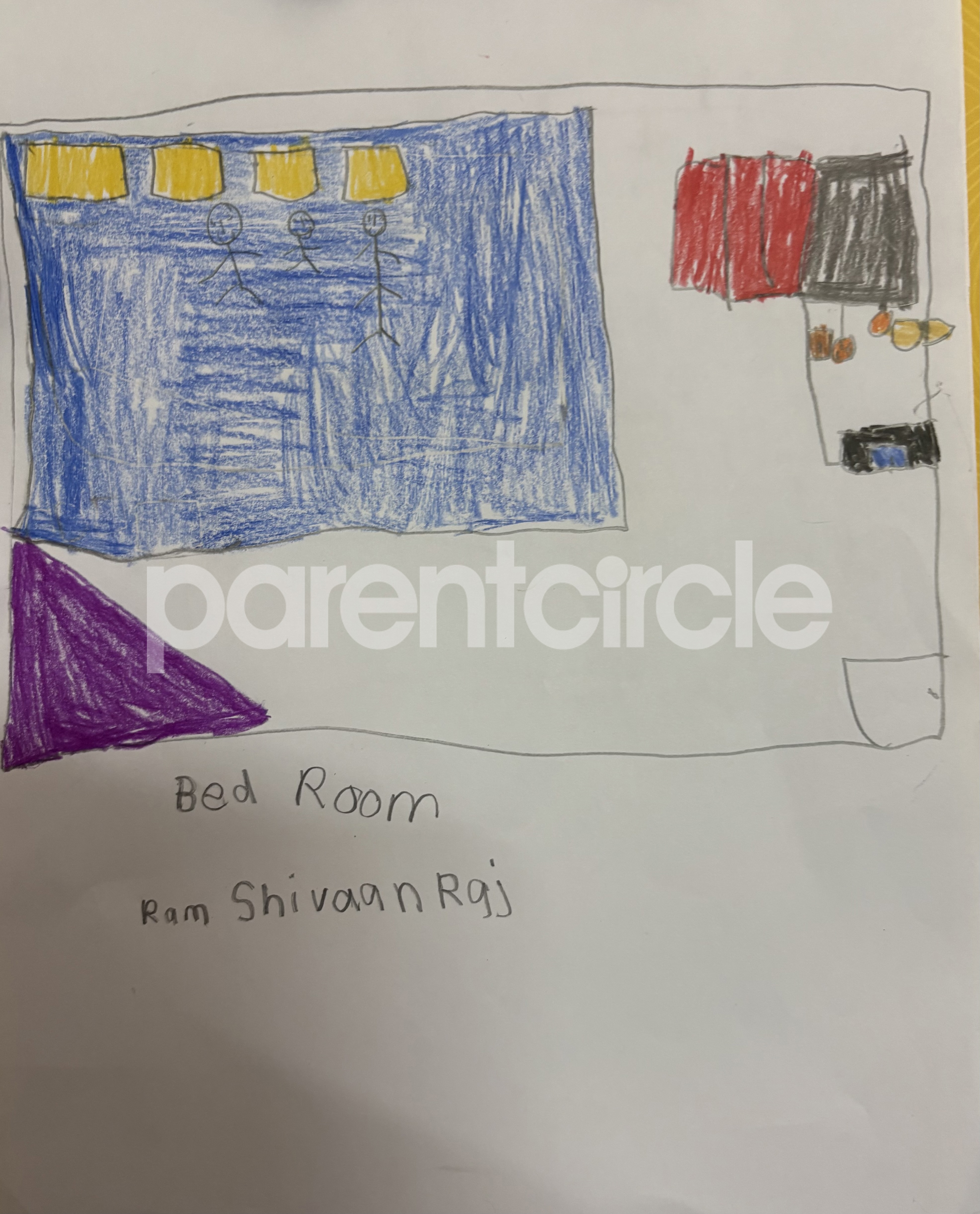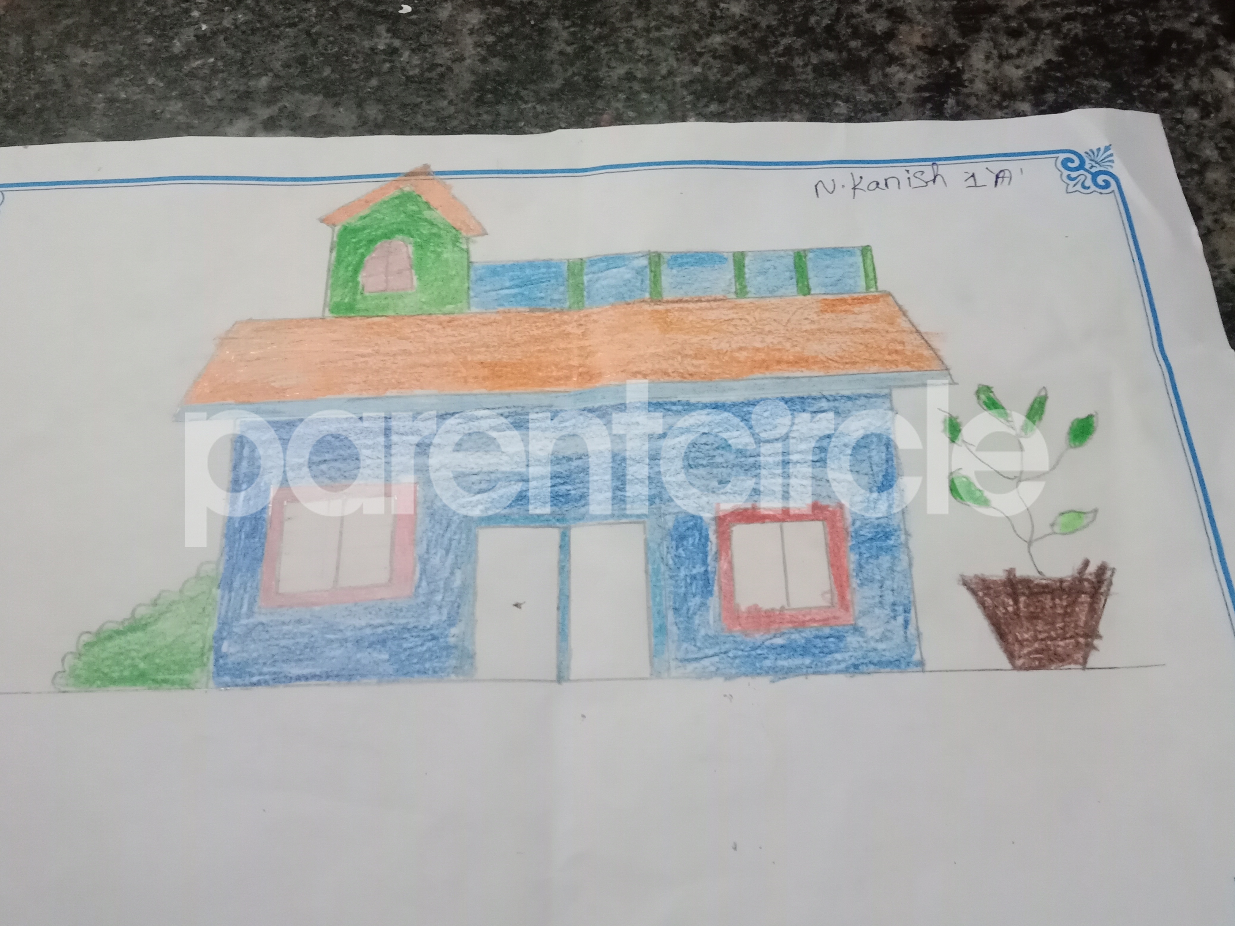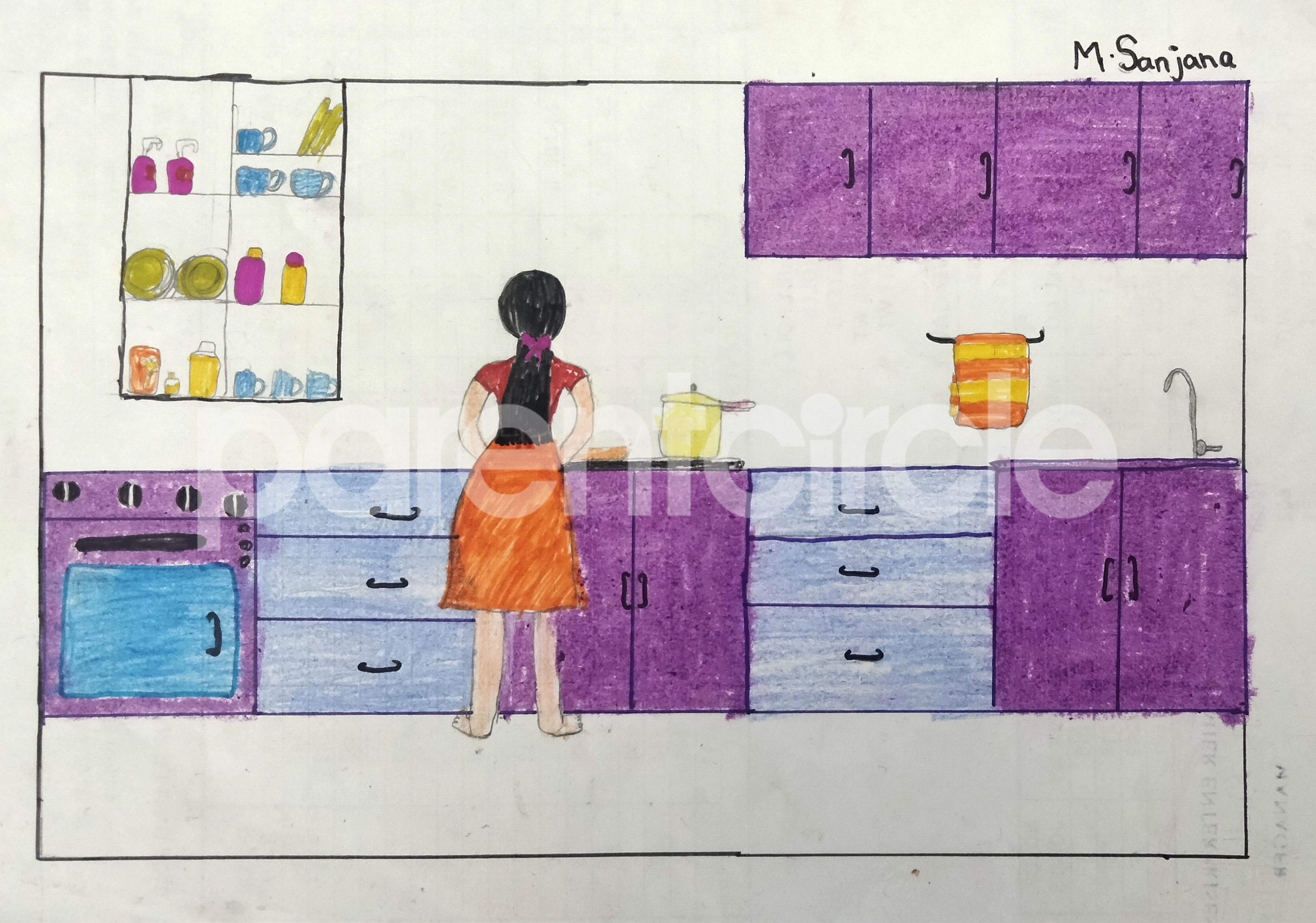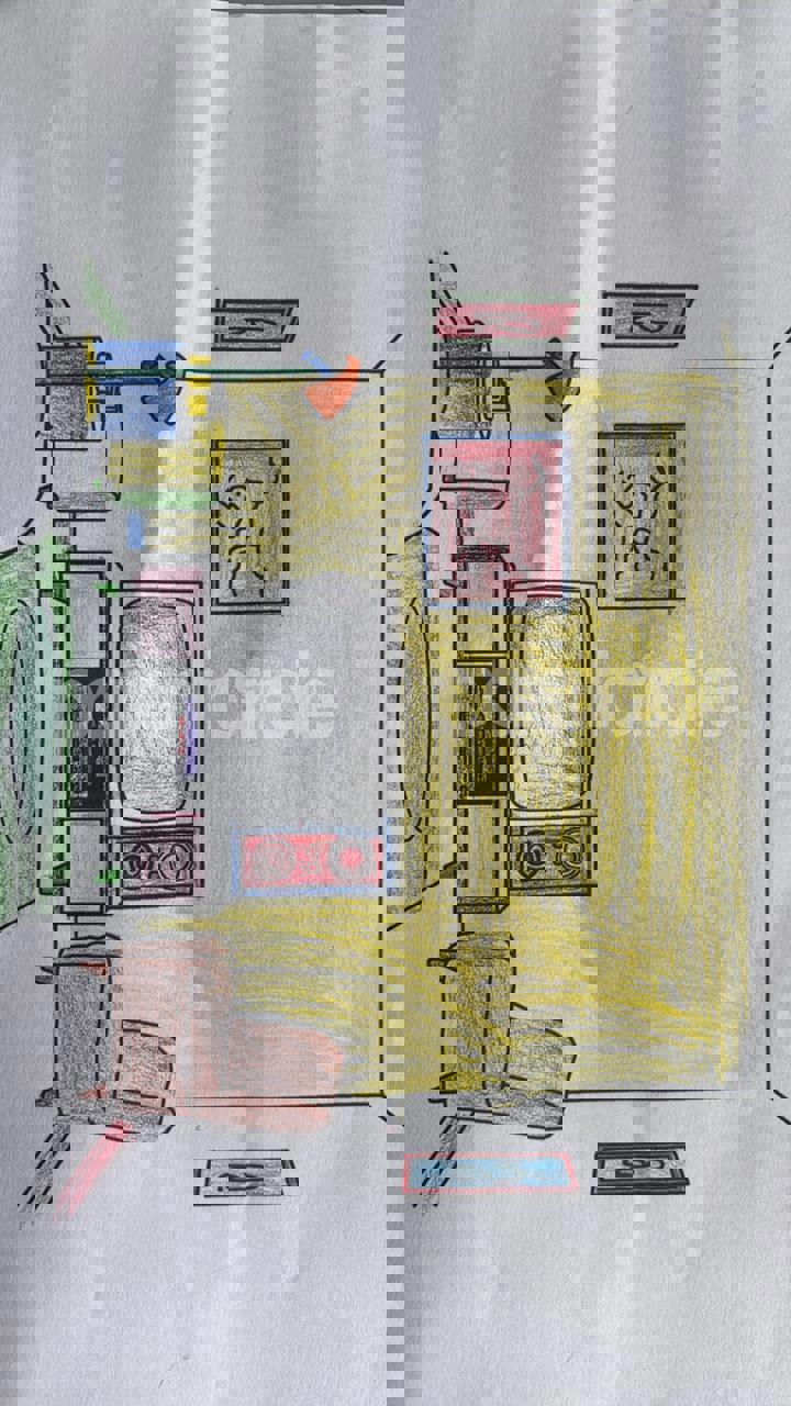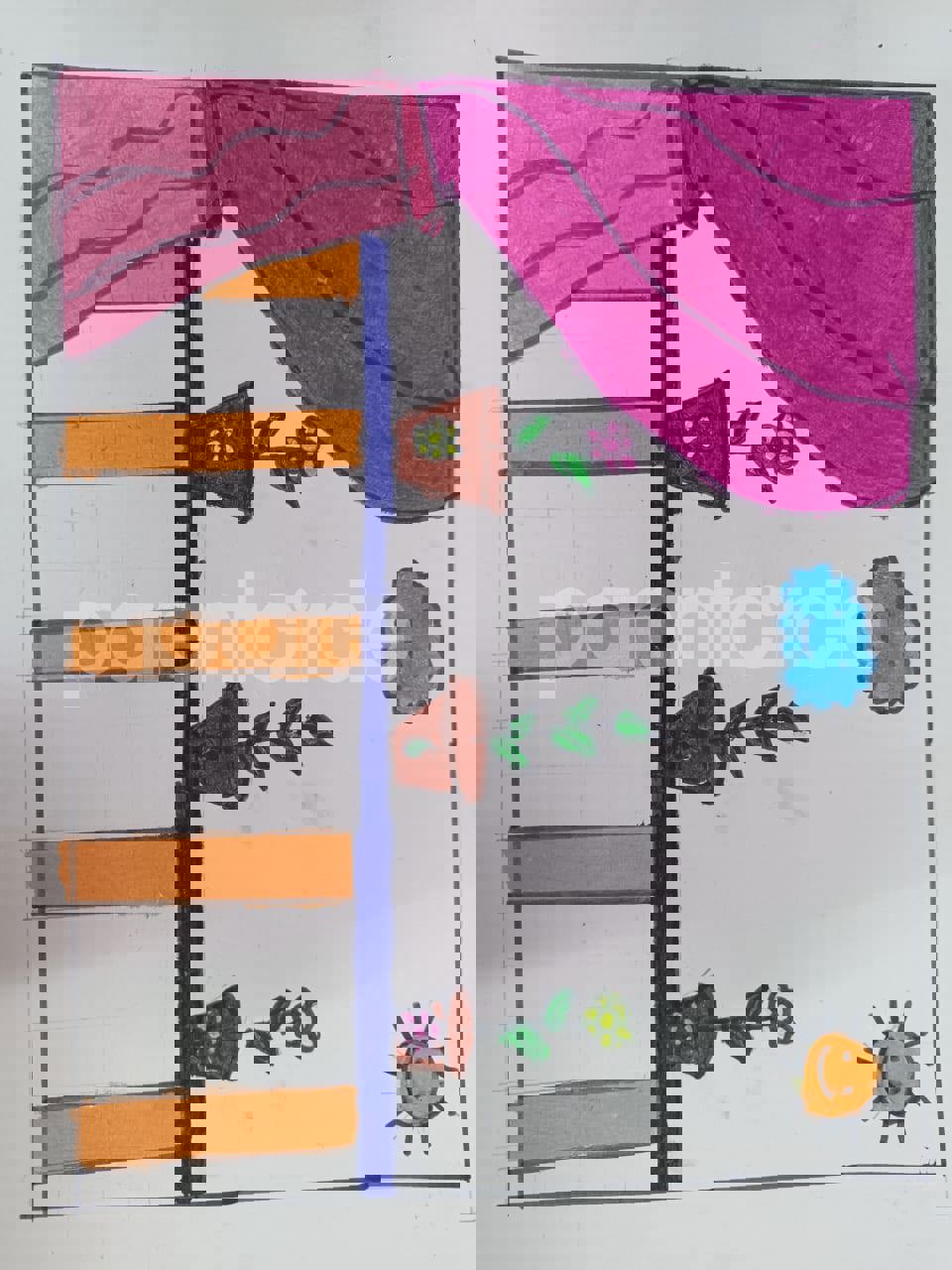 Diya has more than one favourite corner at home. The above drawing shows Study table along with her ART and CRAFT hanging, watching TV by sating on the Couch and finally her small garden in the balcony