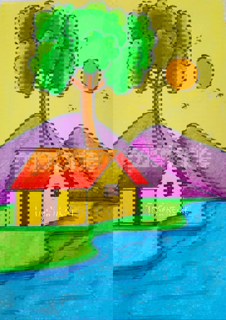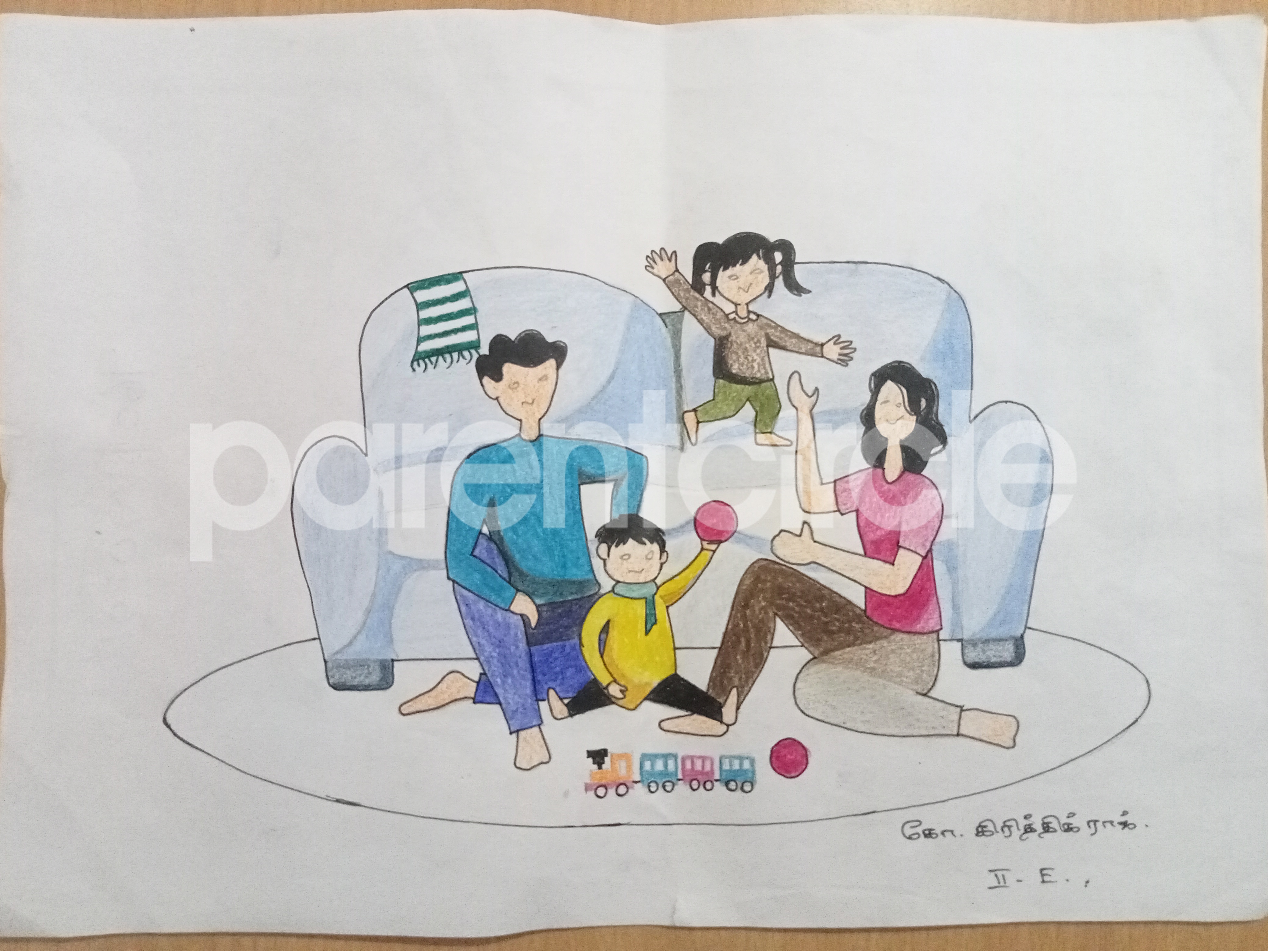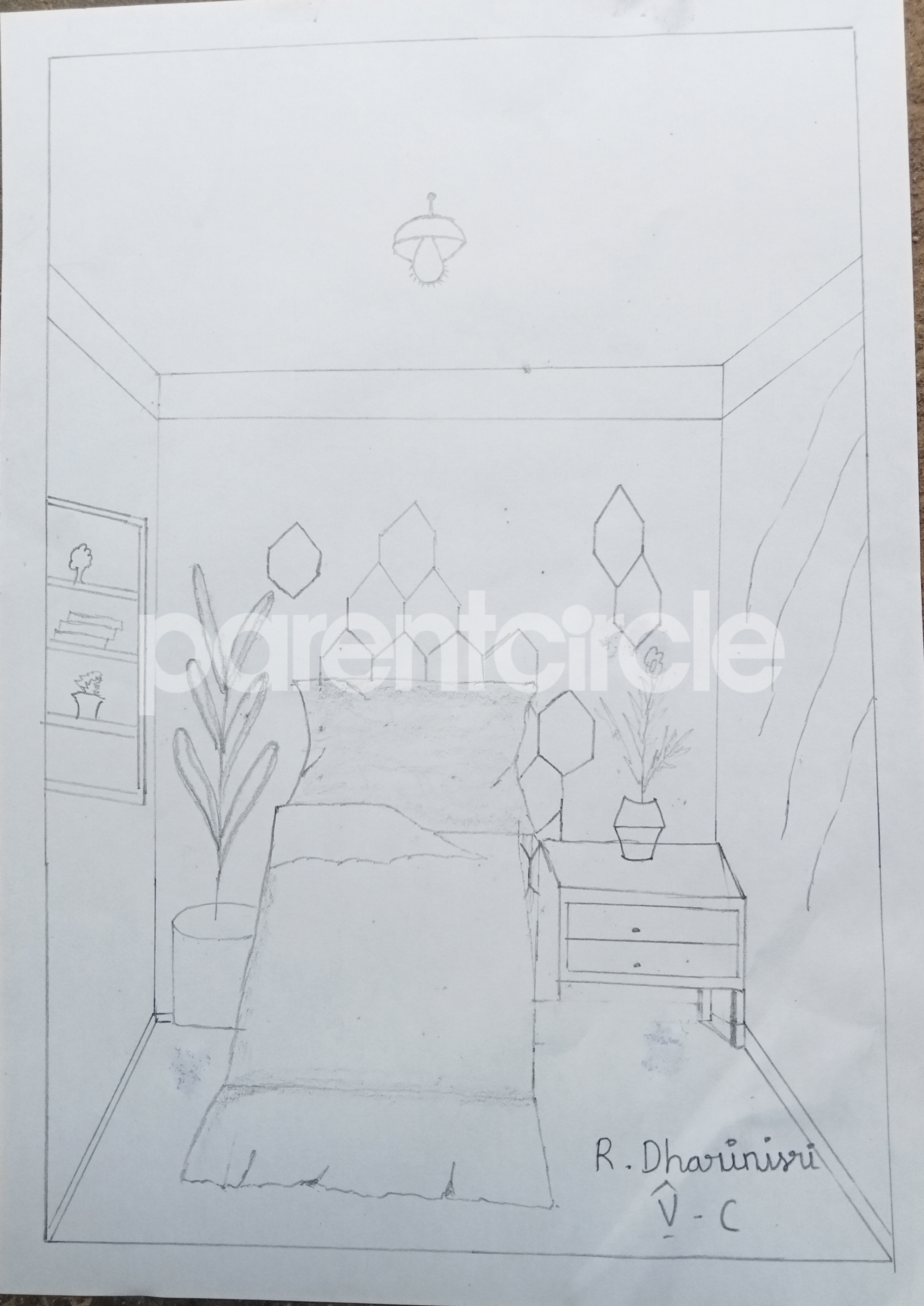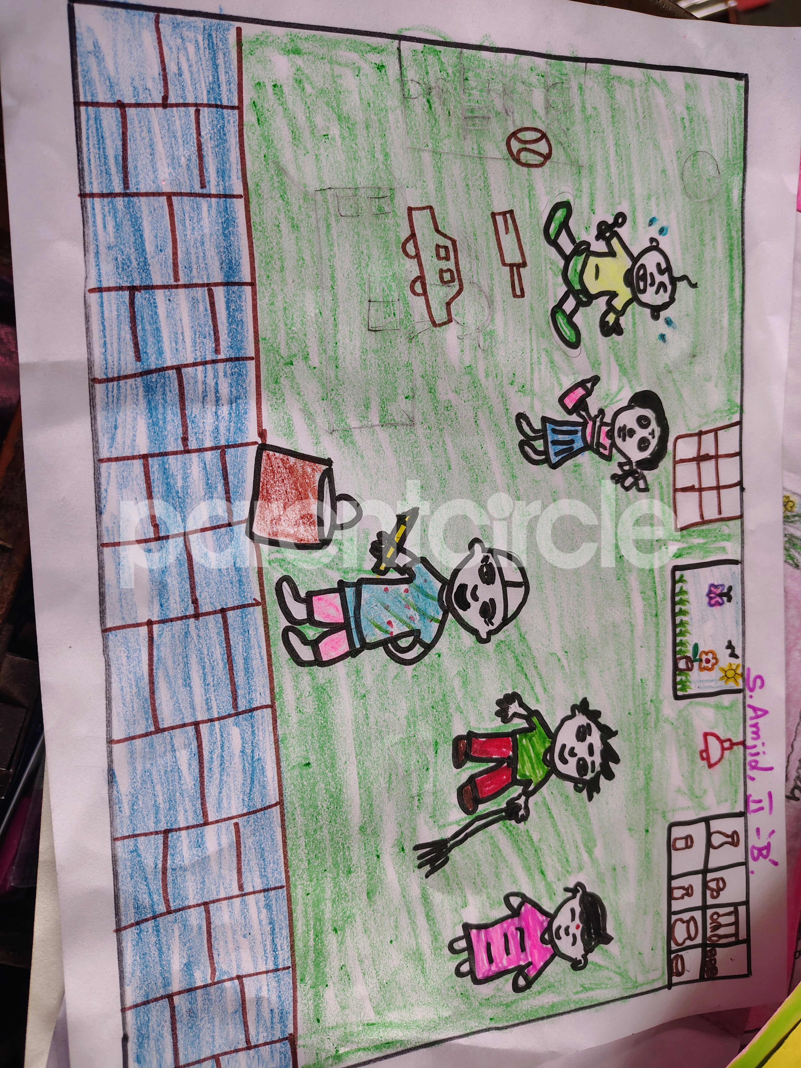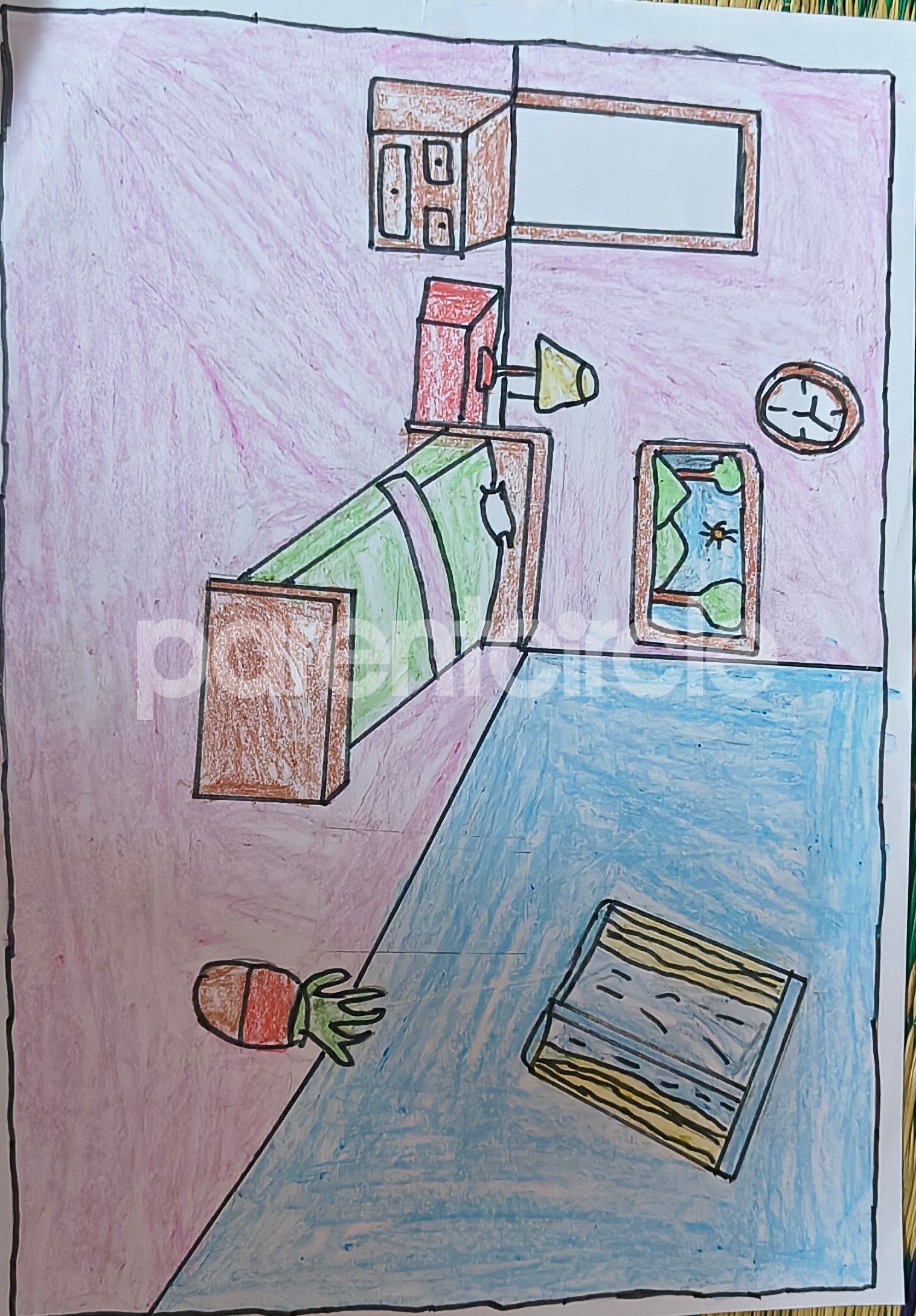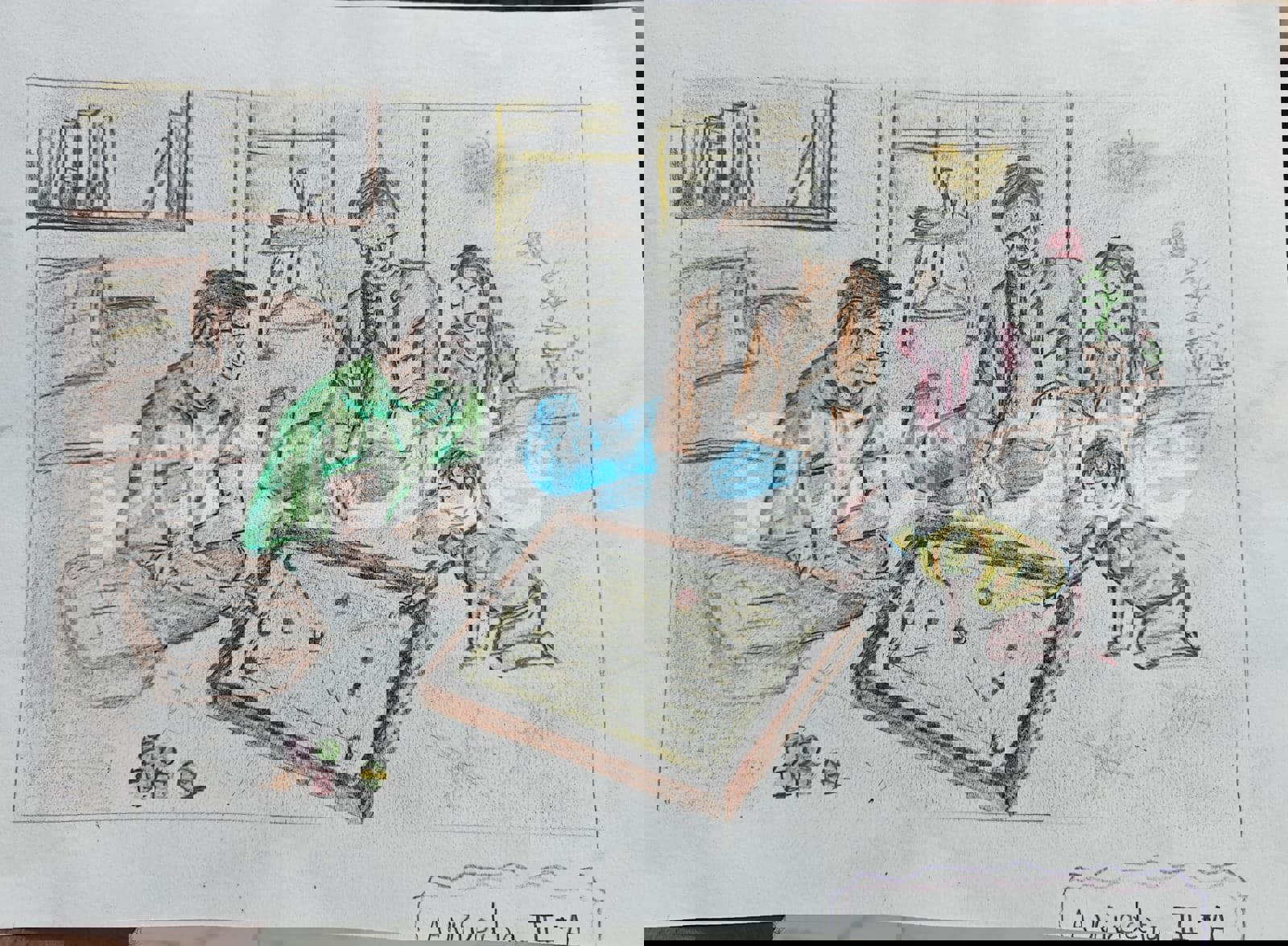 Diya has more than one favourite corner at home. The above drawing shows Study table along with her ART and CRAFT hanging, watching TV by sating on the Couch and finally her small garden in the balcony