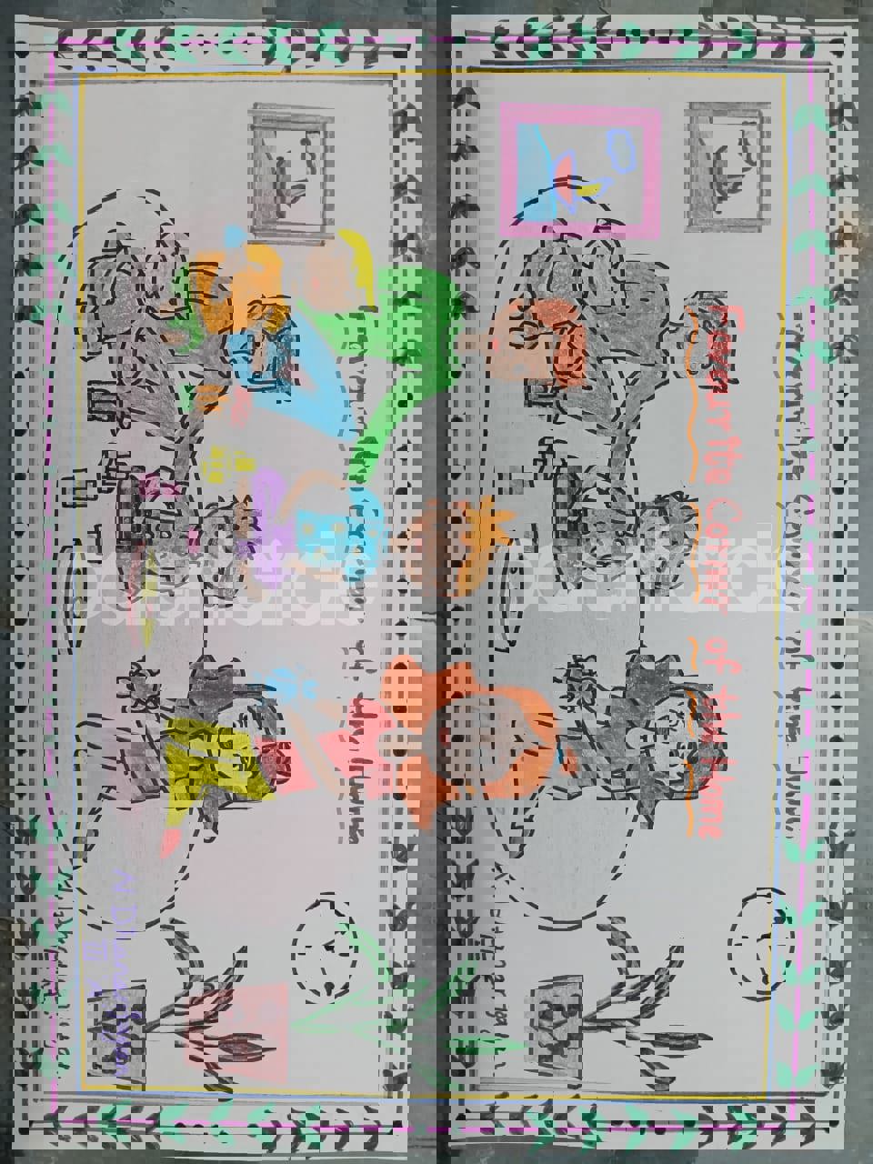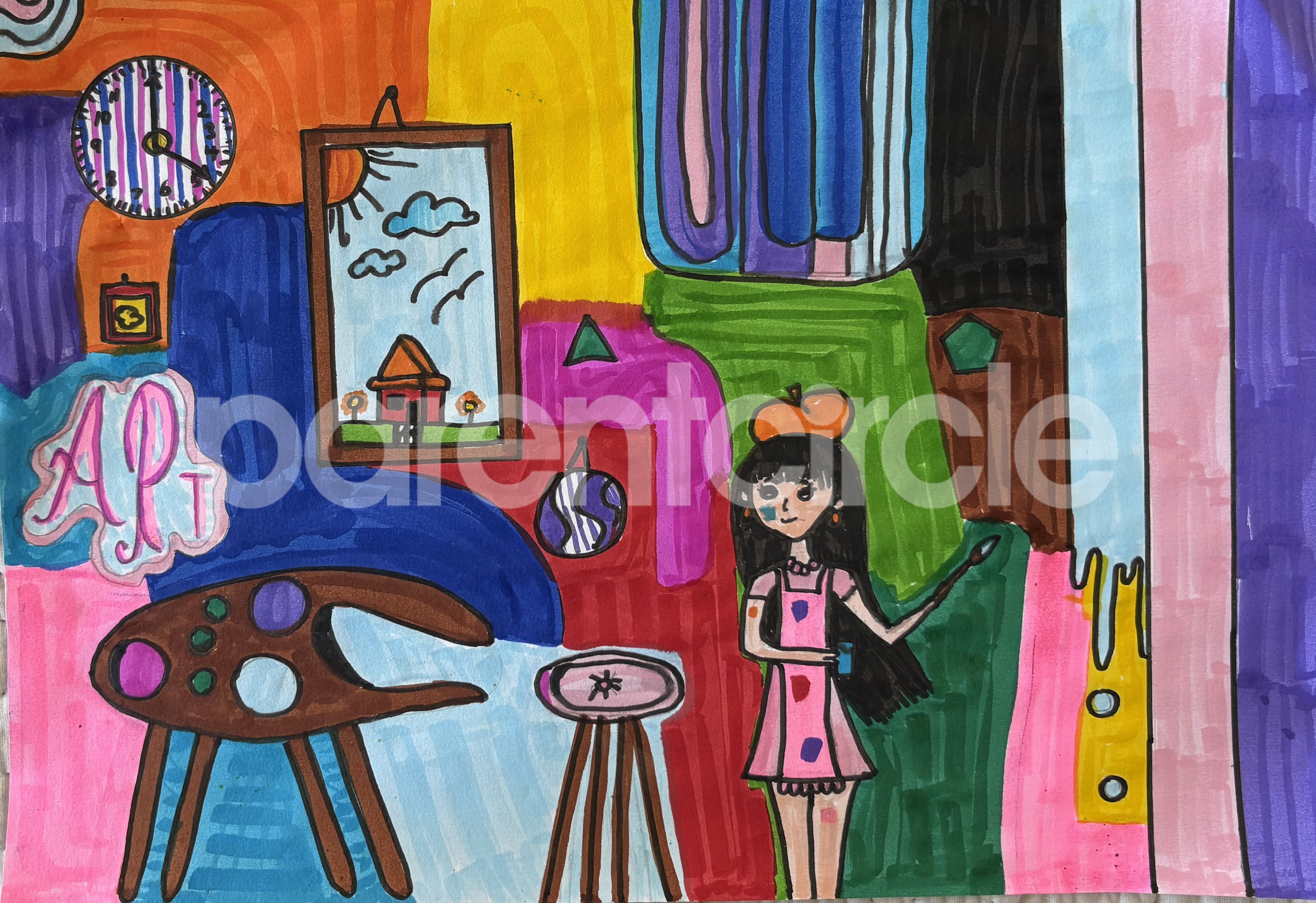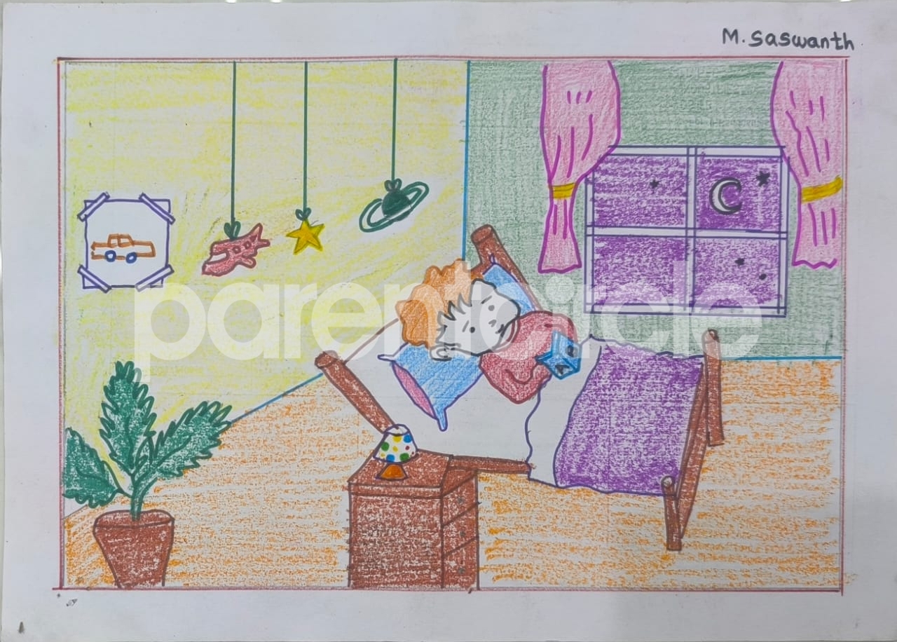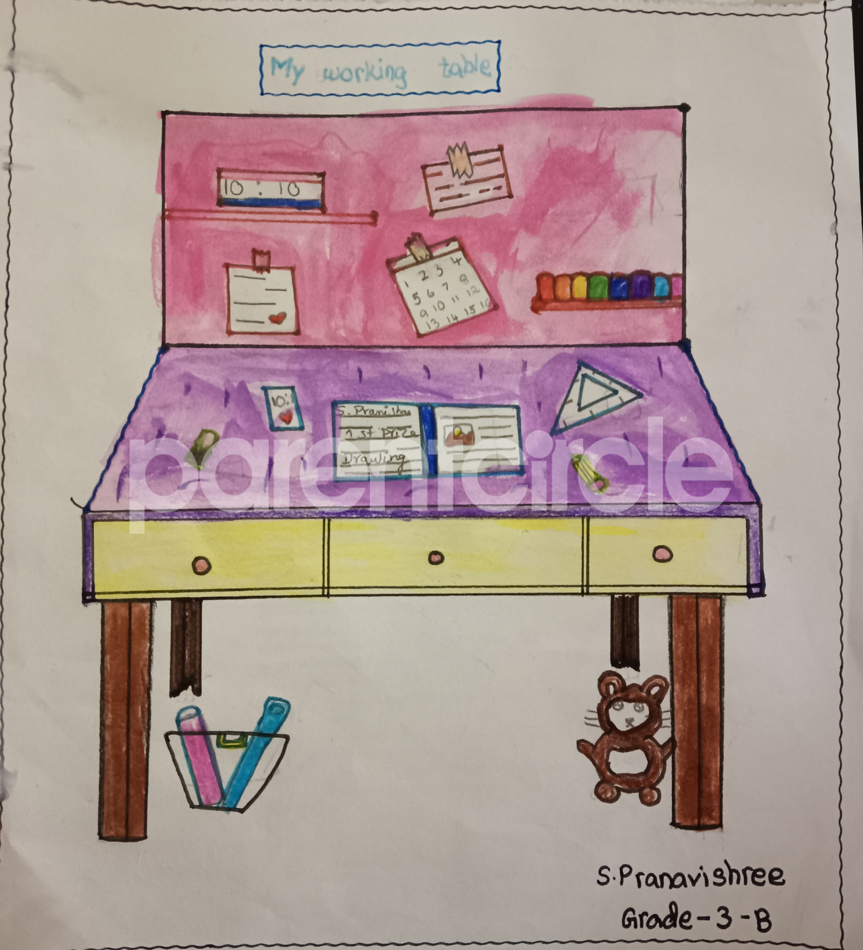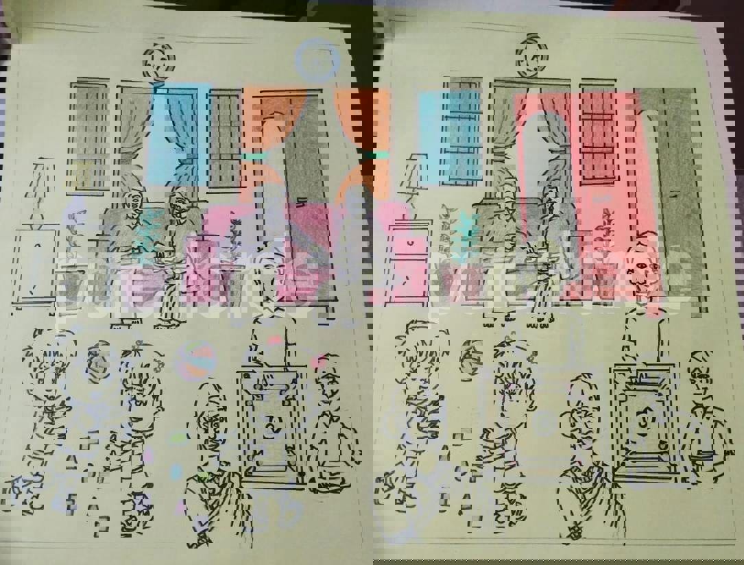 Diya has more than one favourite corner at home. The above drawing shows Study table along with her ART and CRAFT hanging, watching TV by sating on the Couch and finally her small garden in the balcony
