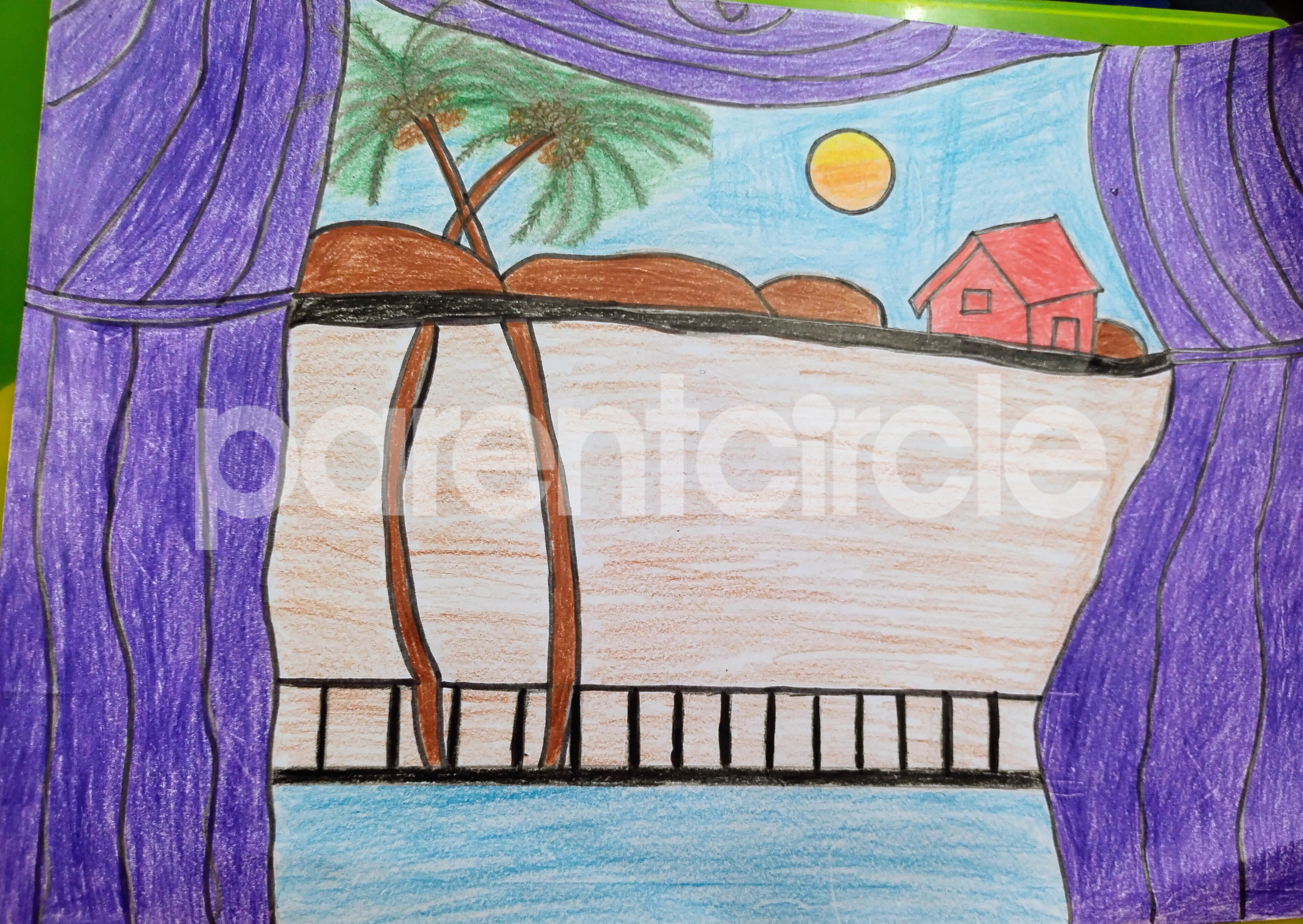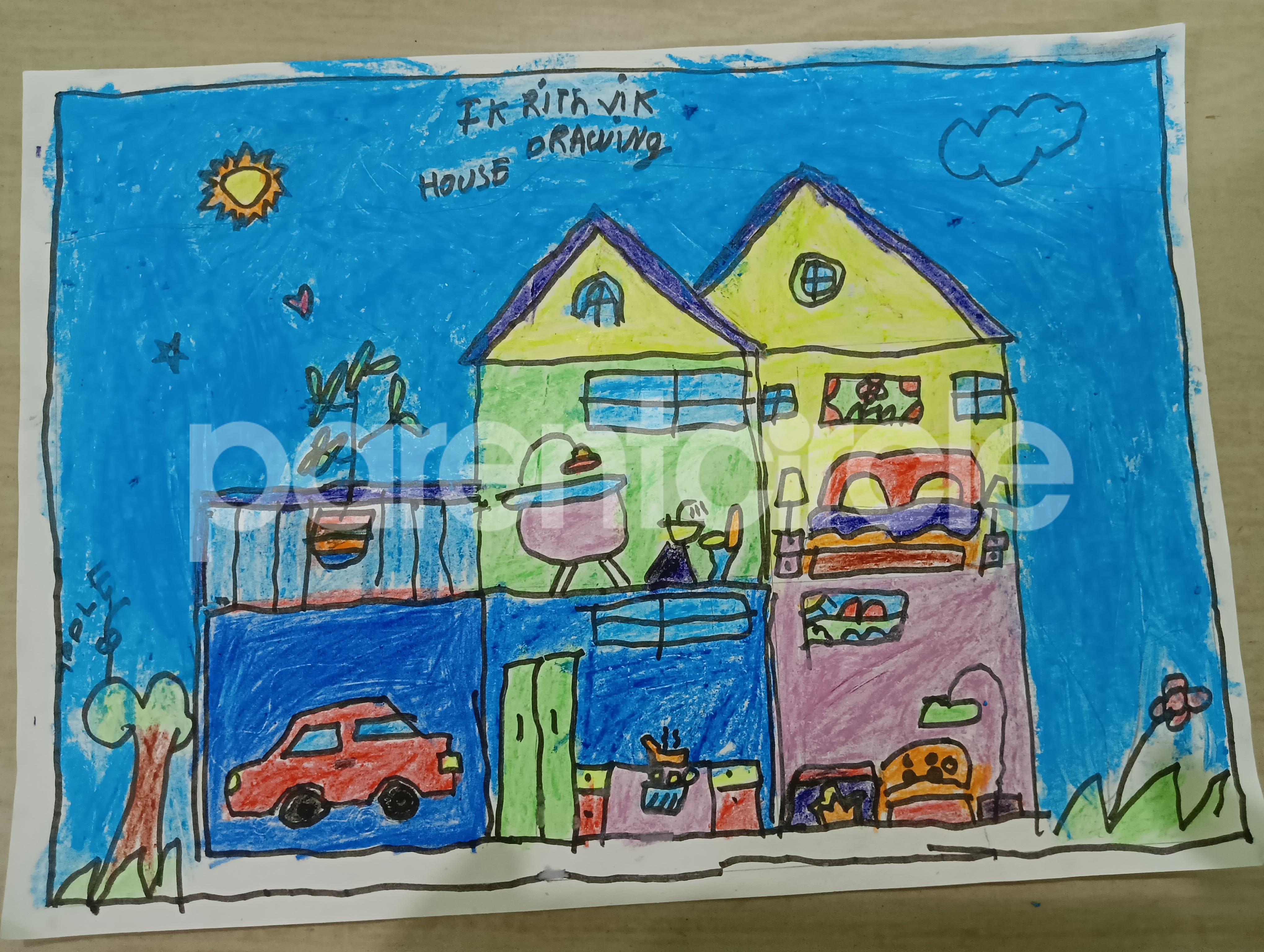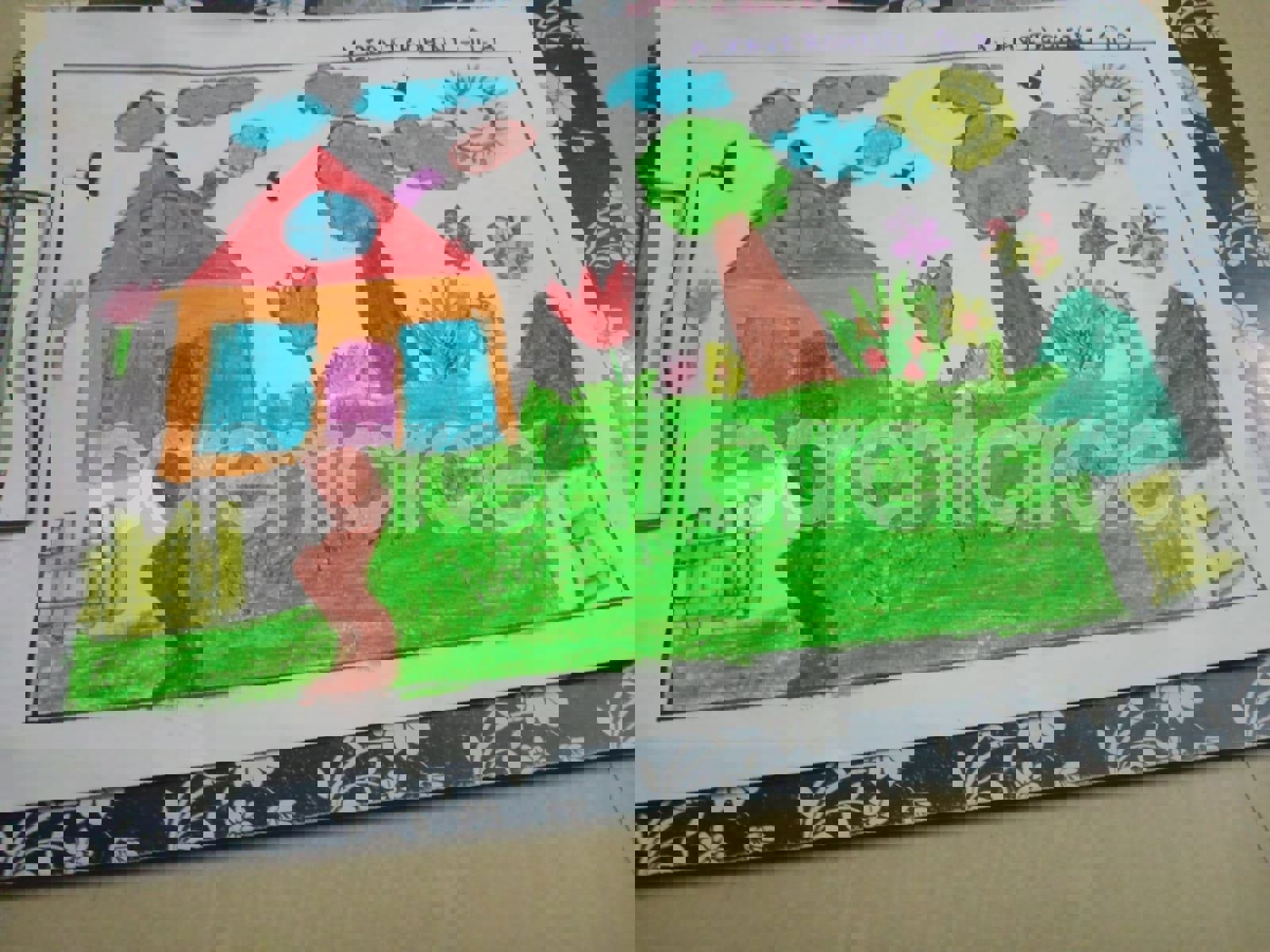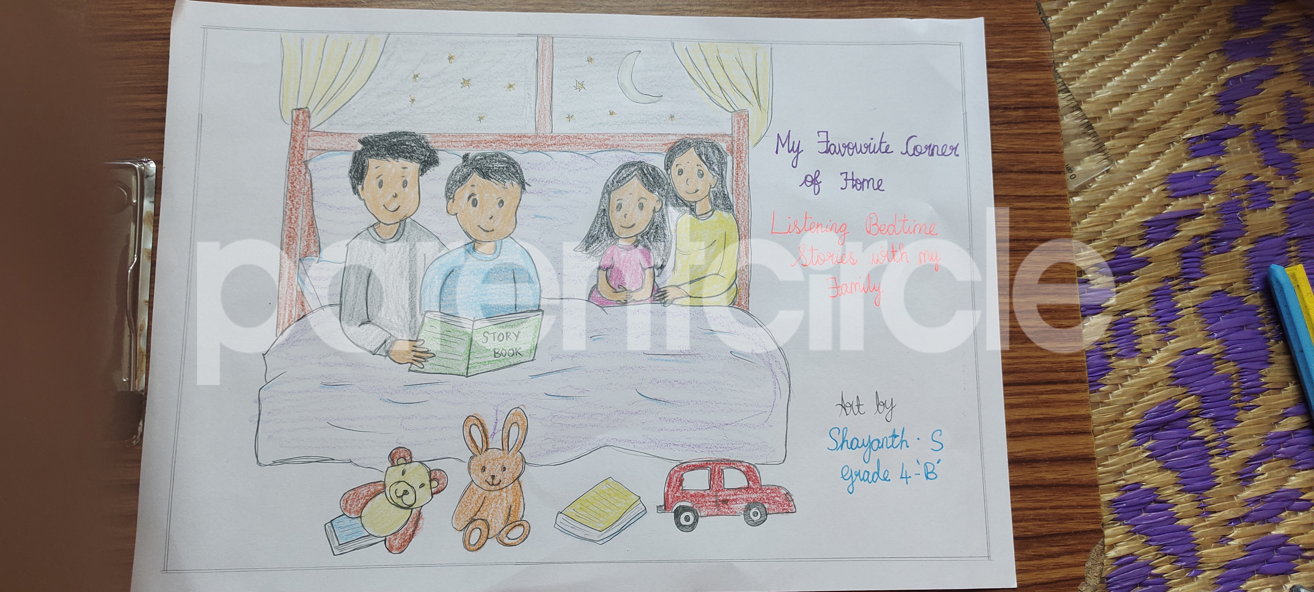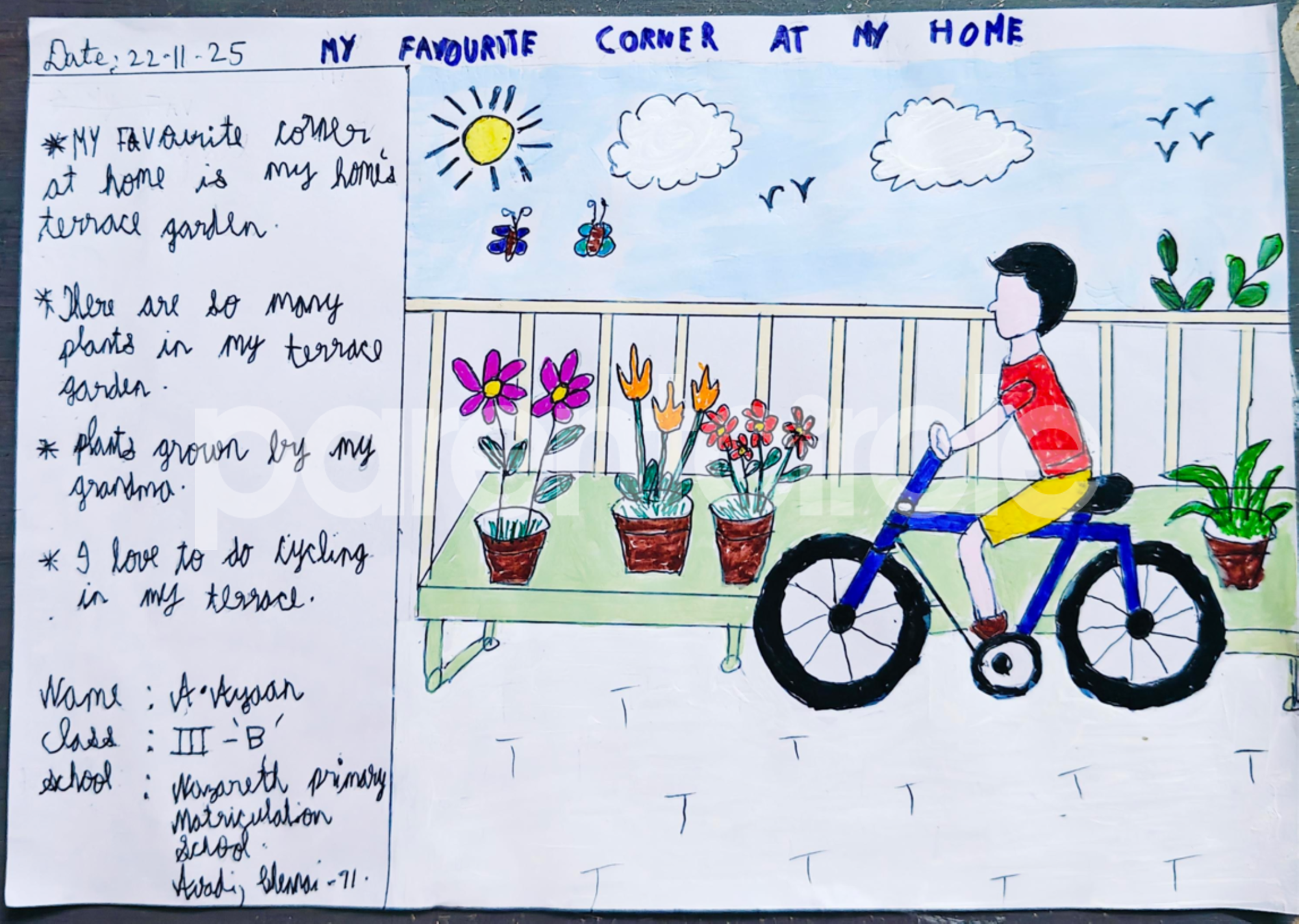 Diya has more than one favourite corner at home. The above drawing shows Study table along with her ART and CRAFT hanging, watching TV by sating on the Couch and finally her small garden in the balcony