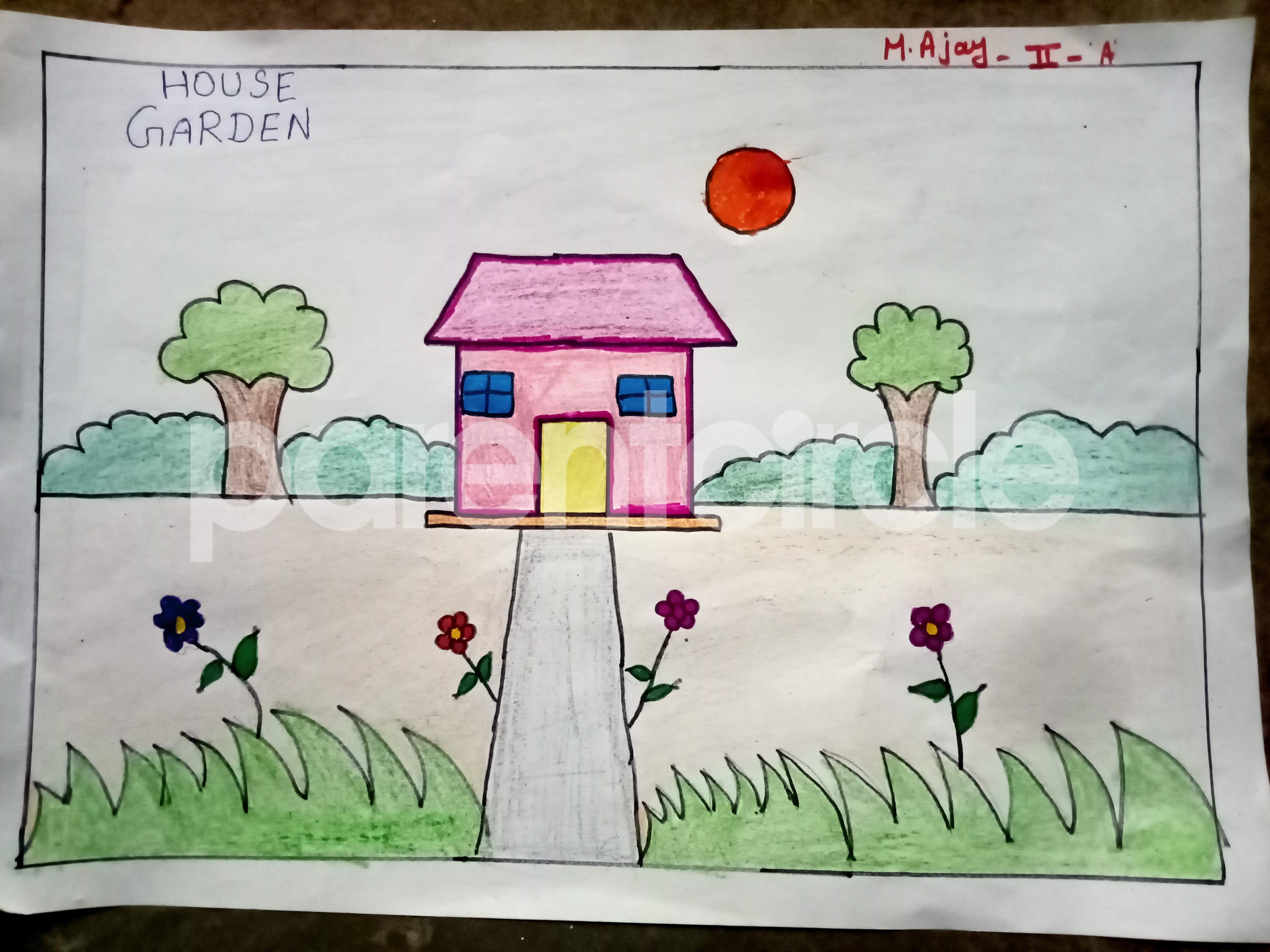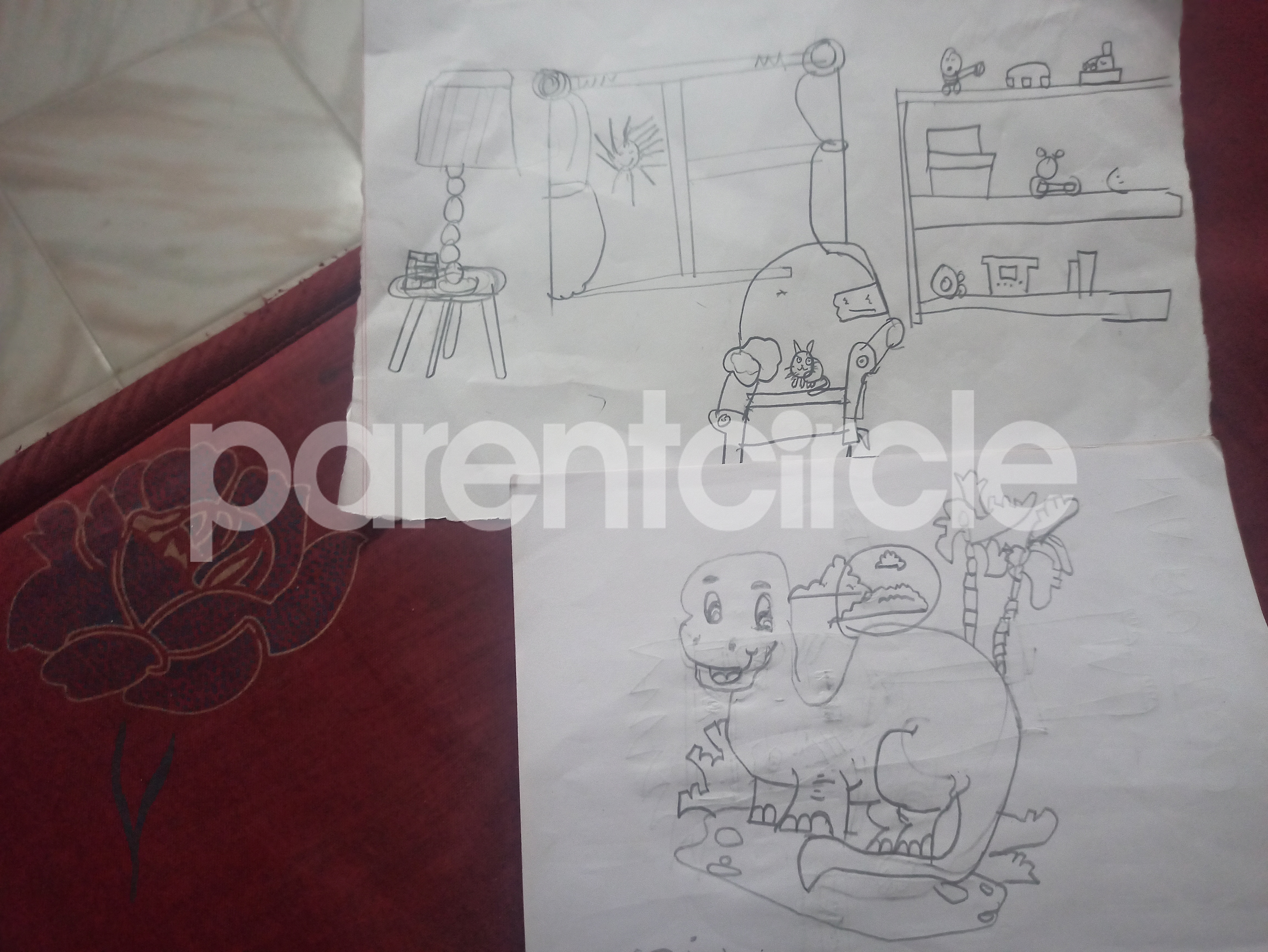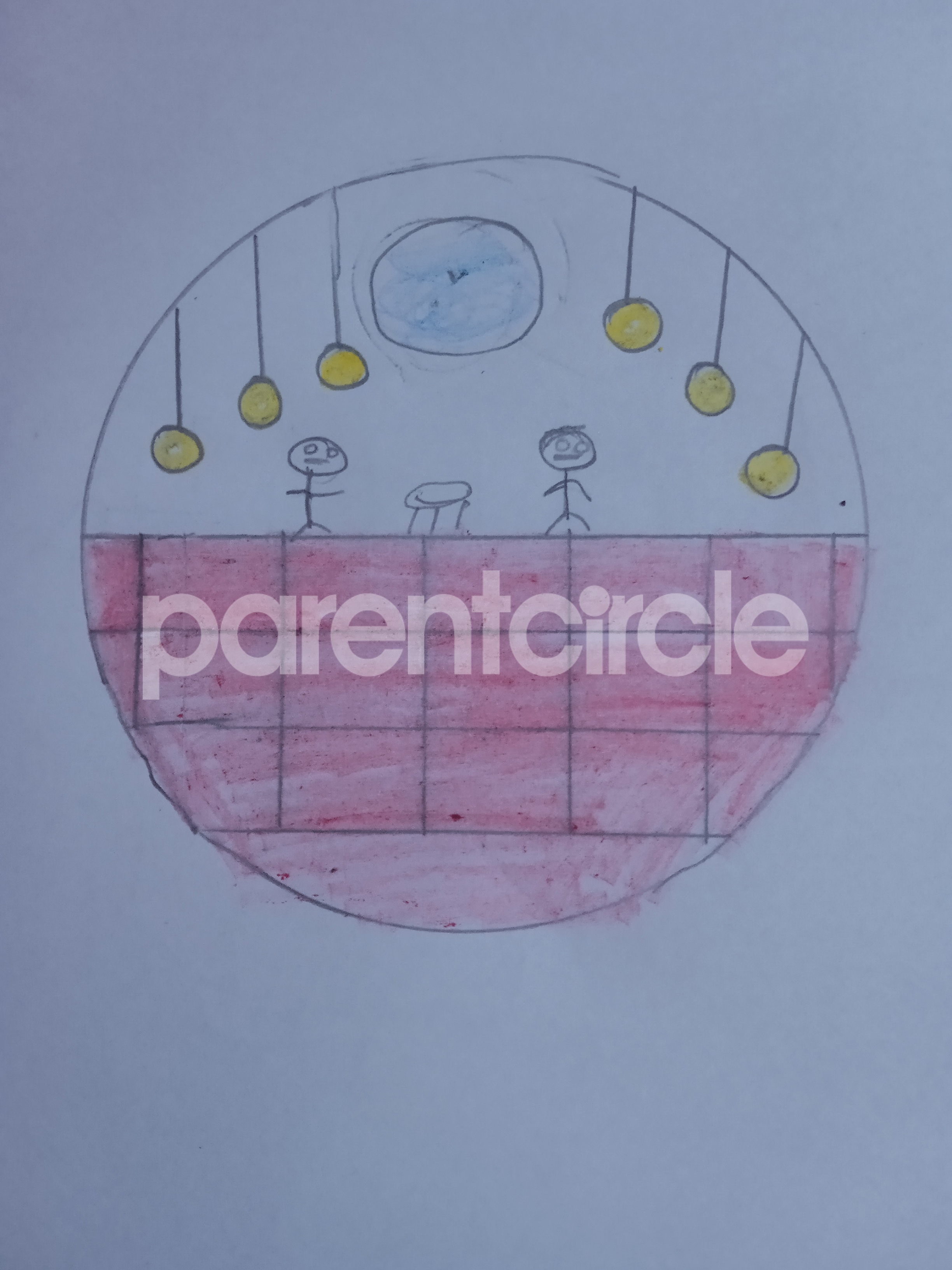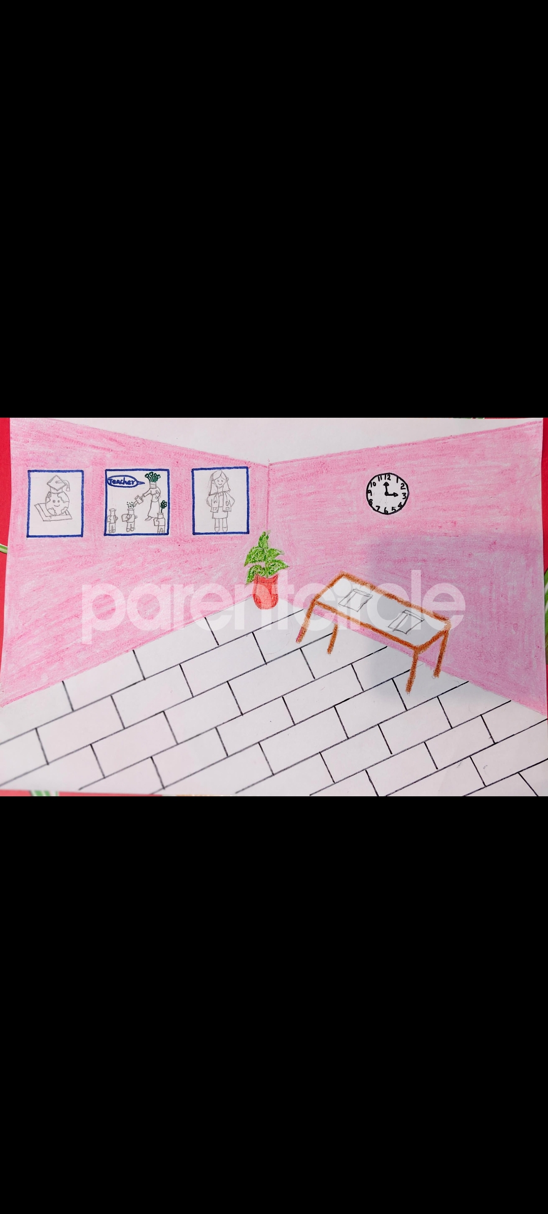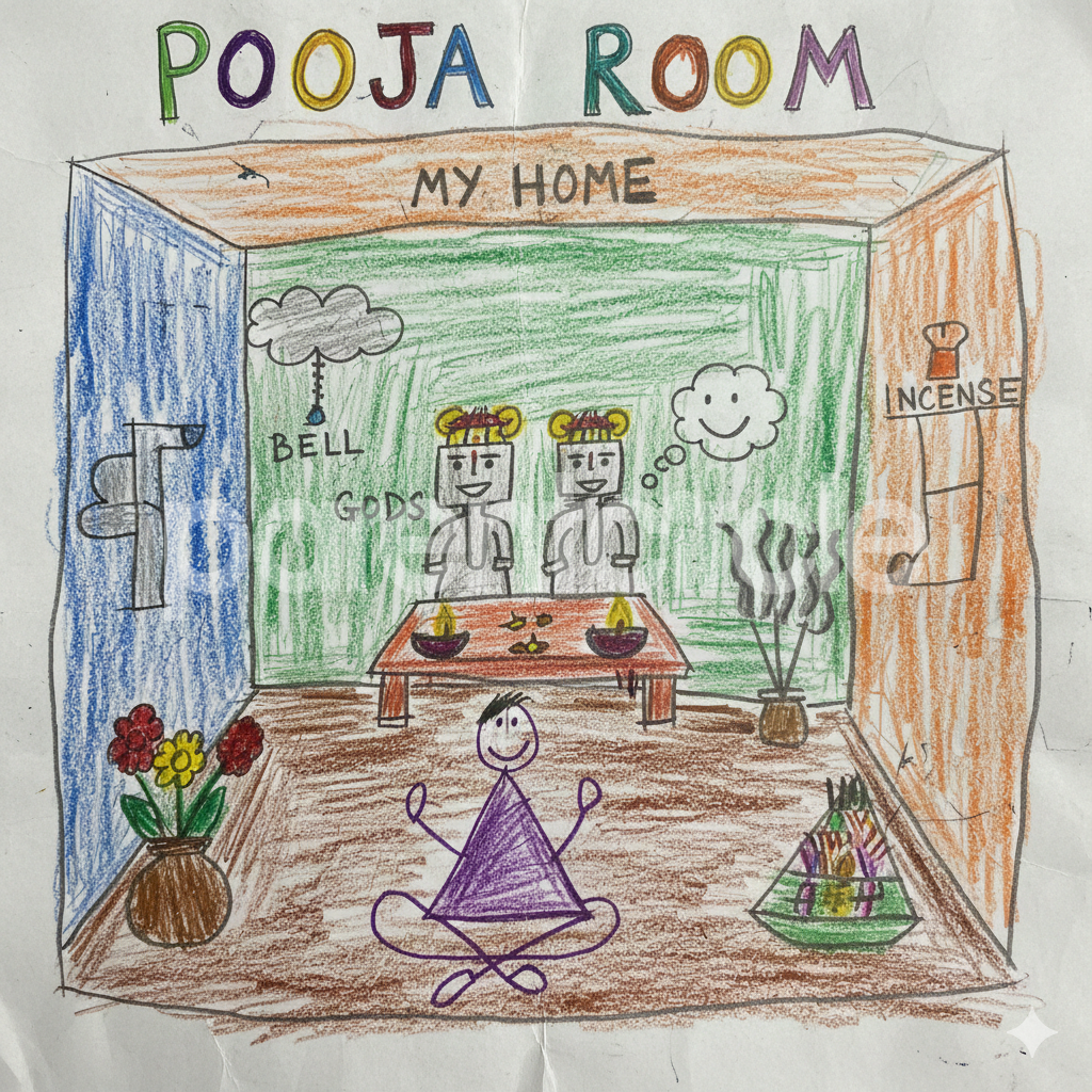 Diya has more than one favourite corner at home. The above drawing shows Study table along with her ART and CRAFT hanging, watching TV by sating on the Couch and finally her small garden in the balcony