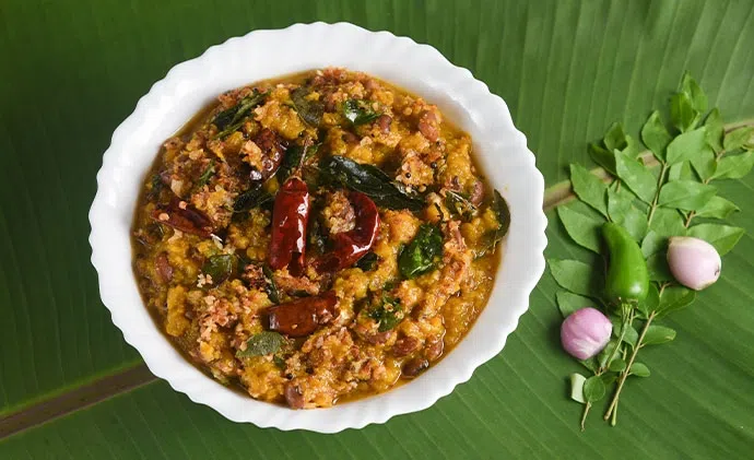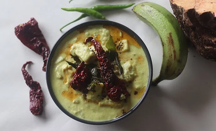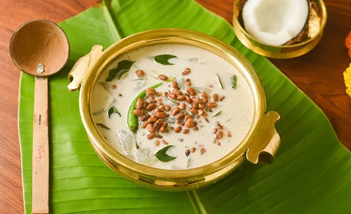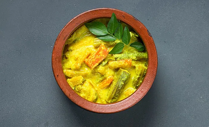 This is a dish made of coconut, buttermilk and raw bananas or yam. While buttermilk is rich in calcium and helps treat acid reflux, raw banana is a good source of fibre and vitamins and controls blood sugar. The strange-looking yam is a powerhouse of nutrients and is pocket-friendly as well. It is high in carbohydrates, vitamins, antioxidants, dietary fibre and protein. It prevents hypertension and regulates hormonal imbalance in women.