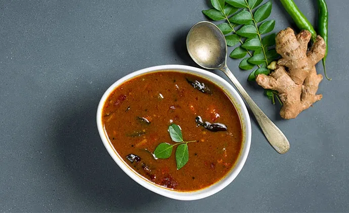 A spicy and tangy pickle, this easy-to-make dish is packed with nutrition. It is made of inji (ginger), which helps control nausea by motion, chemotherapy, or pregnancy; rheumatoid arthritis; and osteoarthritis, and puli (tamarind), which is good for the heart and improves digestion.
