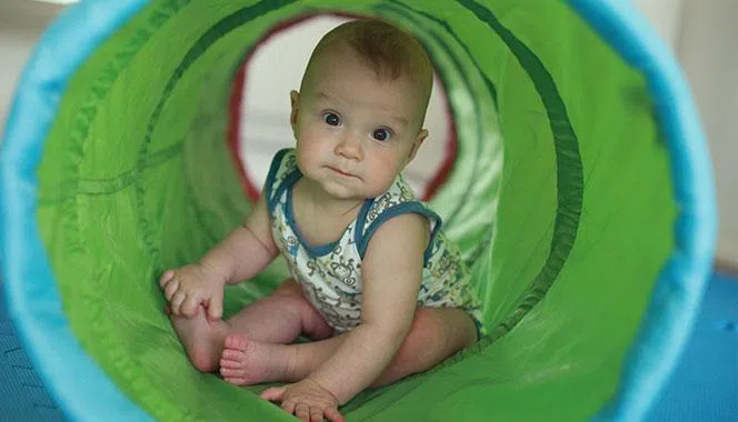 Tunnel crawl: Line up a few chairs. Drop a blanket over them. Ask your child to crawl through the tunnel made of blanket-covered chairs. And you can crawl right next to them on the outside. You could time it and make it a sport! Take caution with sharp edges or chairs falling.