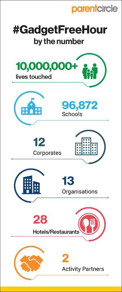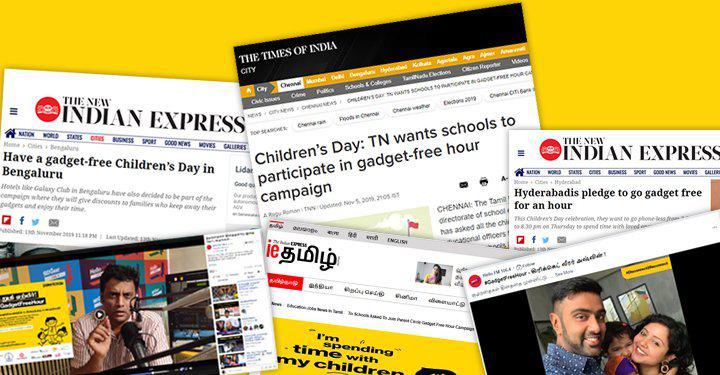 02:50 p.m. - The #GadgetFreeHour campaign is already going VIRAL. 58000+ schools, a host of corporate giants, endorsements by popular celebrities, achievers, and bestselling authors, support by the biggest hotel brands including Hyatt and Hilton, and yes, close to a MILLION parents are eager to be a part of the maiden Children's Day special initiative of ParentCircle. #GadgetFreeHour is not just an event, it is the beginning of a movement. Here's a snapshot of the campaign's coverage in the press: