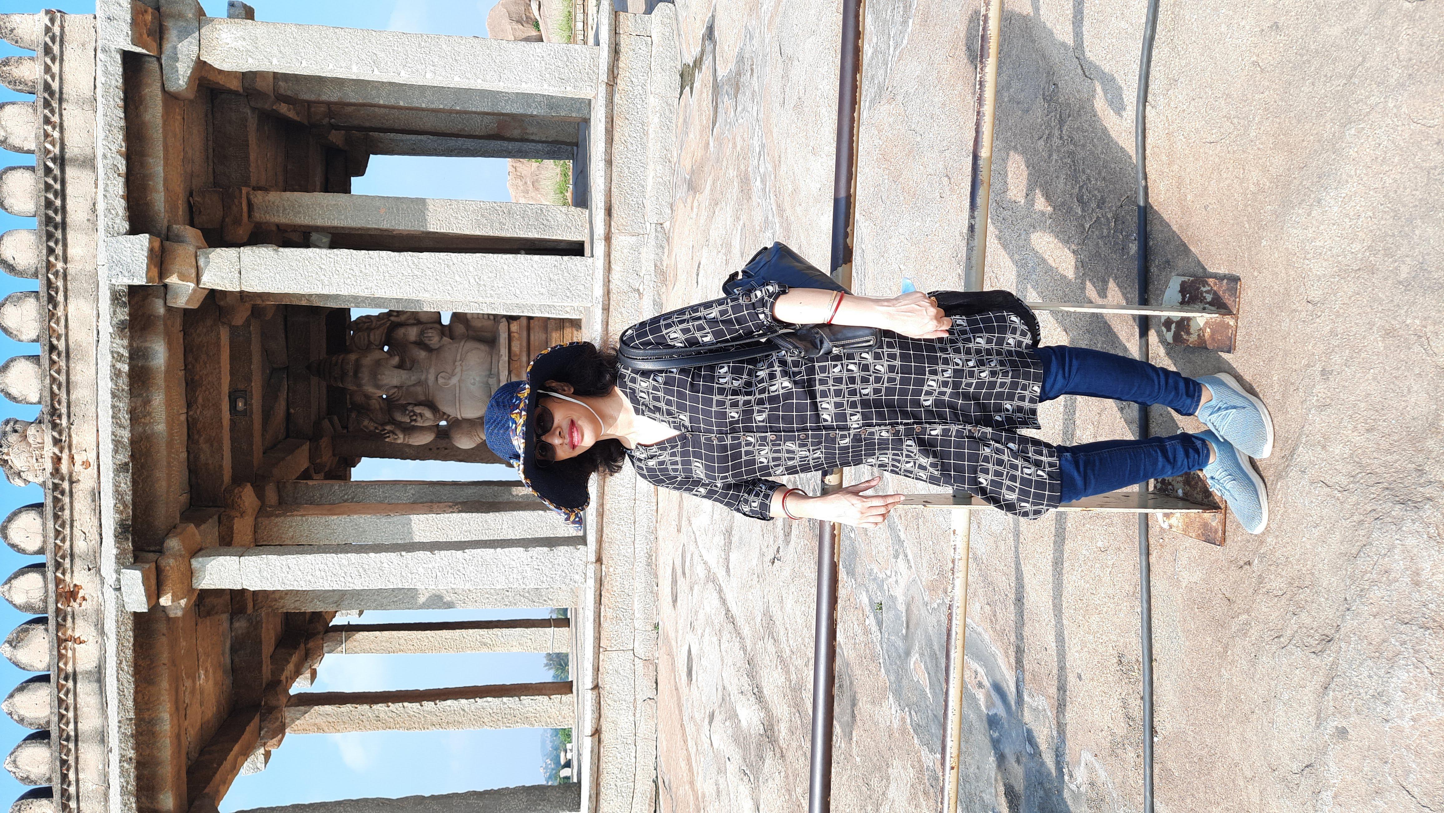This is a photo of me with a huge 15 feet monolithic statue of Lord Ganesha which is believed to be one of the largest in the world. It's Kadalekalu Ganesh located on Hemakuta Hill in Hampi.