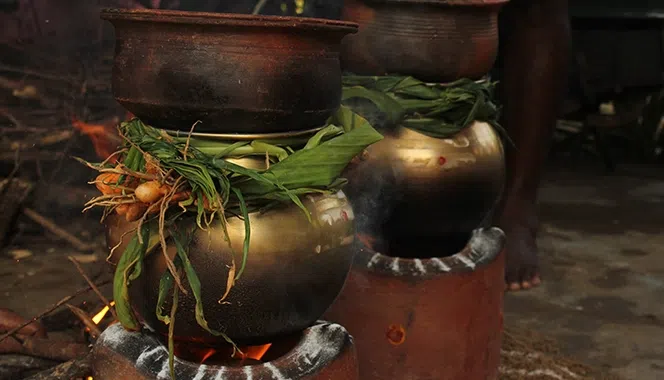 The origin of Pongal can be dated back to the Sangam age and has been mentioned in the Sanskrit puranas. The women of the Sangam era used to observe 'pavai nonbu' during Thai Neeradal, which was a big festival during the Pallavas' reign between 4 AD and 8 AD. The celebrations occurred during the Tamil month of Margazhi (between December and January) and the women used to pray for rains and prosperity to the deity Katyayani. Throughout the month, the women would take a bath early in the morning and avoid consuming milk or milk products. They would end their penance on the first day of Thai. This was done to bless the land and the paddy fields with rains and abundance. These traditions led to the annual Pongal celebrations over the years. In the Veeraraghava temple at Tiruvallur, an inscription was found, which said that the Chola King Kulottunga gifted lands to the temple during the Pongal celebrations. The festival celebrates nature's abundance and the harvest.