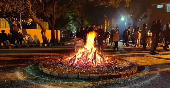 The bonfire is the highlight of Boghi, the day before Pongal. With the sun beginning to move north, days are longer and there is an increase in temperature that helps seeds sprout. The bonfire is lit on the grounds of harvested fields or on the front yards of homes. People sing traditional folksongs and dance around the bonfire. It is also believed that the flames of the bonfire carry prayers and messages to the Sun God to provide warmth for the crops. Prayers are also offered for good health, abundance of harvest and prosperity.
