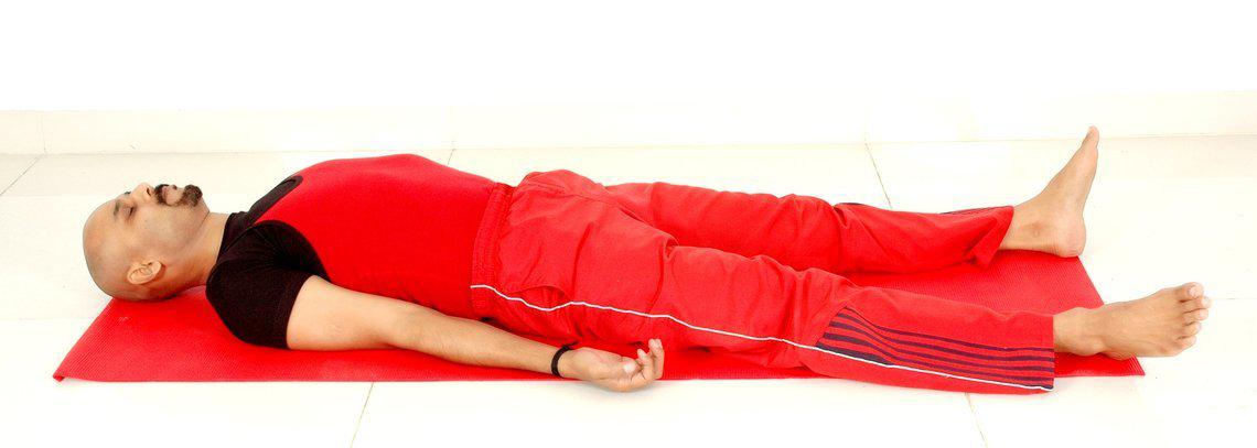 5. Shavasana (Corpse pose): Lie down on the floor on your back. Stretch out the legs with the feet apart (about the width of the shoulders). Stretch out both arms with hands placed about six inches away from the body. The head and spine should be in a straight line. Gently close your eyes. Relax the body, let all your tension flow out and stop all physical movement. Slow down your breathing, allow it to become rhythmic and relaxed.