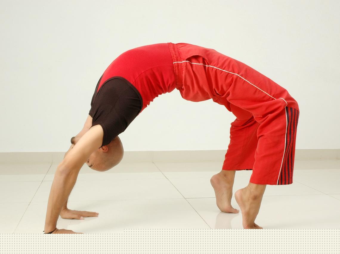 3. Chakraasana (Wheel pose): Lie flat on your back with legs stretched out on the floor. Bend your legs at the knees, and with the help of the hands, bring the heels as close to the buttocks as possible. Bend the hands and place them on the floor beside the temple with the palms facing downwards and fingers pointing outwards. Then, applying pressure on your palms, slowly raise the body and arch the back so that the crown of the head supports the weight of the upper body. Lift your knees further by moving the trunk towards the head. Let the head hang between the arms. Stay in this position for as long as you are comfortable. Then, slowly lower the body so that the head rests on the floor and then, lower the rest of the body. Repeat this posture thrice.