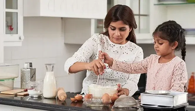 Is your child fascinated by watching you cook? Well, get him to help out in the kitchen. Know that your child will derive several health benefits from doing so, like bilateral coordination (more control using their hands), hand strengthening (kneading dough for cookies is great exercise!), planning (recipes require step-by-step planning and execution) and Maths (learn about measurements and calculations). What's more, baking together is a great way to bond with your child.
