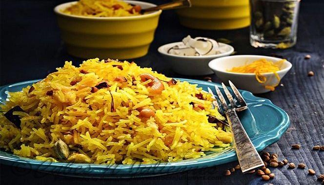 - Again, repeat the layering and sprinkle saffron-soaked milk on top of the rice, with mint, coriander, nuts, kewra and the fried onions. Cover and simmer on low flame for 15 minutes or until the rice is cooked.