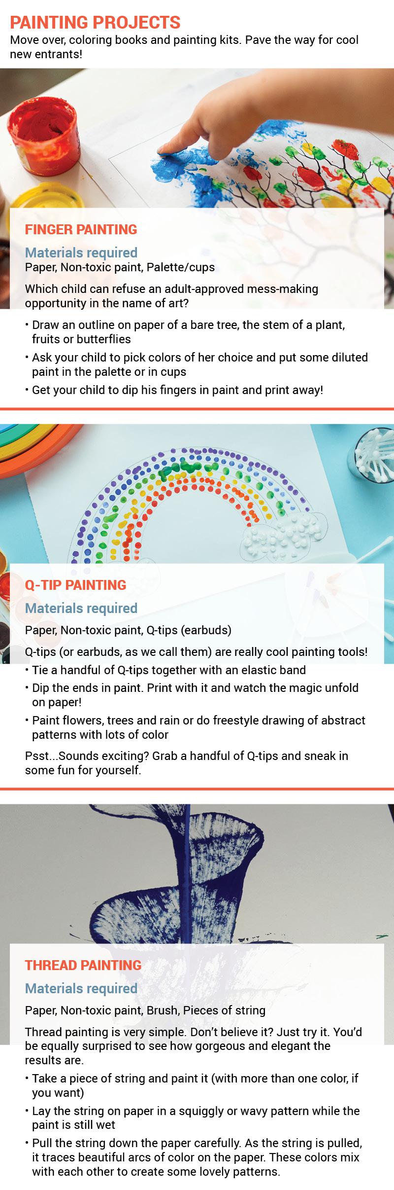 Activity-extension: Children can paint fruits on trees, or draw animals using fingerprints. With some practice, help your child paint a story. What fun! Finger painting can also be used for counting activities.
